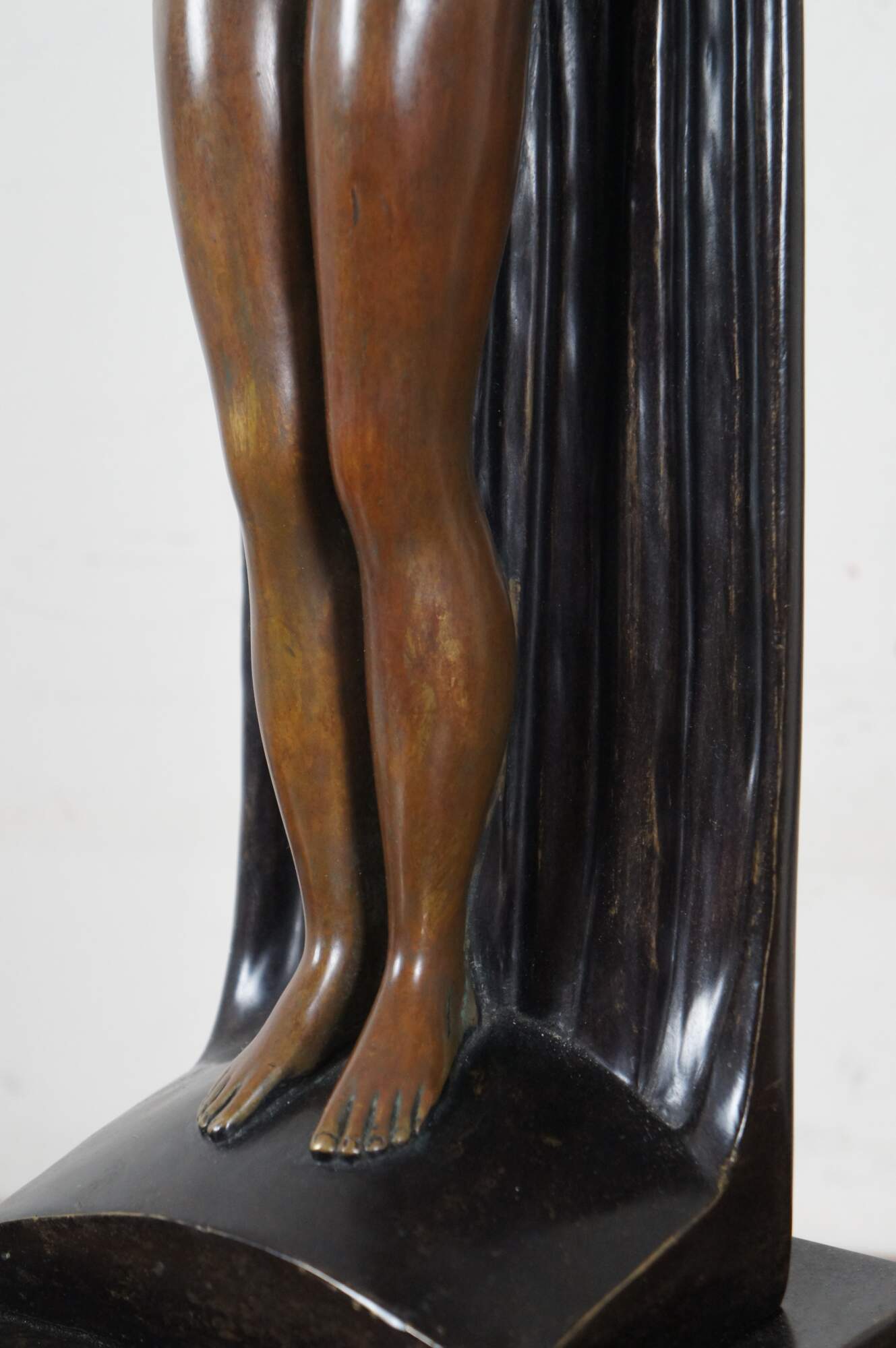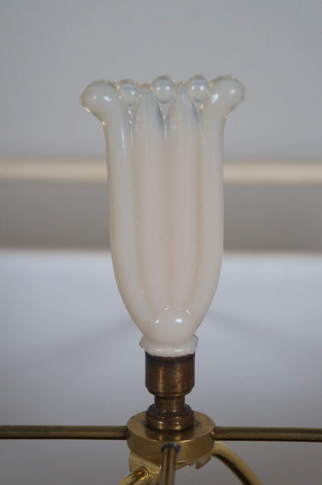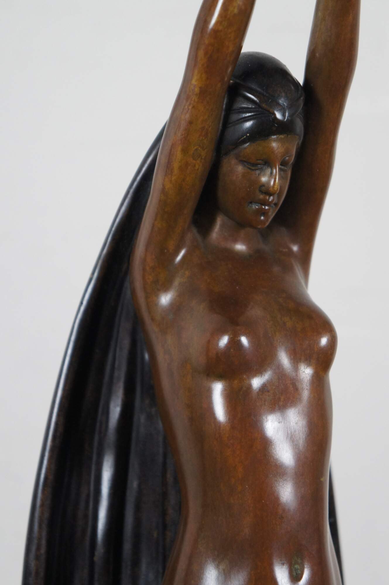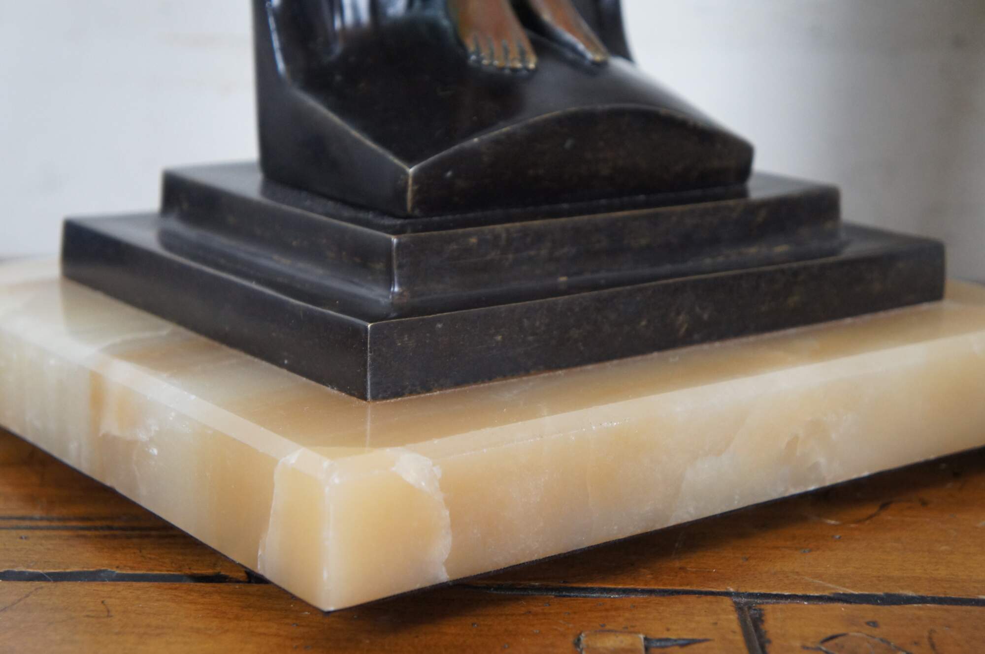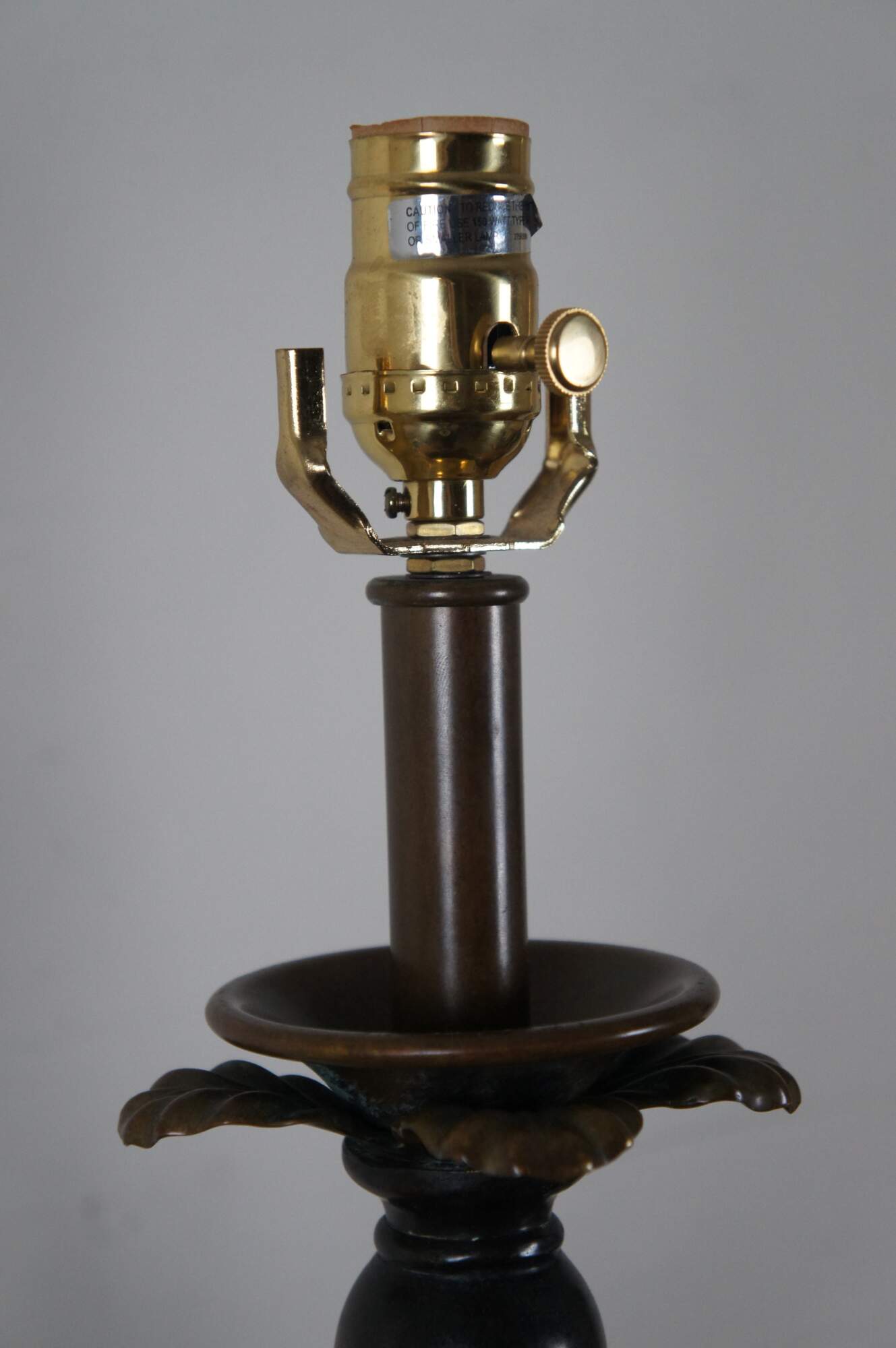 An impressive pair of table lamps featuring heavy bronze Art Deco female nude figures lifting vases topped with leaves, standing on tiered plinths with white marble bases. These stunning lamps are finished with Art Deco era flower shaped glass finials and elegant double layered (caged) rectangular shades.