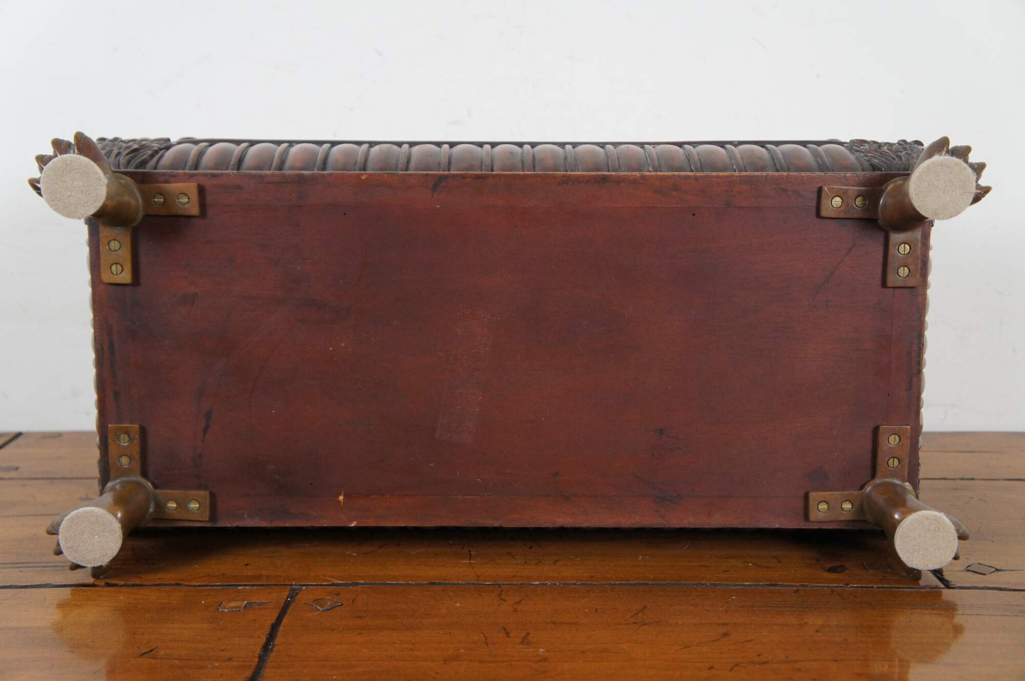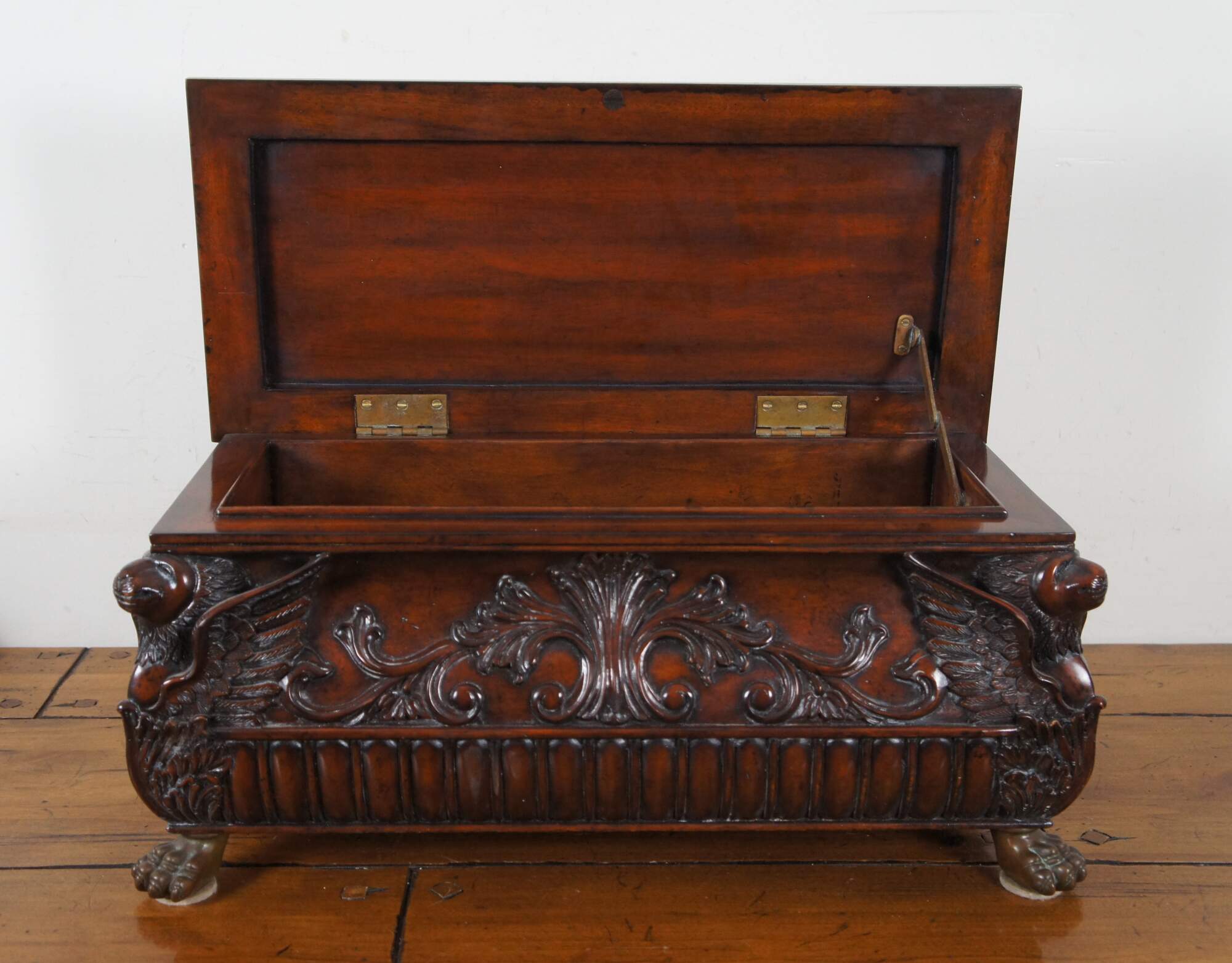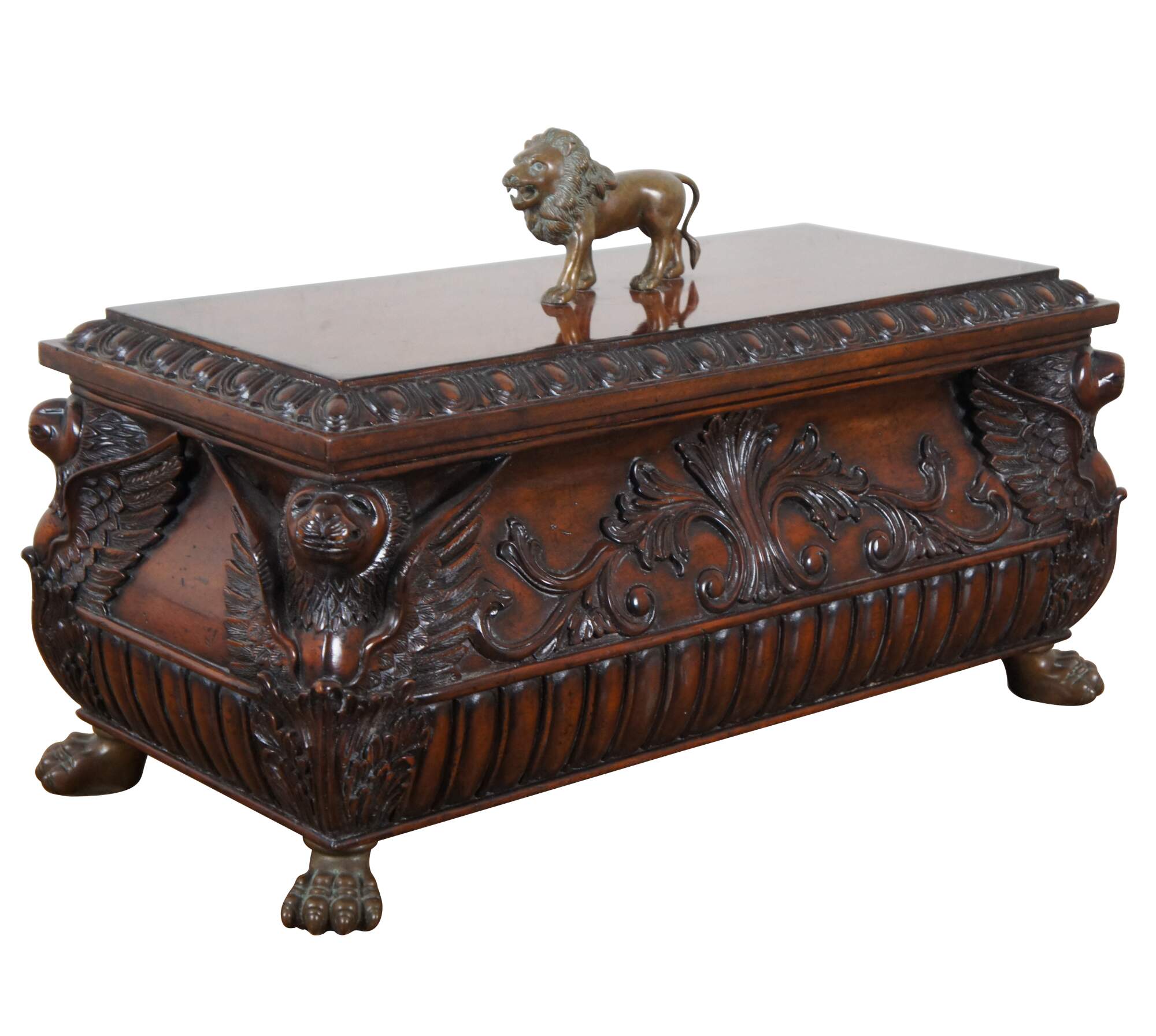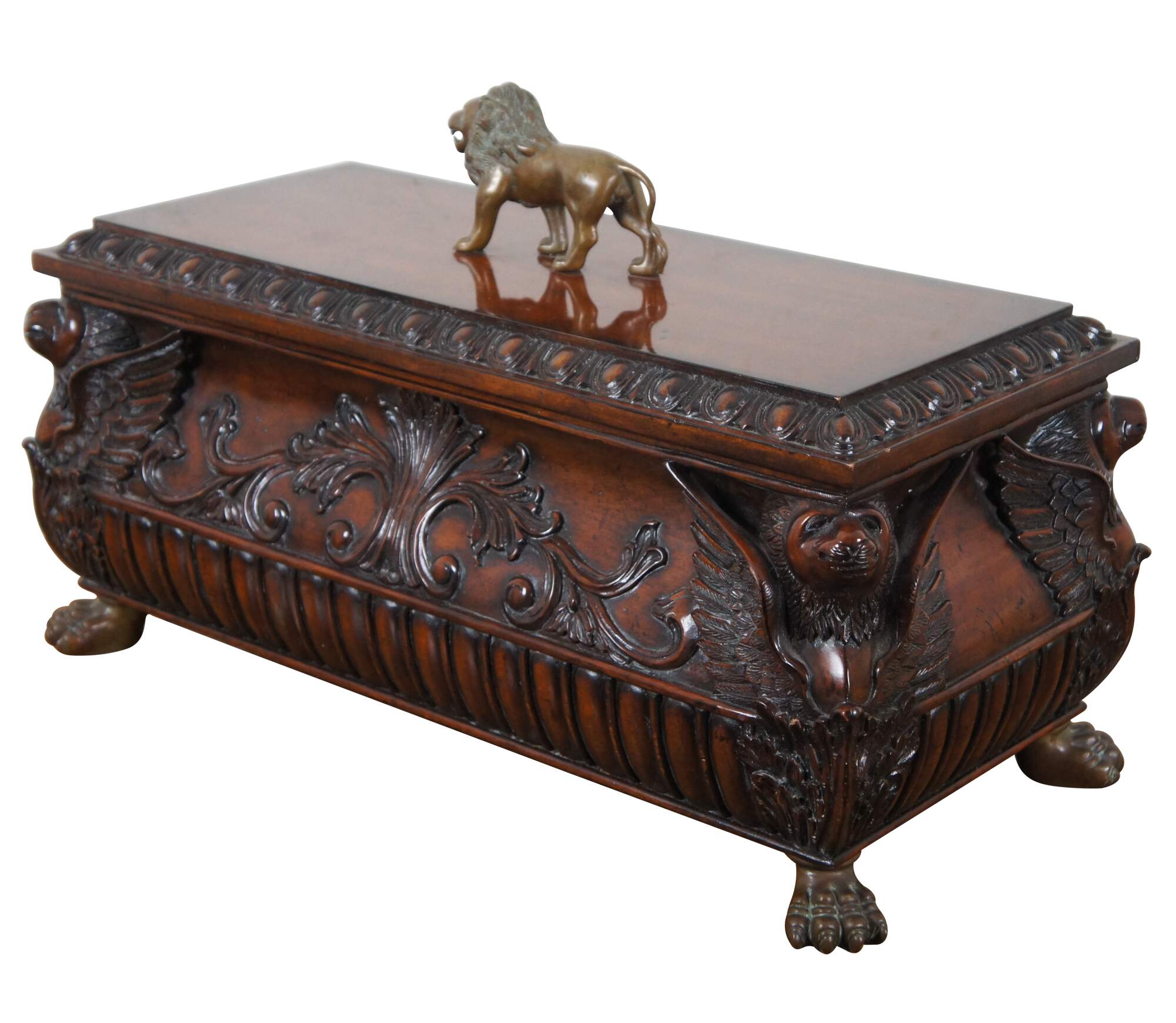 Vintage Maitland Smith mahogany box or chest carved with Neoclassical / Egyptian Revival foliate details and winged lion corners, supported on brass paw feet with a brass walking lion finial on the lid.