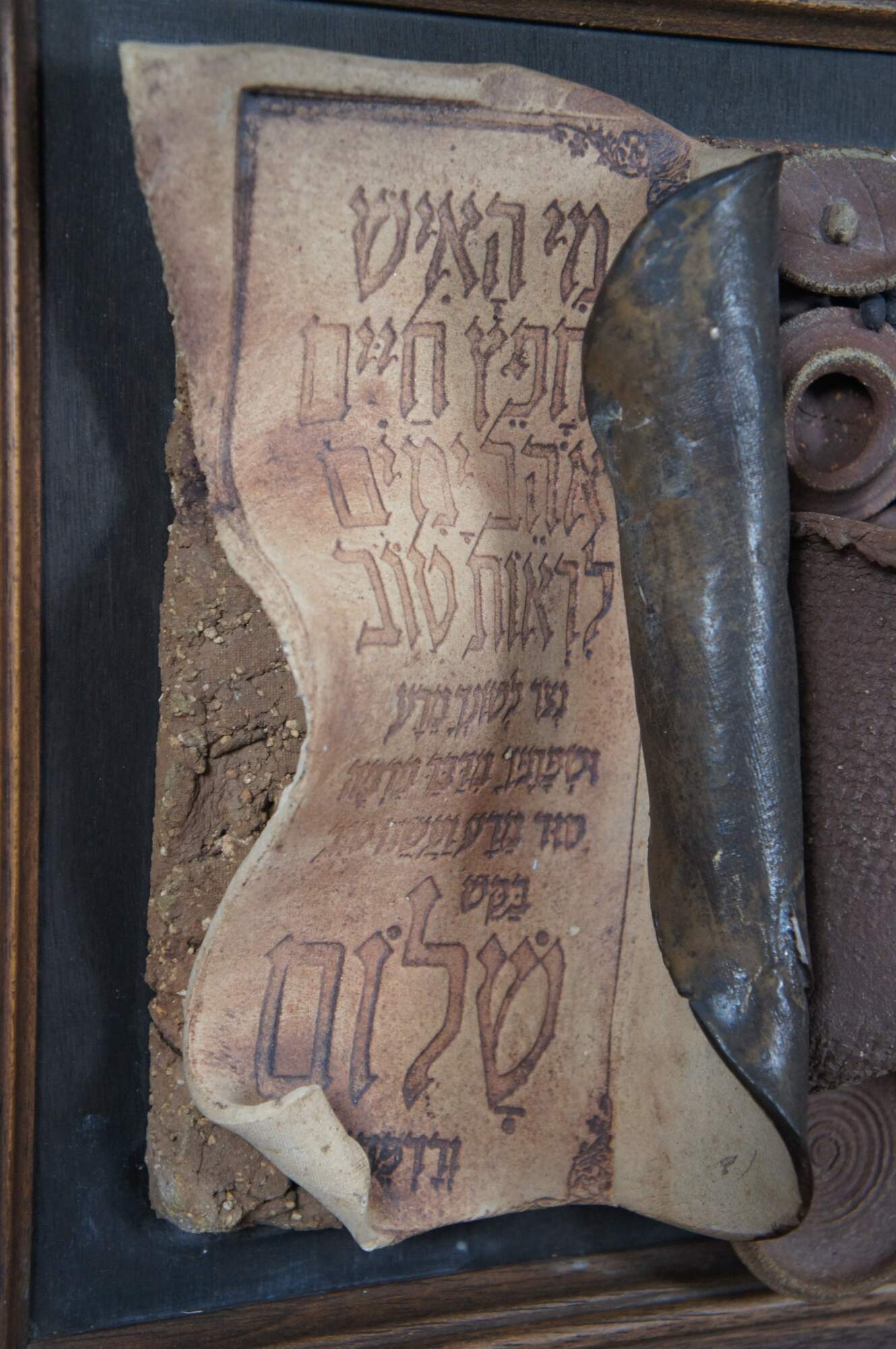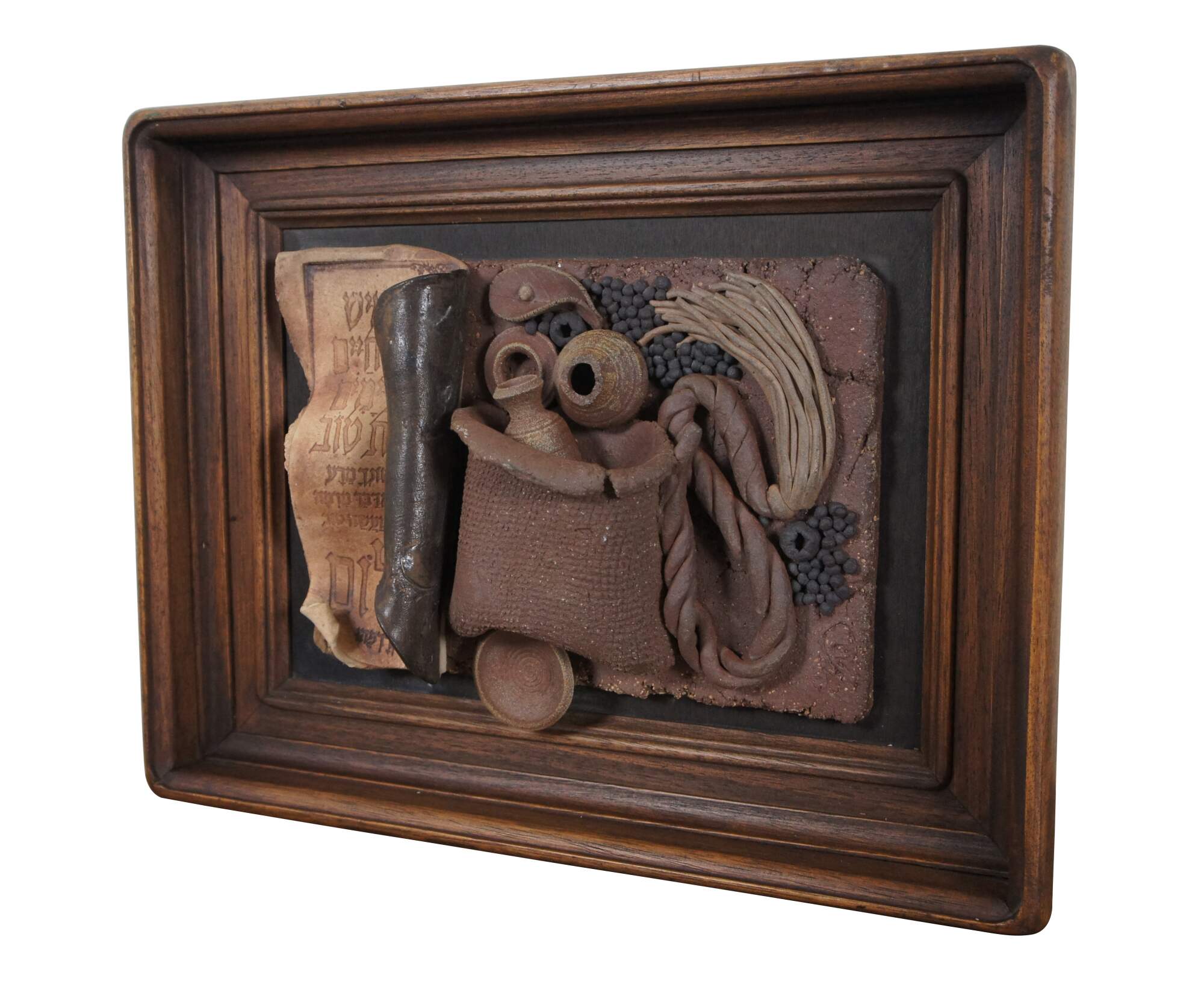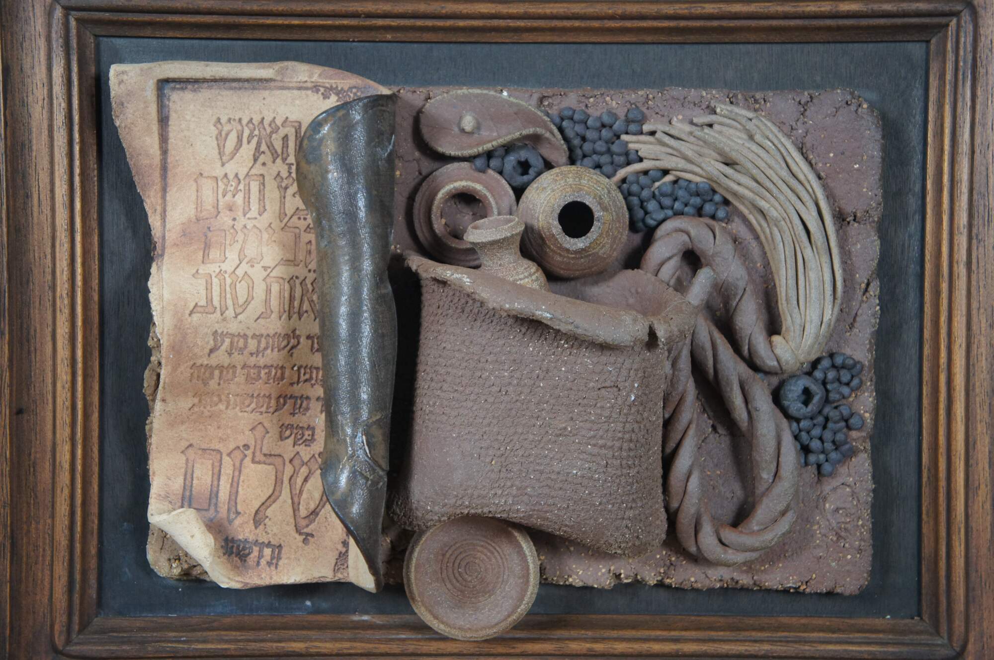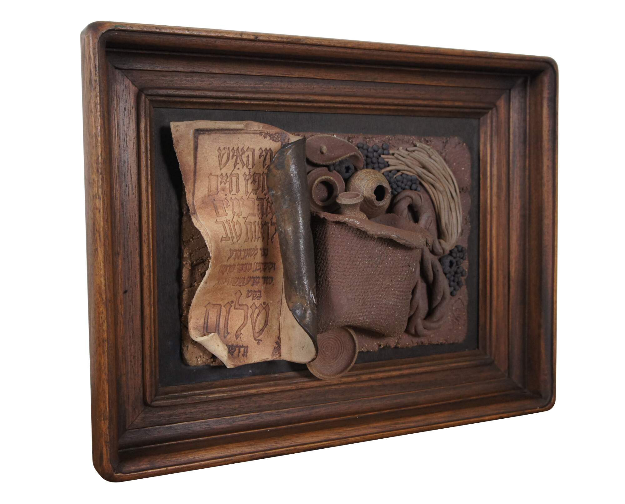 Vintage Judaica Oats of Prayer wall hanging relief / framed sculpture showing a still life viewed from above including a partially curled Hebrew scroll beside a fallen bag of crockery / dishes, fruit, and a rope / flail. Set in a beveled rectangular wood frame.
