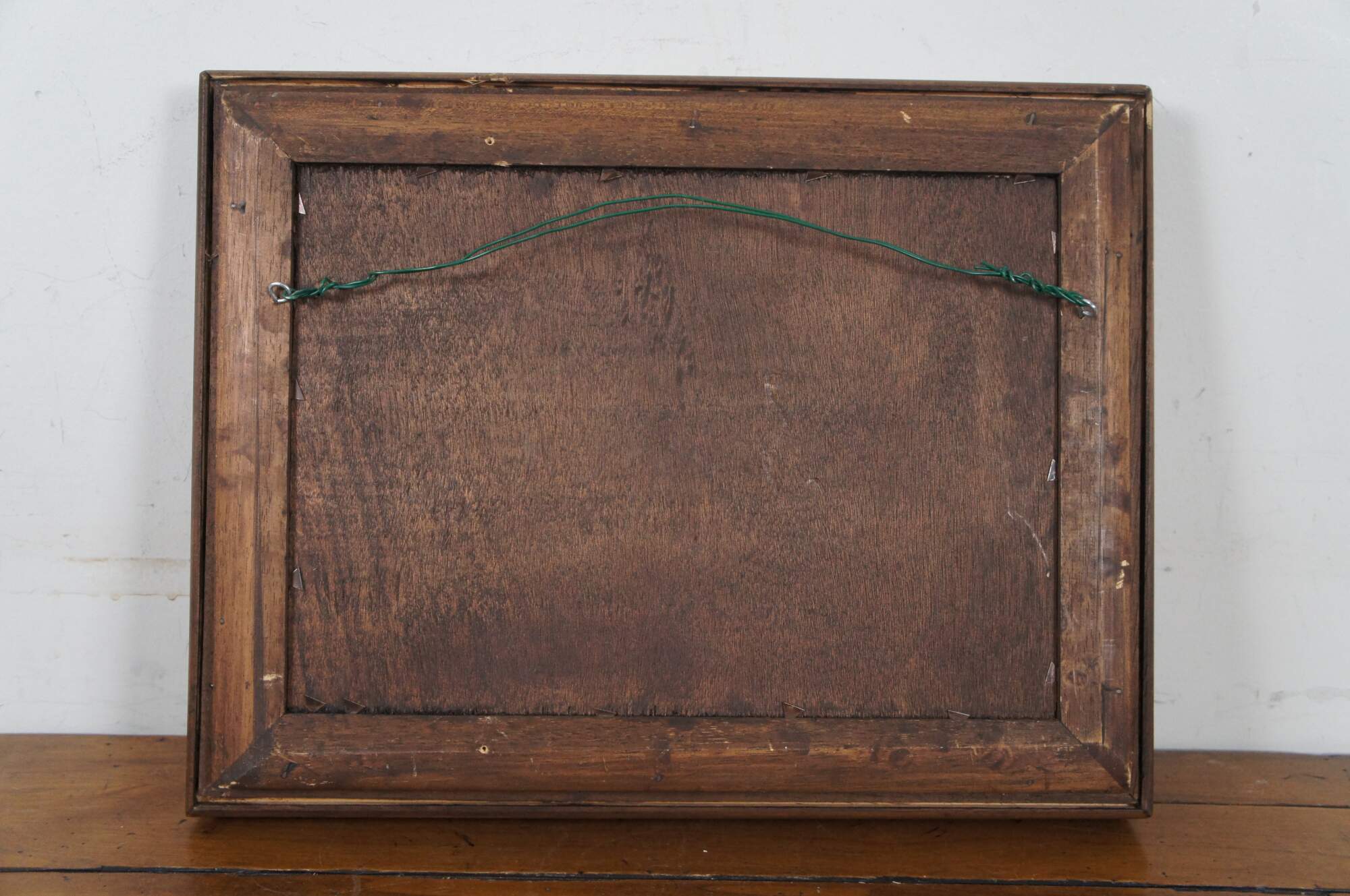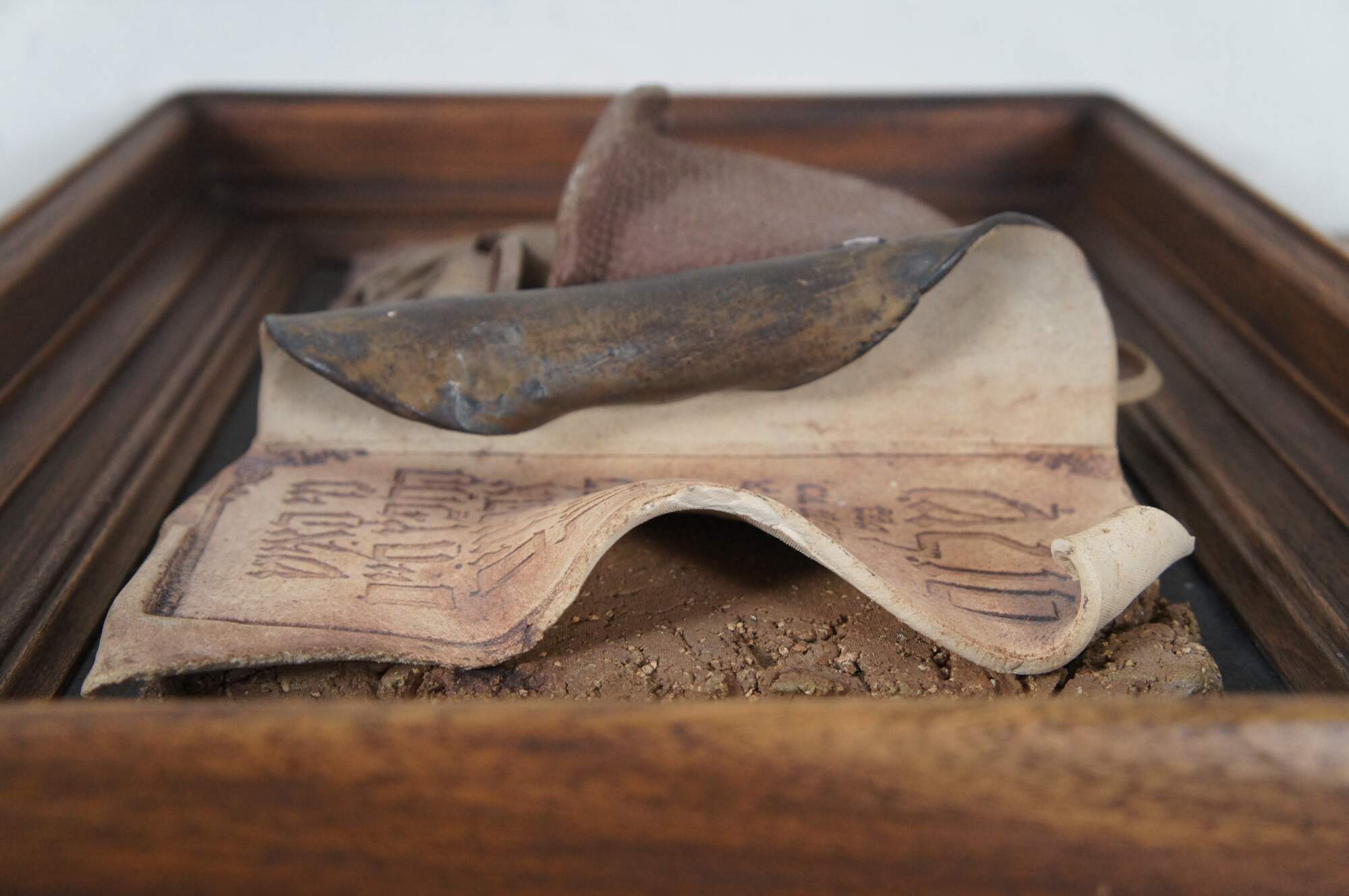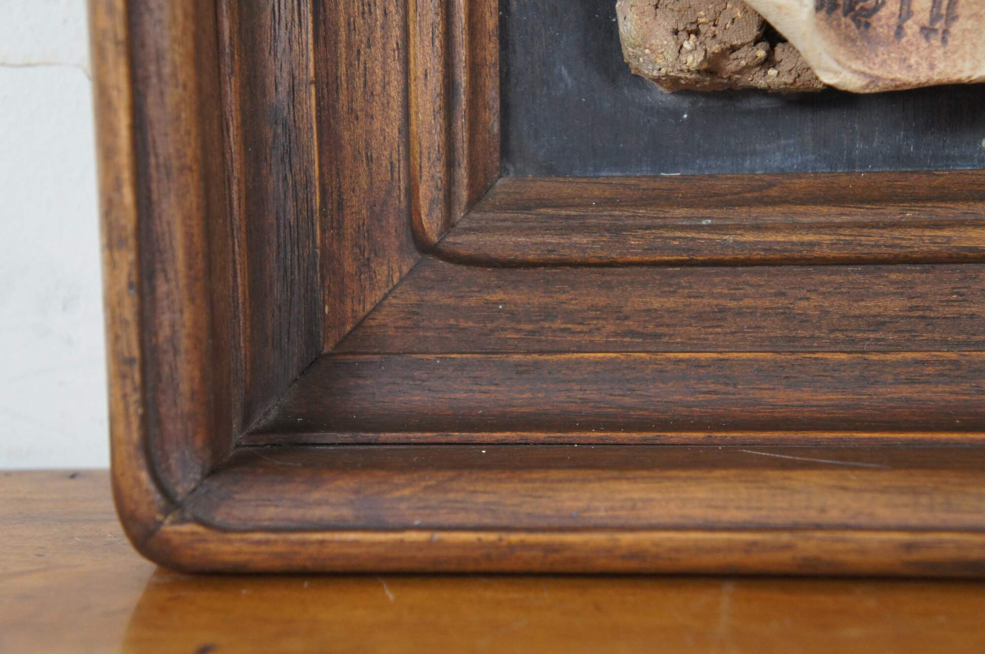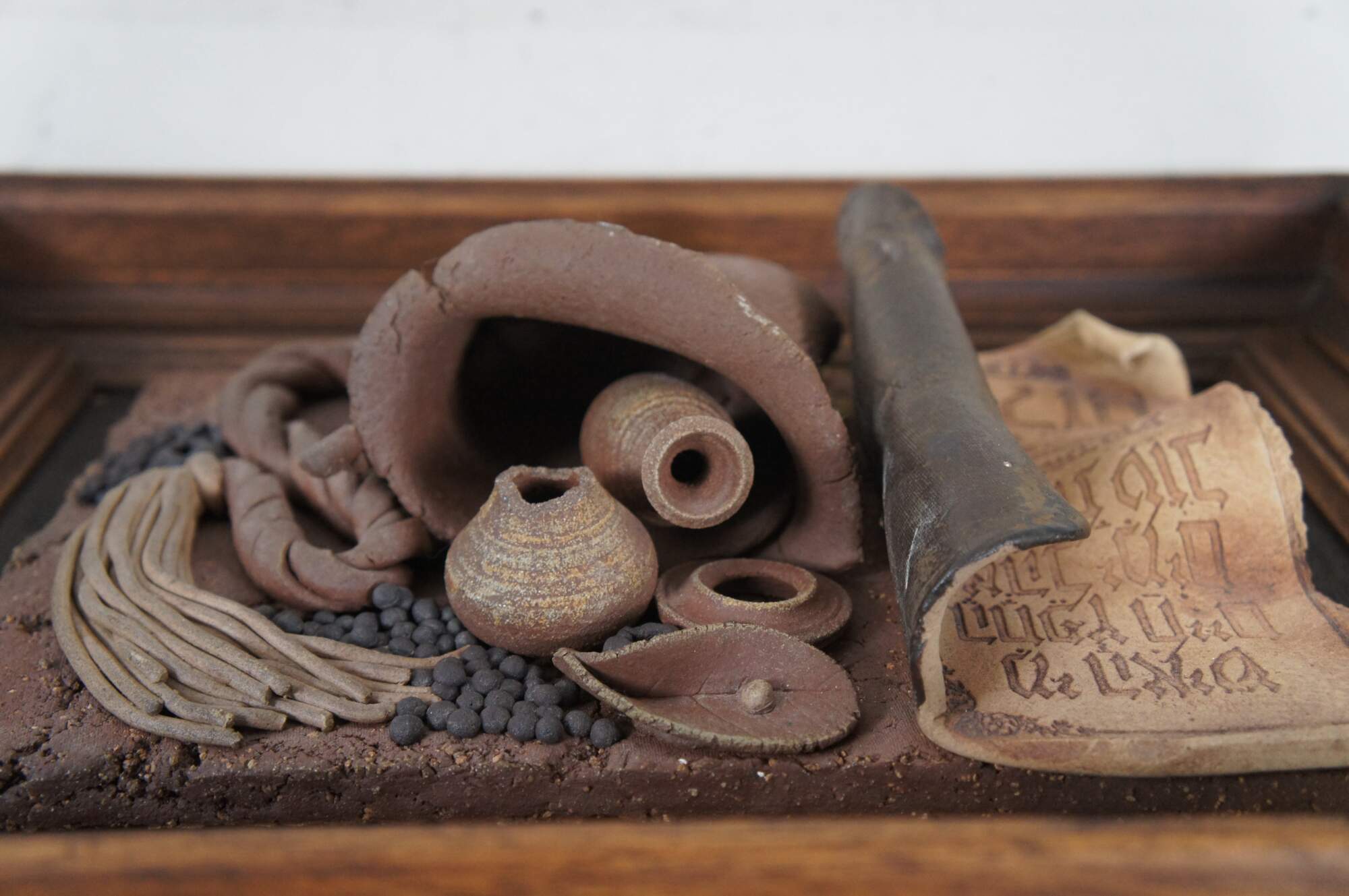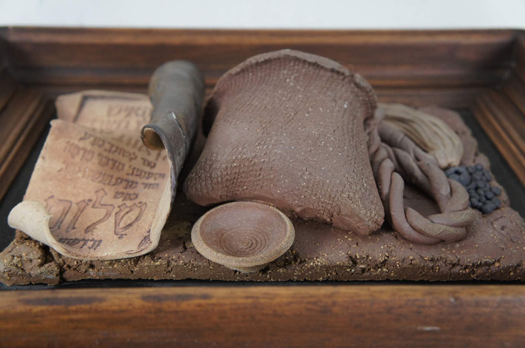 Vintage Judaica Oats of Prayer wall hanging relief / framed sculpture showing a still life viewed from above including a partially curled Hebrew scroll beside a fallen bag of crockery / dishes, fruit, and a rope / flail. Set in a beveled rectangular wood frame.