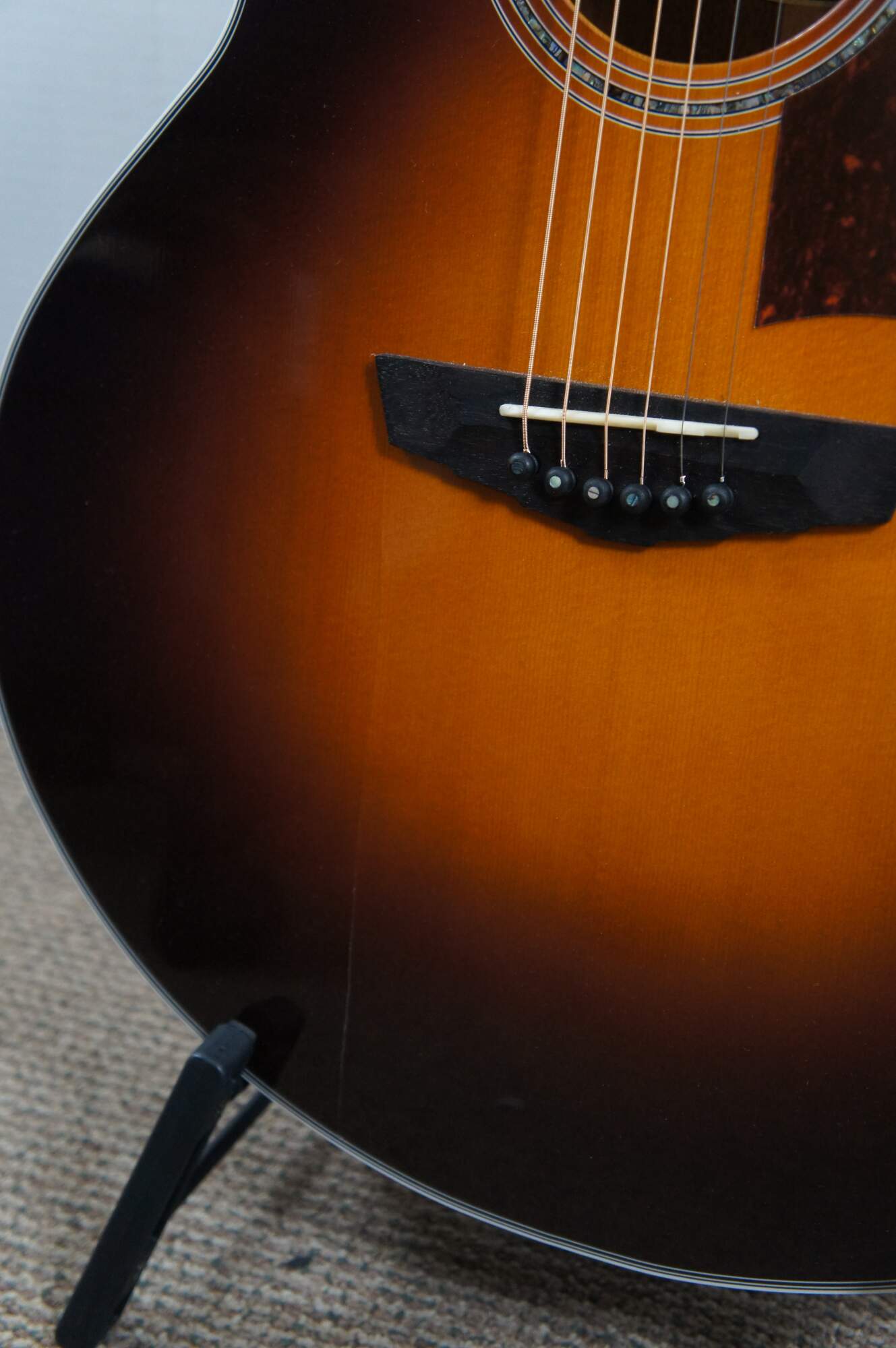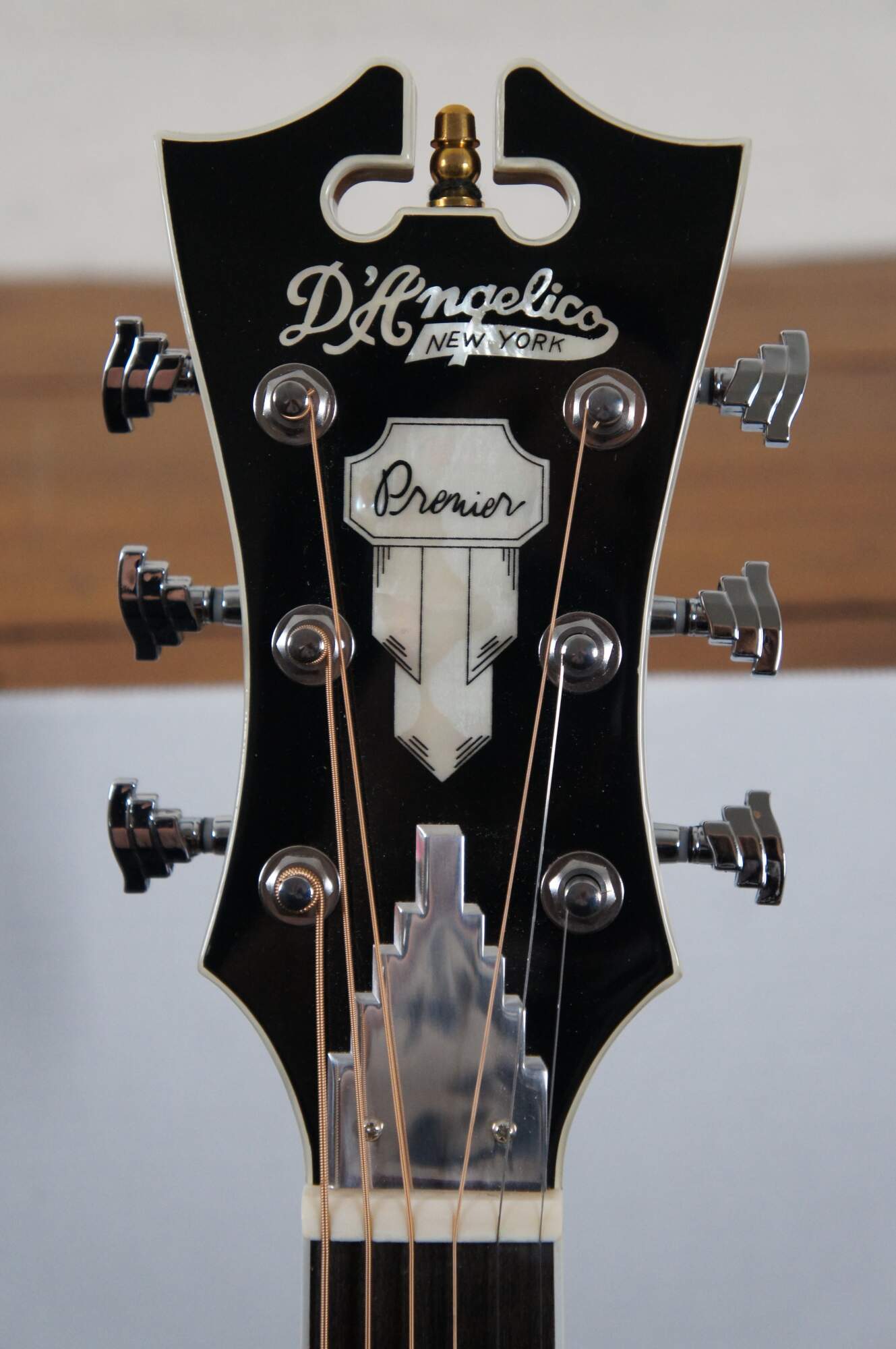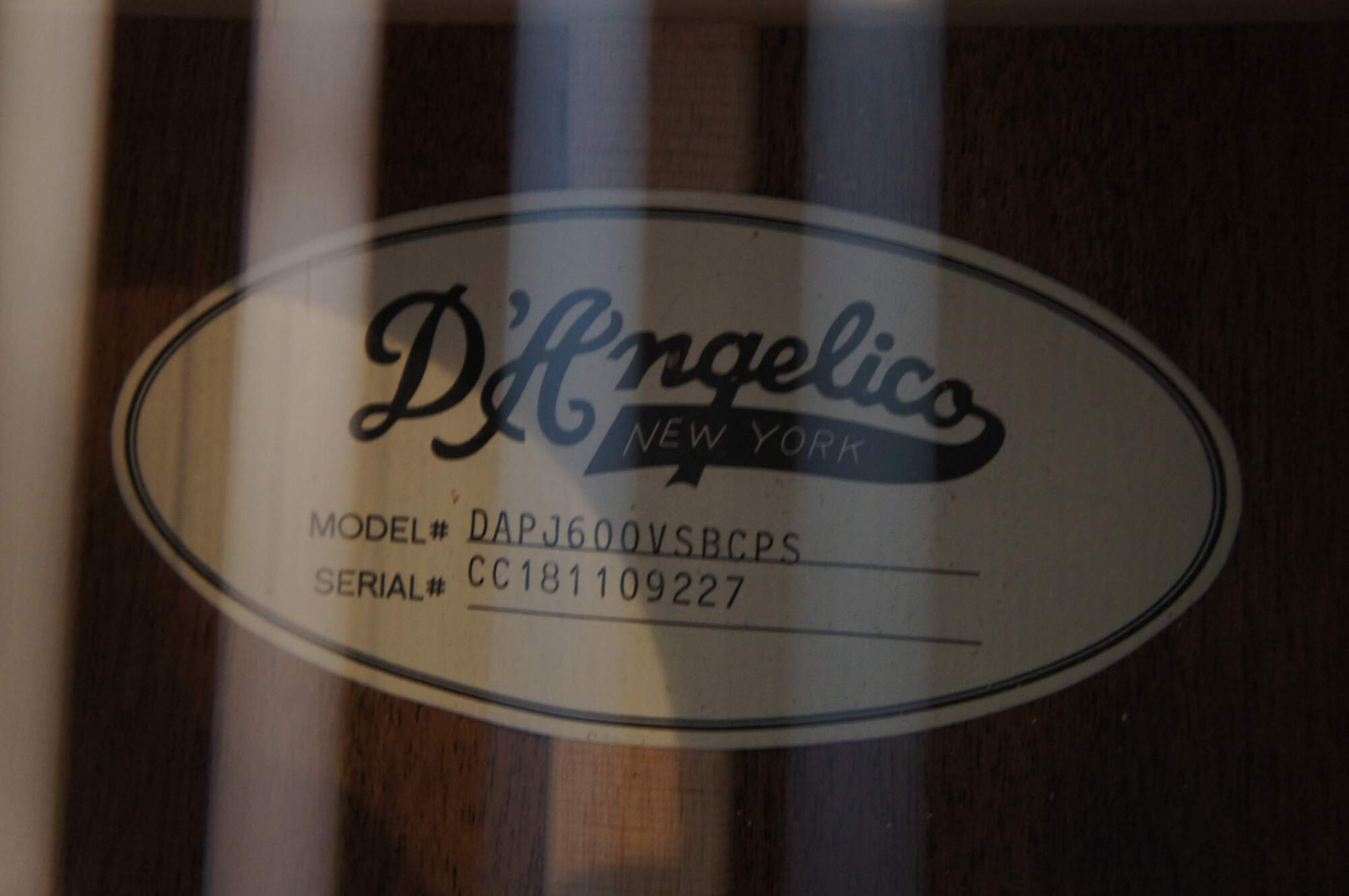Vintage 2018 D’Angelico New York Premier Madison acoustic / electric guitar. Features: Vintage Sunburst coloring, chrome hardware, mother of pearl accents, Rotomatic Stairstep machine head, D'Addario EXP-16 (12-53) strings, ovangkol fingerboard with acrylic pearl inlay, mahogany scarf C-shape neck, jumbo body with solid Sitka spruce top and mahogany laminated back and sides, tortoise scalini pickguard, and 3-ring ABS & abalone rosette. Preamp/Pickup: D’Angelico Onboard Preamp/Tuner. Jack: EG2P mono. Model #: DAPJ600VSBCPS. Serial #: CC181109227. Discontinued item. MSRP: $499.99