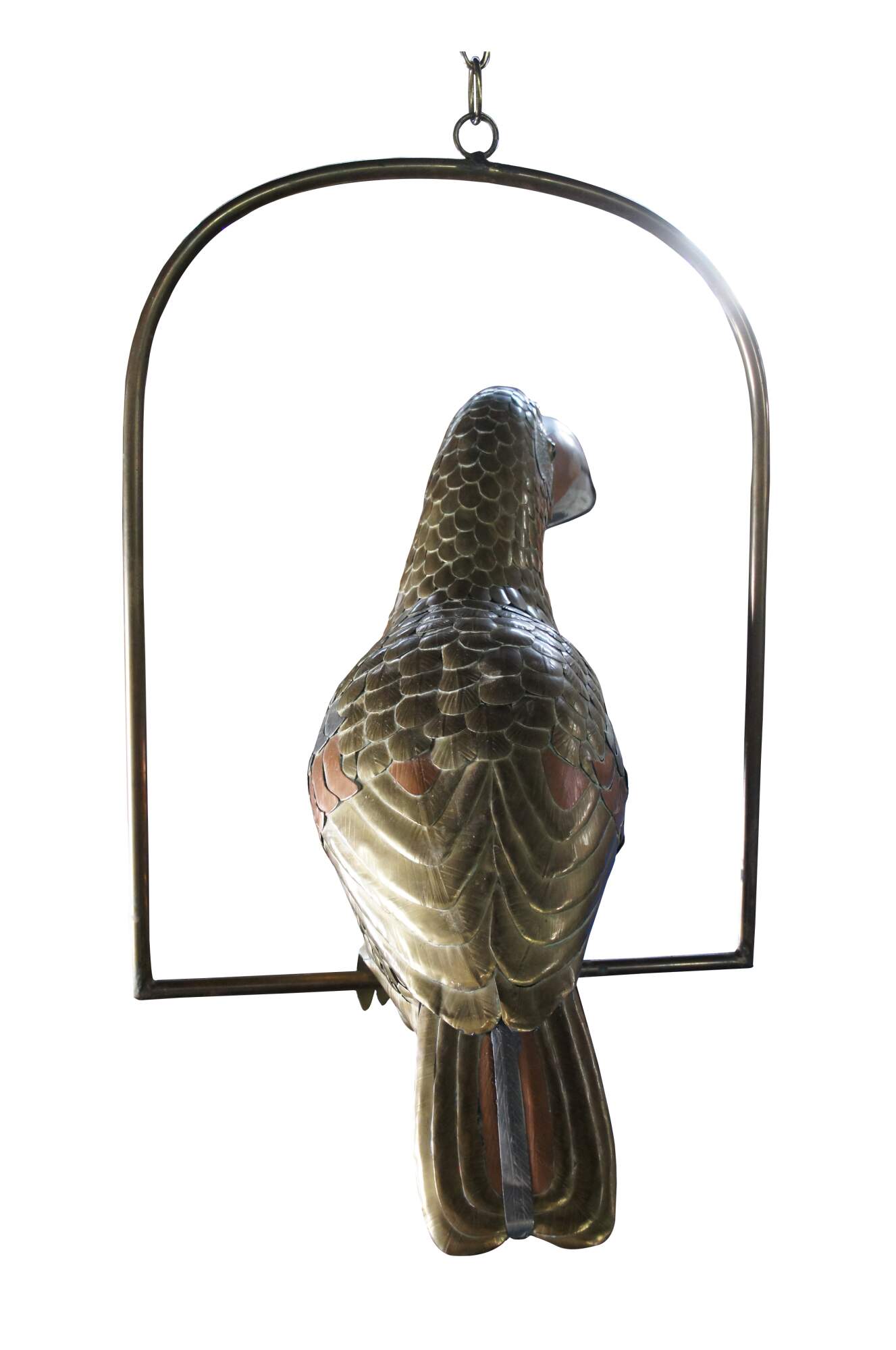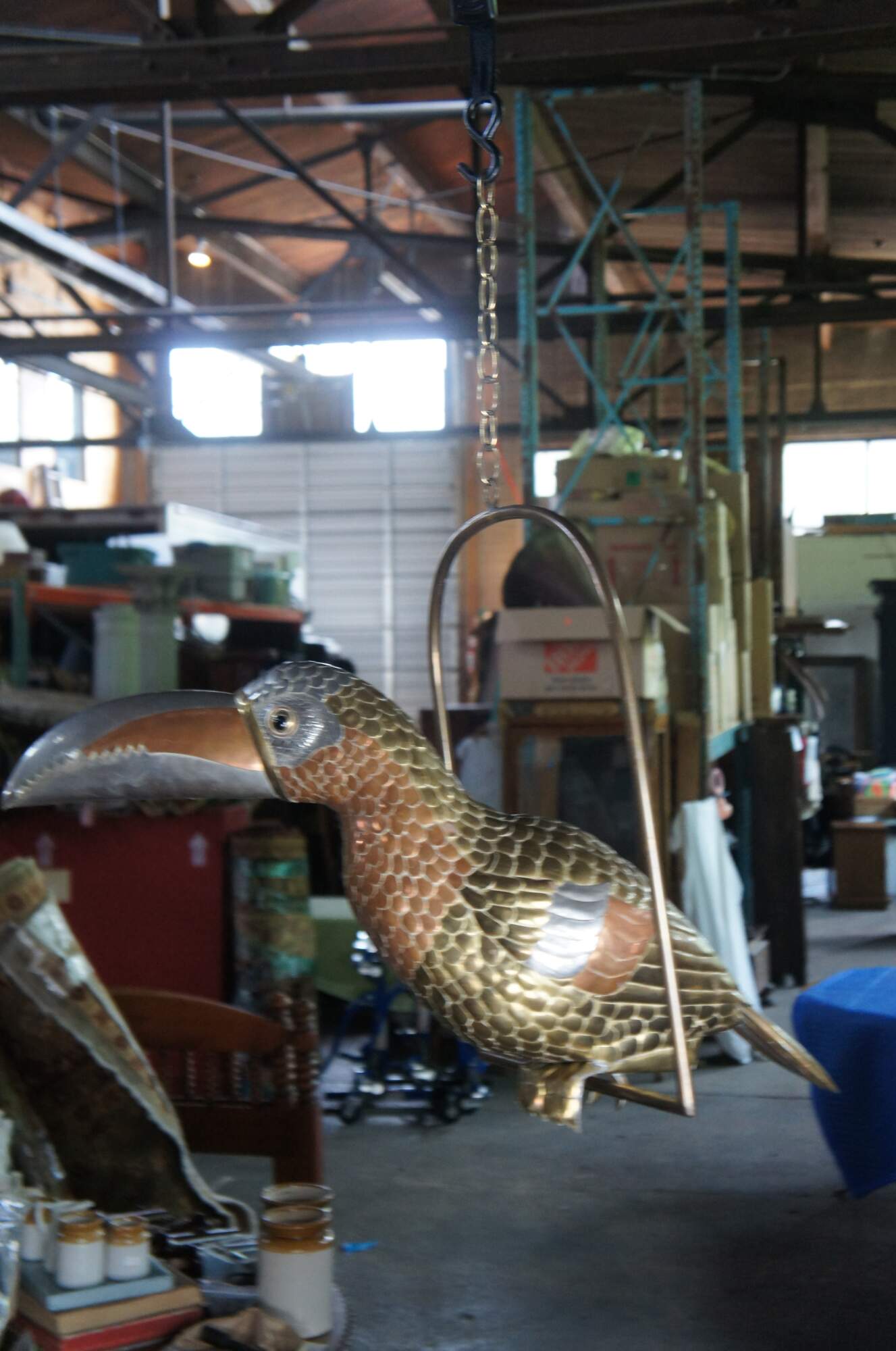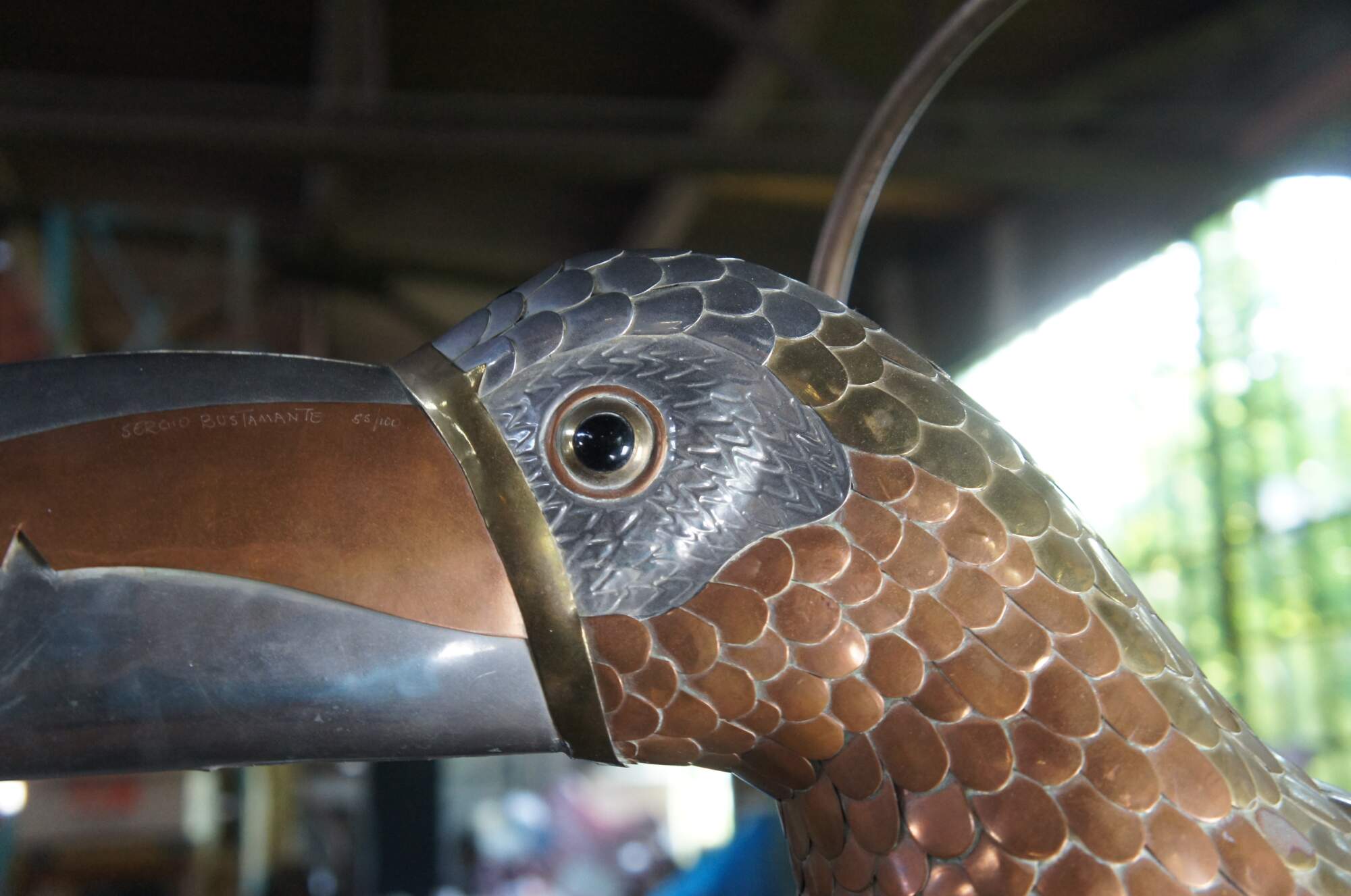 Impressive Toucan sculpture by Sergio Bustamante, circa 1970s. Sergio is a renouned Mexican artist and sculptor. He was born in Culiacan, Sinaloa, in 1949, and studied architecture at the University of Guadalajara. Bustamante's first art exhibition showcased paintings and papier-mâché figures at the Galeria Misracha in Mexico City in 1966. This beautiful specimen is made from copper, brass and nickel. The bird is perched on a stand which has a chain for hanging. Signed along the beak #55/100