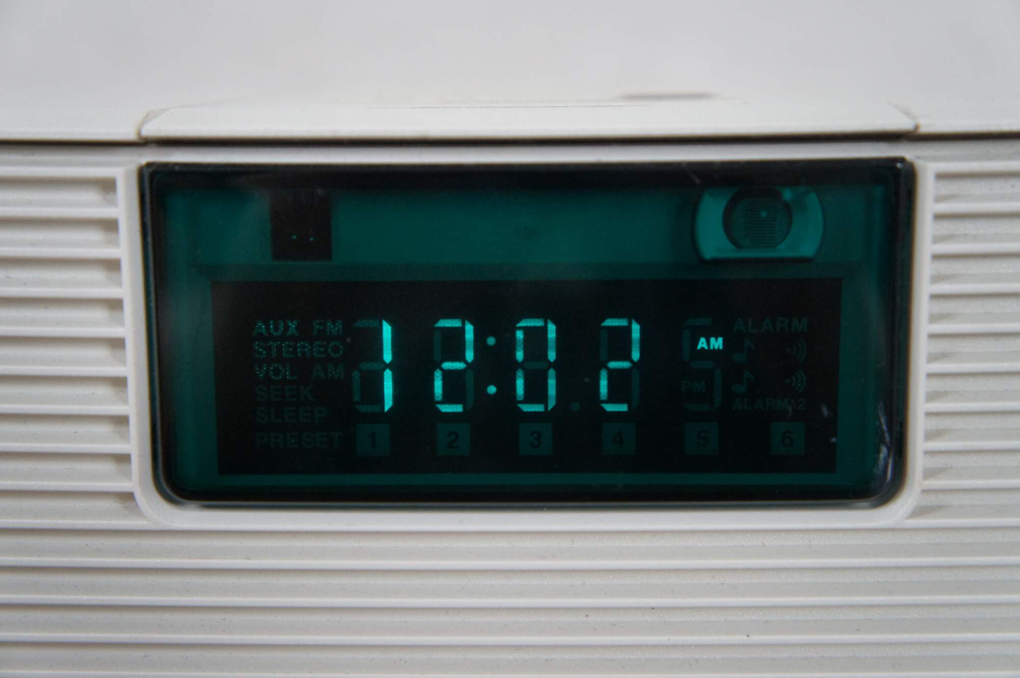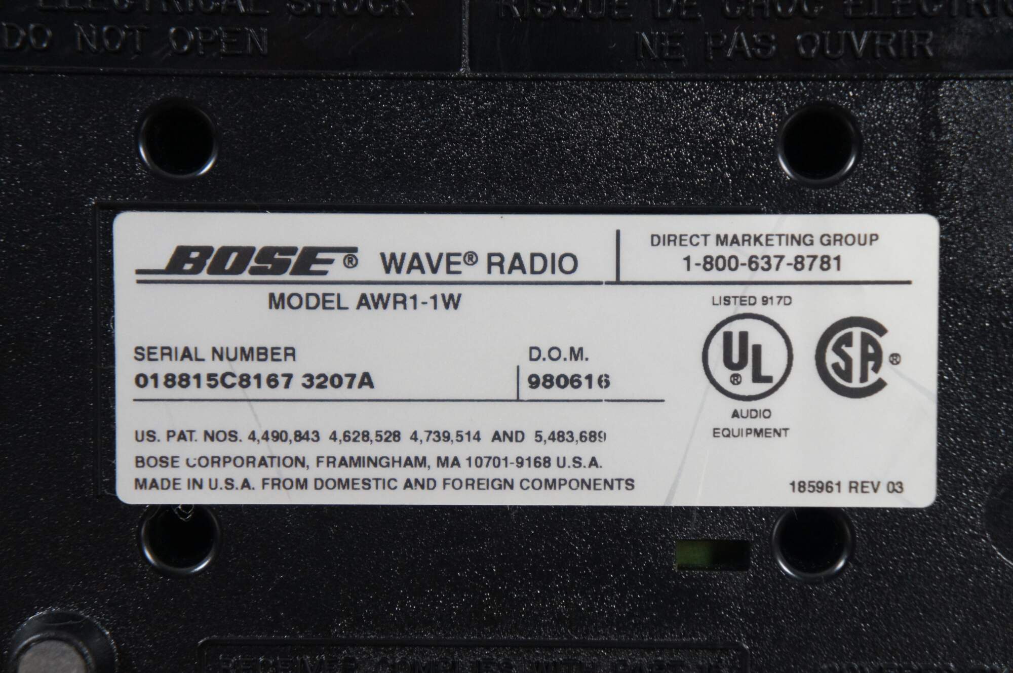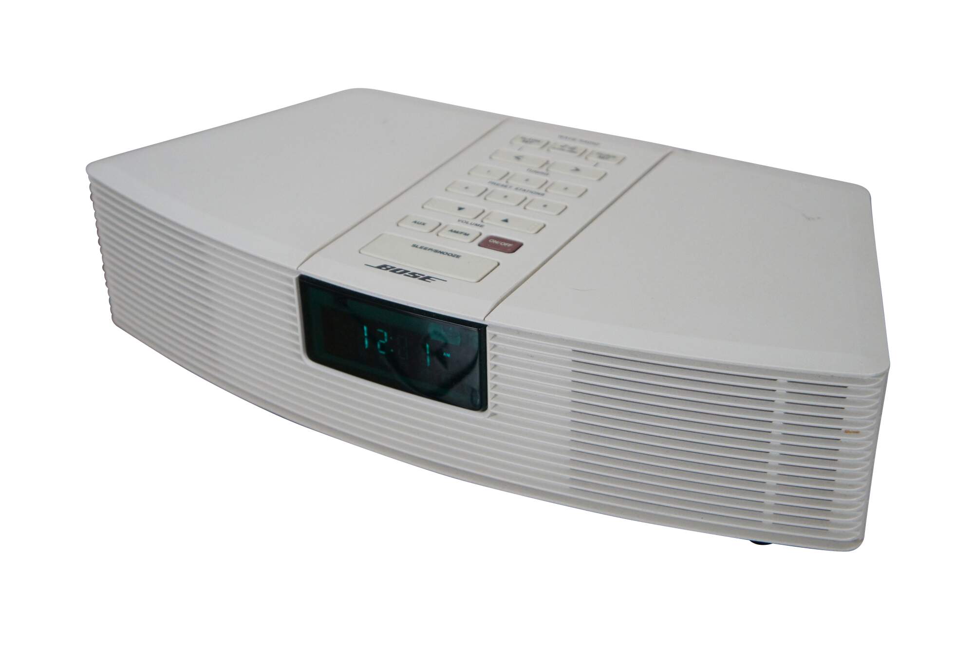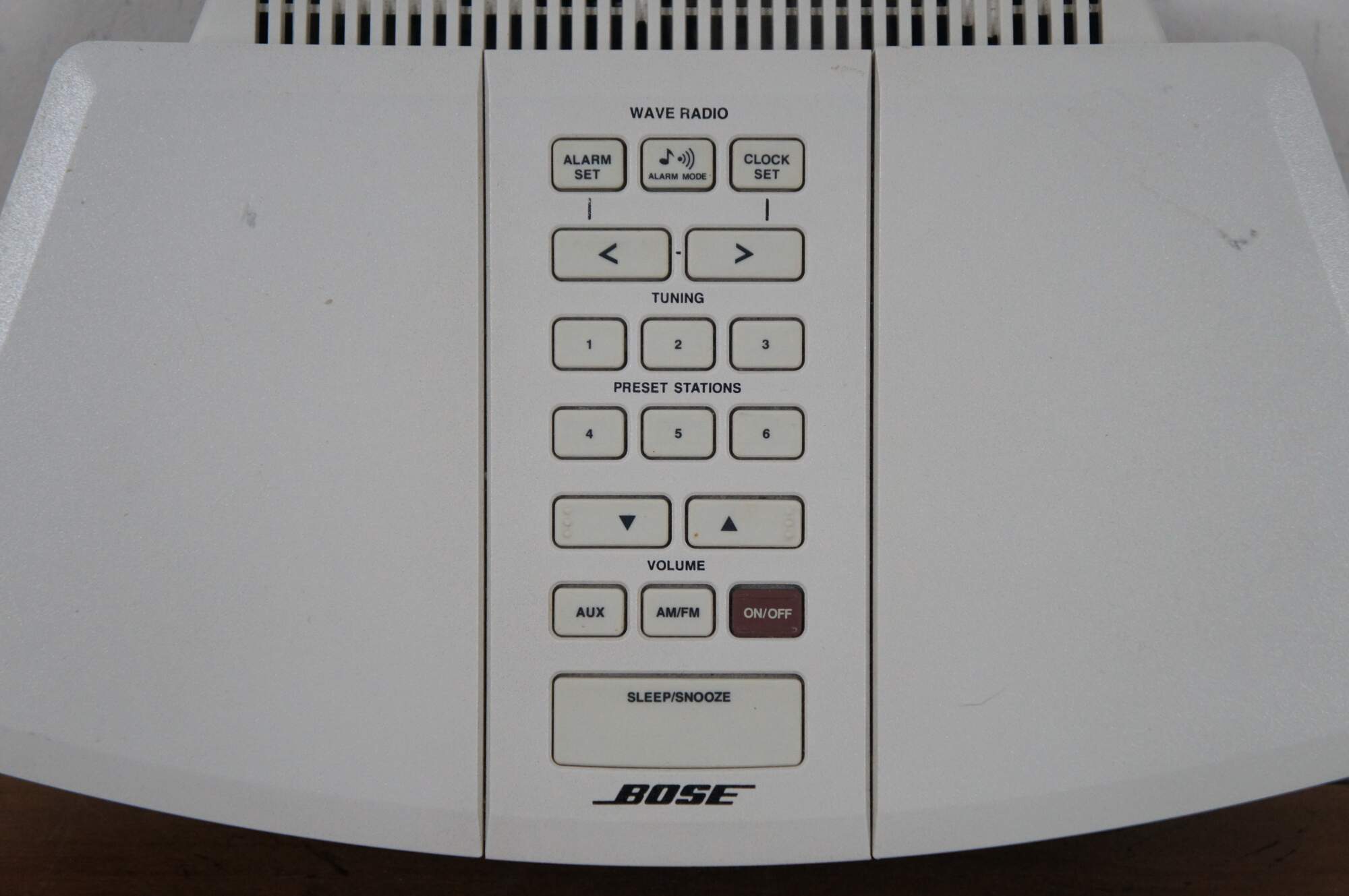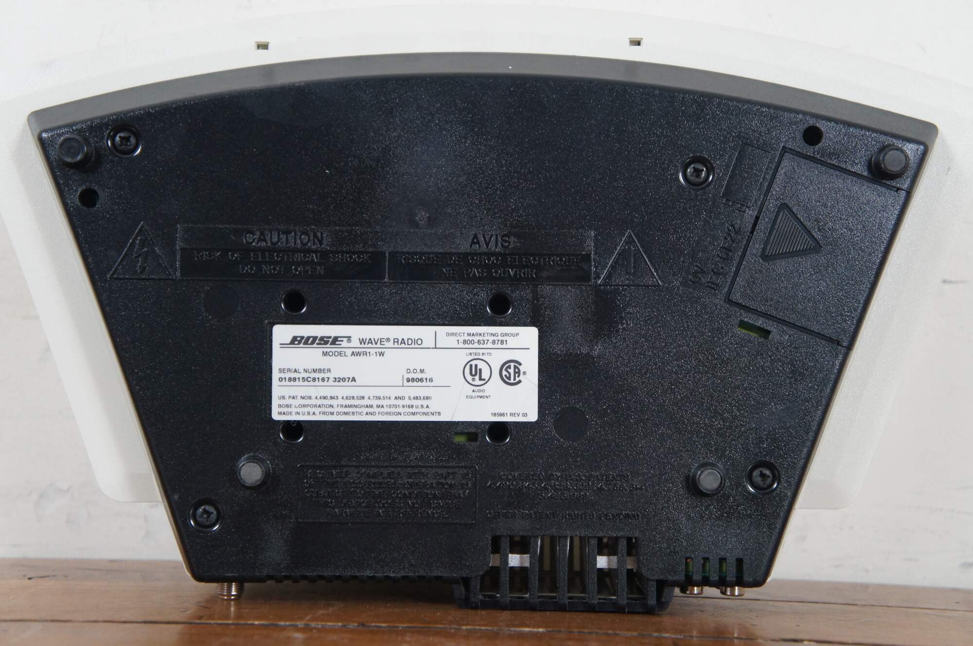 Vintage 1990’s Bose Wave Radio alarm clock in white with 6 station pre-sets, AM/FM stereo, aux inputs and remote control. Model AWR1-1W. Serial Number: 018815C8167 3207A