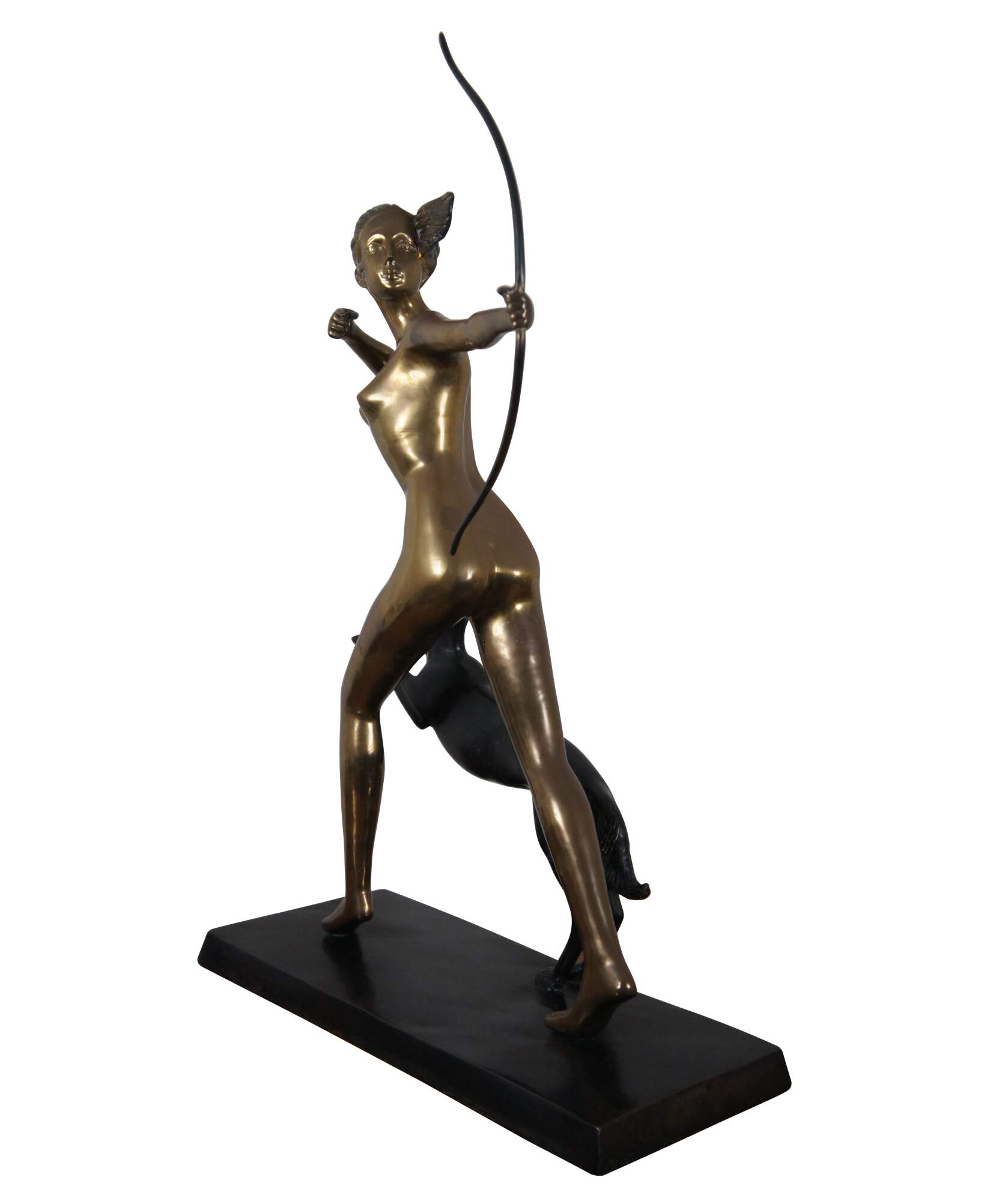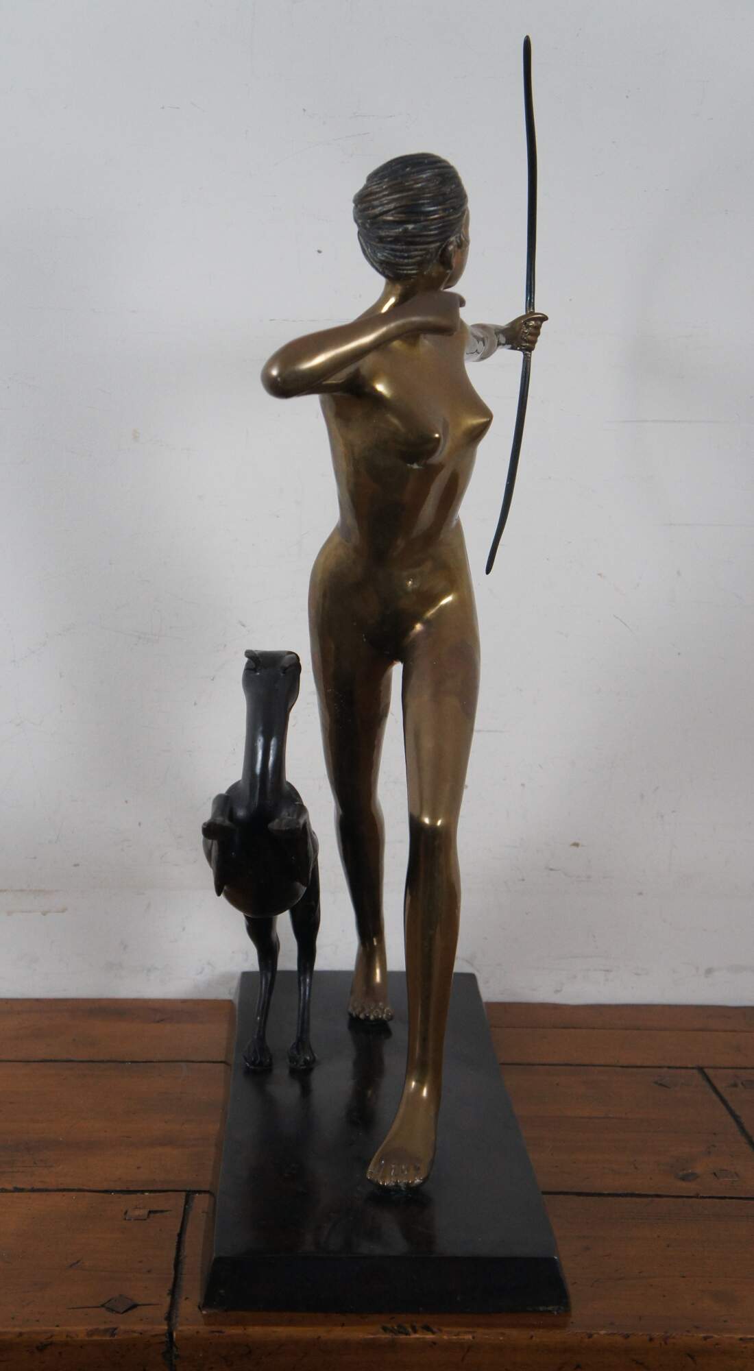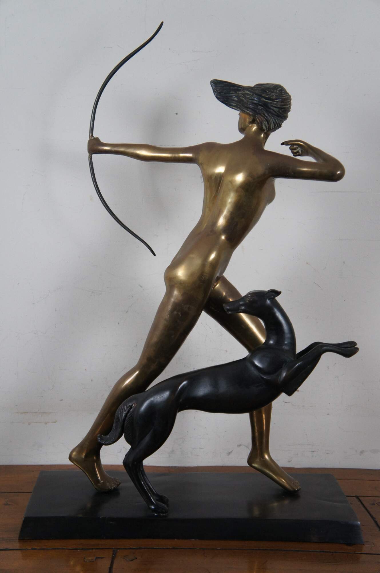 A large and impressive vintage art deco style bronze and brass nude figural sculpture of the Greek / Roman goddess of the hunt Artemis / Diana, shooting a bow as she runs side by side with a Greyhound dog. Marked / signed on base.