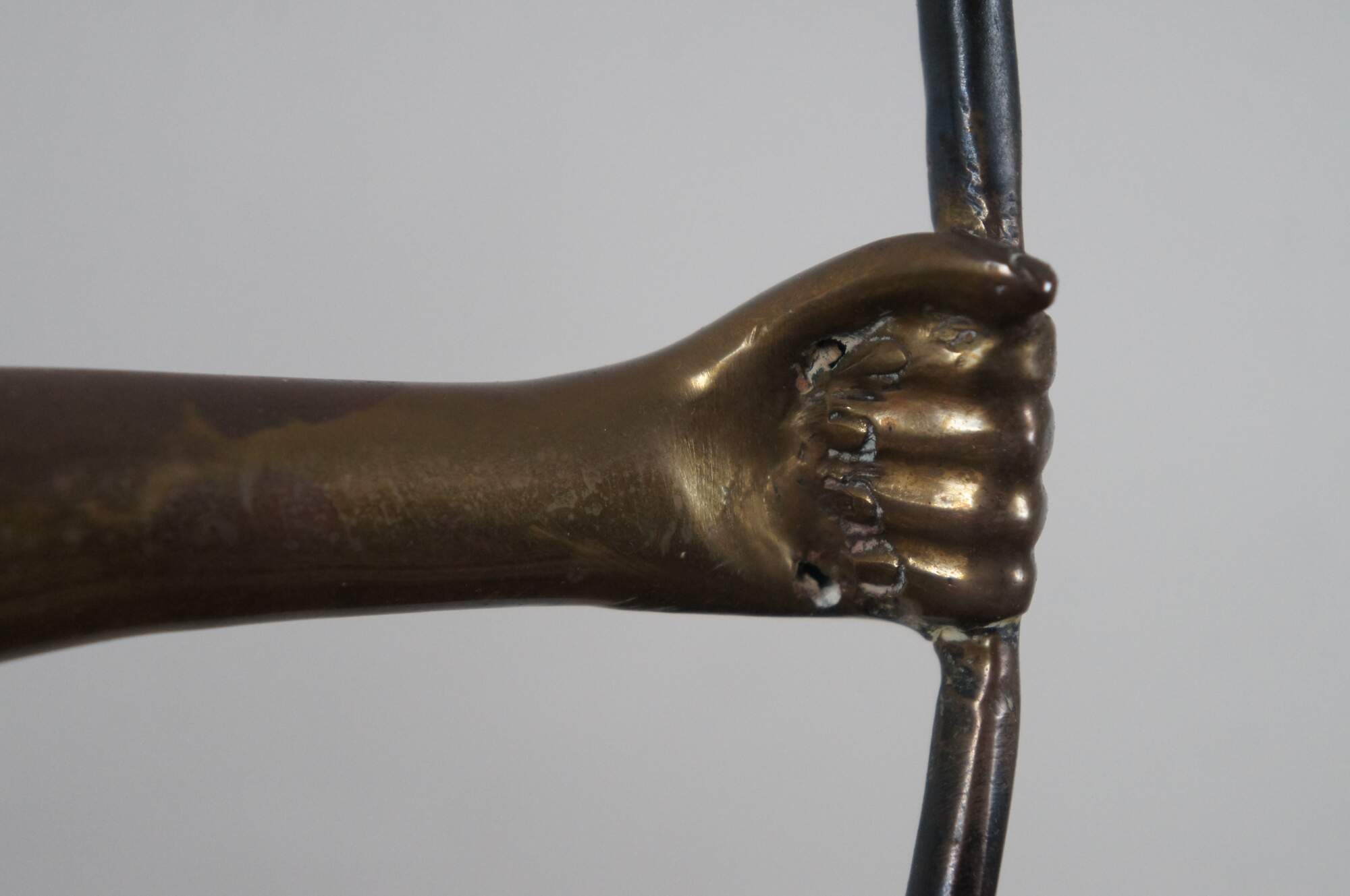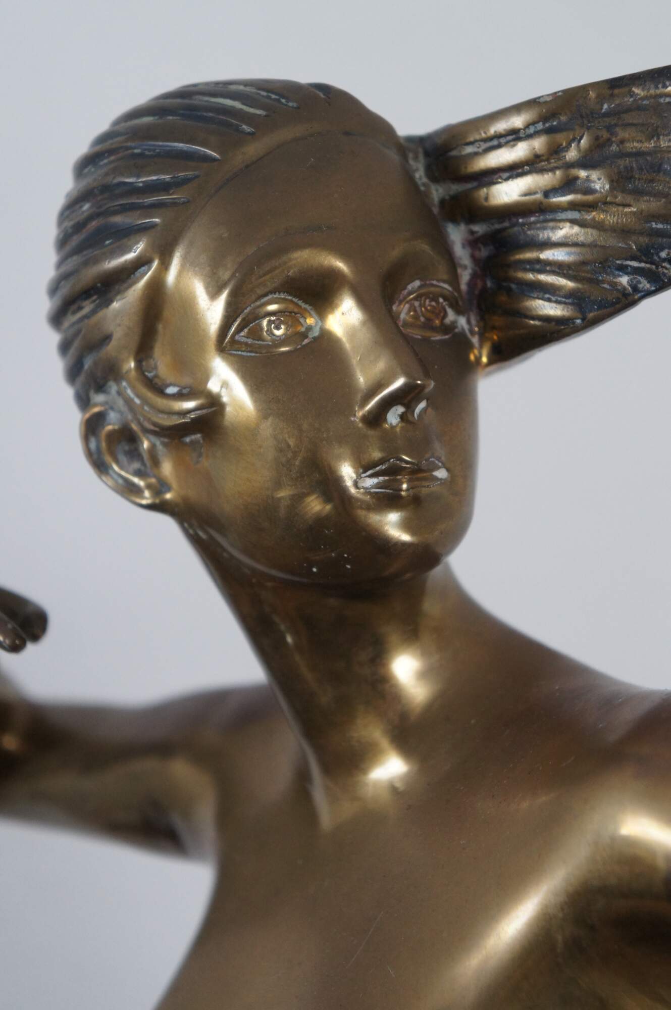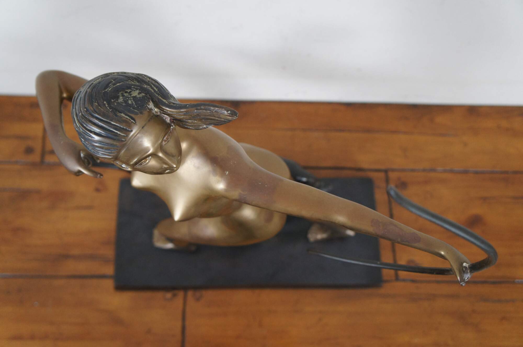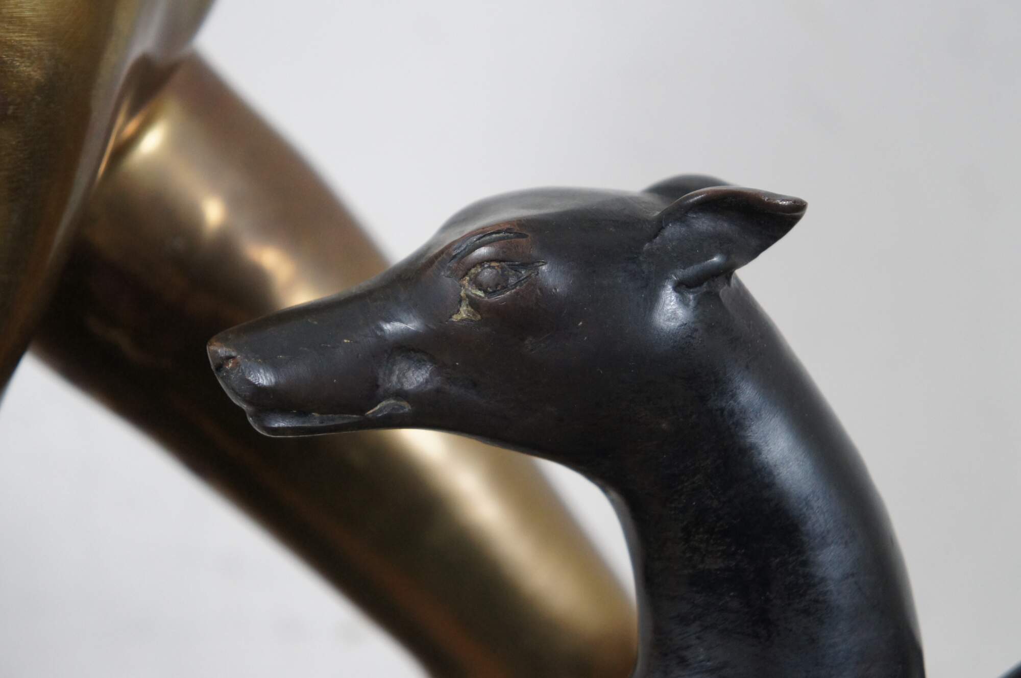 A large and impressive vintage art deco style bronze and brass nude figural sculpture of the Greek / Roman goddess of the hunt Artemis / Diana, shooting a bow as she runs side by side with a Greyhound dog. Marked / signed on base.