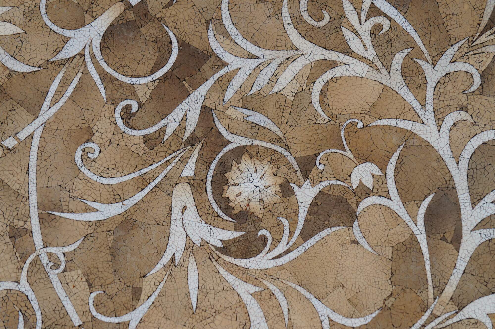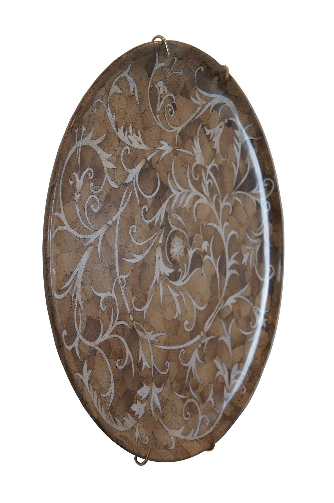 A rare Maitland Smith over sized round Charger / platter / tray featuring a lacquered floral mosaic pattern in shades of brown and white. Includes support for wall hanging.