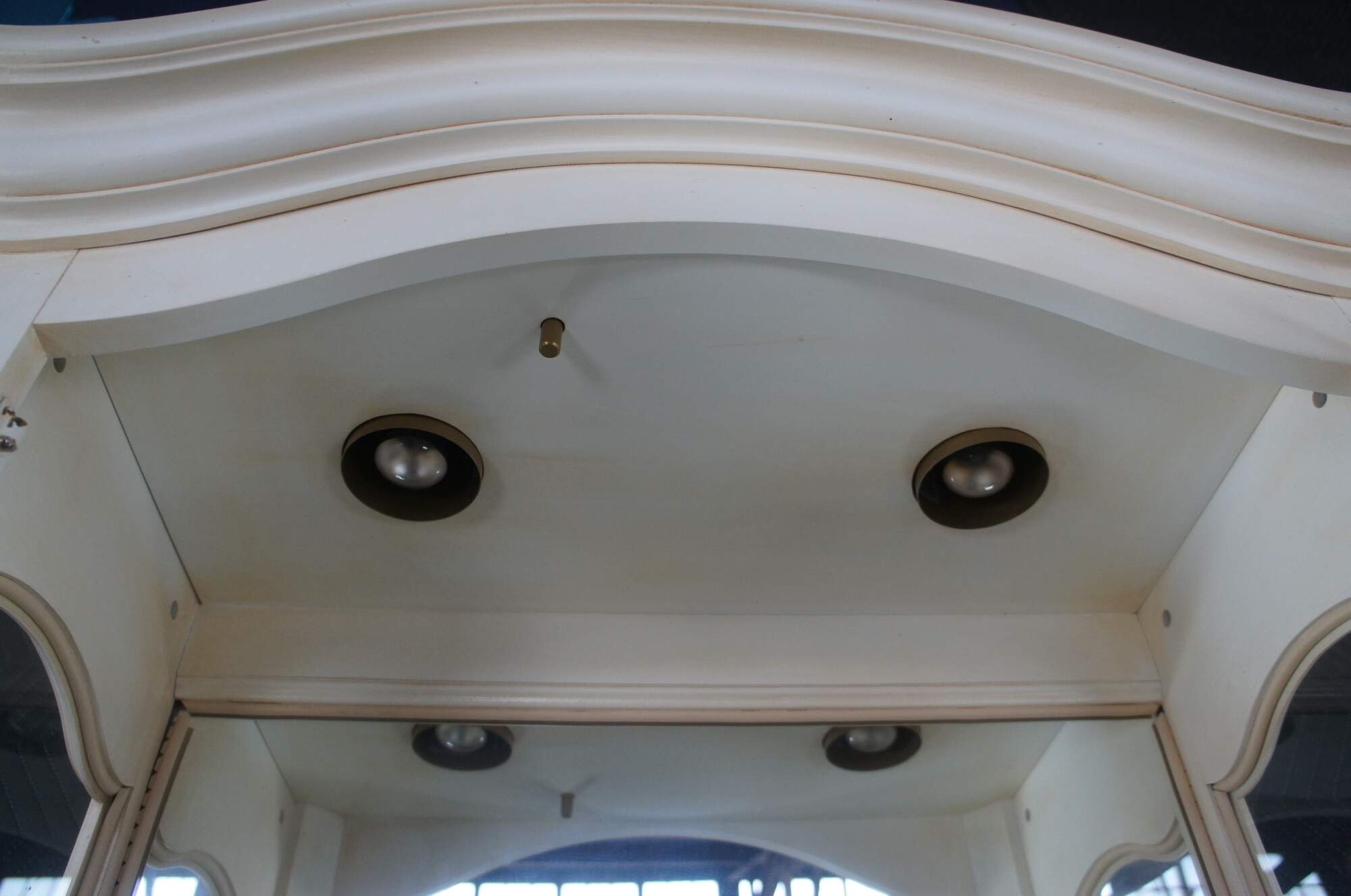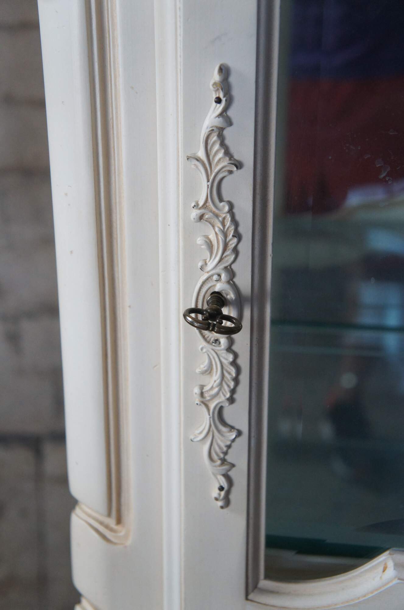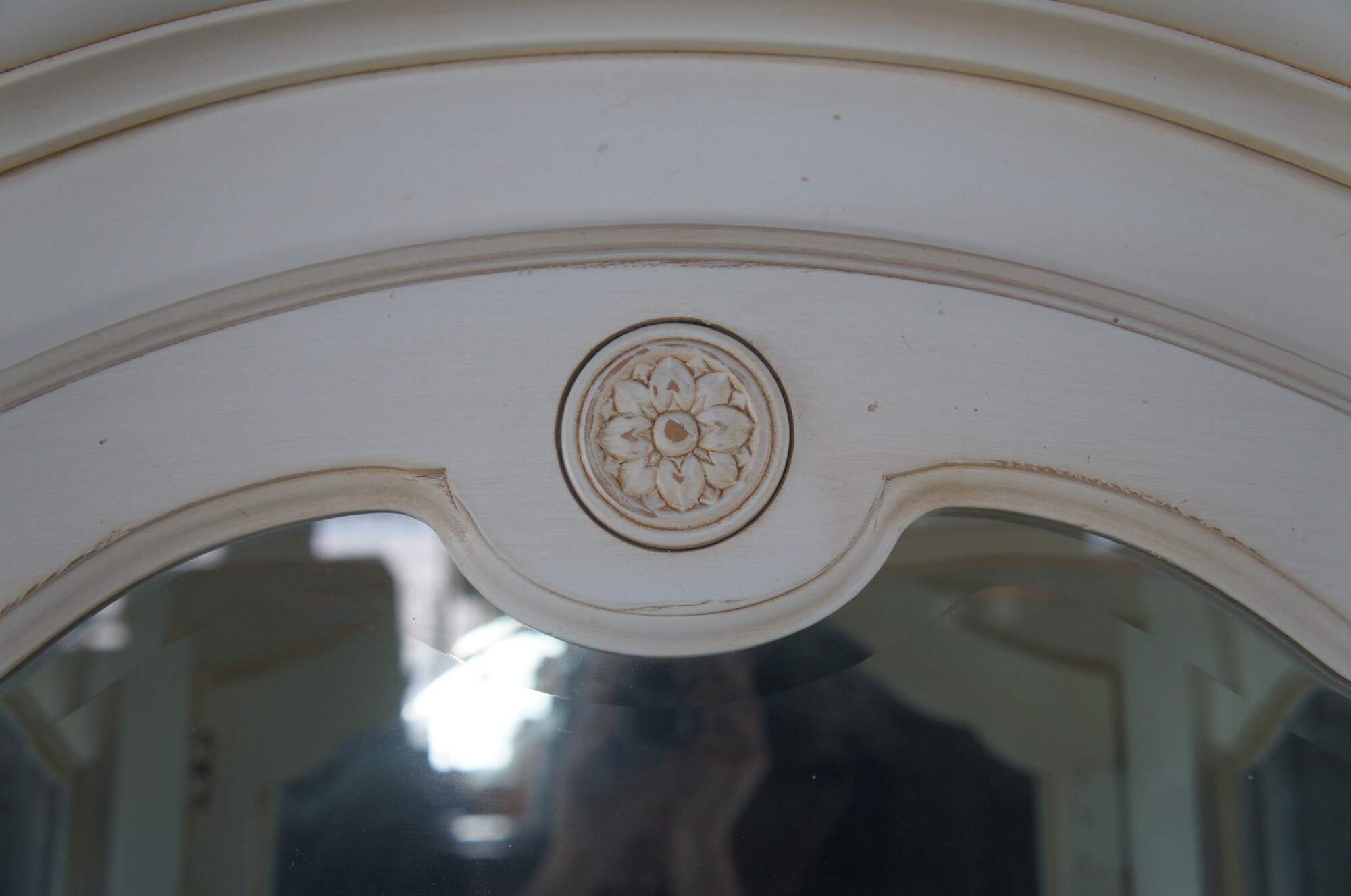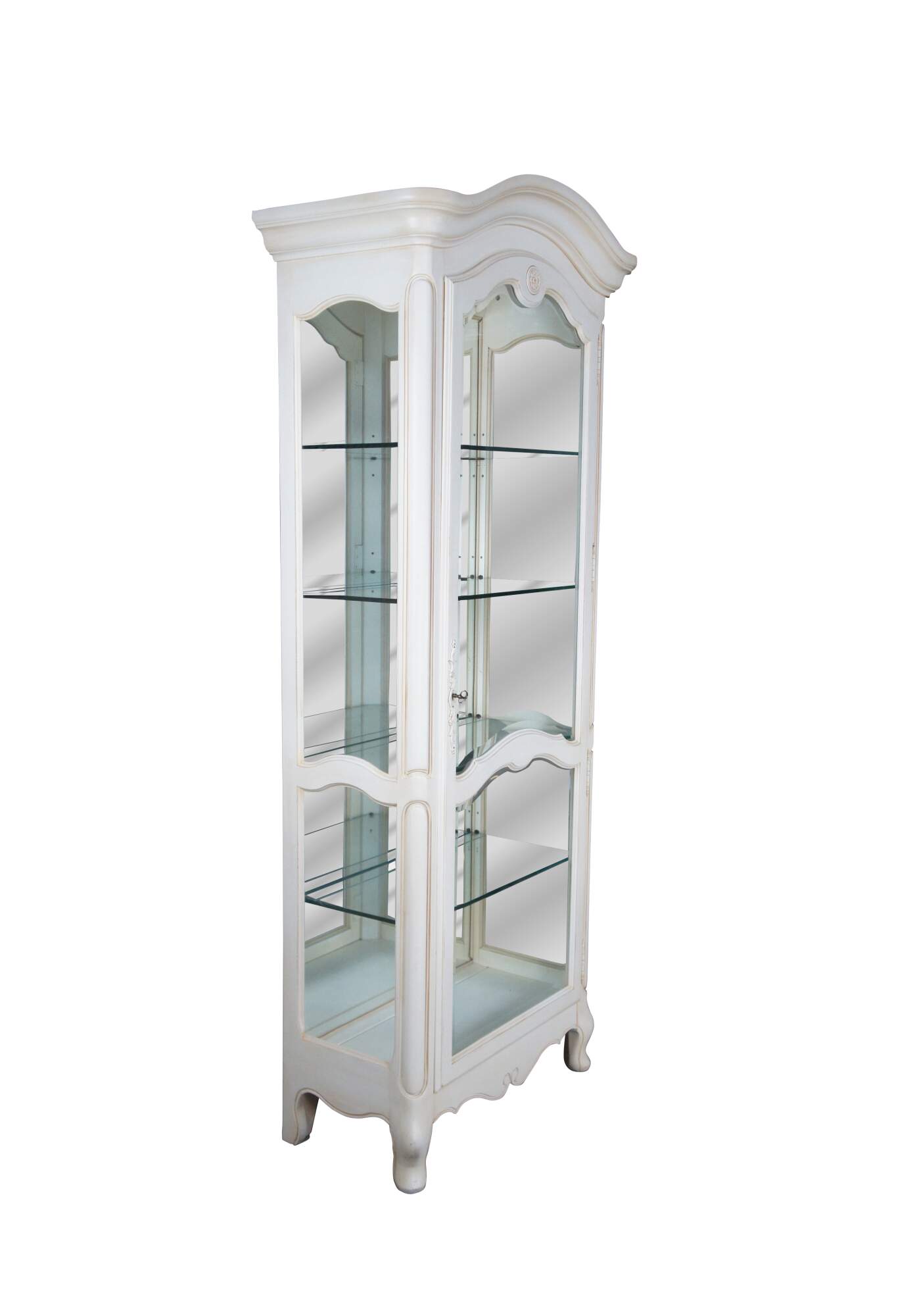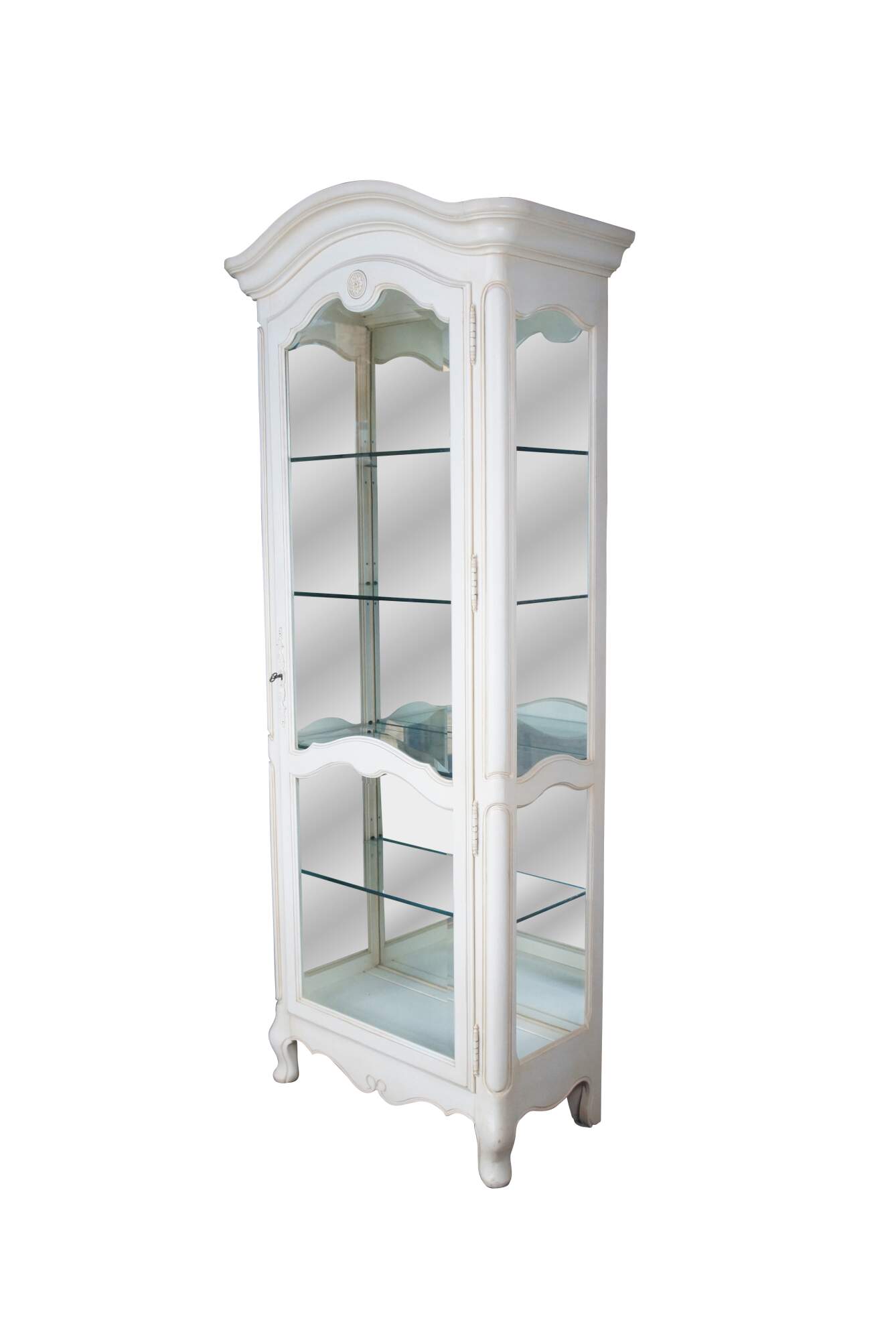Ethan Allen Country French Curio Cabinet, 26-9208 with 647 Provincial finish. A quaint display with arched bonnet, carved medallion beveled glass door, glass sides and cabriole feet. Features glass shelves with plate groove, 2 cannister lights with rheostat, lock and key.