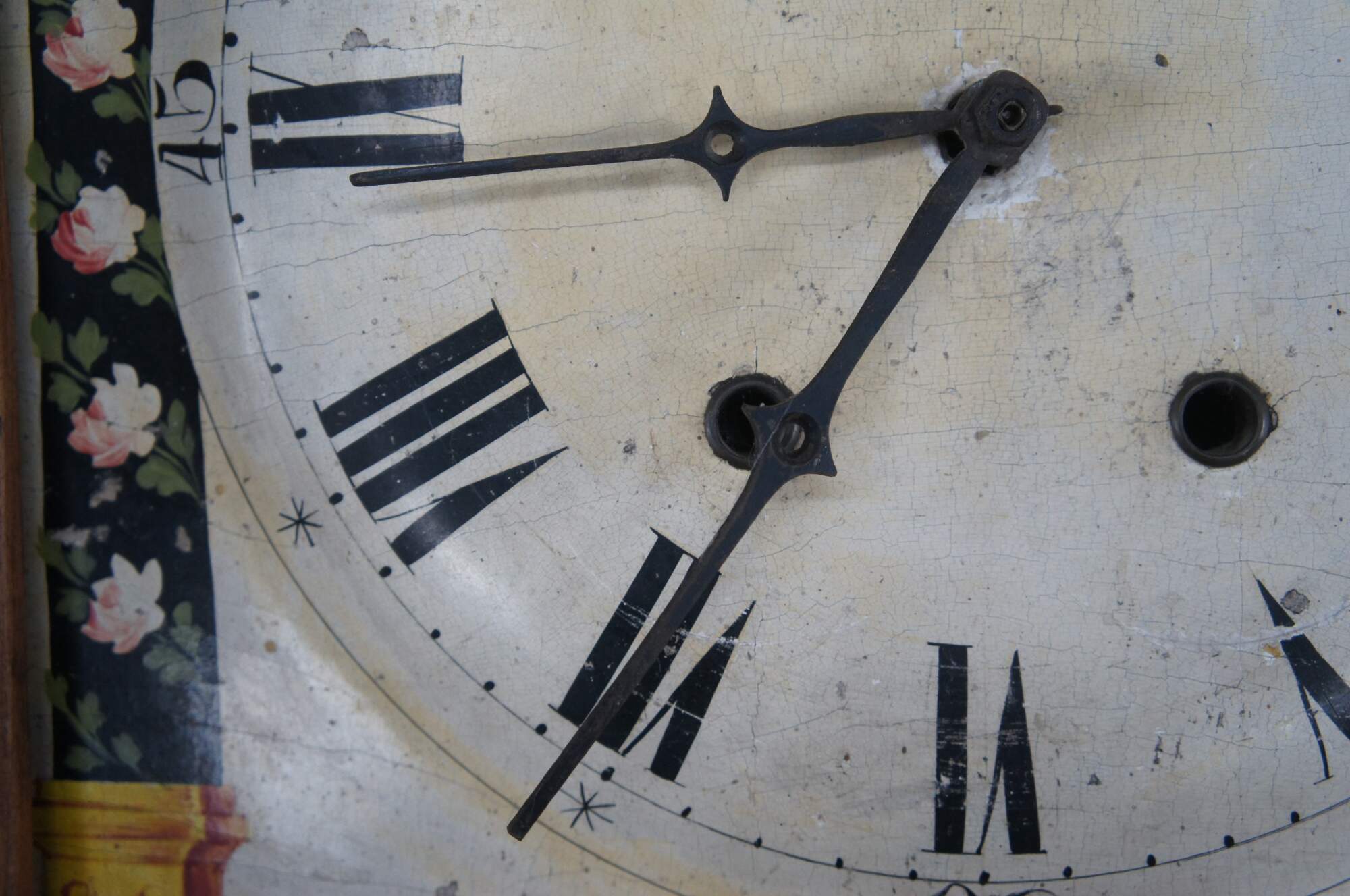 A beautiful tall case clock, circa first half 19th century. Features an American Cherry case with a strip of crotch mahogany veneer below the face. The hand painted face is accented by empire painted columns and a bouquet of flowers at the top. Includes functional lock and key.