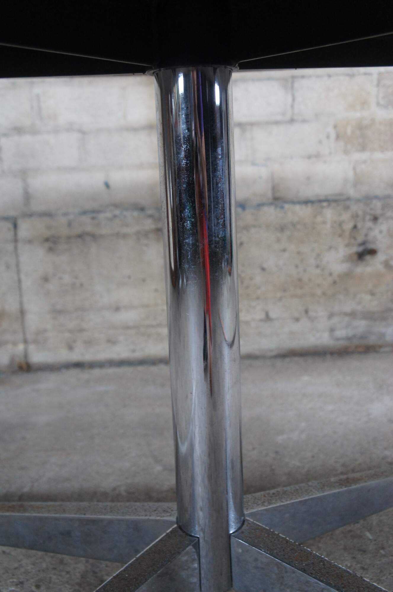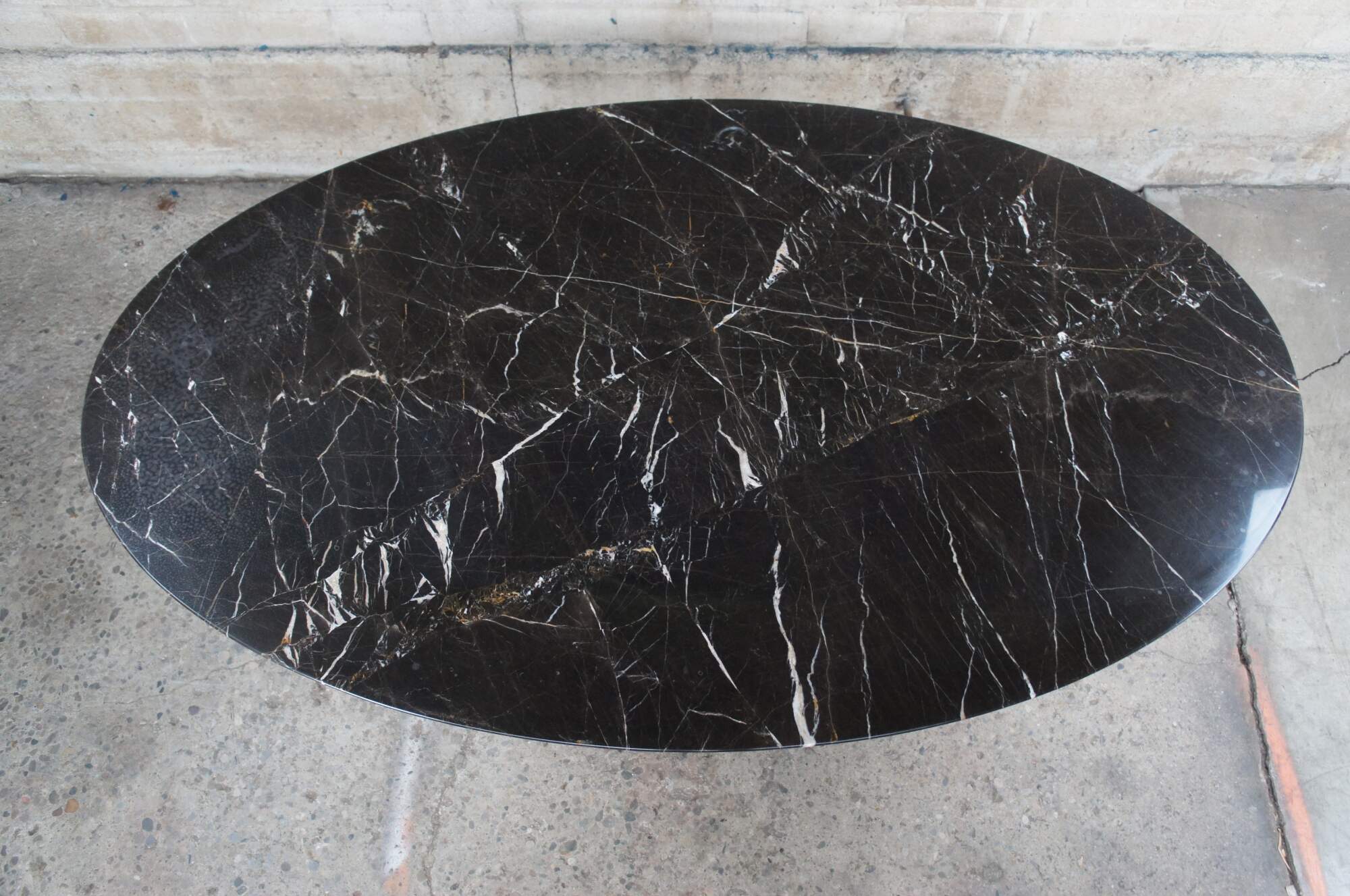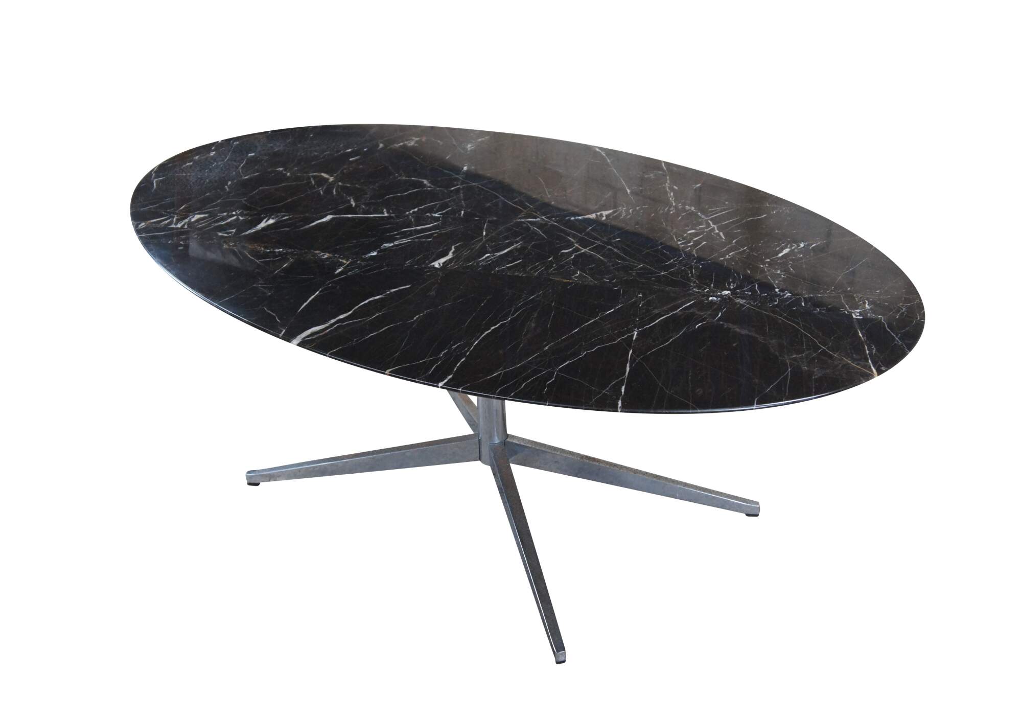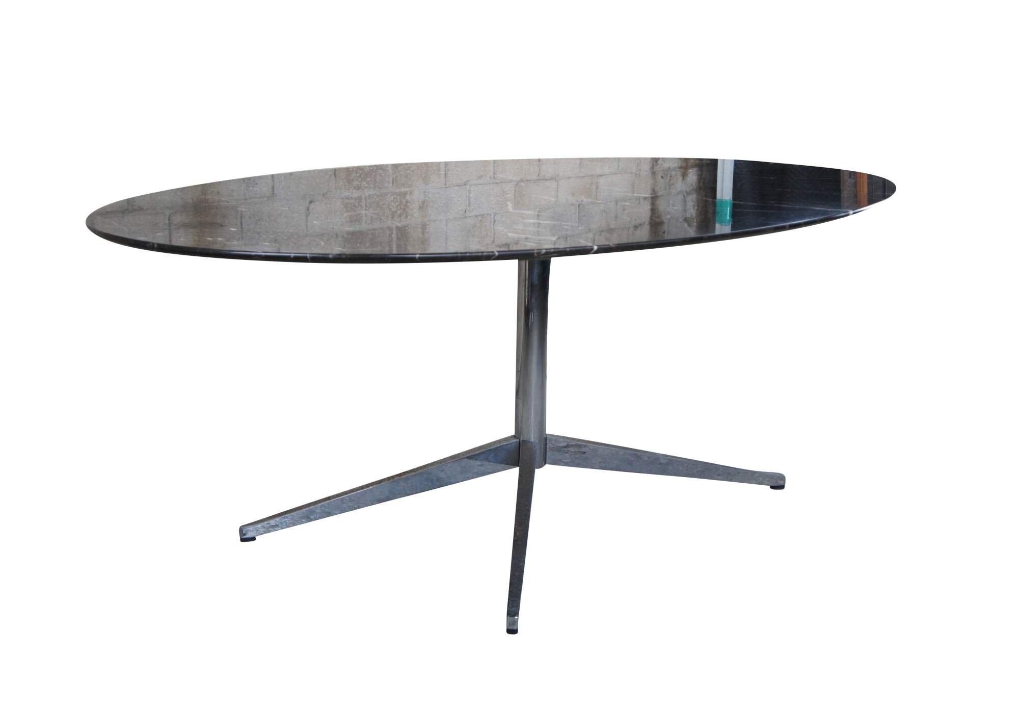 An iconic Florence Knoll dining / conference table or desk. Features a beautiful oval Marquina marble top over a chrome plated steel tripod base, circa 1960s.