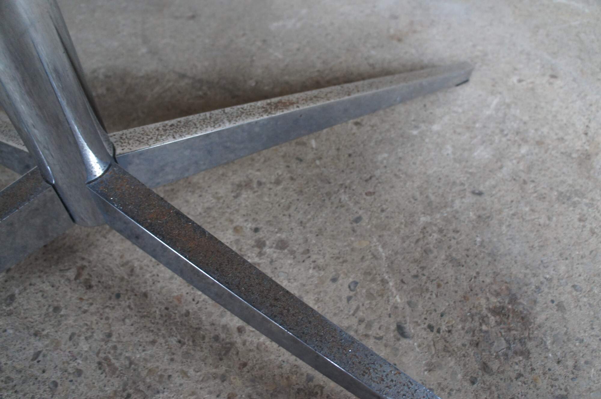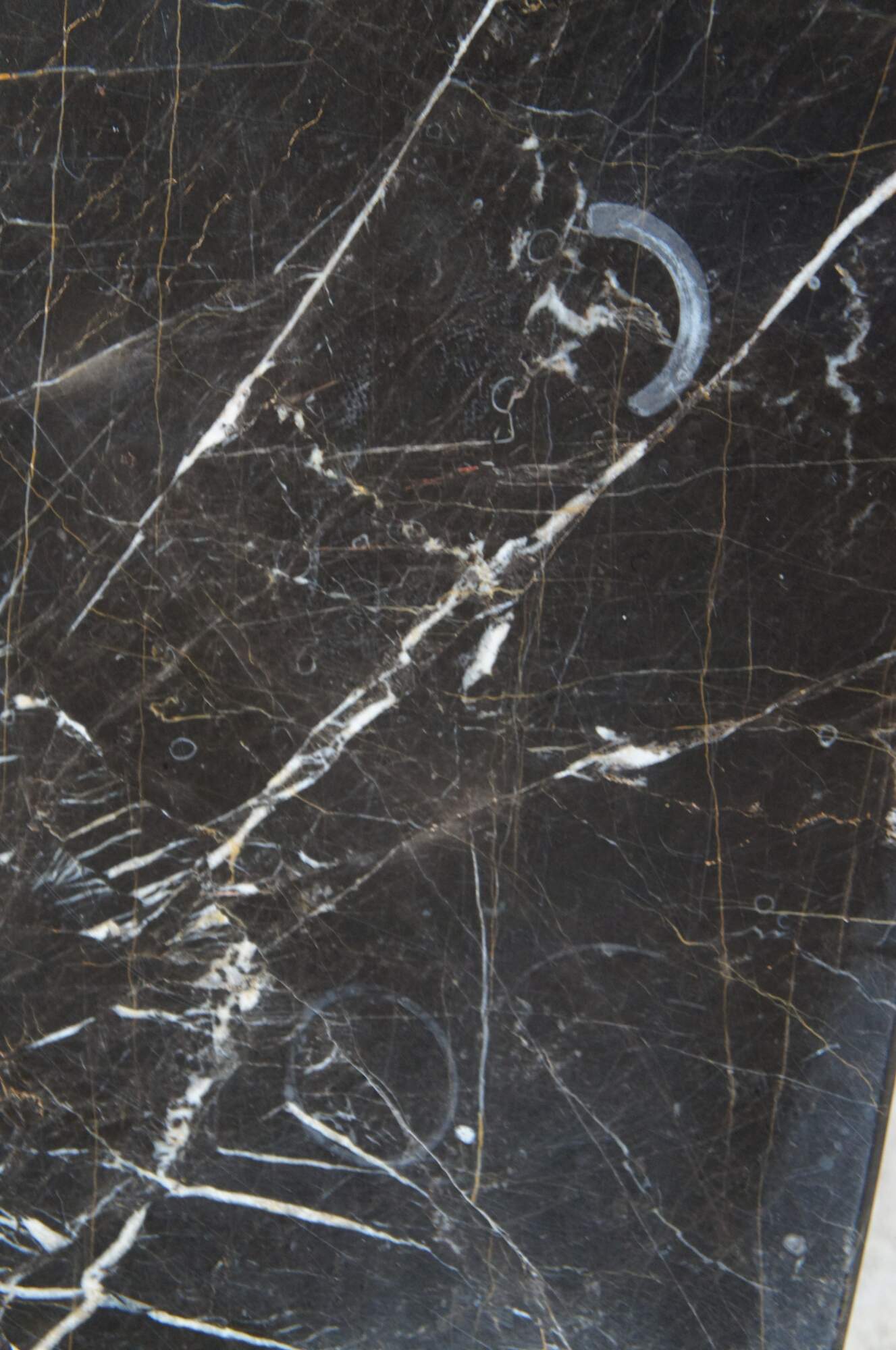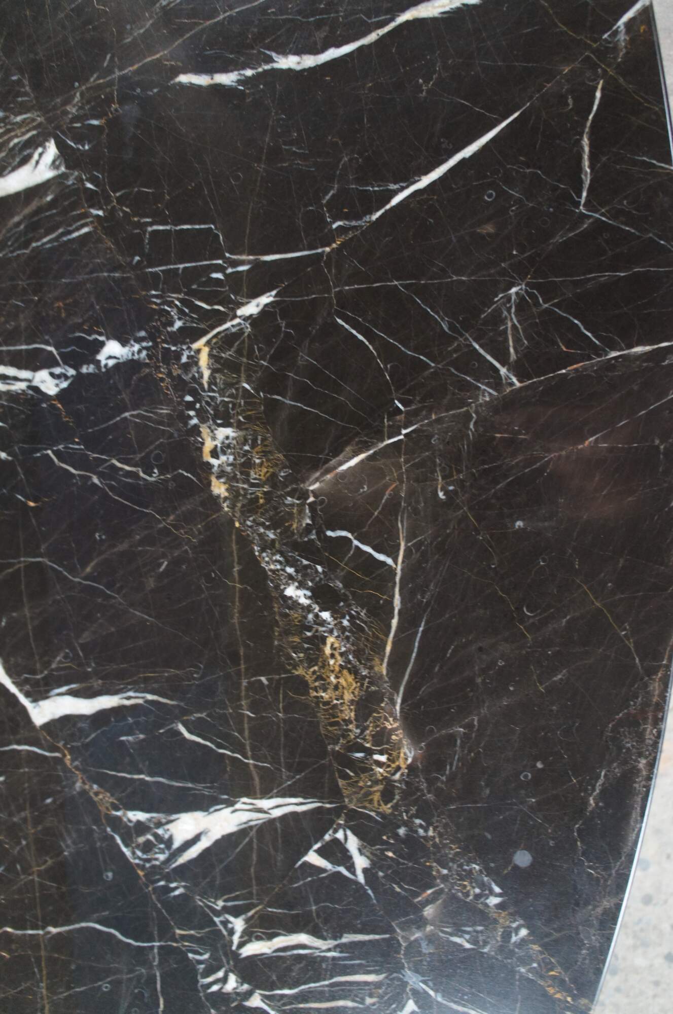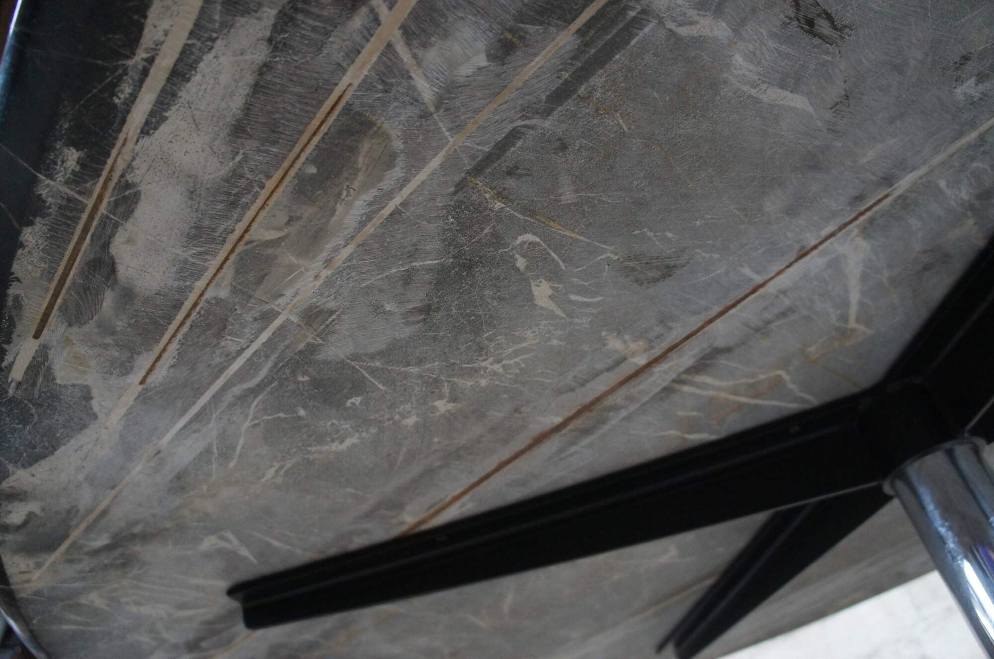 Fair; the base has pitting to the chrome plated base. Mostly along the top. The oval marble top was broken at some point in the past and professionally repaired with iron rods. wear and distressing to the surface. Spotting as well as some rings.