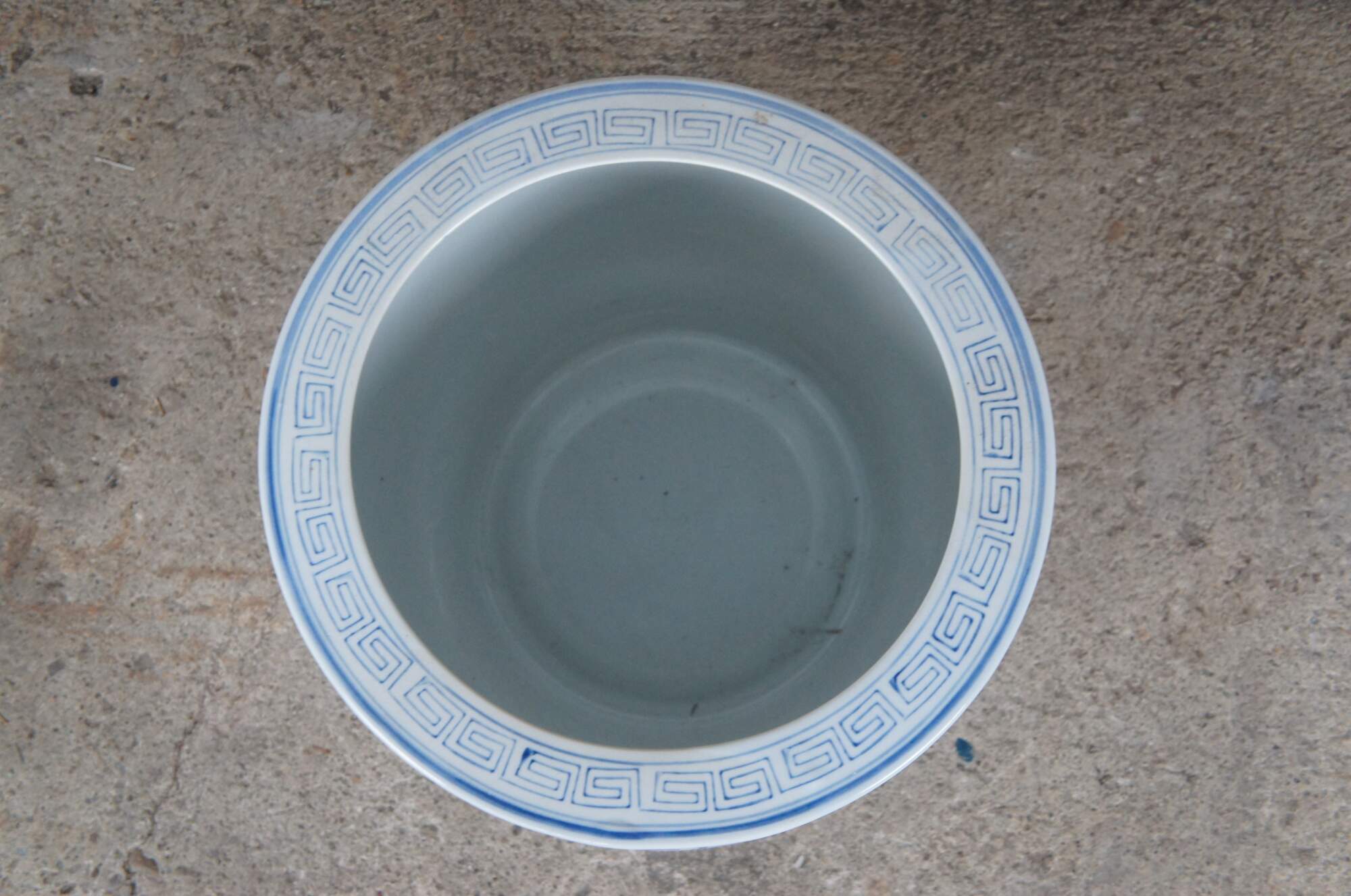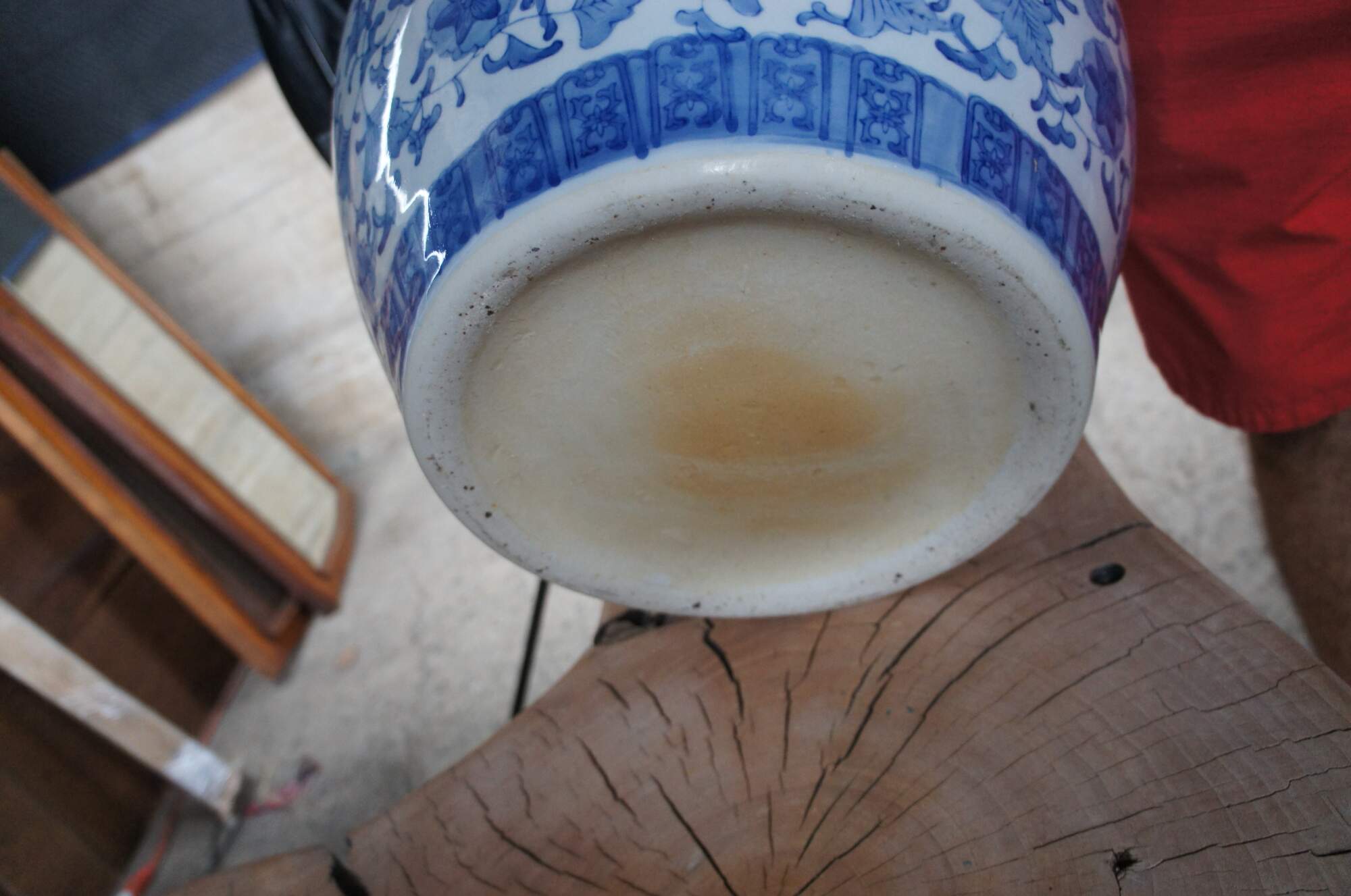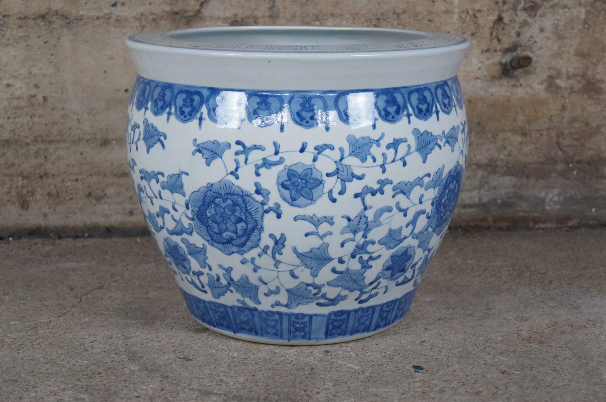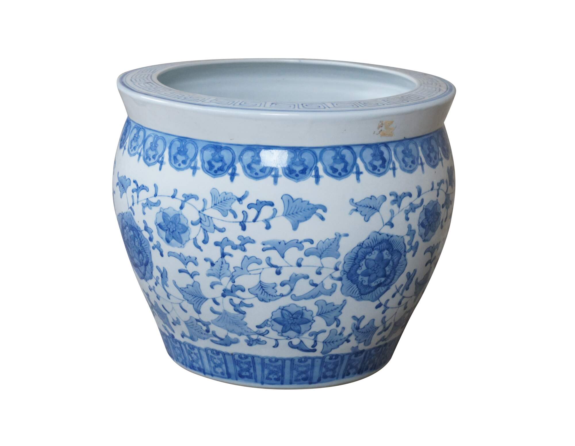 Vintage Fish Bowl Ceramic Planter featuring Hand Painted Chinoiserie Style Floral Motifs and Trim in Blue on a White Background