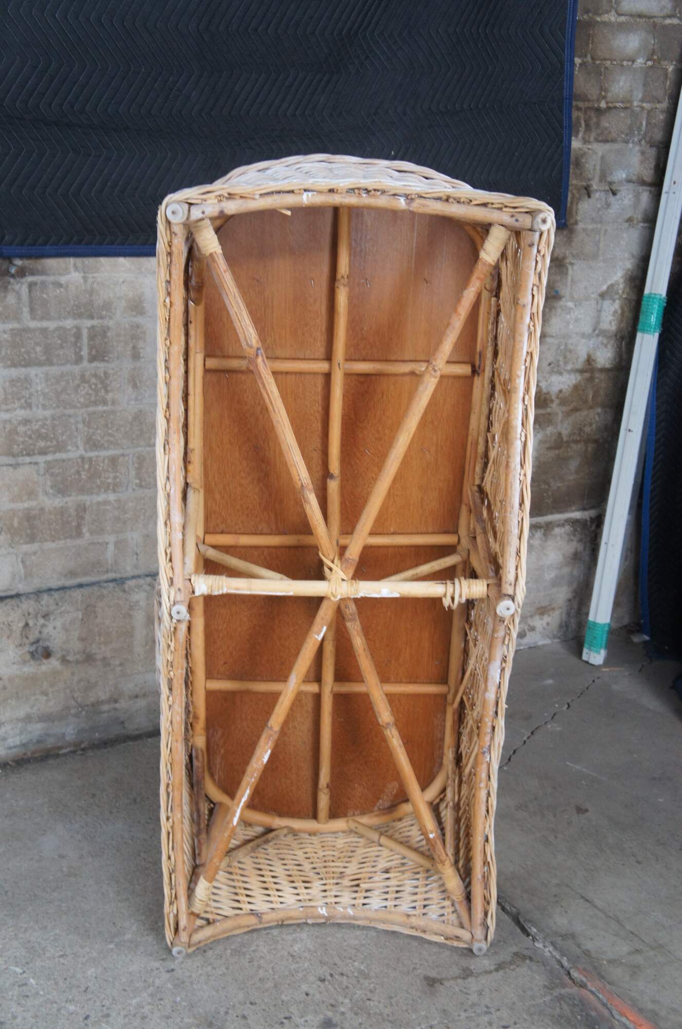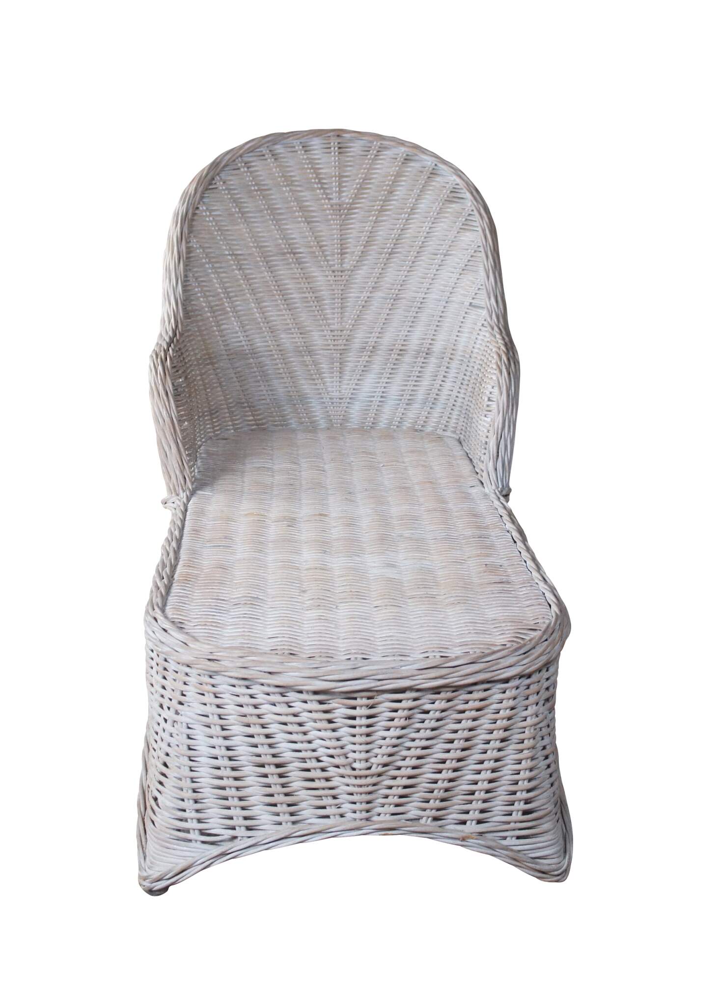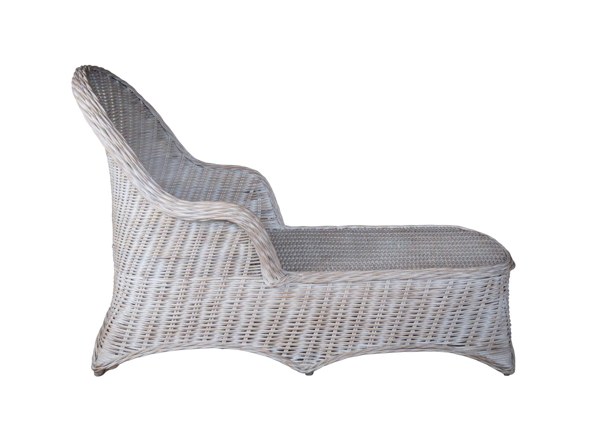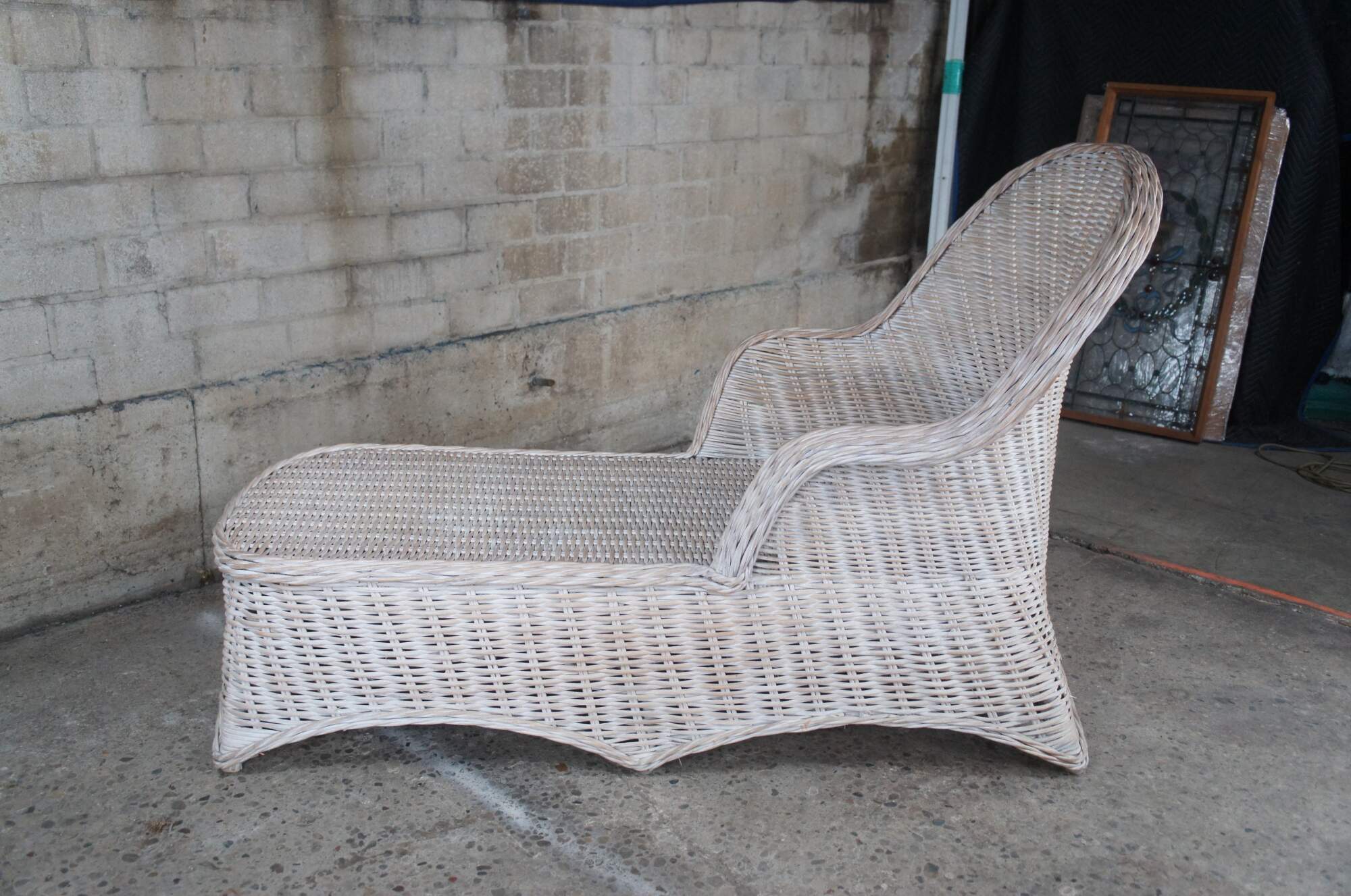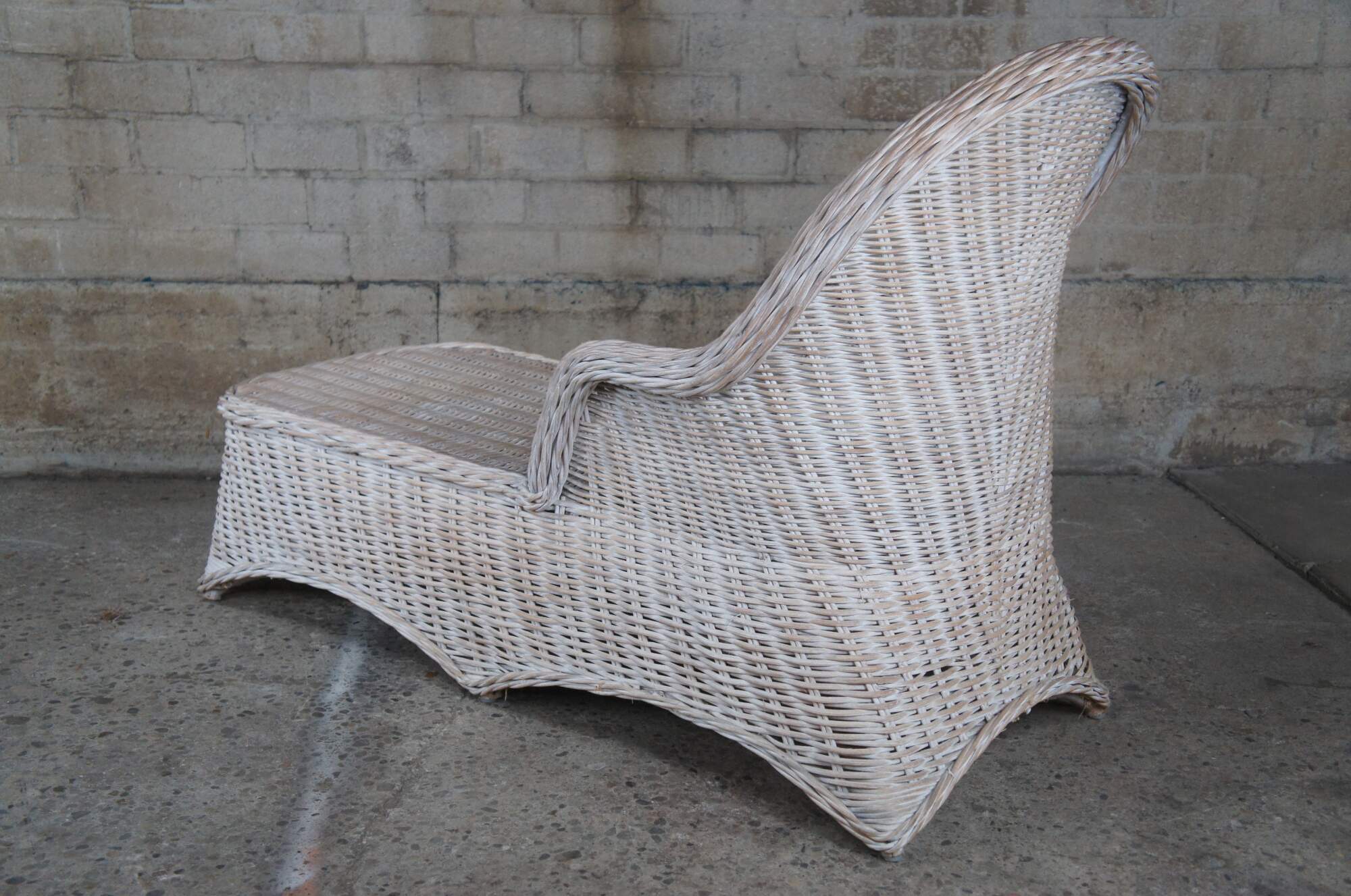 Braided wicker chaise lounge in an off-white with a distressed finish.