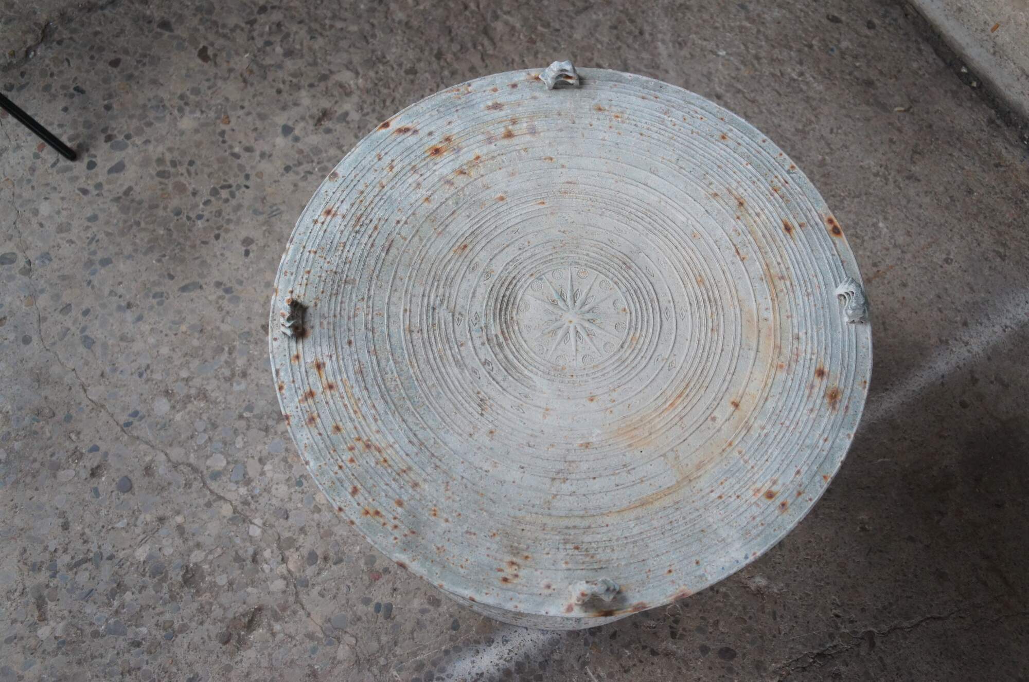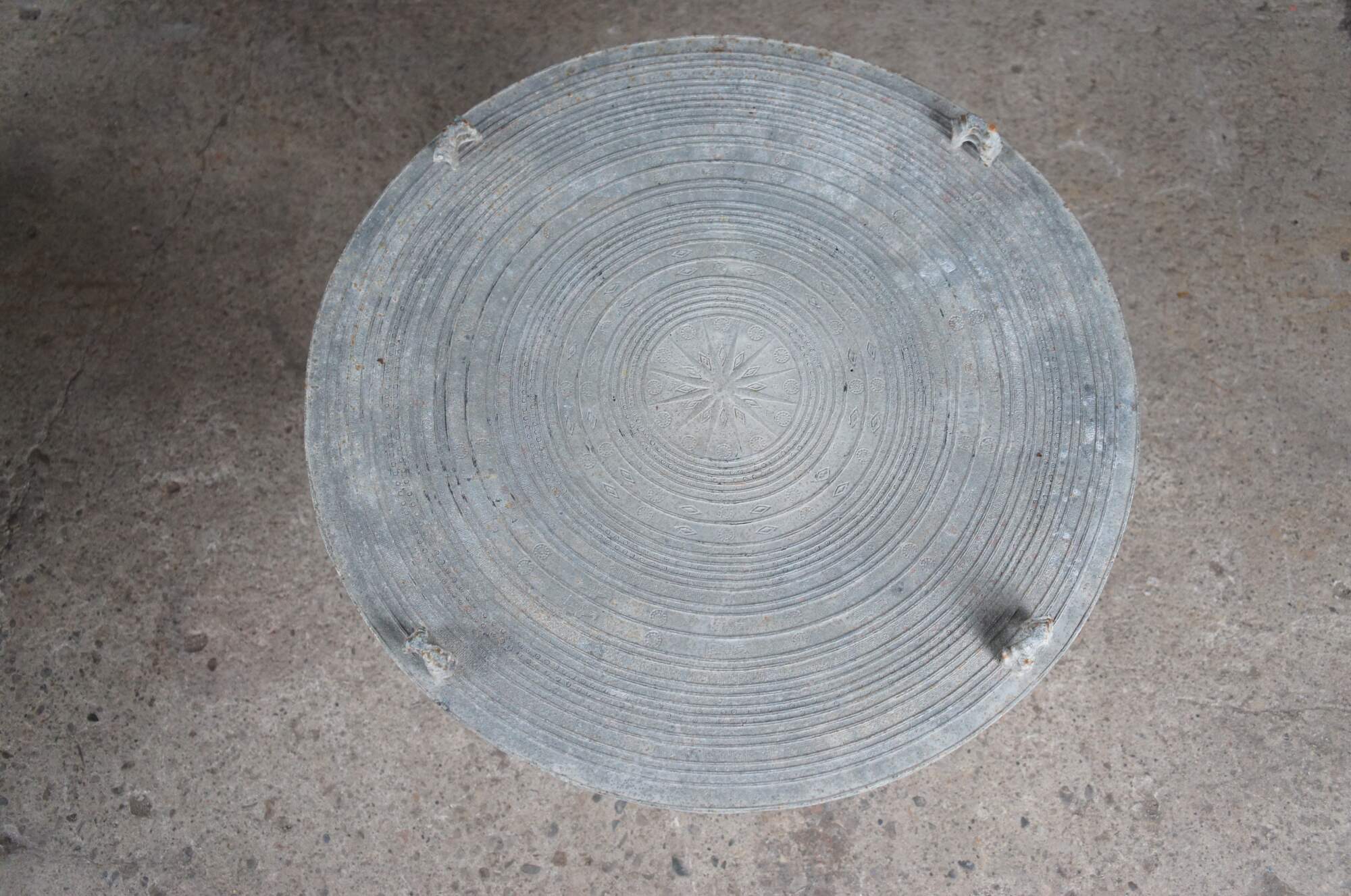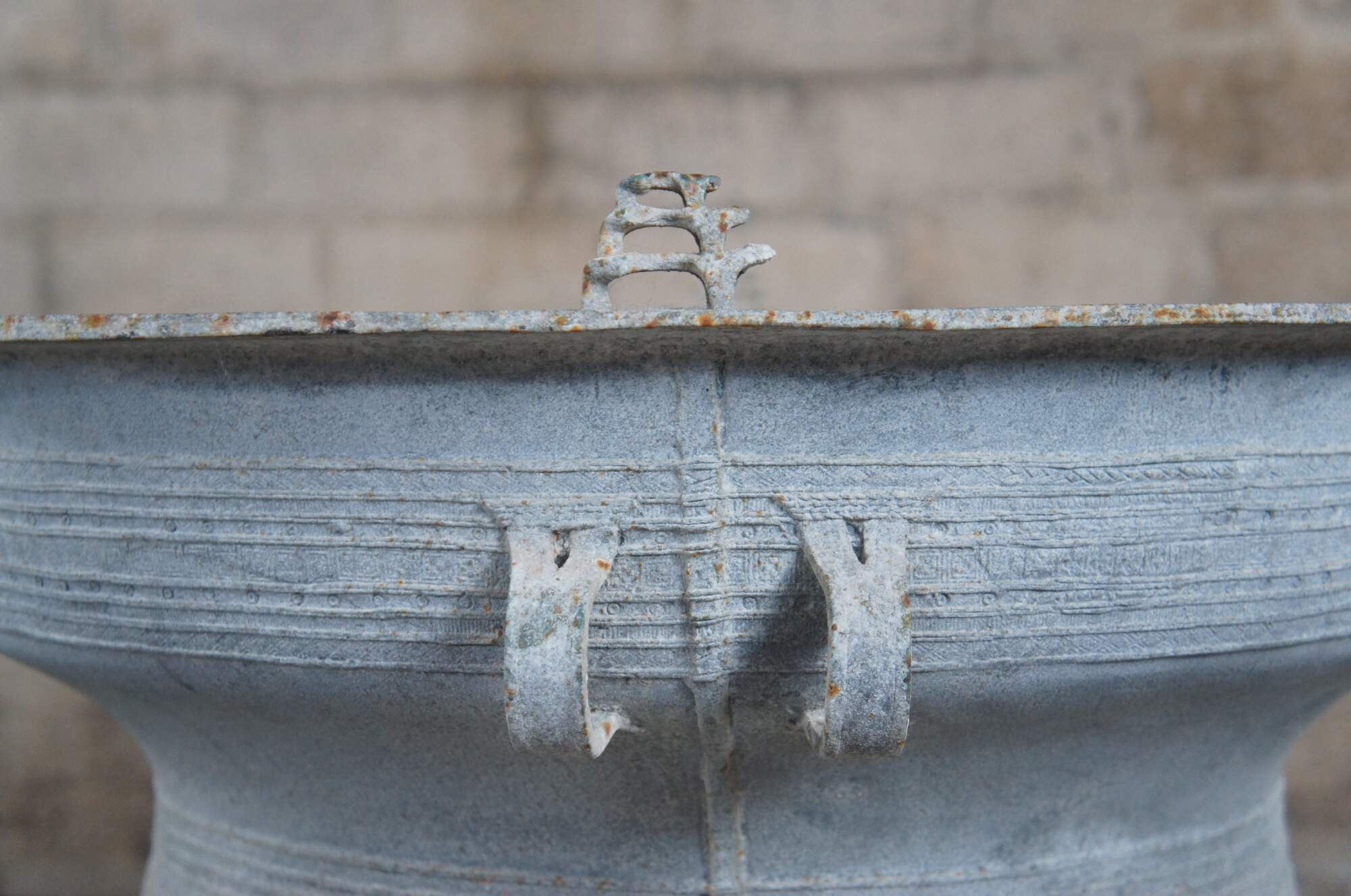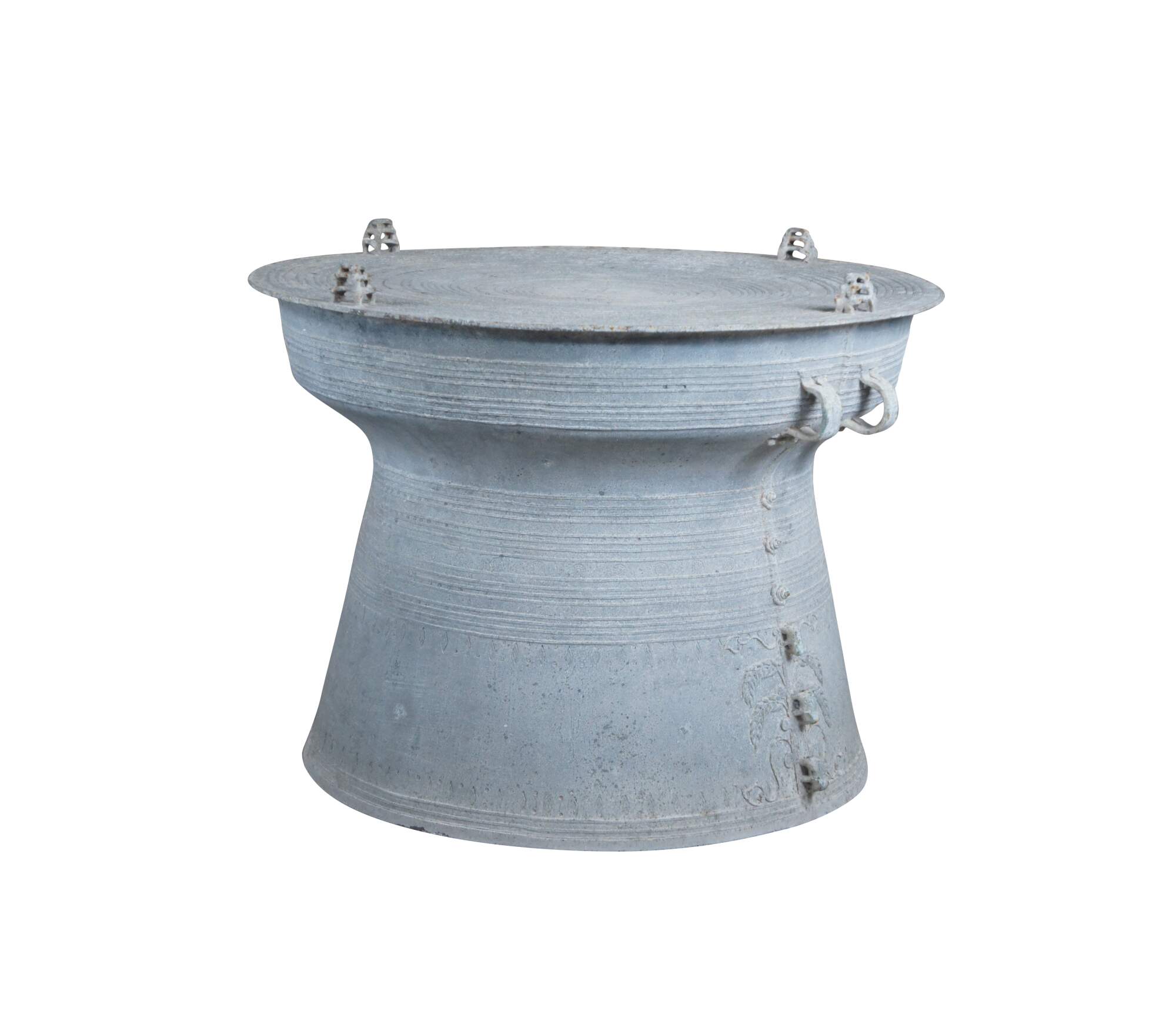 Rain Drums originated with the Dong Son culture in Southeast Asia, dating as far back as the mid-to-late Bronze Age (1,000–700 BC). Metal workers poured and set molten bronze in a cast, freed the hardened drums from their molds, then carved them with intricate motifs as the metal cooled. The art of sculpting bronze drums remains a refined skill, acquired over many years and passed on through apprenticeships.