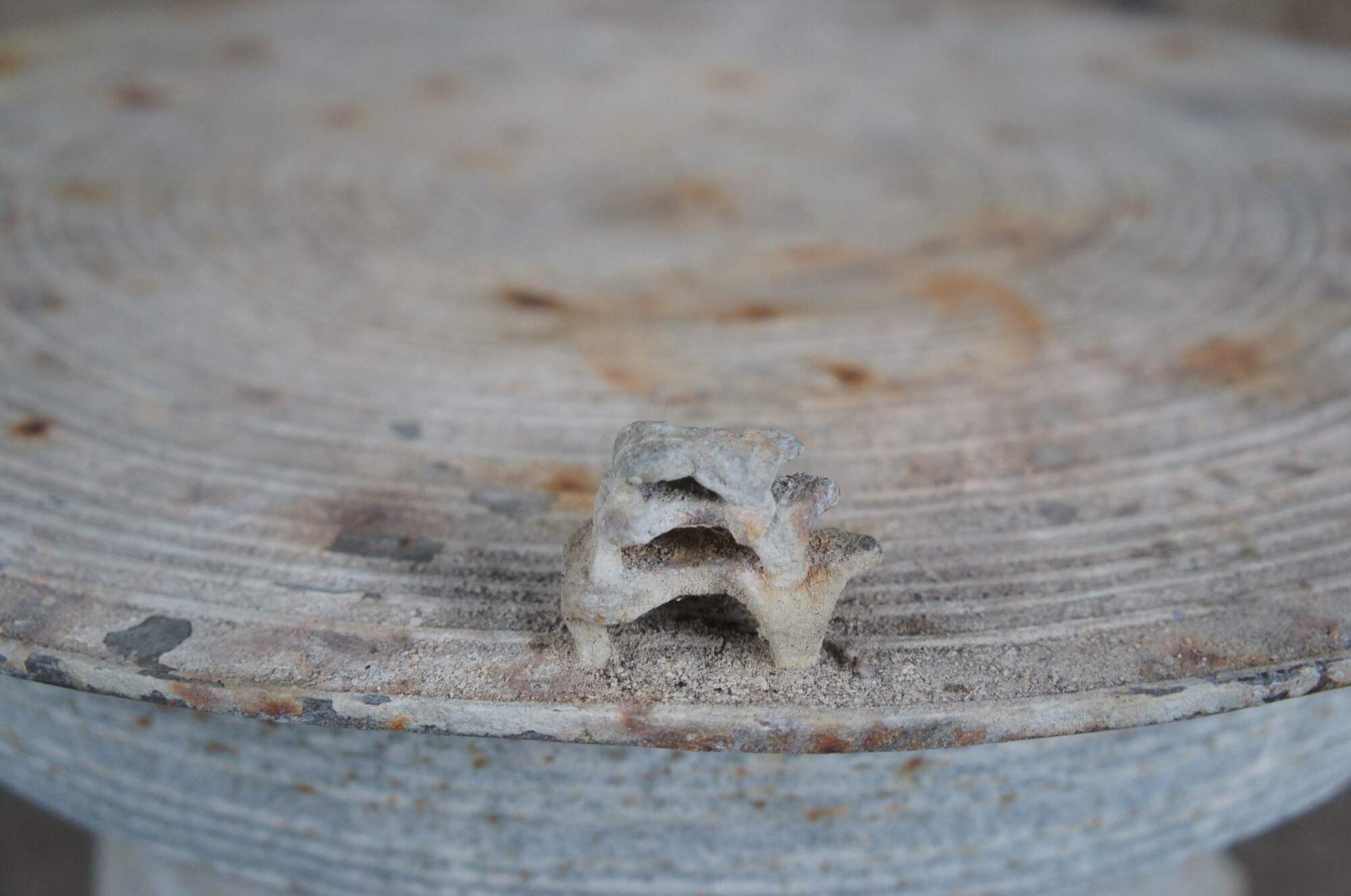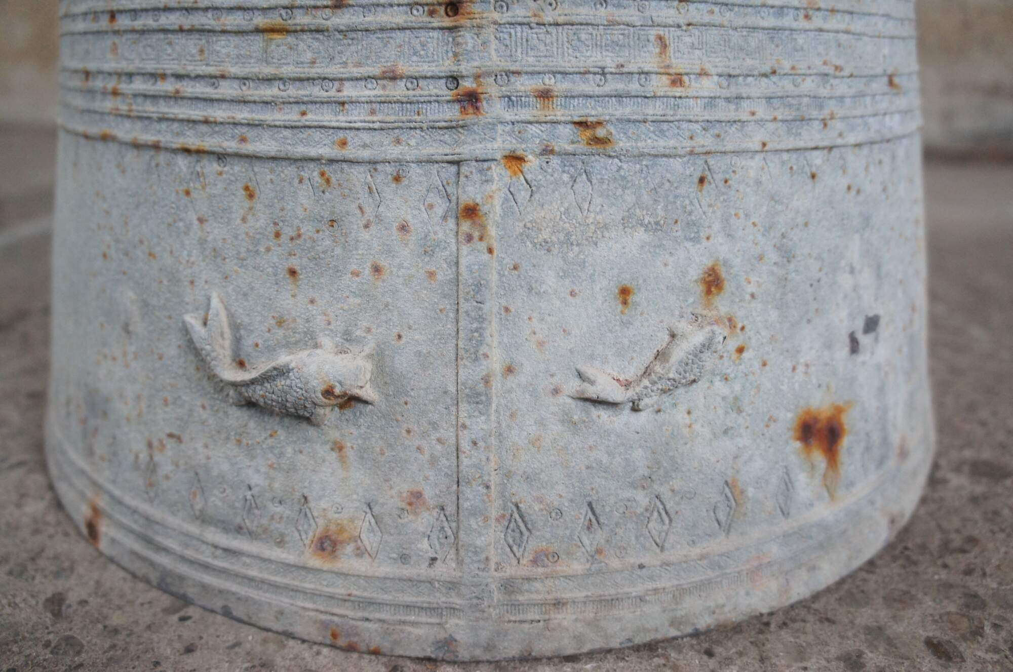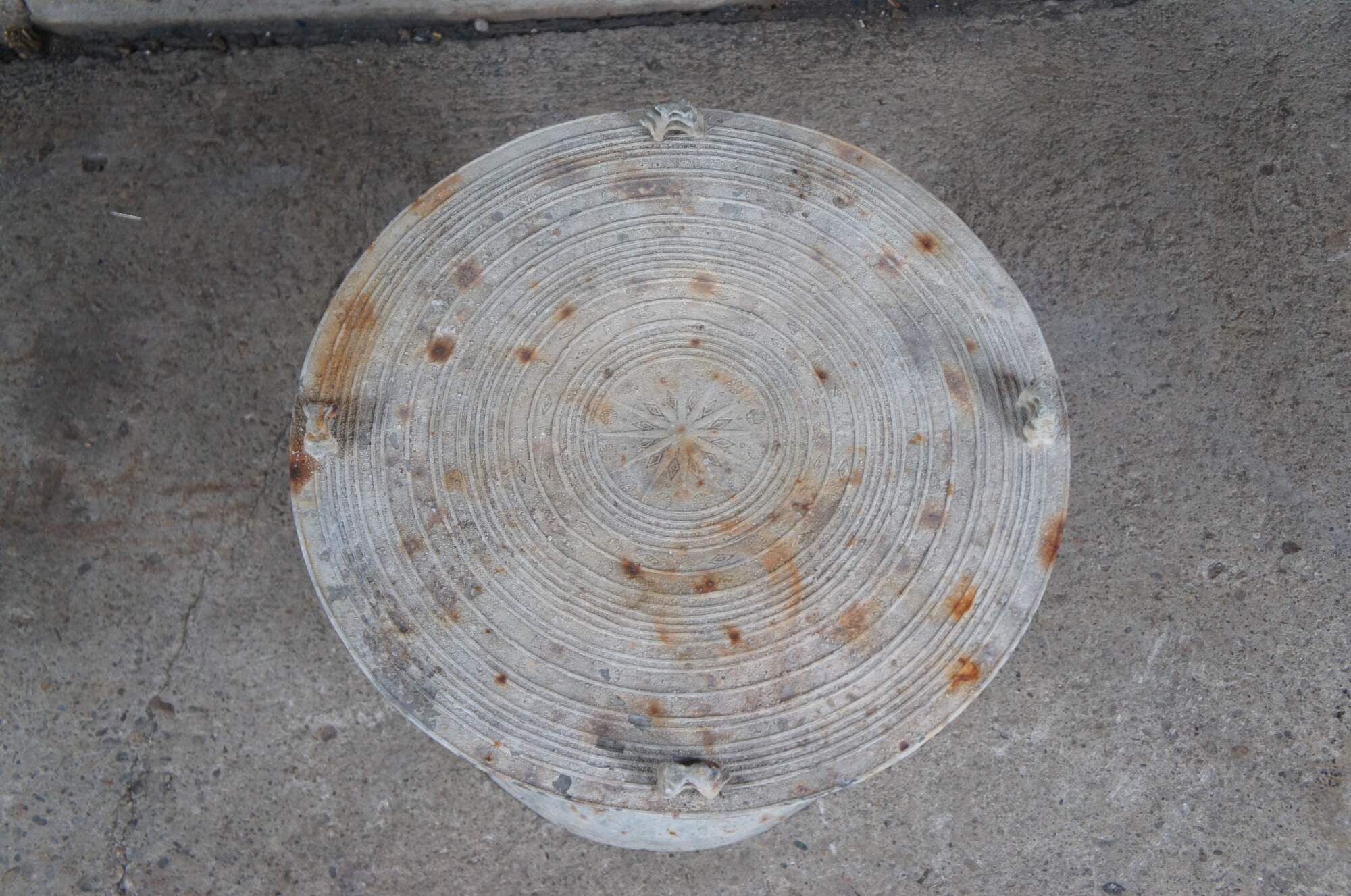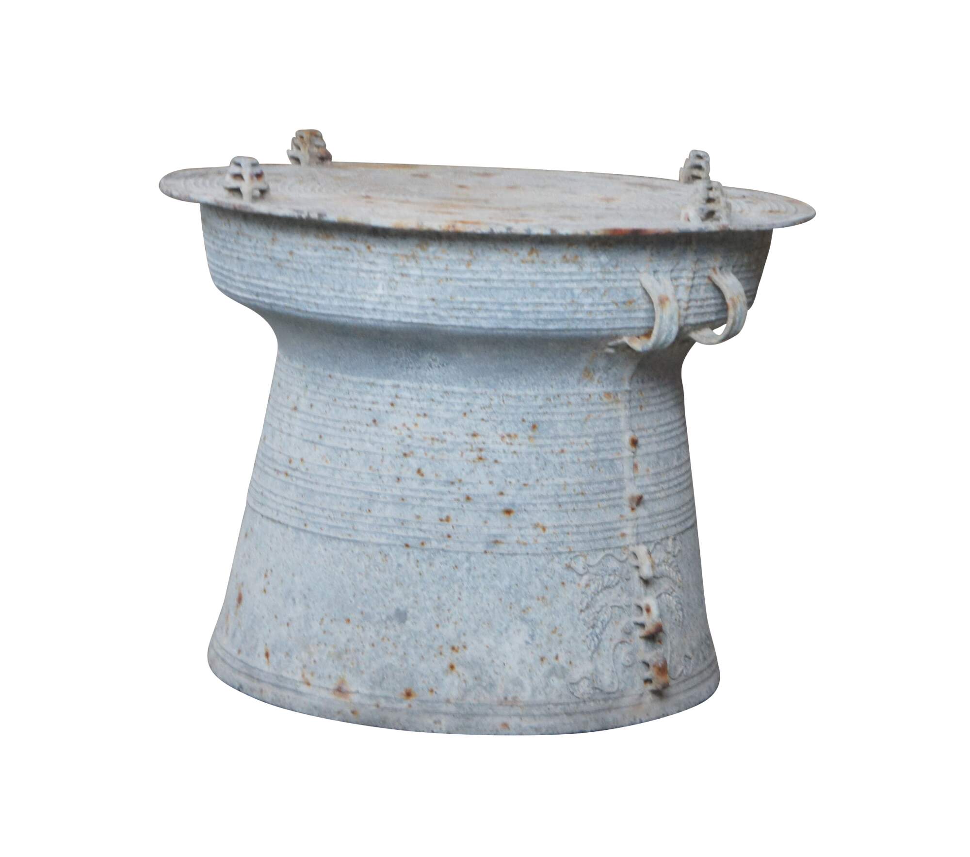Mid 20th century Bronze rain drum side tables. Having intricate geometric decoration throughout the top and body. Along the top are four beautifully realized frogs. The body showcased sculptural elephants, Koi fish and handles. Round glass top can be added for modernization.