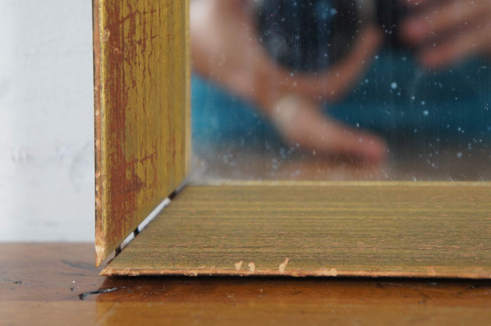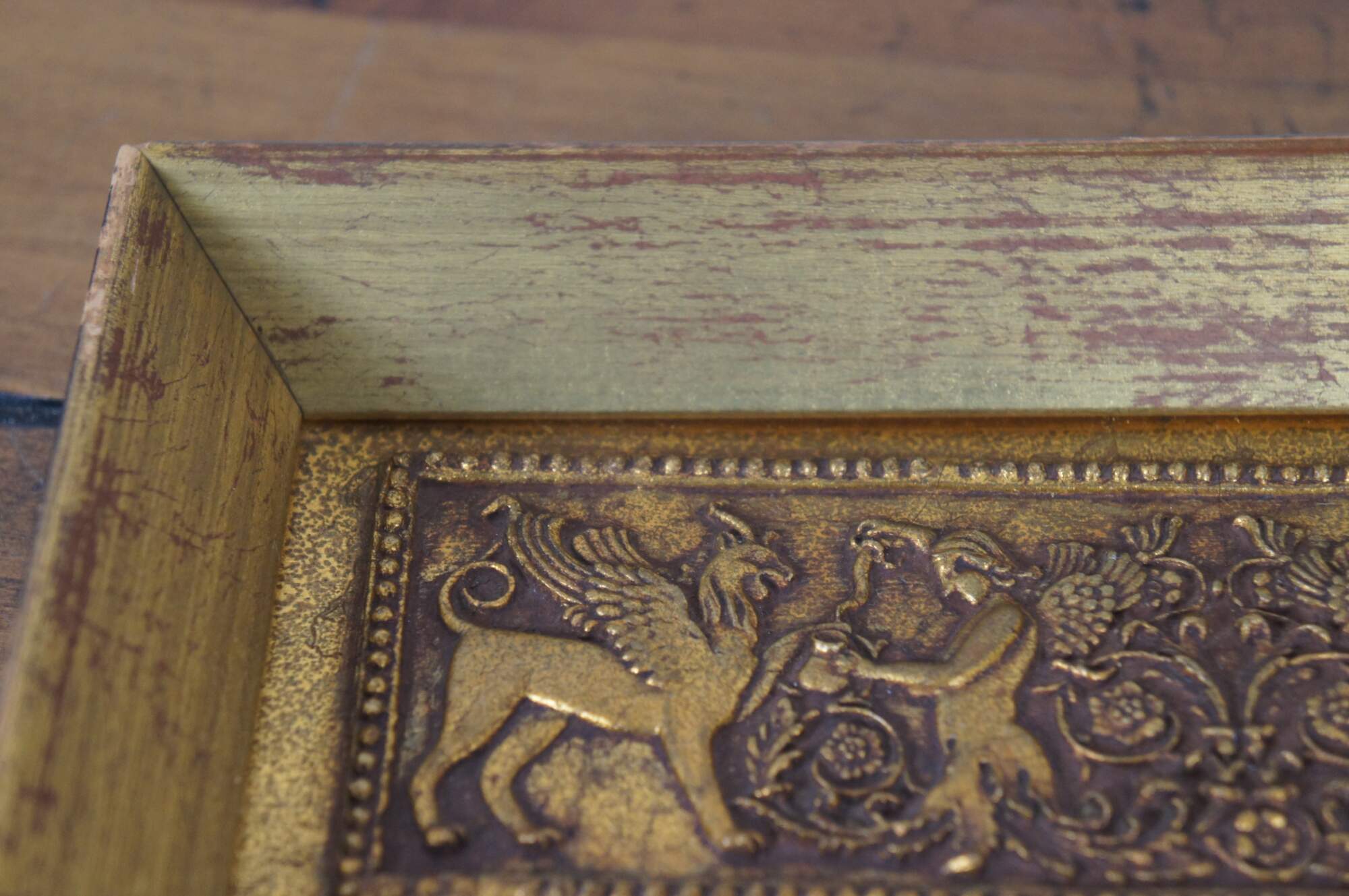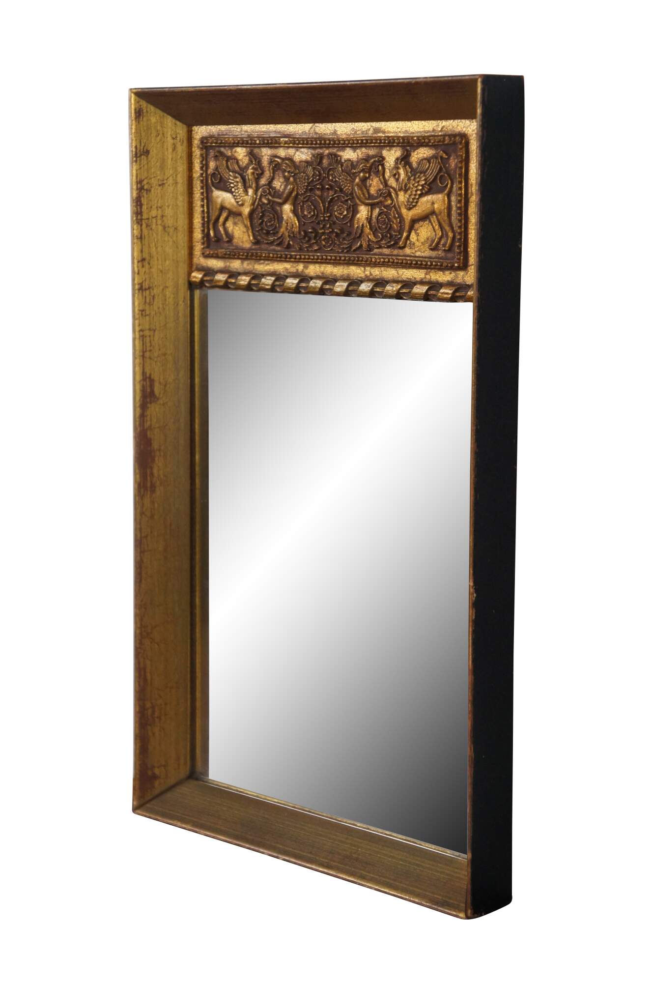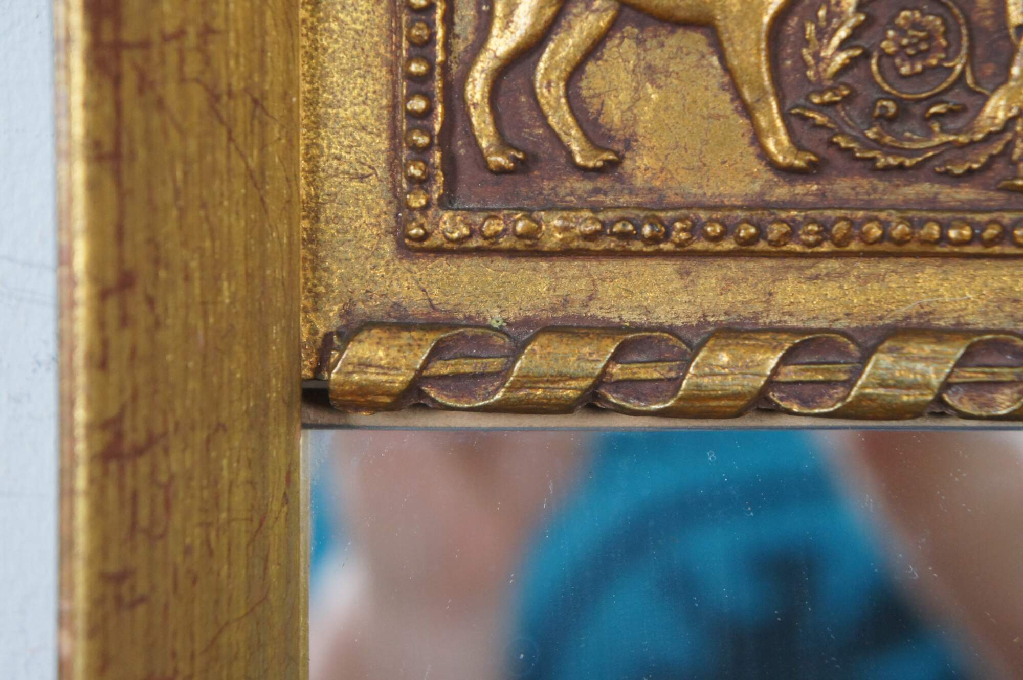 Vintage gilt wood trumeau style wall mirror featuring a rectangular beveled frame topped with a spiraling ribbon dividing the mirror from a neoclassical relief showing the a winged angel figure pouring wine or water into a jug for a chimera-like creature with a lion’s body, wings, and a head with an antelope type horn.