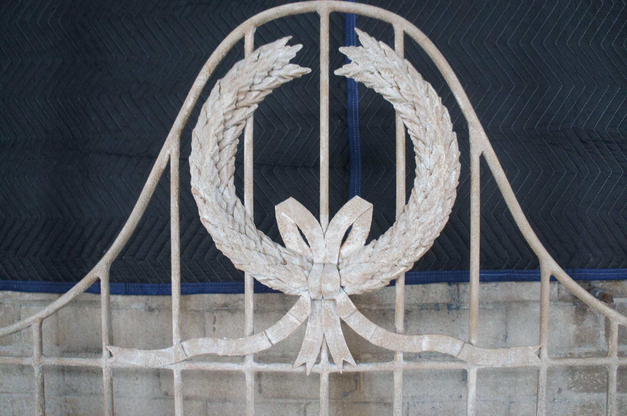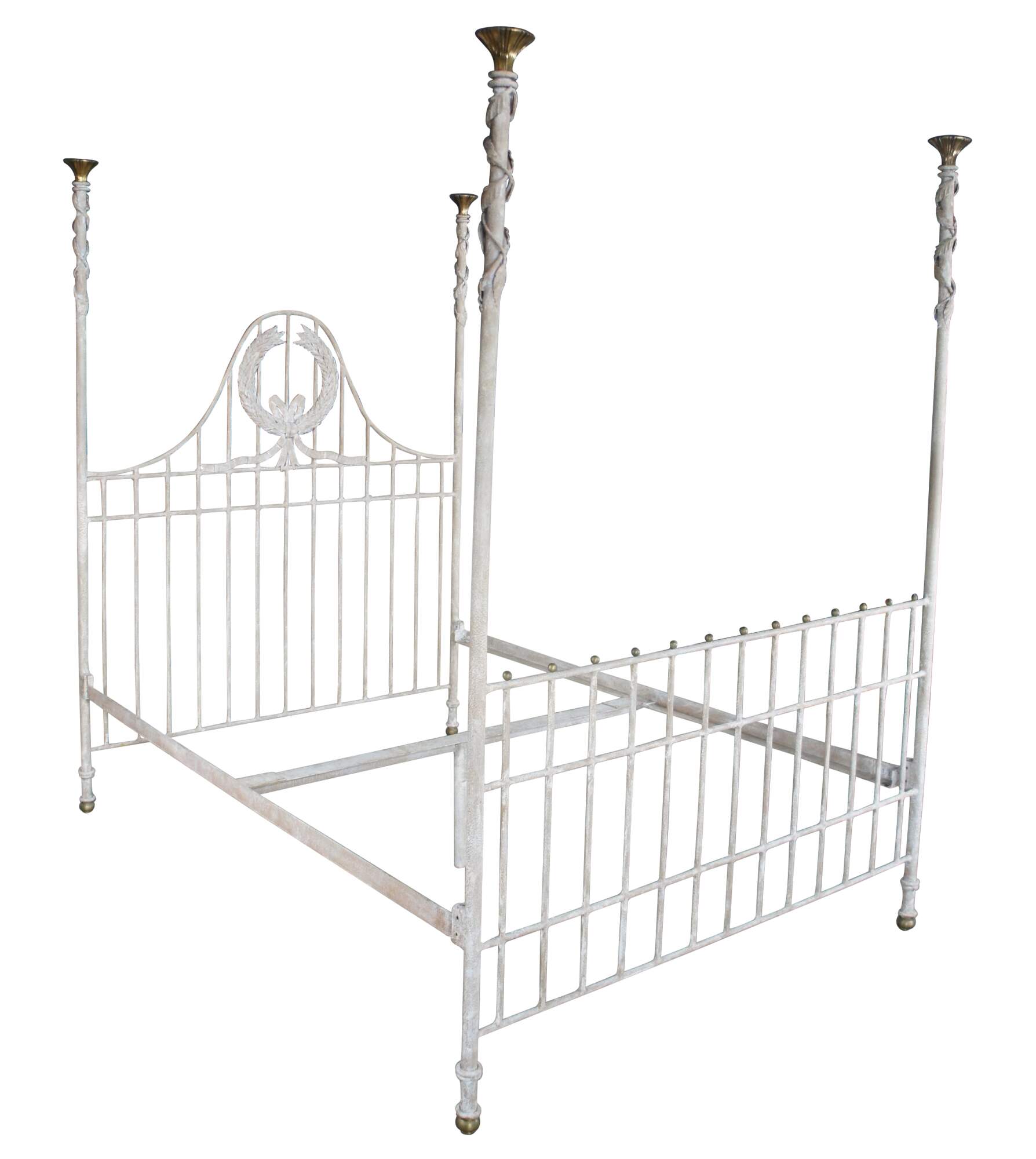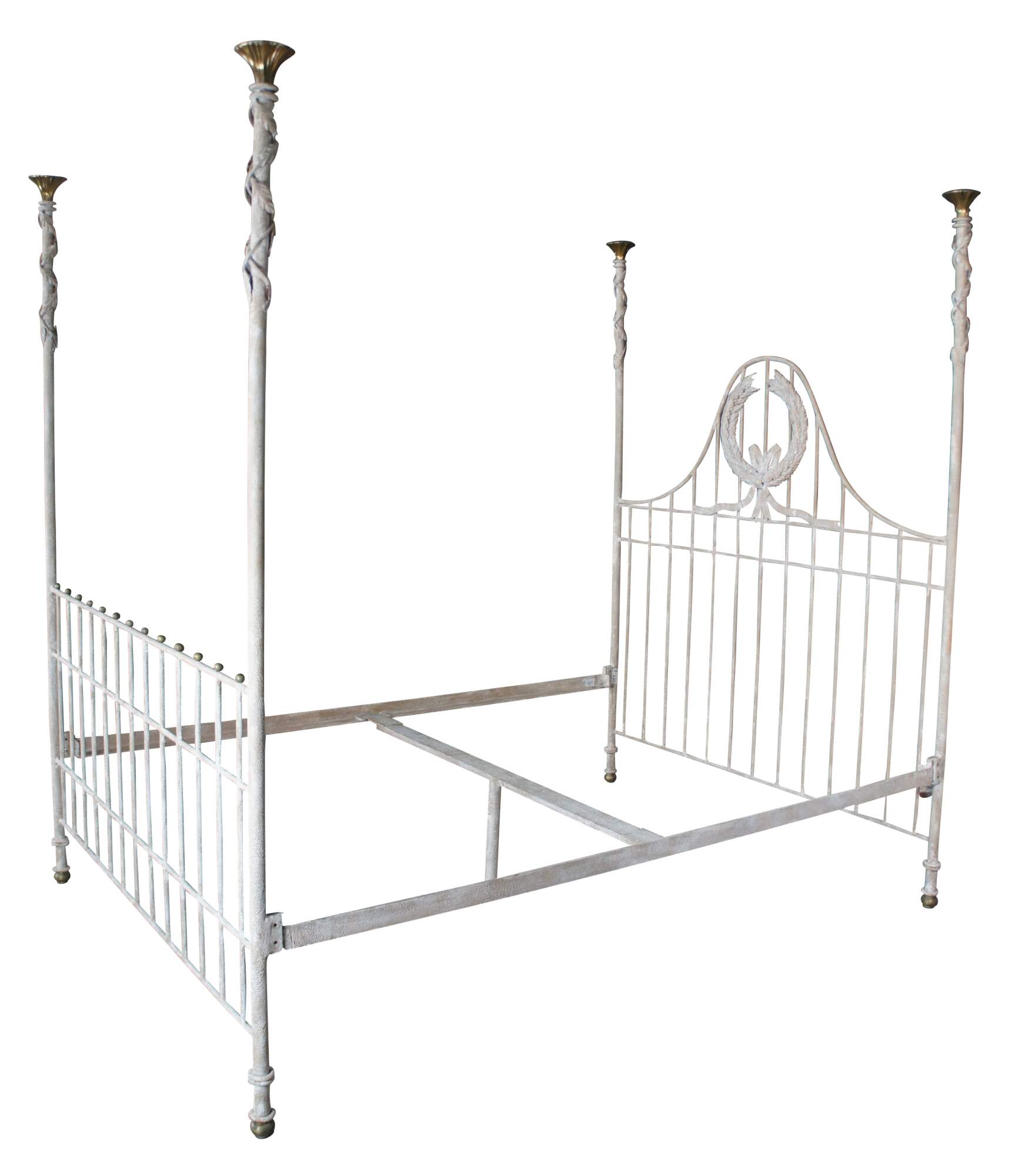 Late 20th century 4 poster bed by Lineage Home Furnishings for Maitland Smith. Made from wrought iron with a gridded form. The camelback headboard is centered by a large laurel wreath. Each long post is topped by brass torchiere over a leaf and vine wrapped motif. The bed rest on brass capped feet.