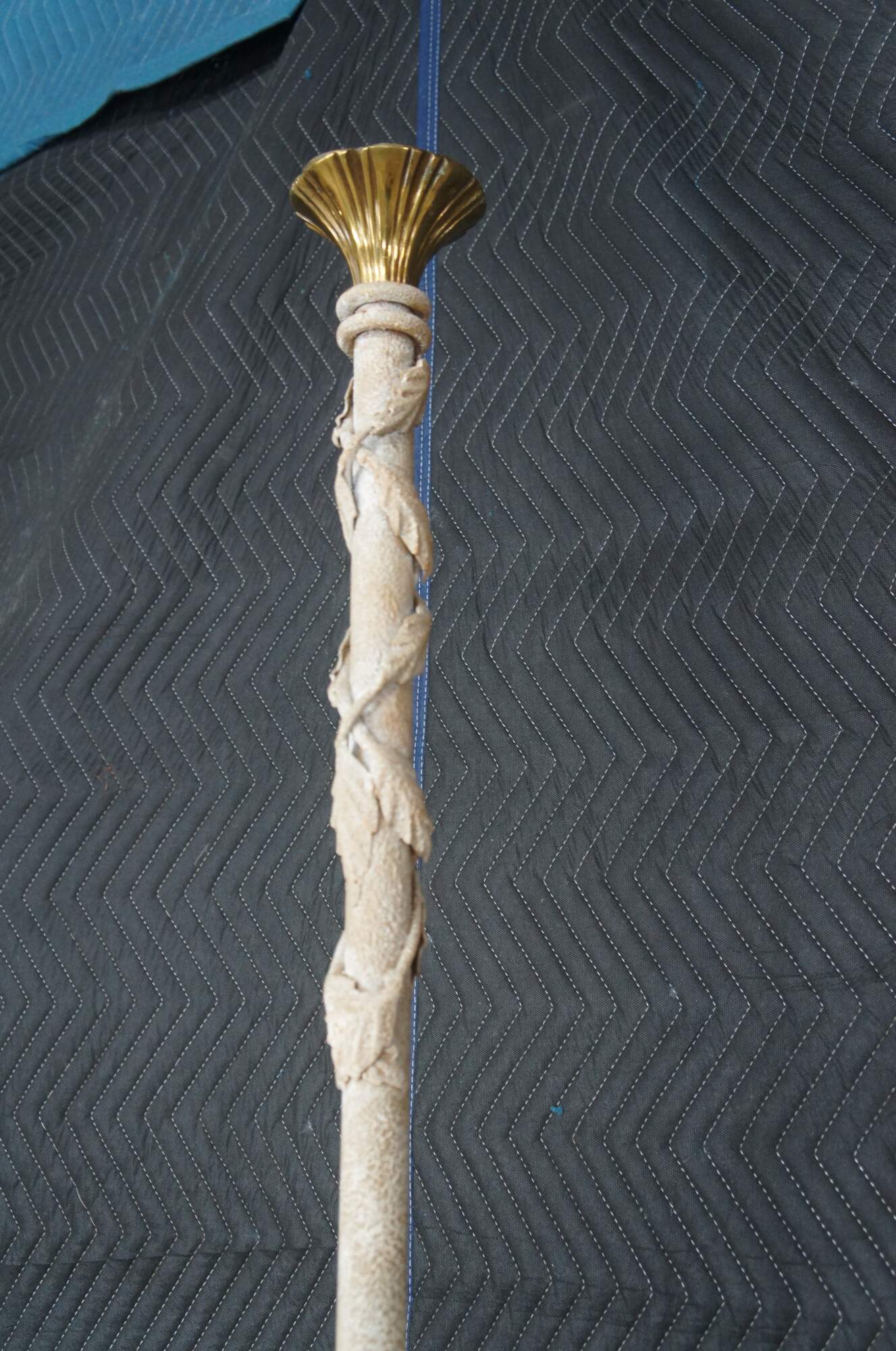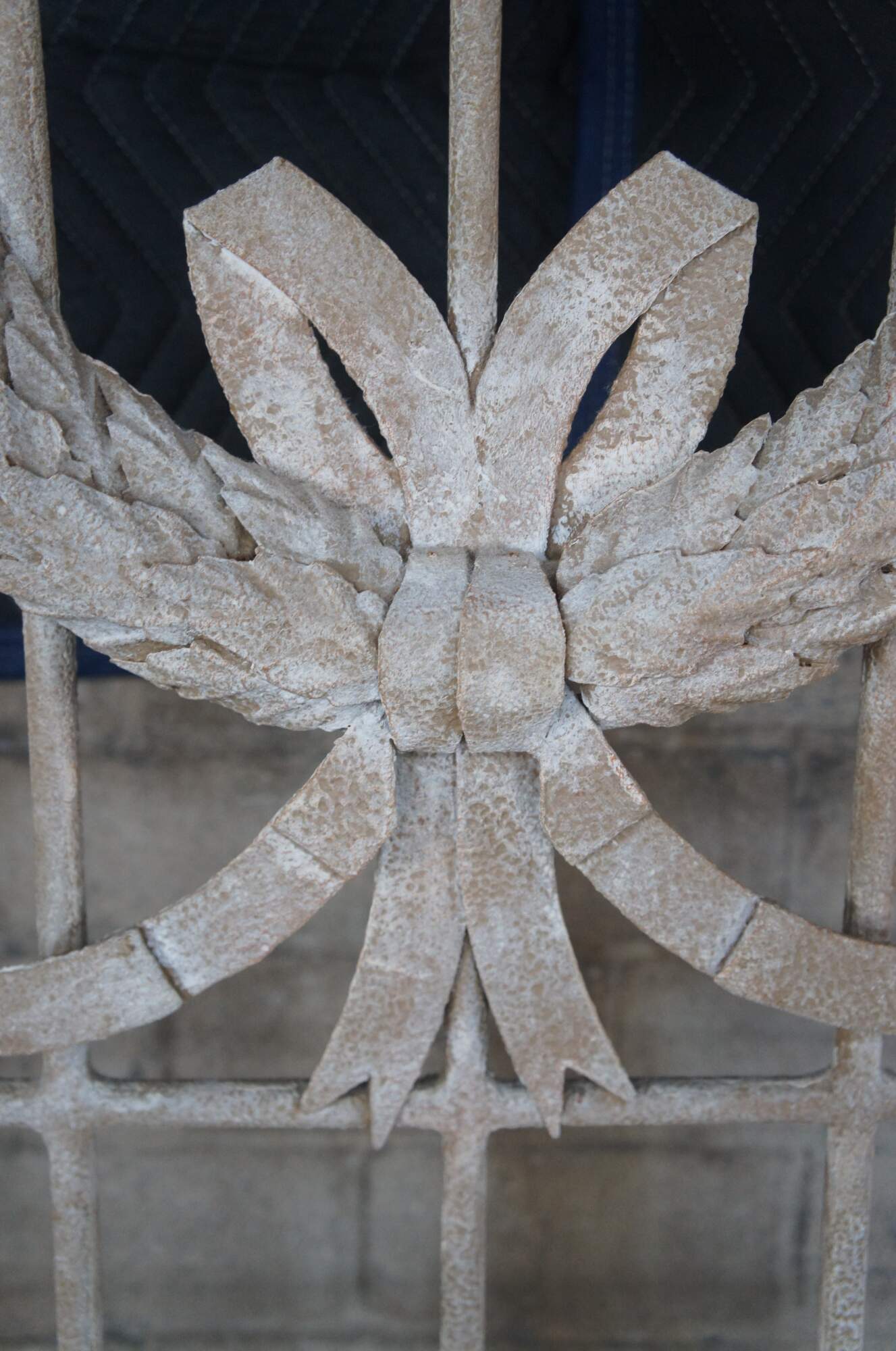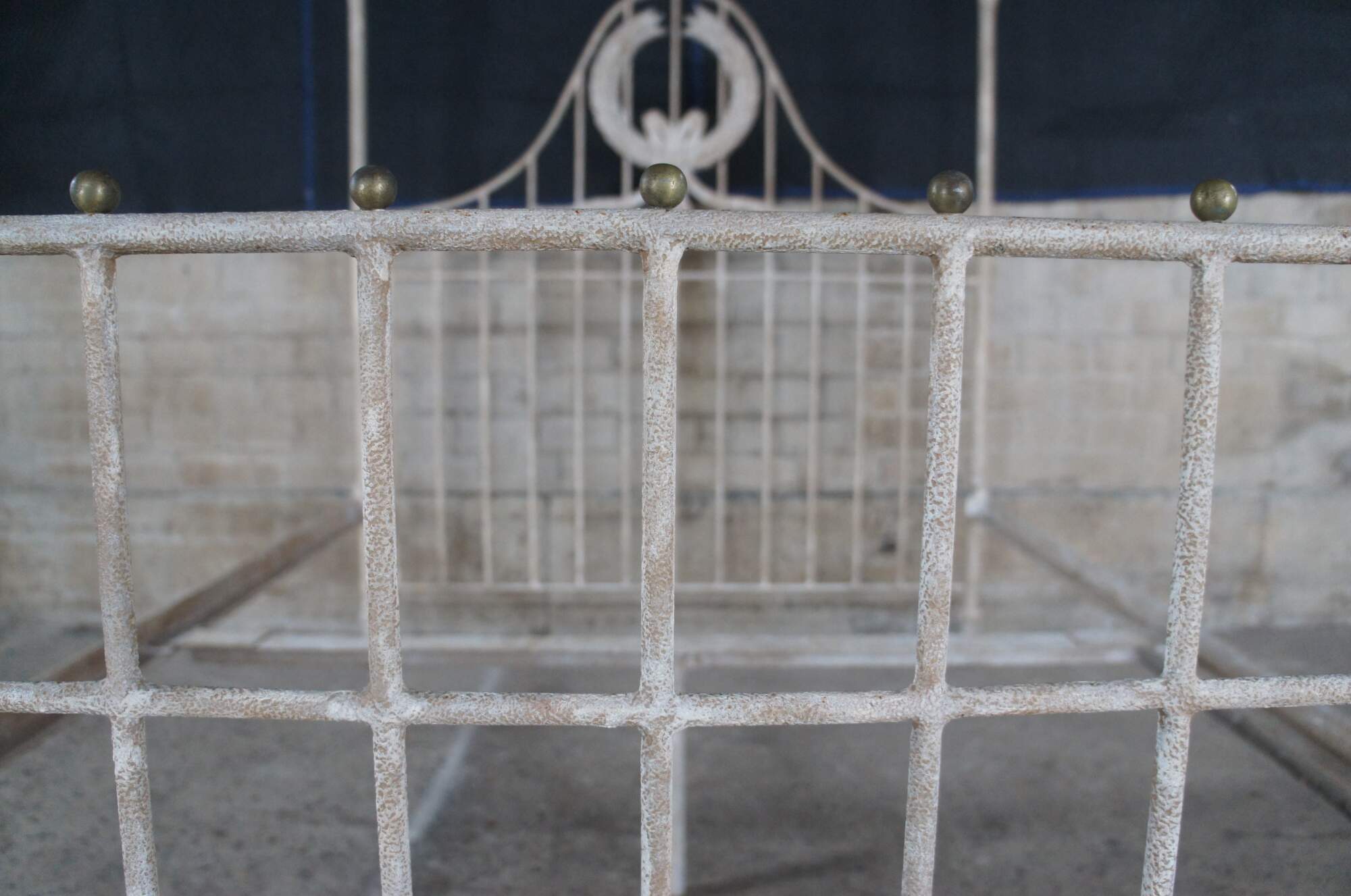 Late 20th century 4 poster bed by Lineage Home Furnishings for Maitland Smith. Made from wrought iron with a gridded form. The camelback headboard is centered by a large laurel wreath. Each long post is topped by brass torchiere over a leaf and vine wrapped motif. The bed rest on brass capped feet.
