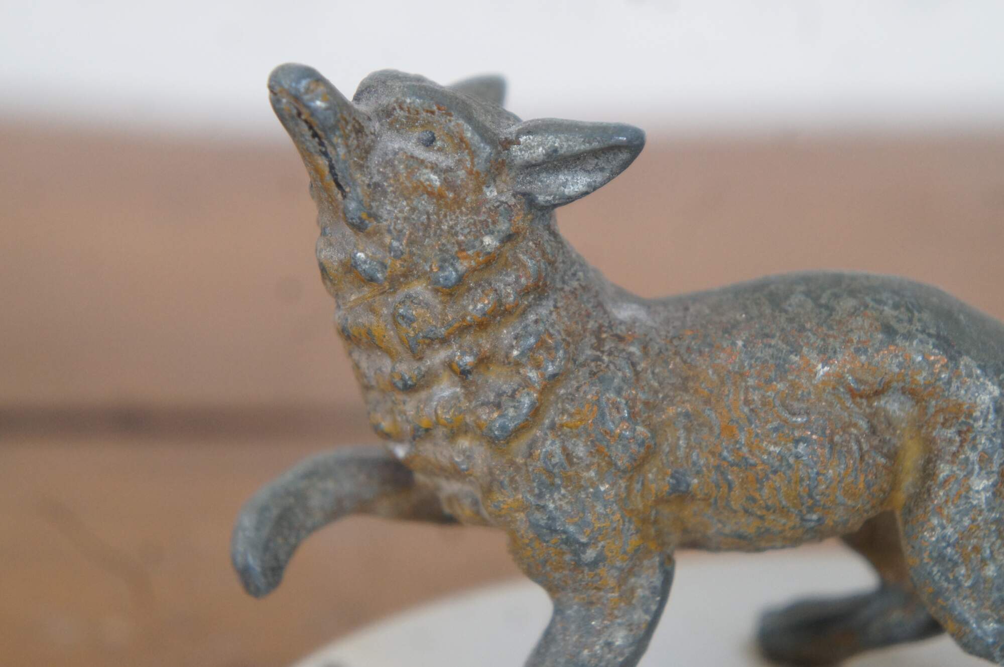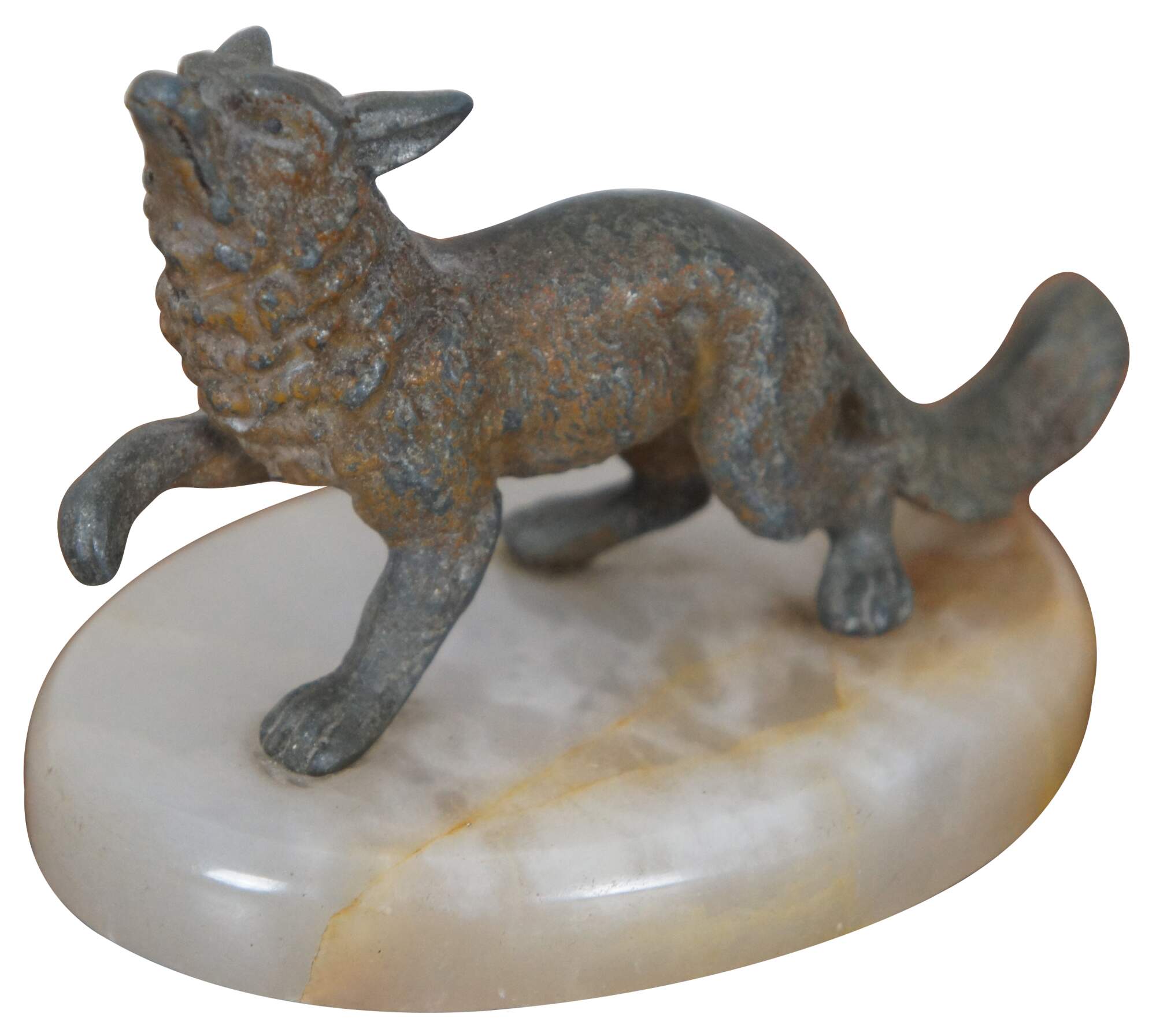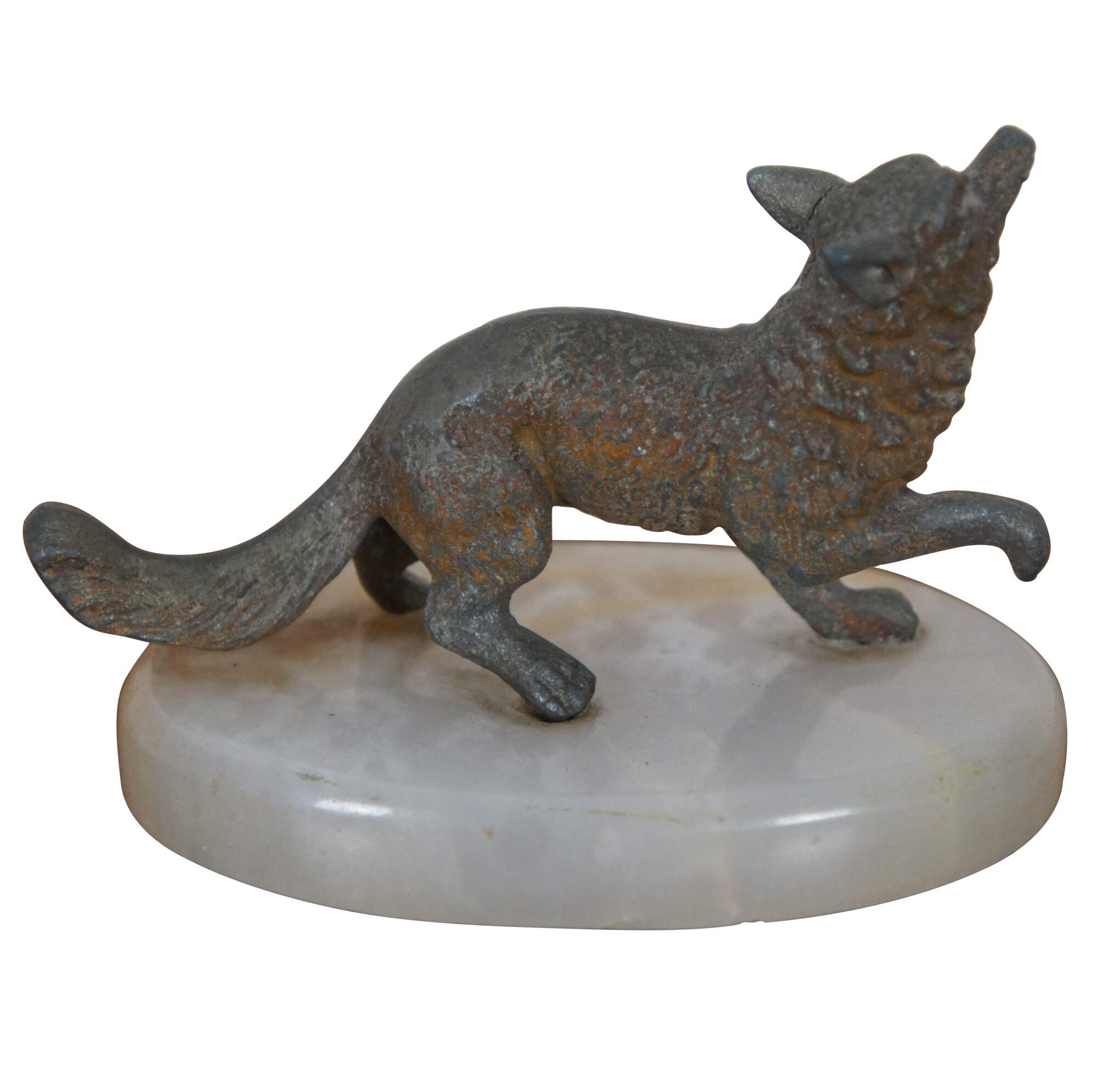 Vintage cast metal figurine / paperweight in the shape of a hunting fox with one paw raised, secured to an oval white marble base.