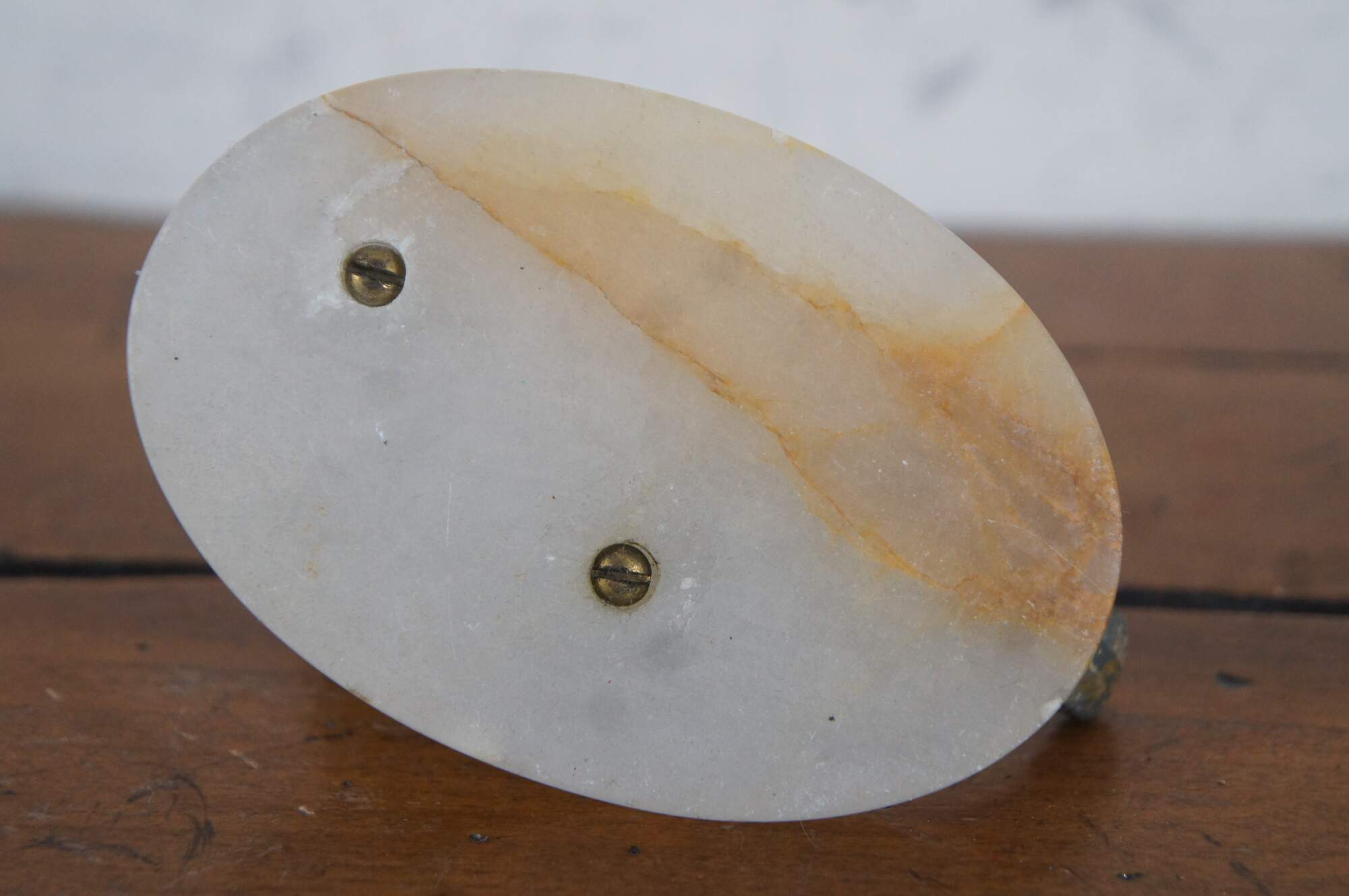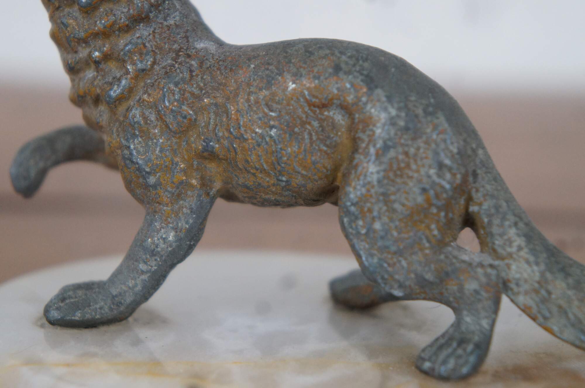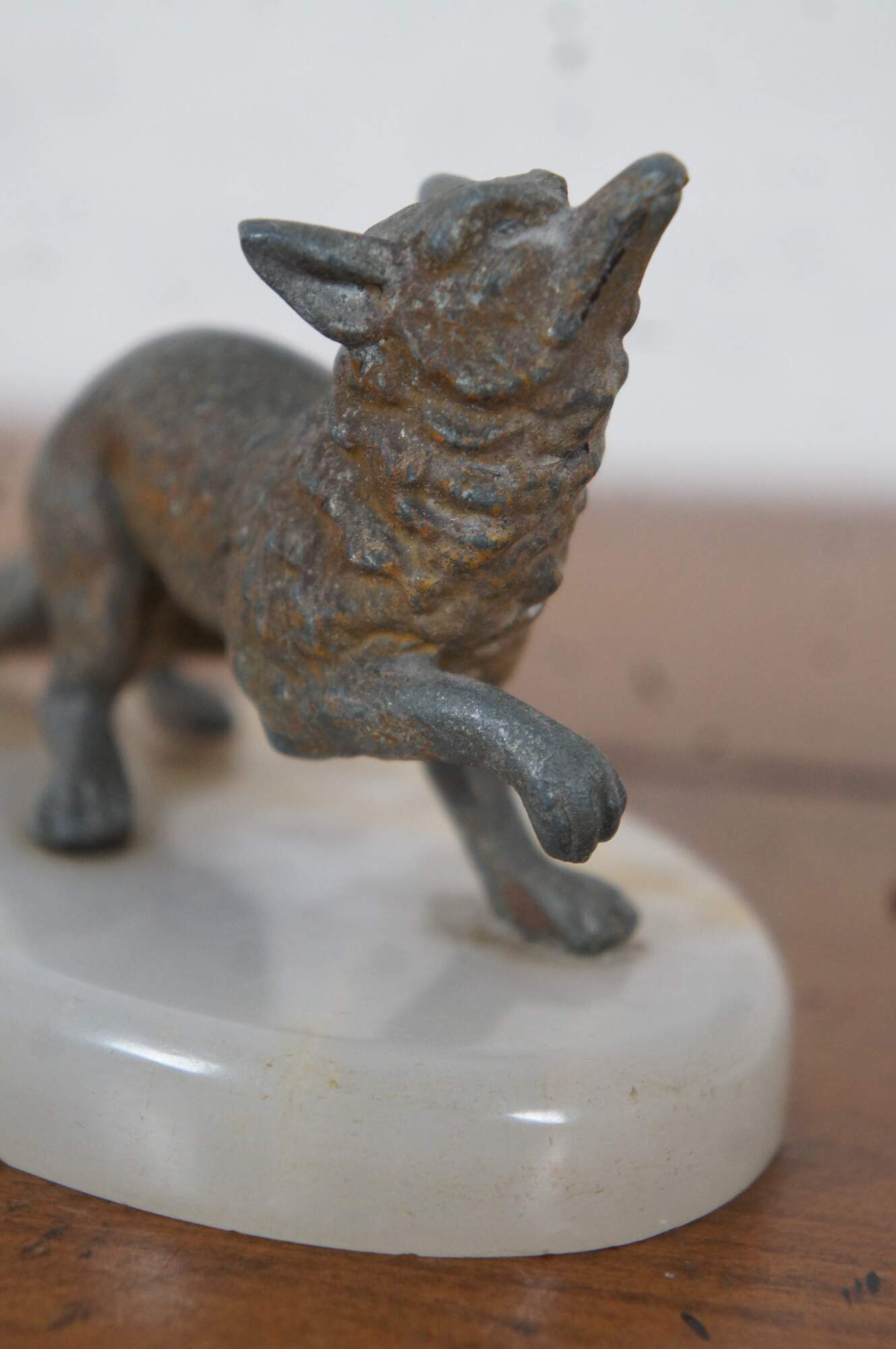 Vintage cast metal figurine / paperweight in the shape of a hunting fox with one paw raised, secured to an oval white marble base.