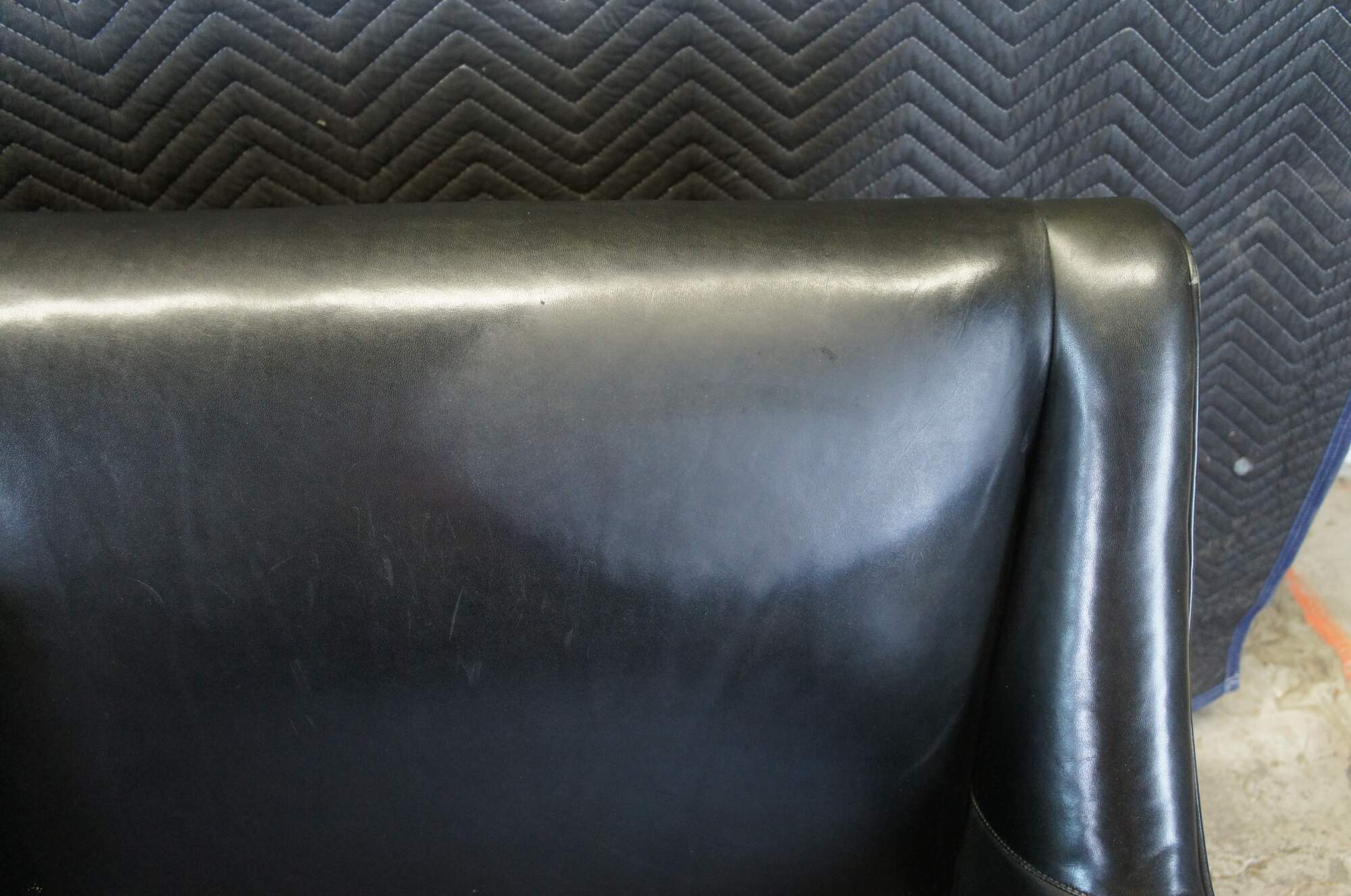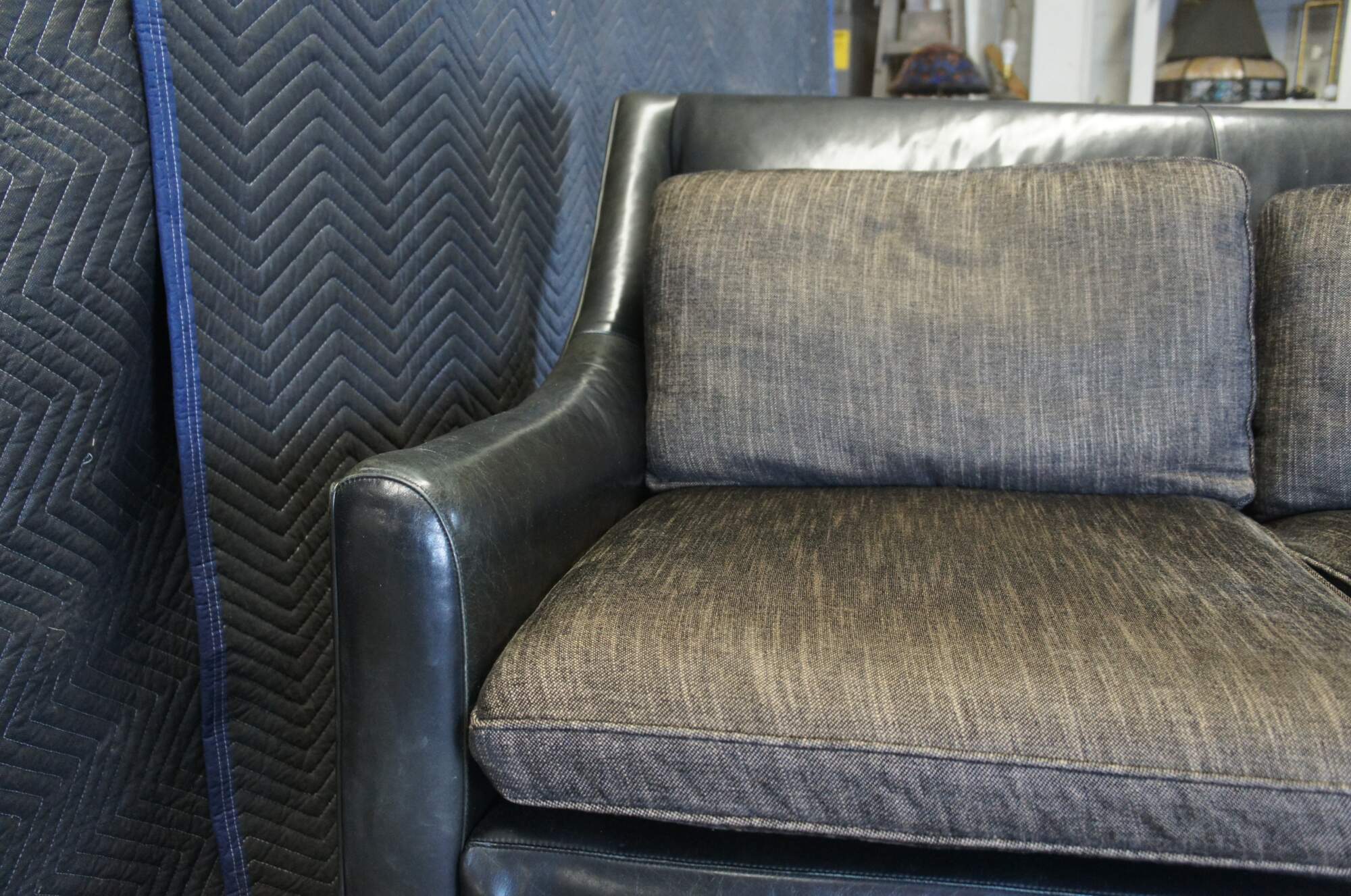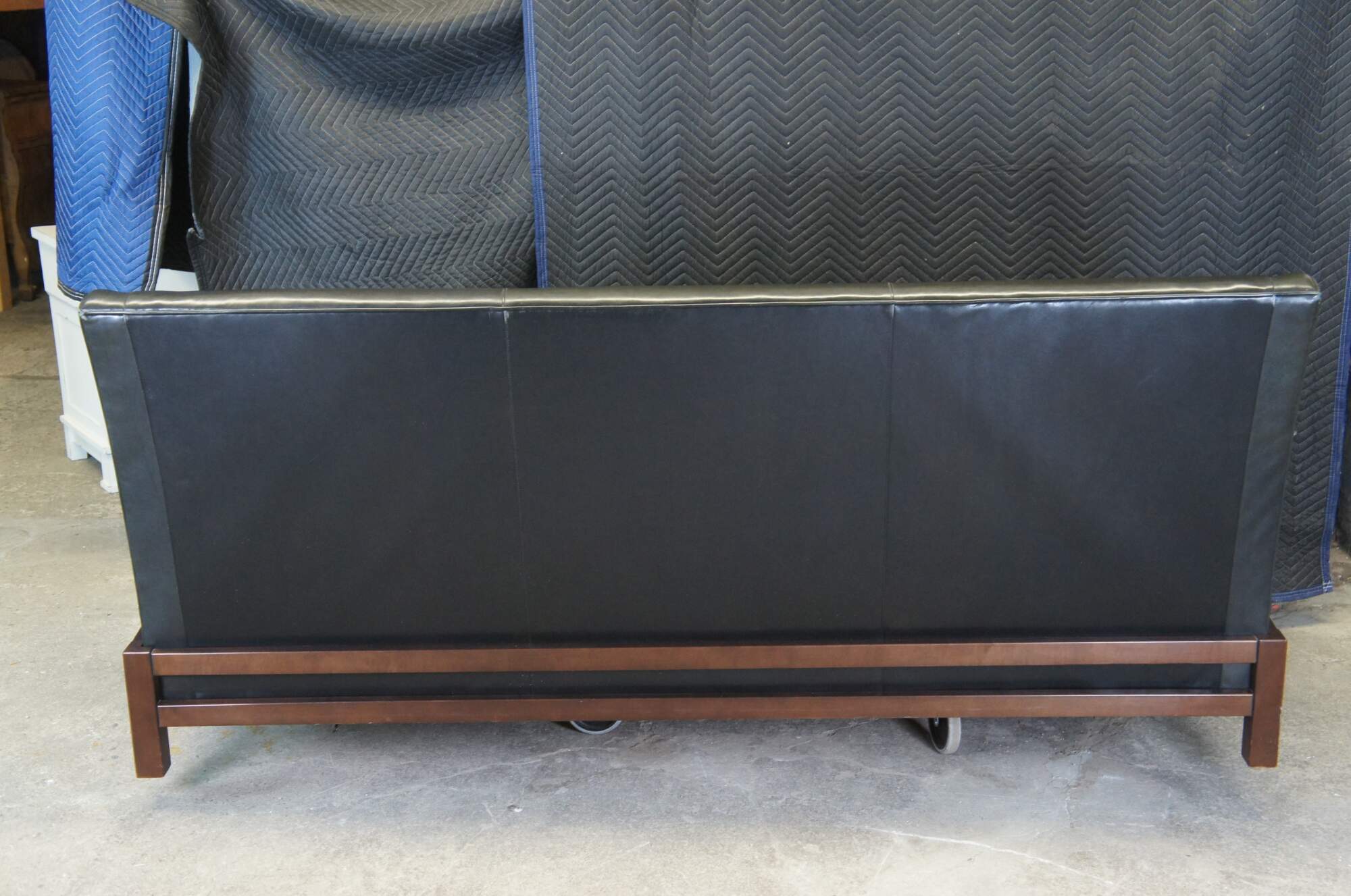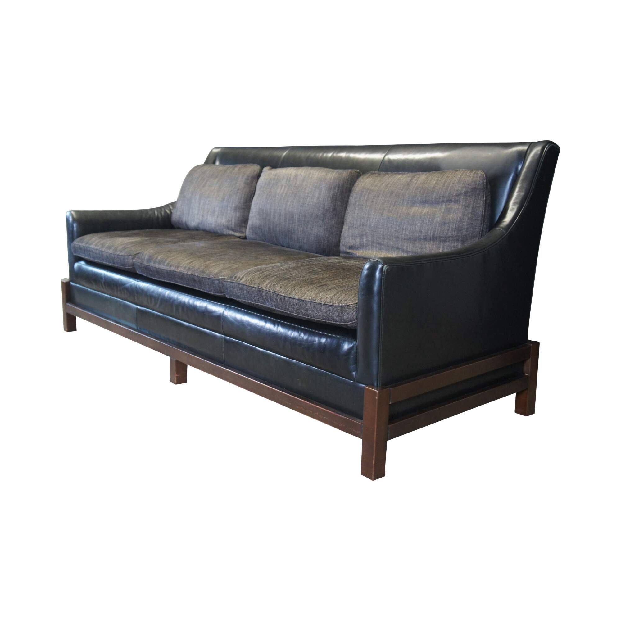 Laura Kirar for Baker Furniture Neue Sofa. Features a black leather frame with swoop arms on an espresso cradle. A three seat design with gray seat cushions and back rests. An elegant design that lends well in any modern setting.