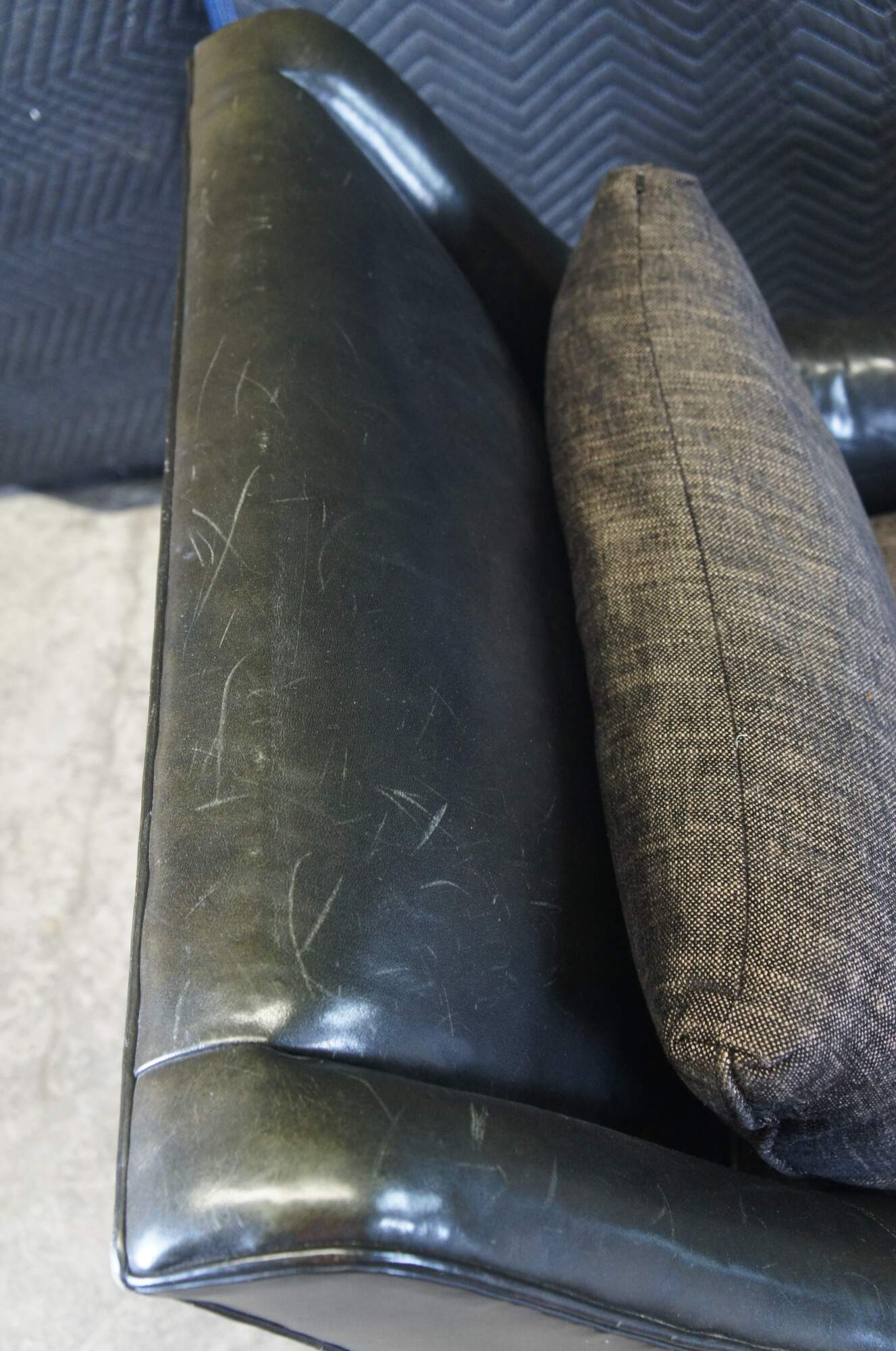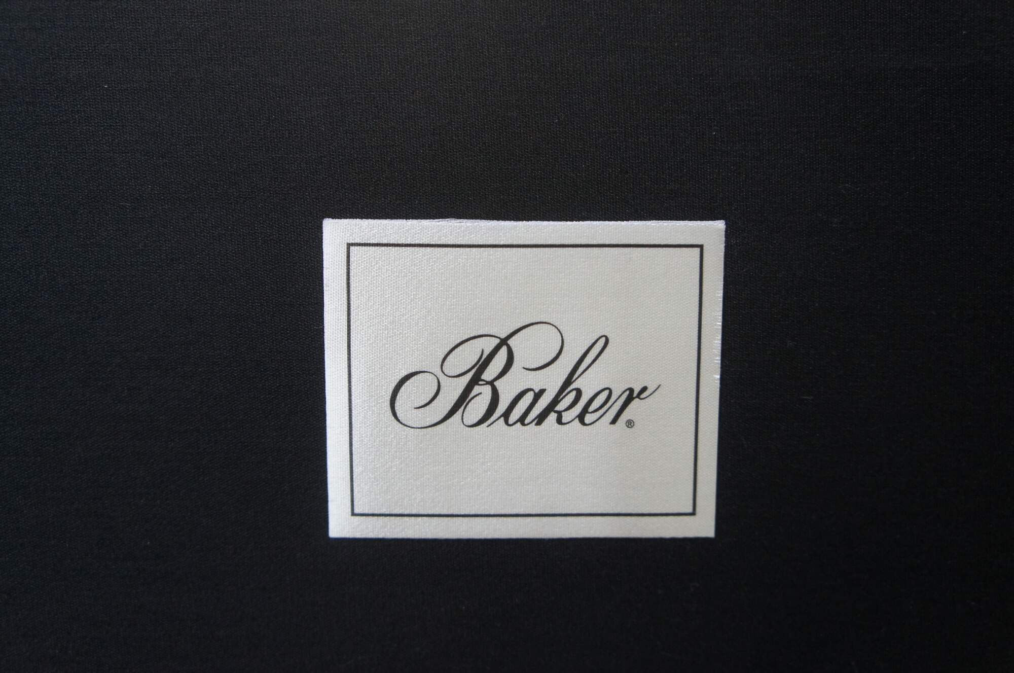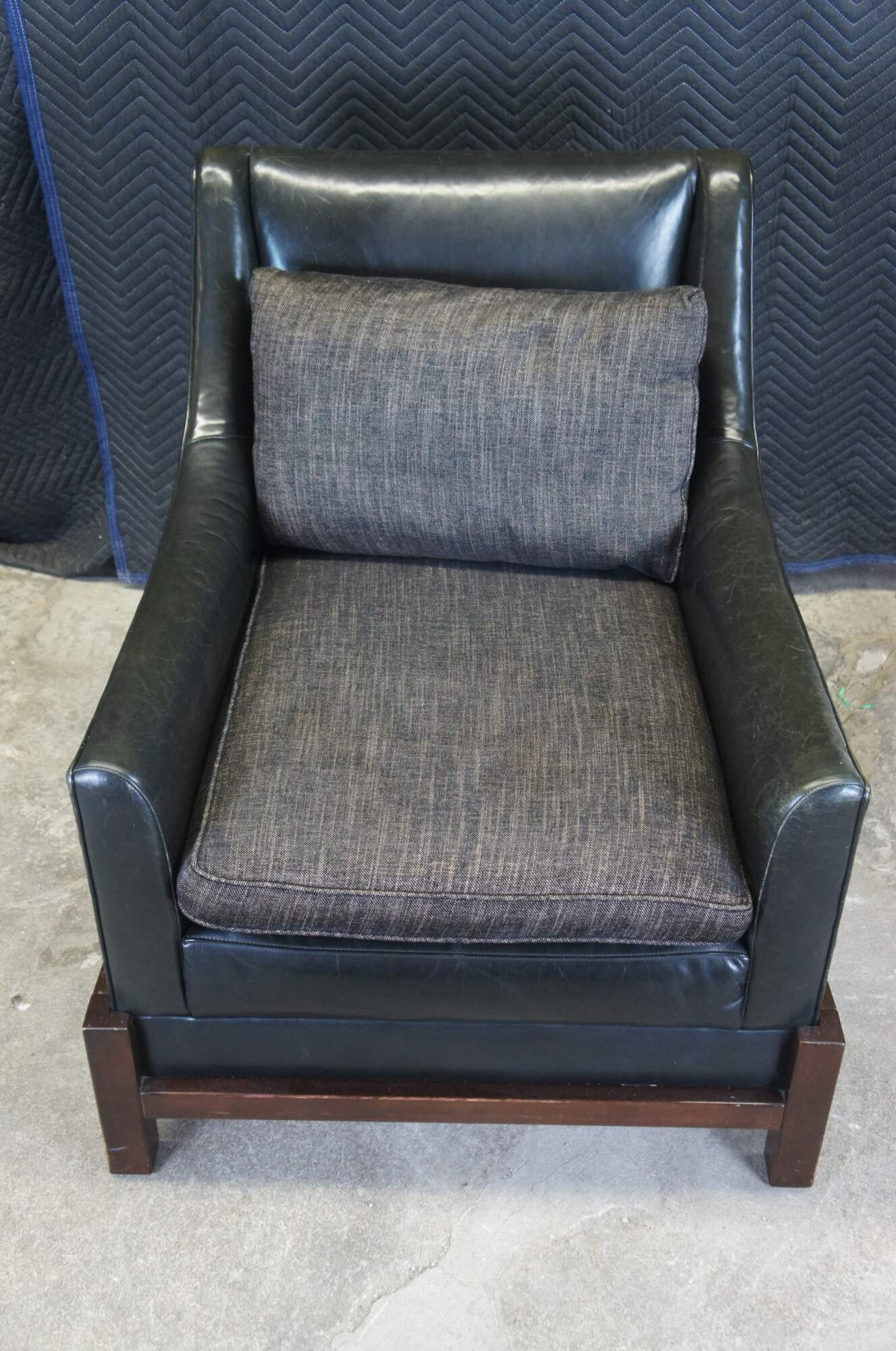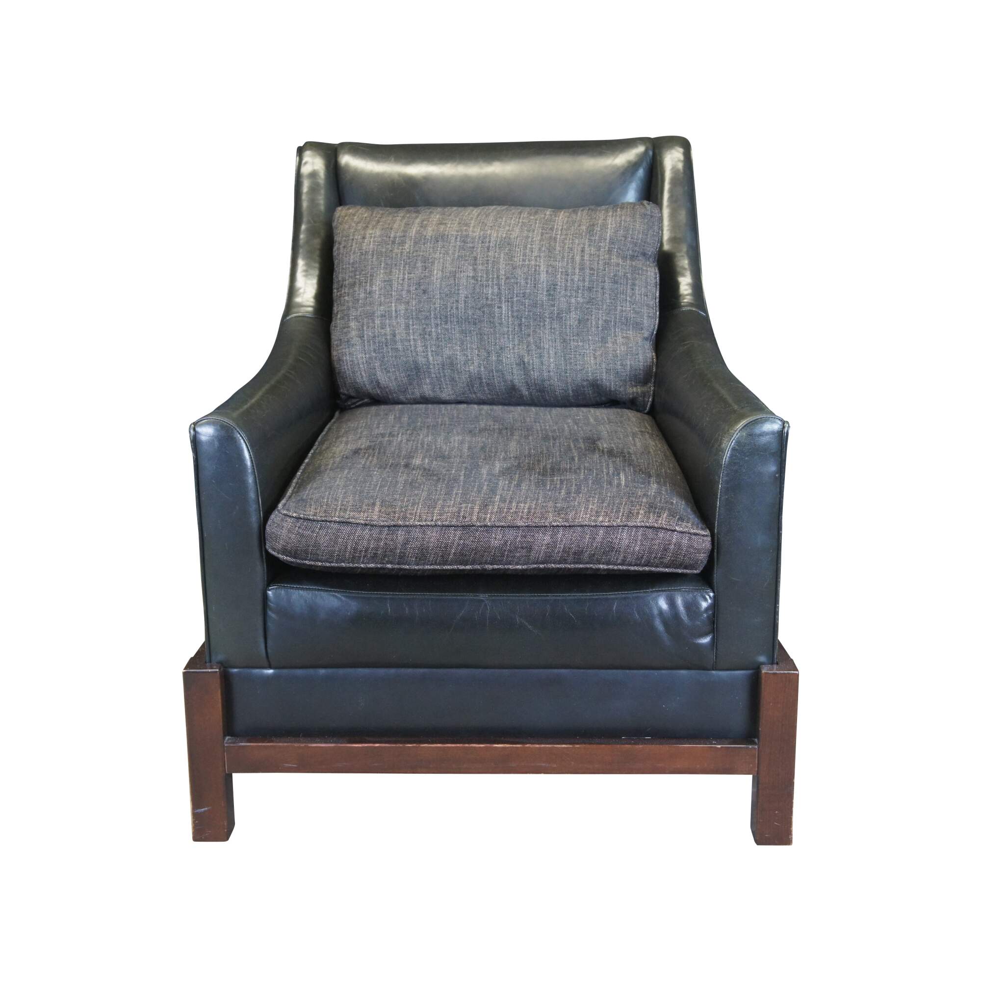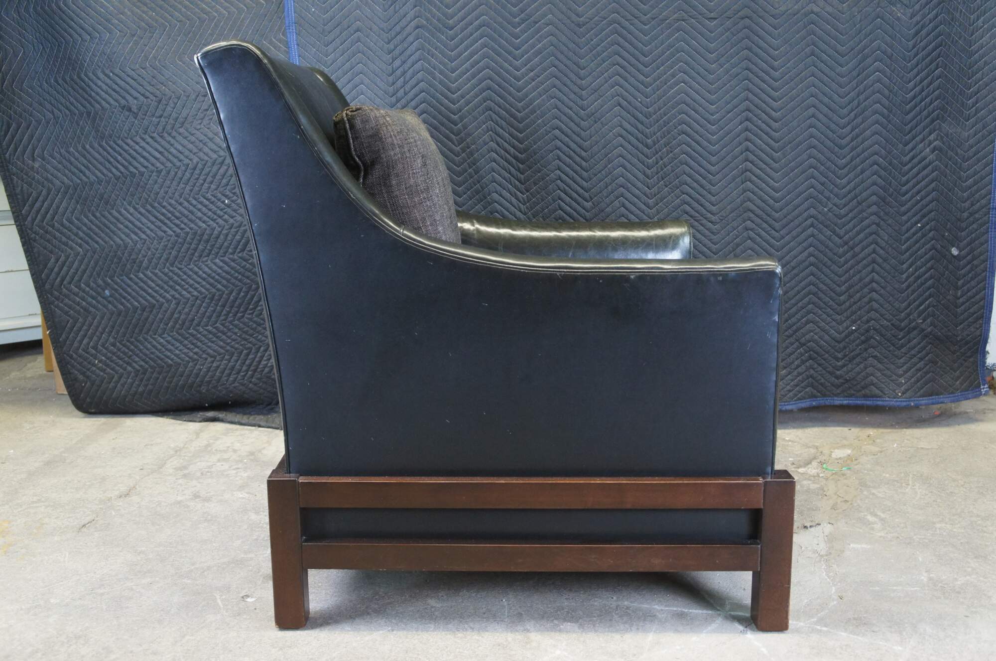 Laura Kirar for Baker Furniture Neue Library Club Arm Chair. Features a black leather frame with swoop arms on an espresso cradle. Features gray seat cushion and back rests. An elegant design that lends well in any modern setting.