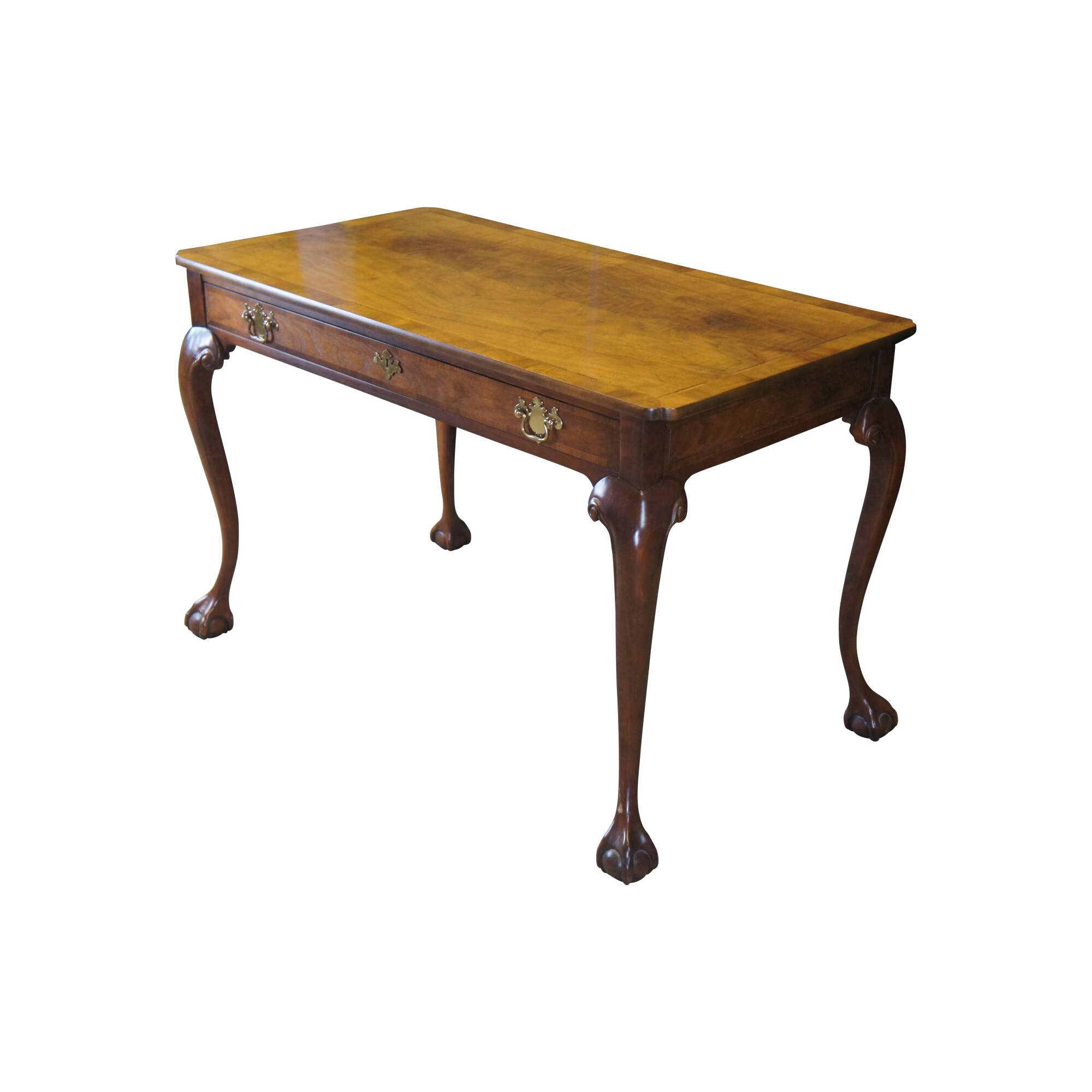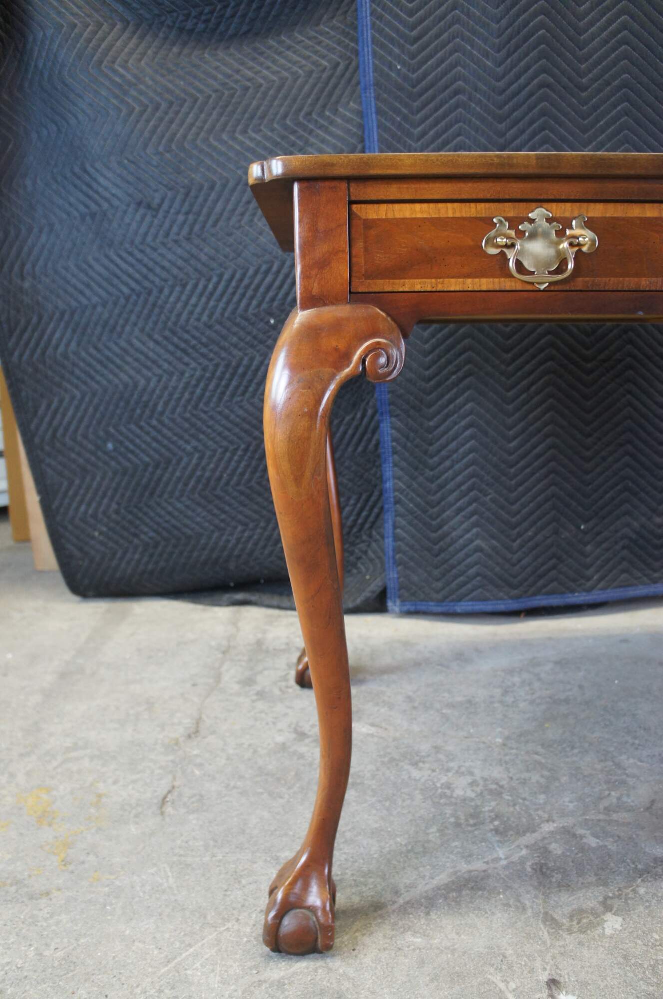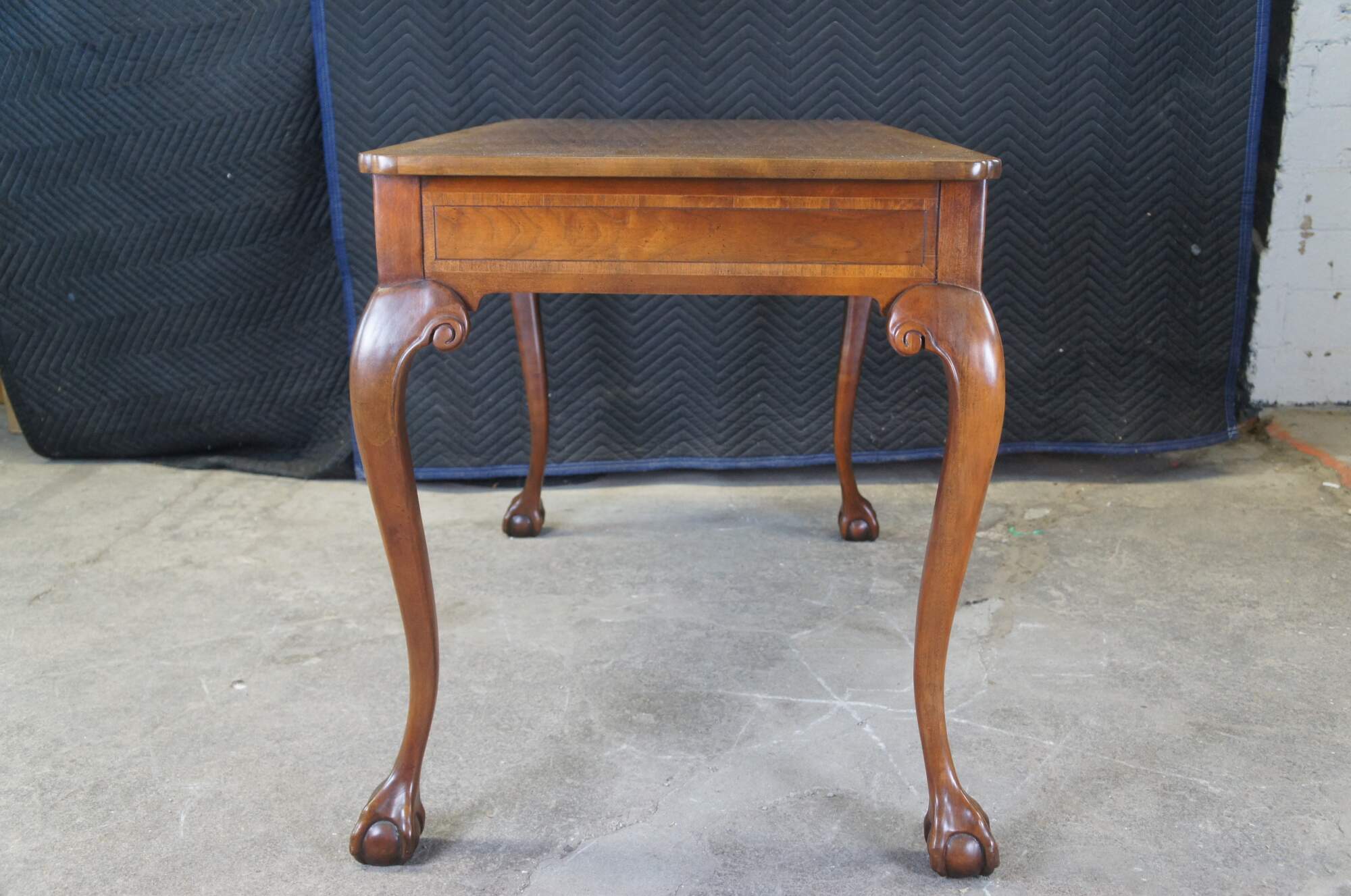 20th Century Baker Stately Homes English Georgian Chippendale Style Writing Desk. A rectangular form made from walnut with a beautiful matchbook top. The desk features herringbone inlay throughout, a large dovetailed drawer with key and long cabriole legs leading to ball and claw feet.