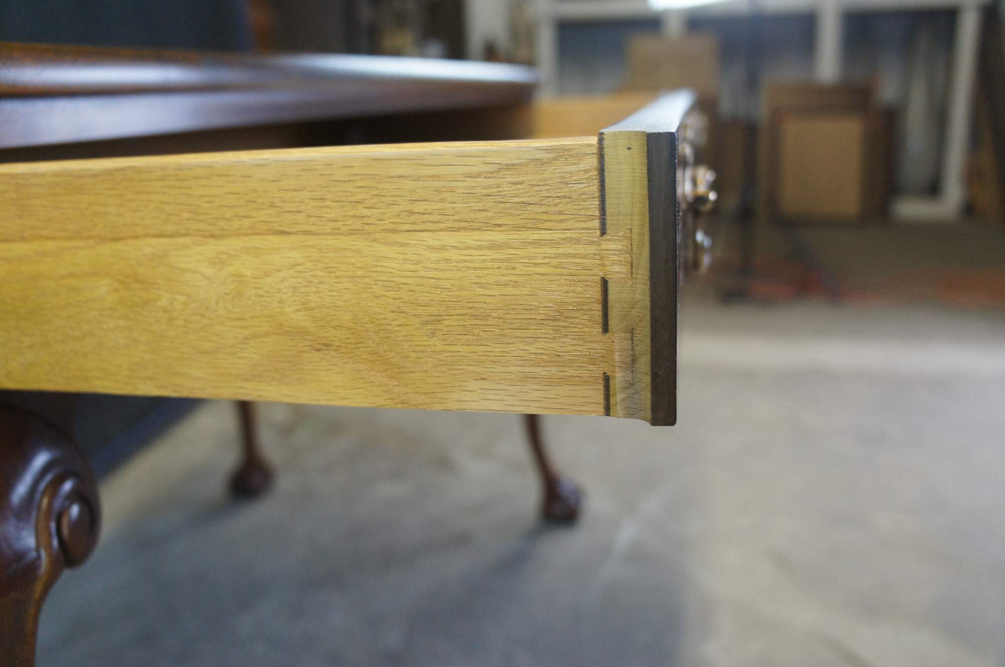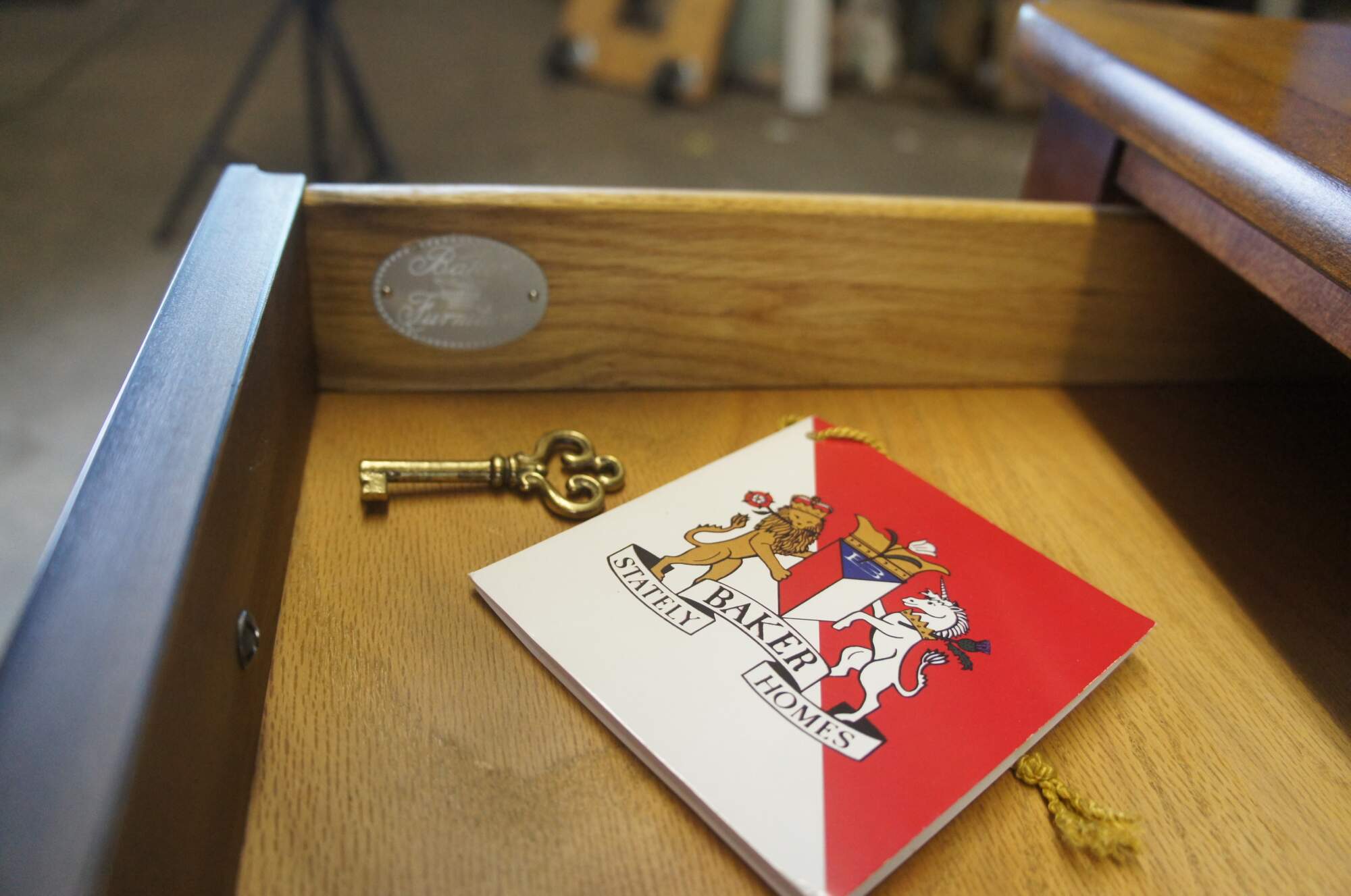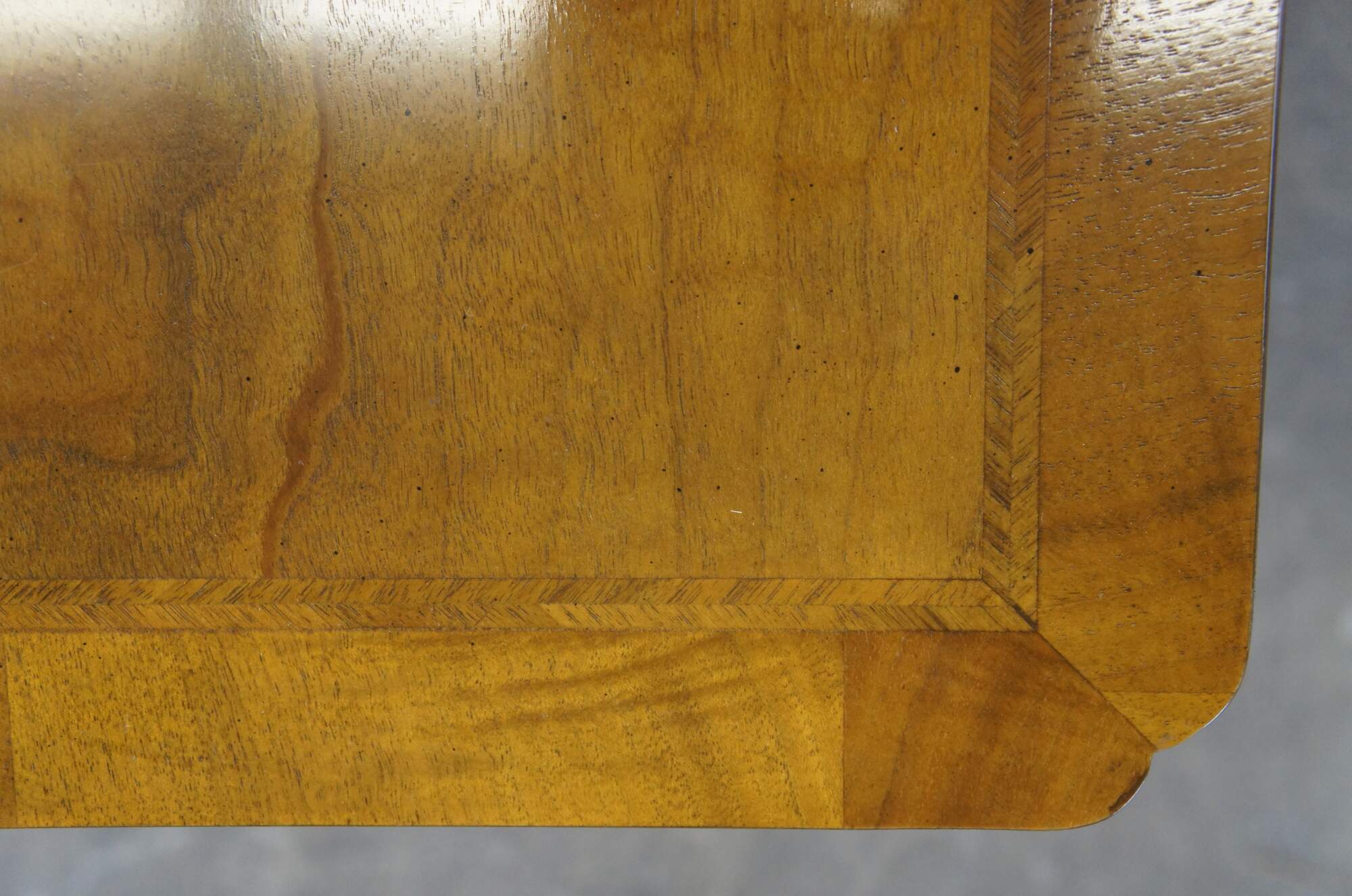 20th Century Baker Stately Homes English Georgian Chippendale Style Writing Desk. A rectangular form made from walnut with a beautiful matchbook top. The desk features herringbone inlay throughout, a large dovetailed drawer with key and long cabriole legs leading to ball and claw feet.
