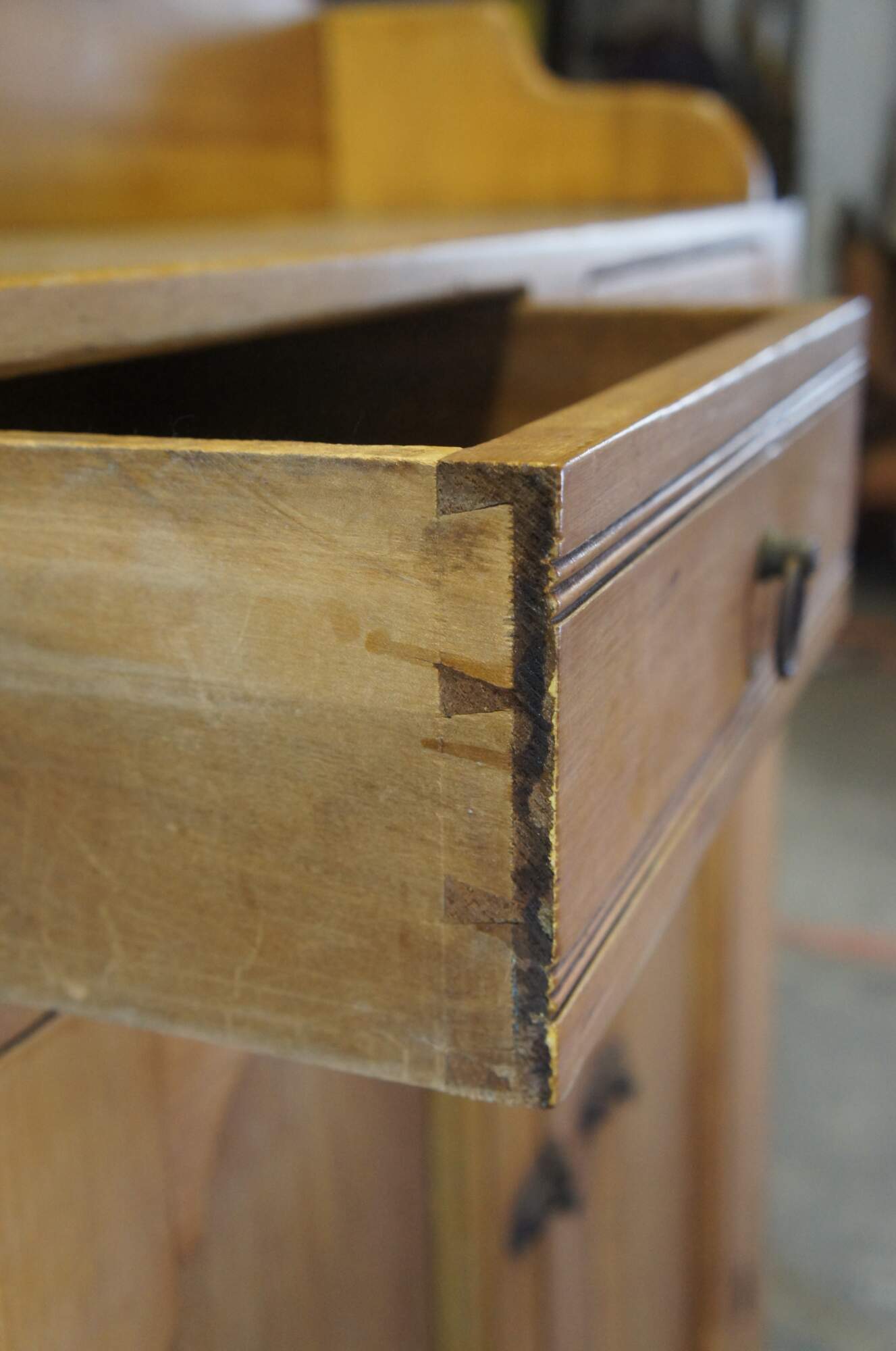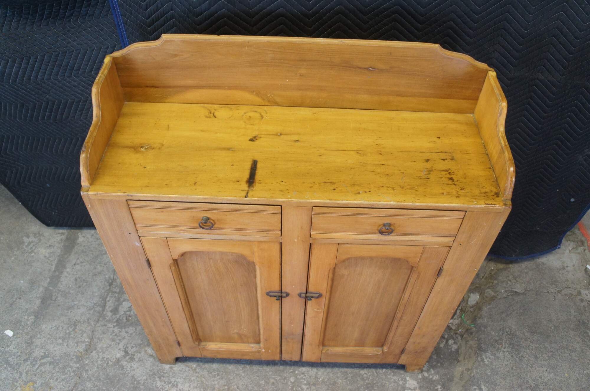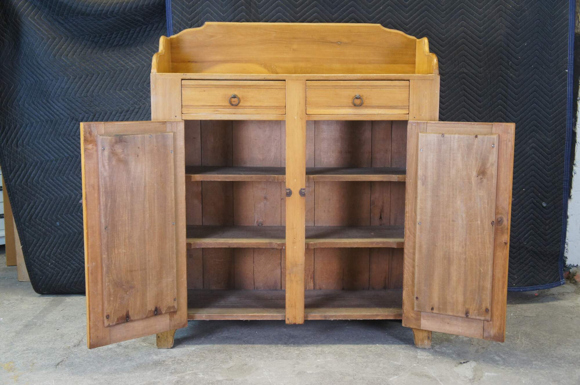 A warming handmade 19th Century Early American Jelly Cabinet or Pantry Cupboard, circa 1870s. A rectangular form made from Polar with an upper surface enclosed by a serpentine backsplash over two hand dovetailed drawers and lower cupboard with two shelves. Lower section has metal latches and upper section has ring pulls.