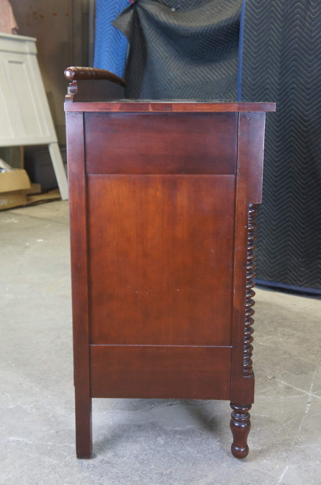 American Empire Revival Sideboard circa first half 20th century. Marked ""Styled by Park"". Features a rectangular form made from cherry with two large upper dovetailed drawers over lower cabients with shelf. Includes turned wooden knobs and applied spool turned columns along the front as well as a horizontal ribbed backsplash. The case is supported by turned turnip feet.