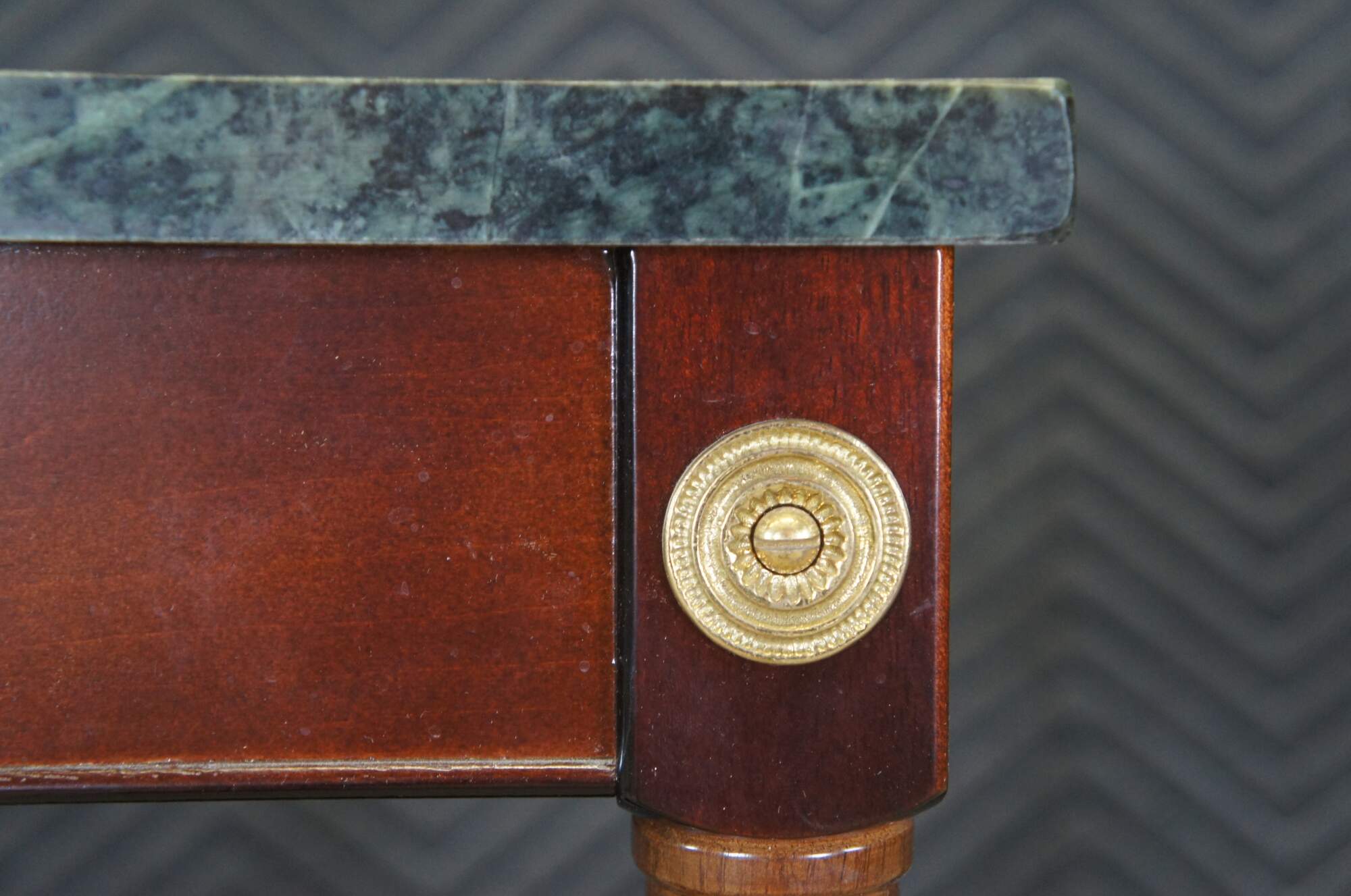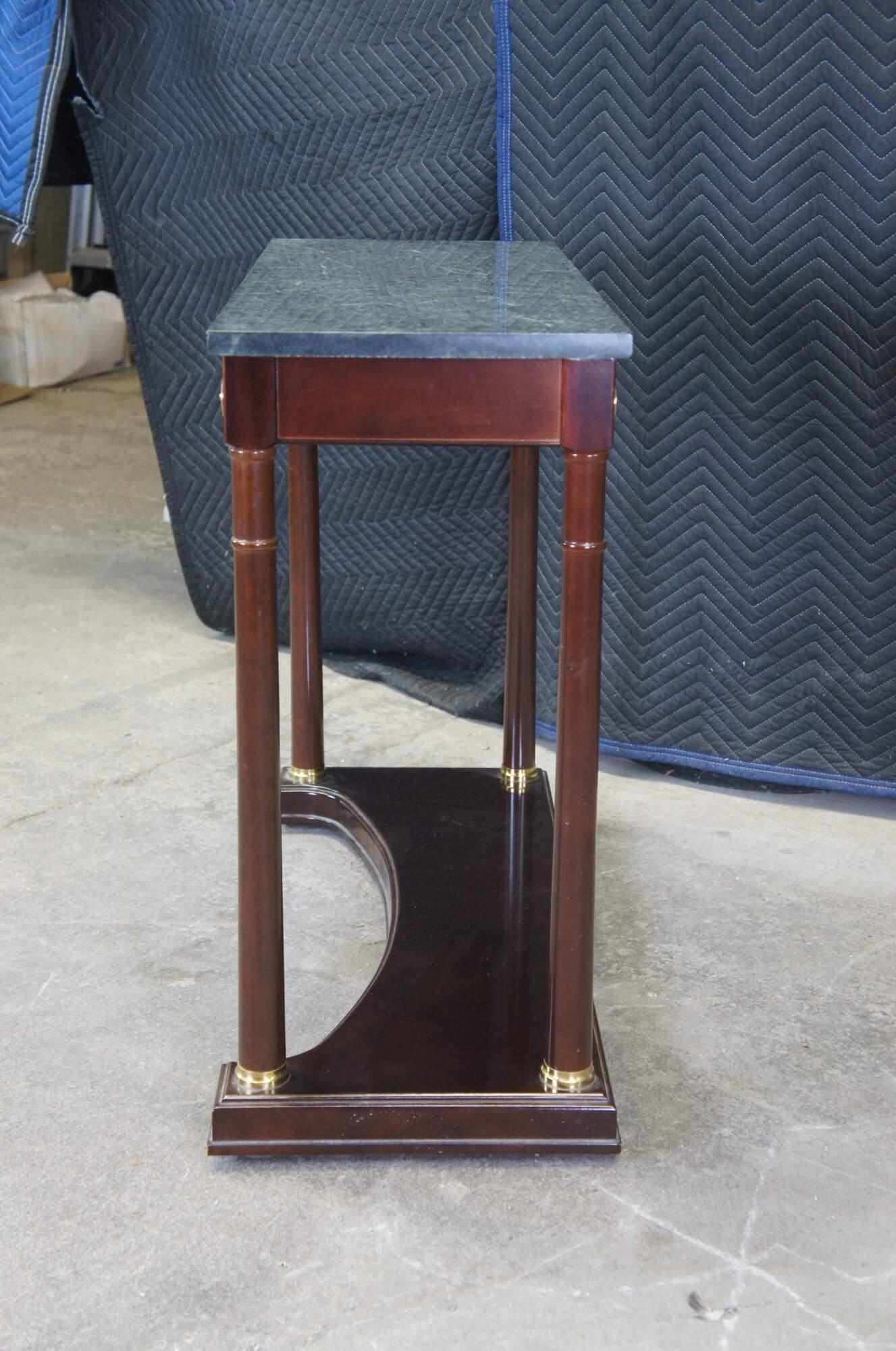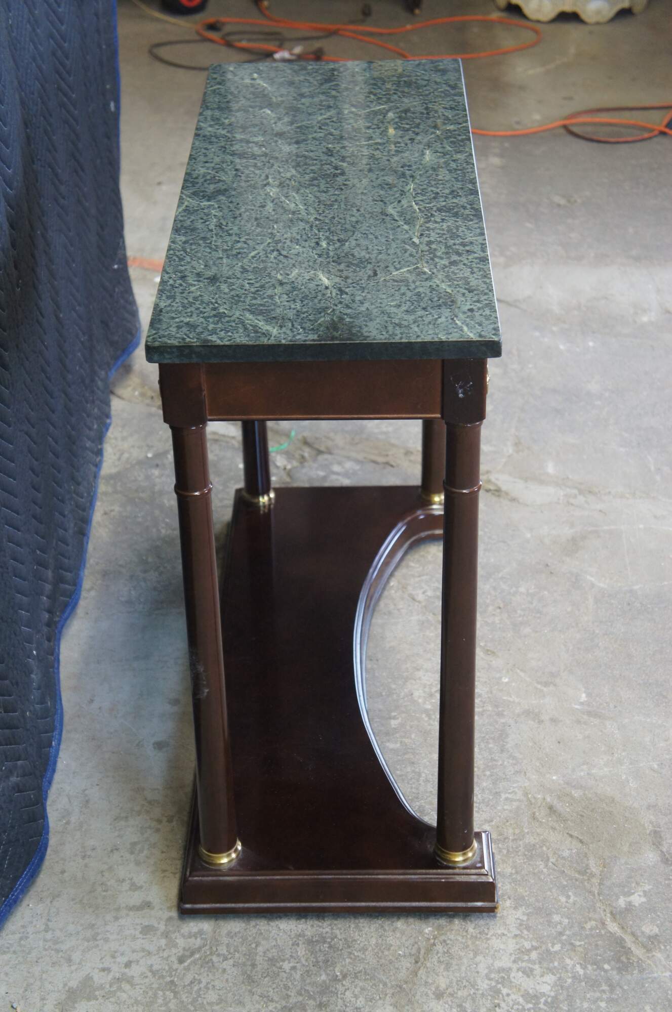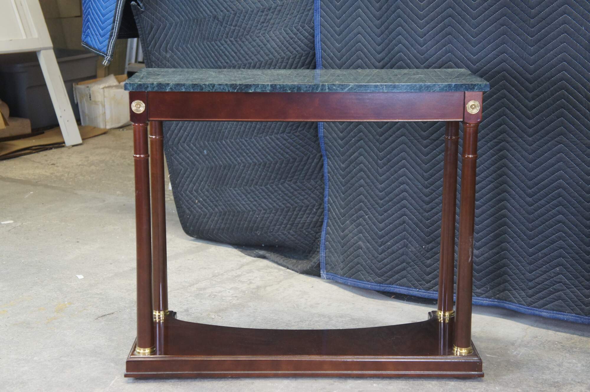 A stunning neoclassical inspired console table by Bombay Company. Made from Mahogany with a green marble top and brass accents. Circa 1989.