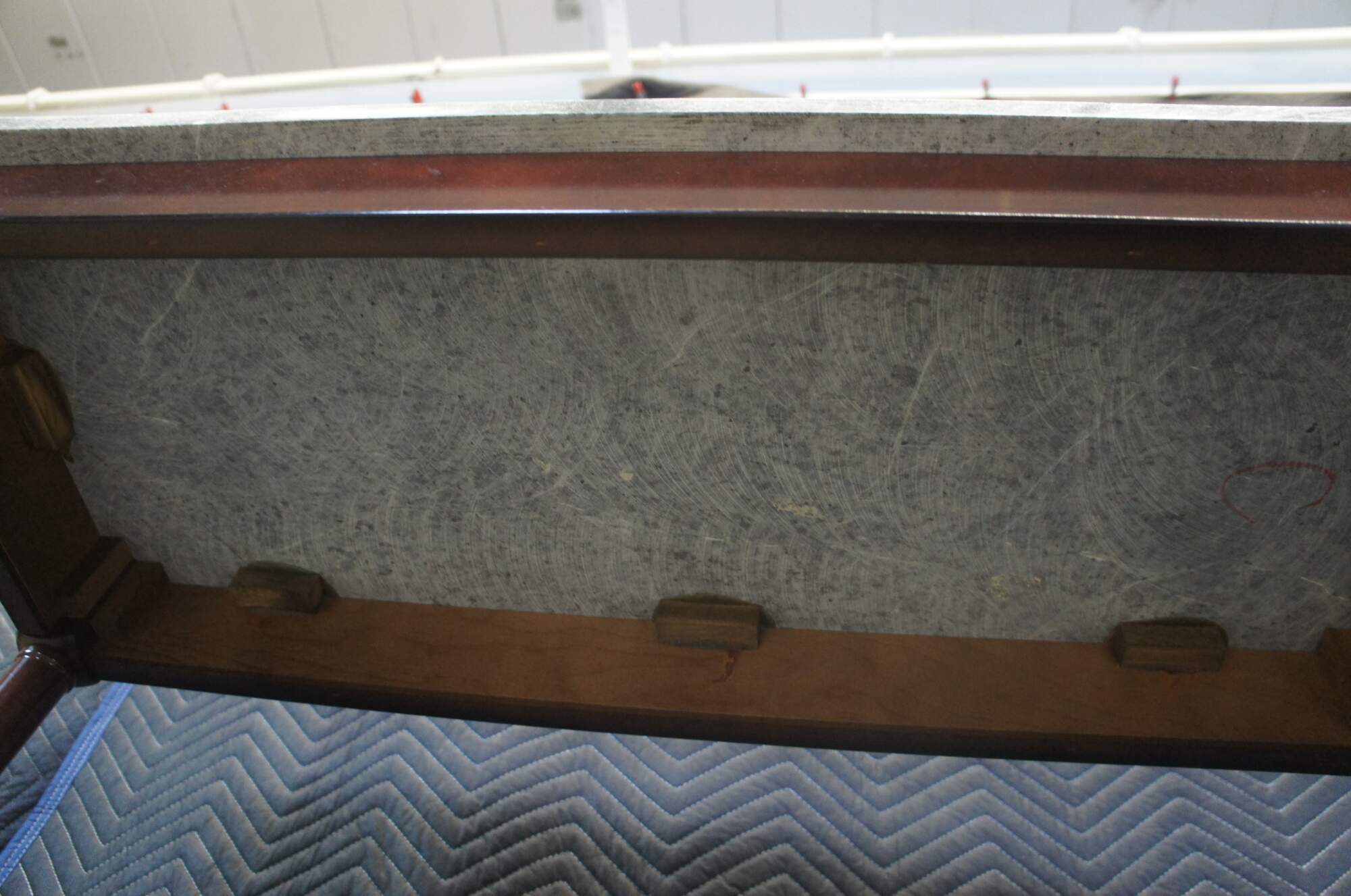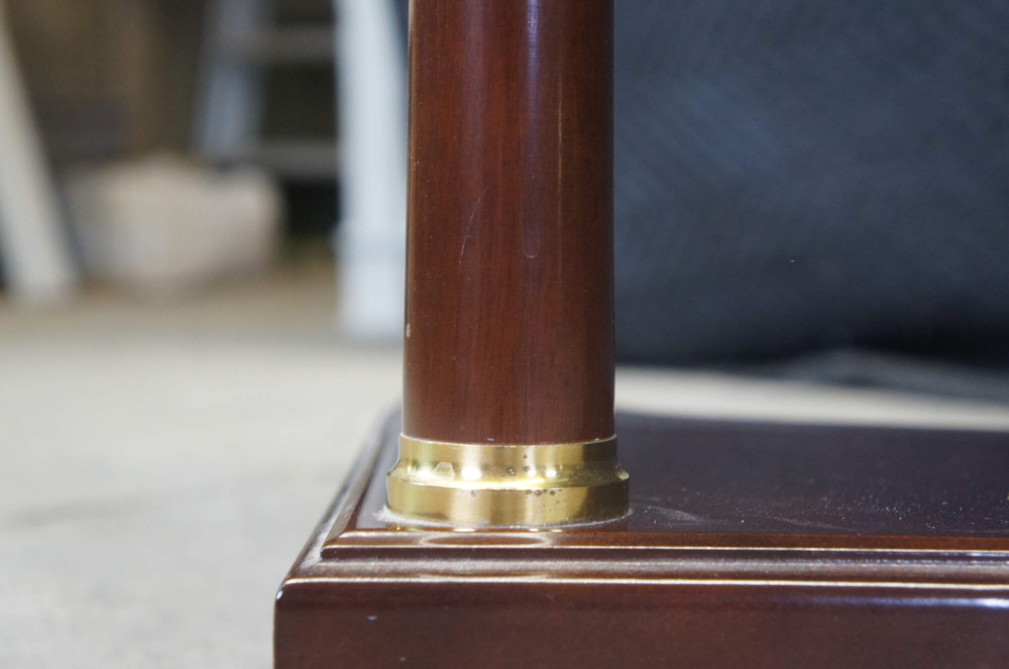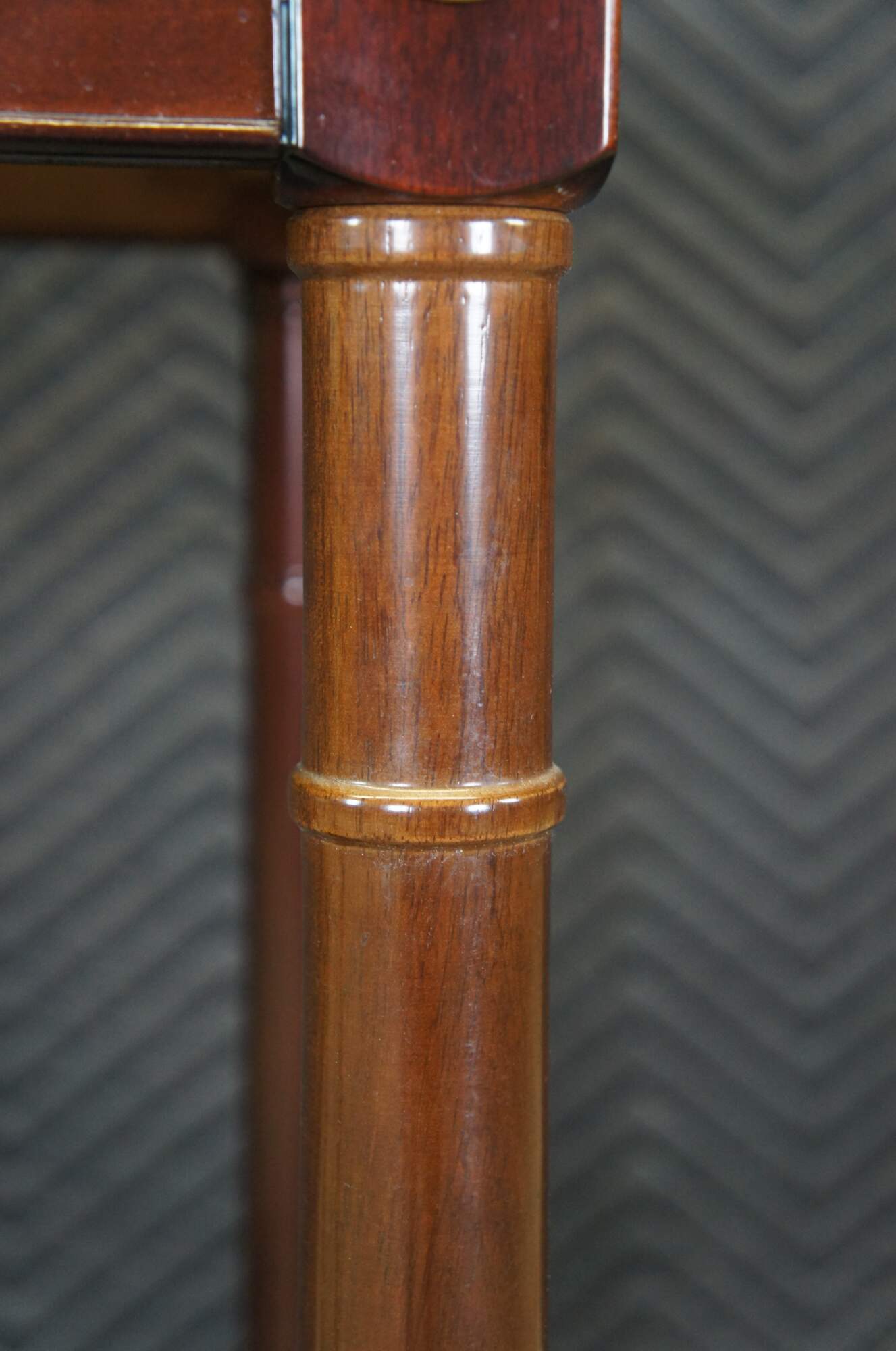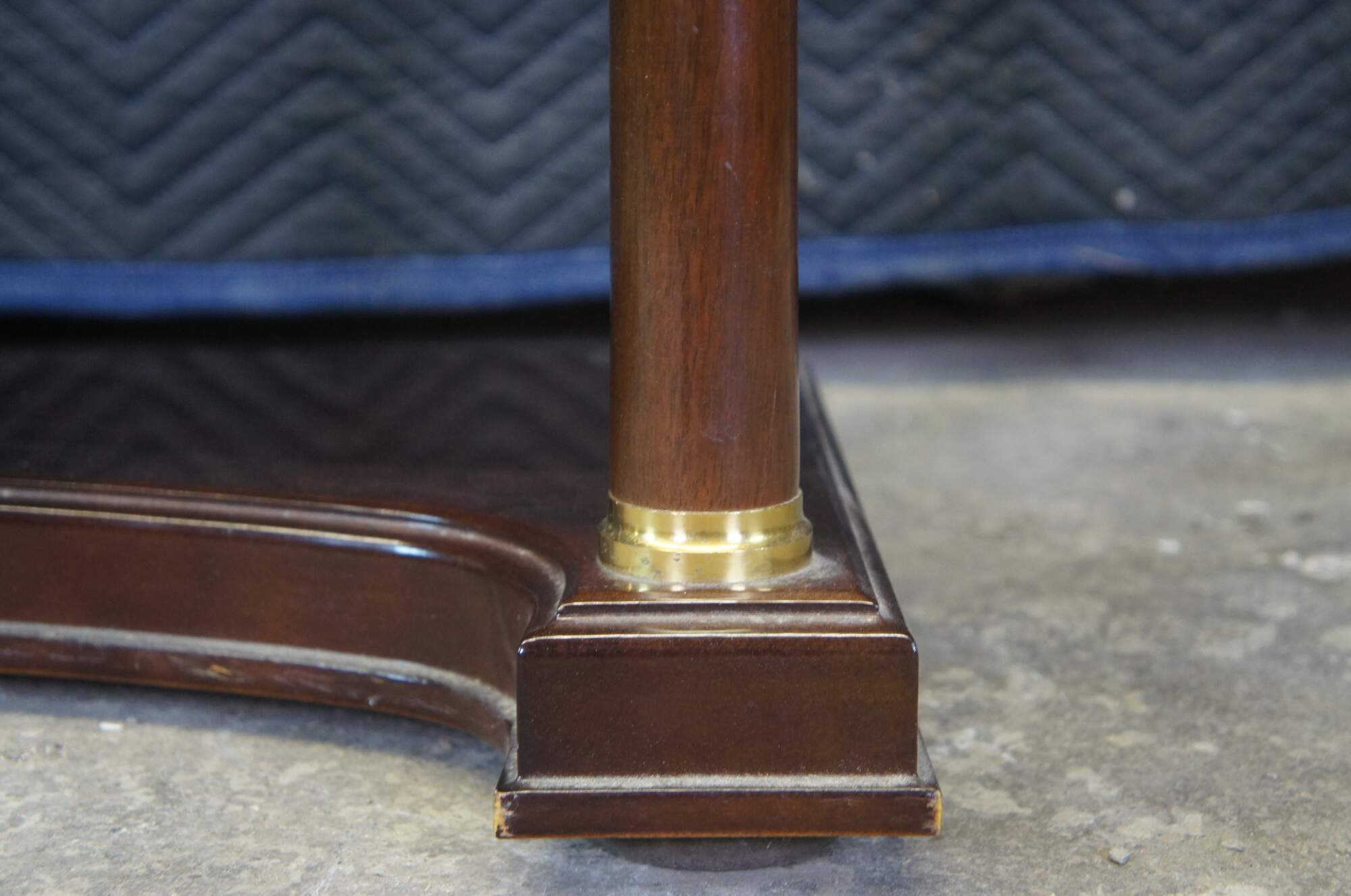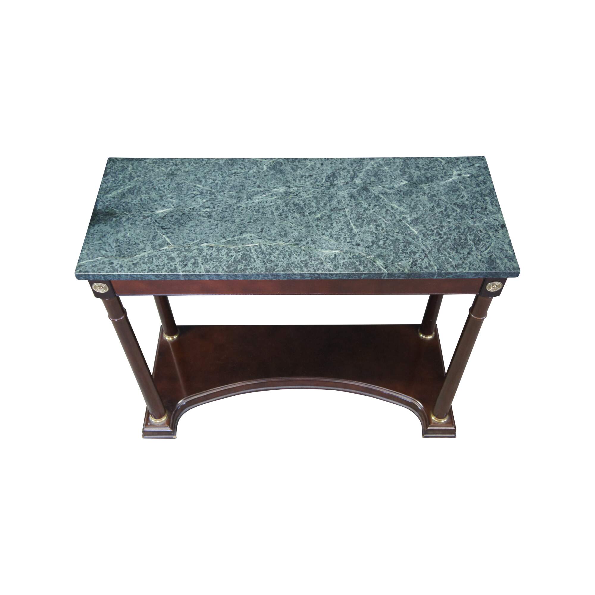 A stunning neoclassical inspired console table by Bombay Company. Made from Mahogany with a green marble top and brass accents. Circa 1989.