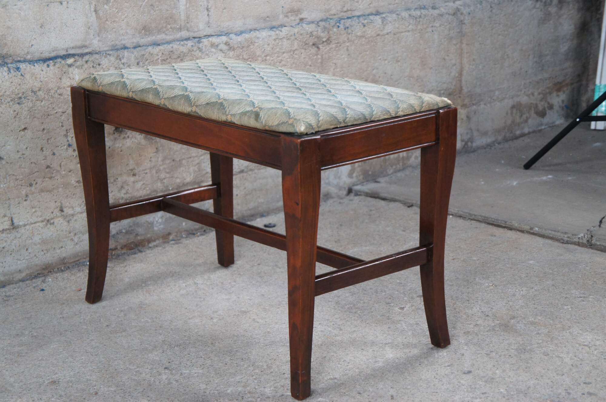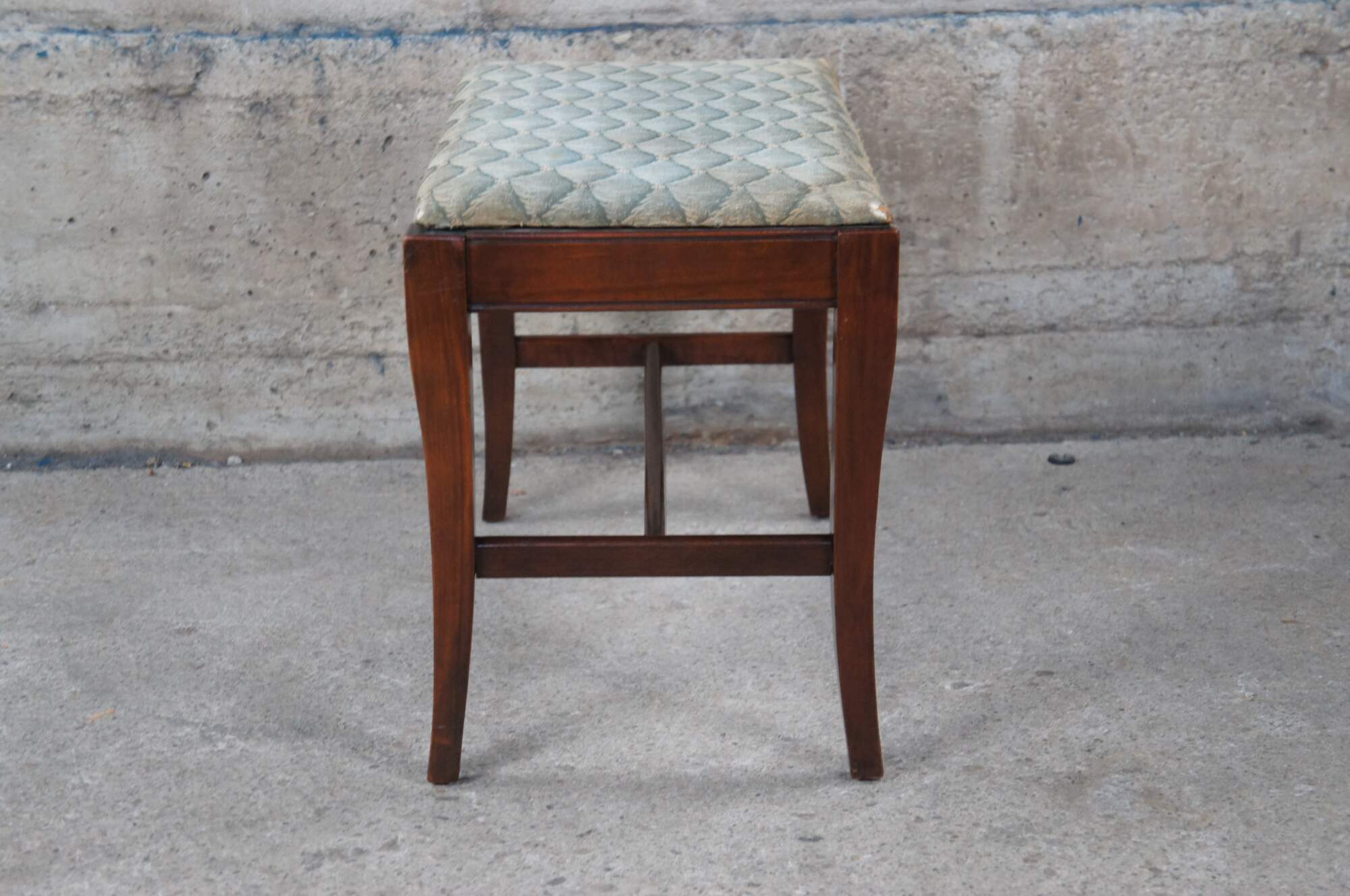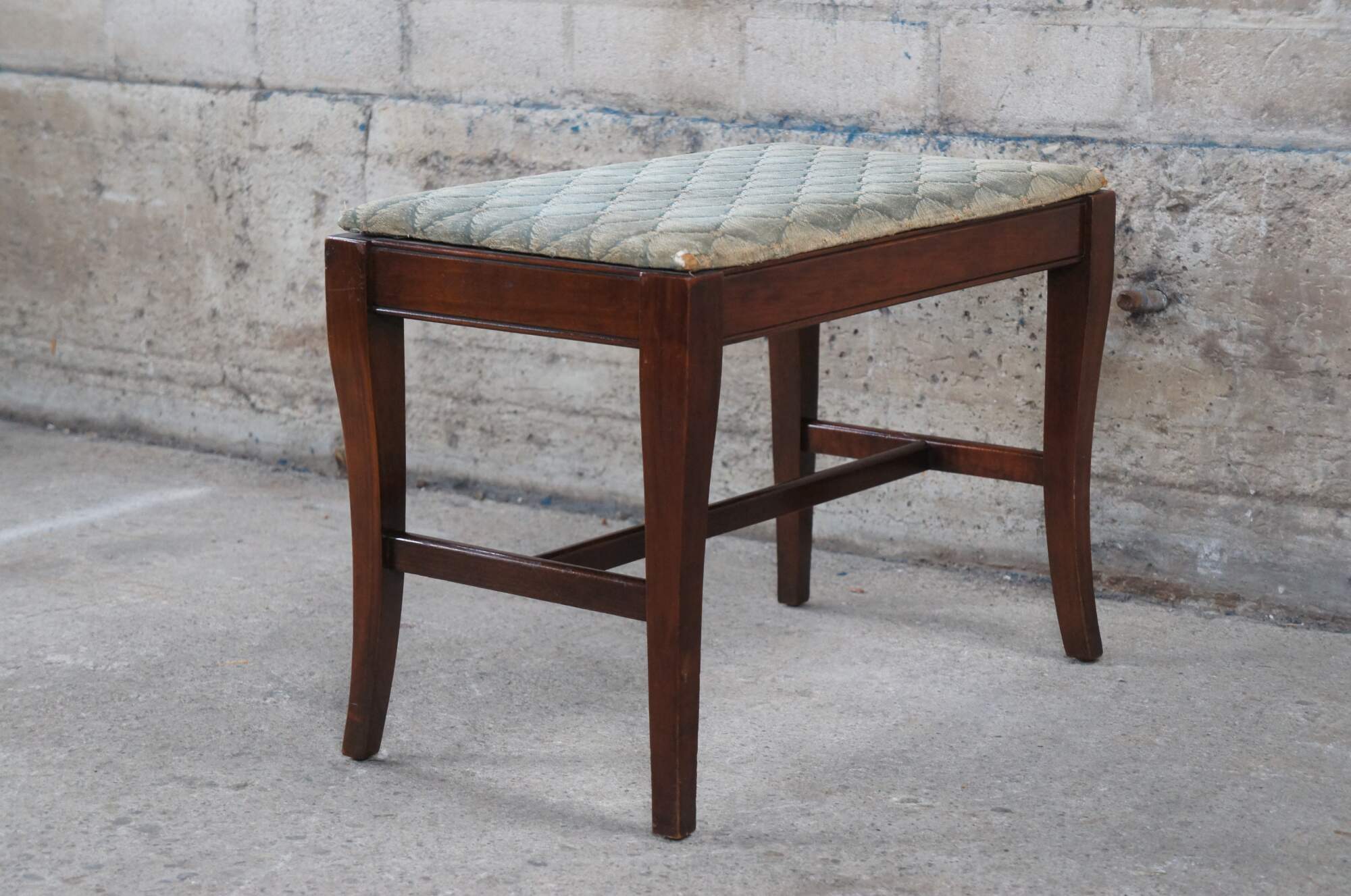 An early 20th century mahogany bench. Featuers an upholstered seat and contoured legs connected by an H stretcher.