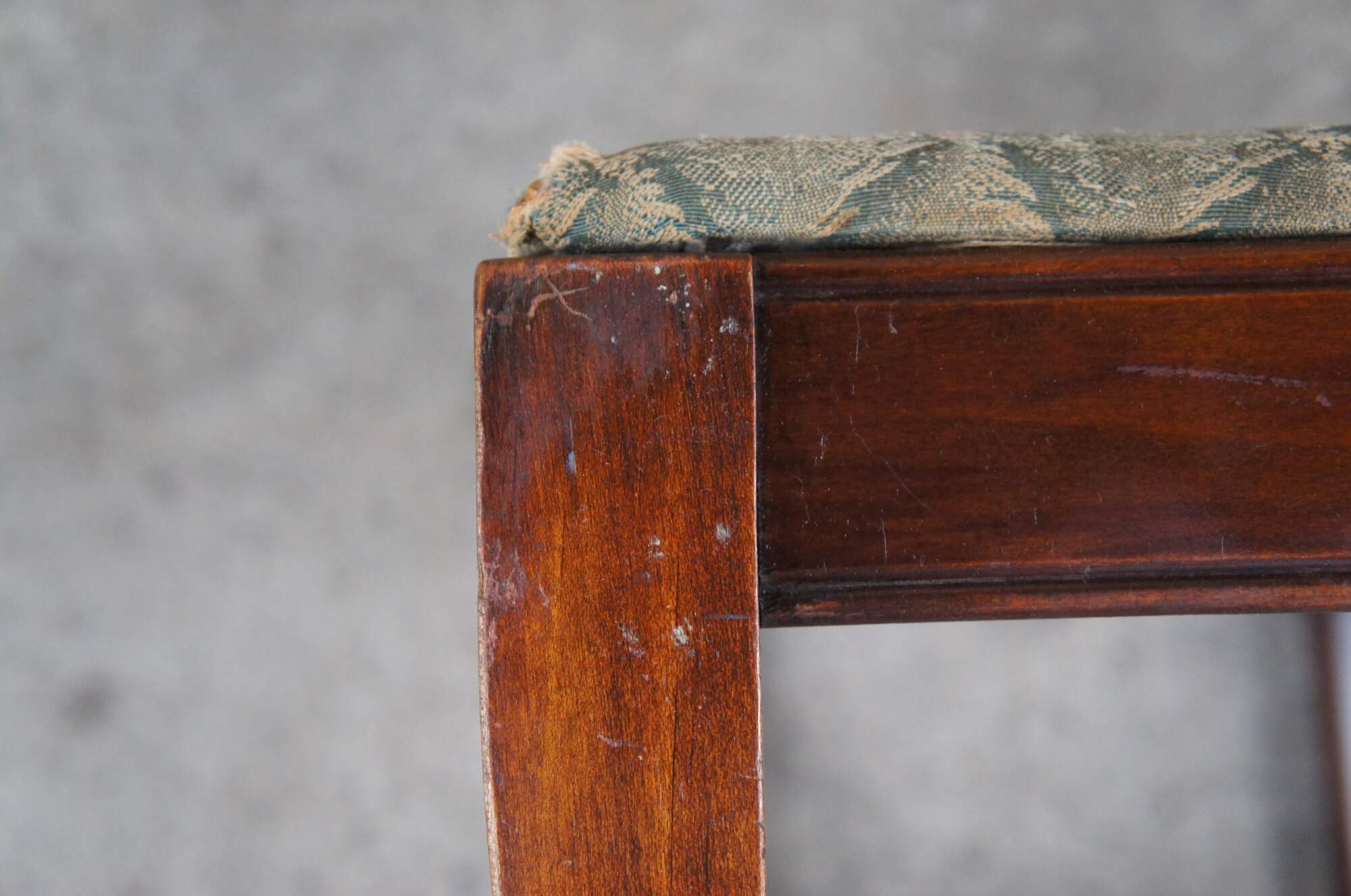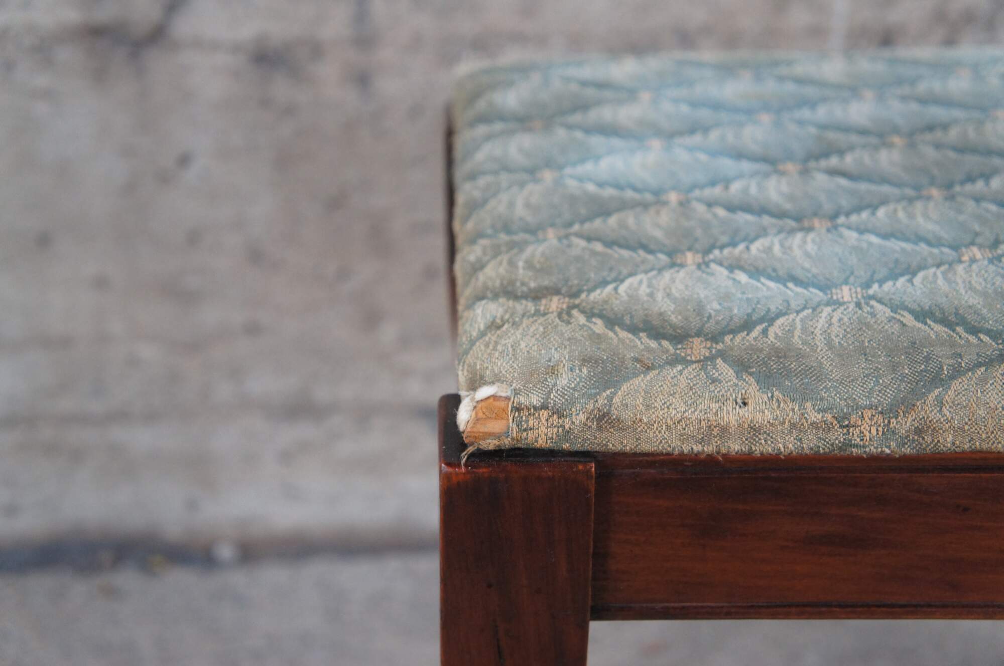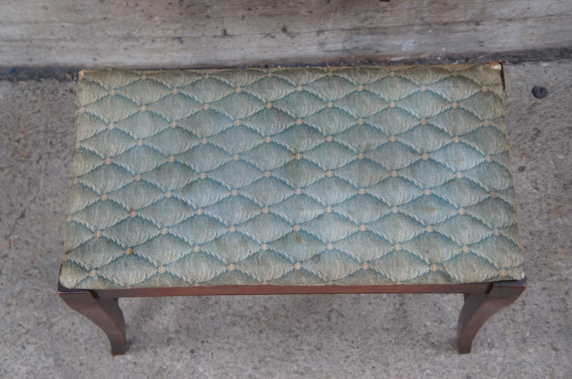 An early 20th century mahogany bench. Featuers an upholstered seat and contoured legs connected by an H stretcher.