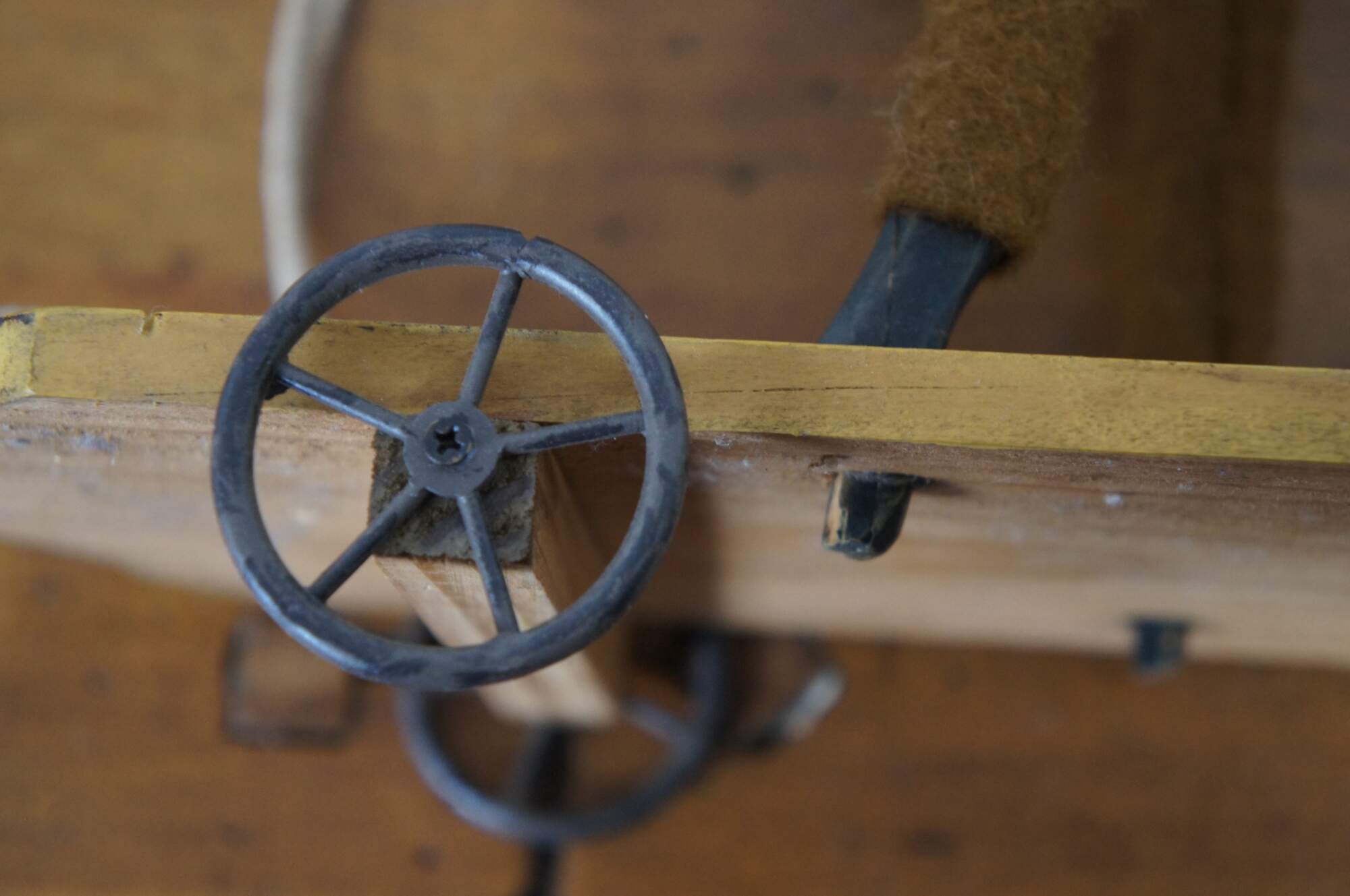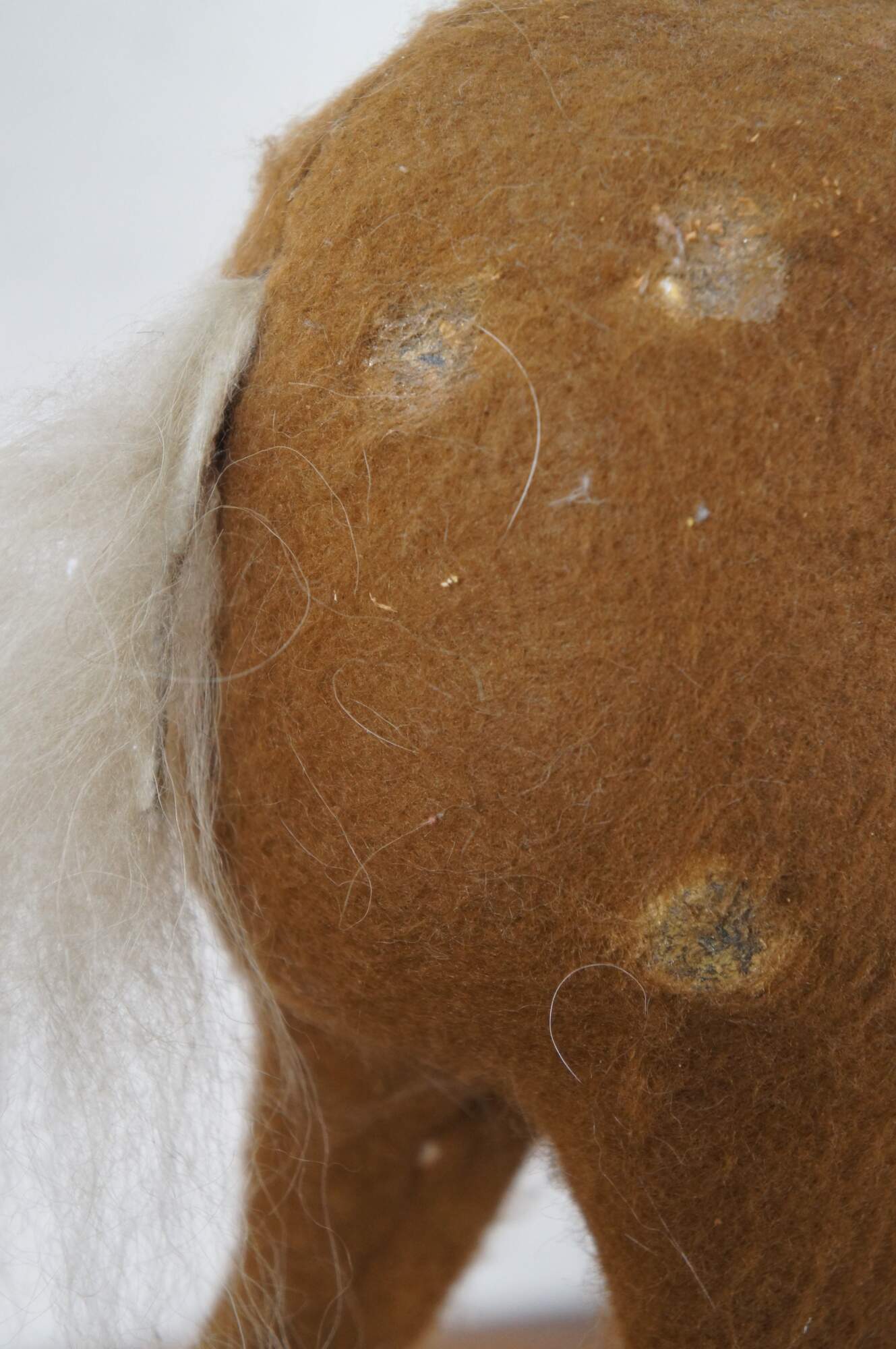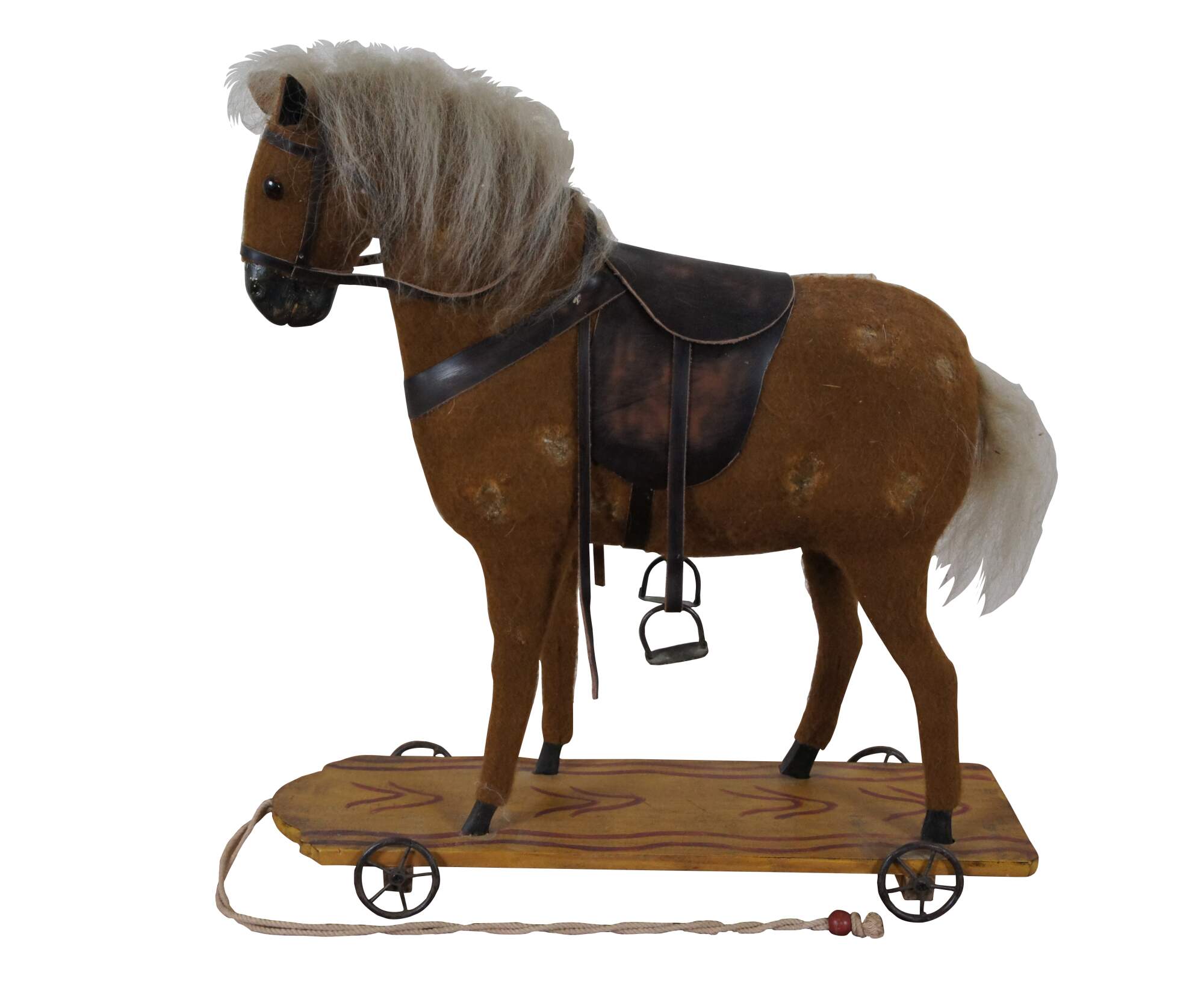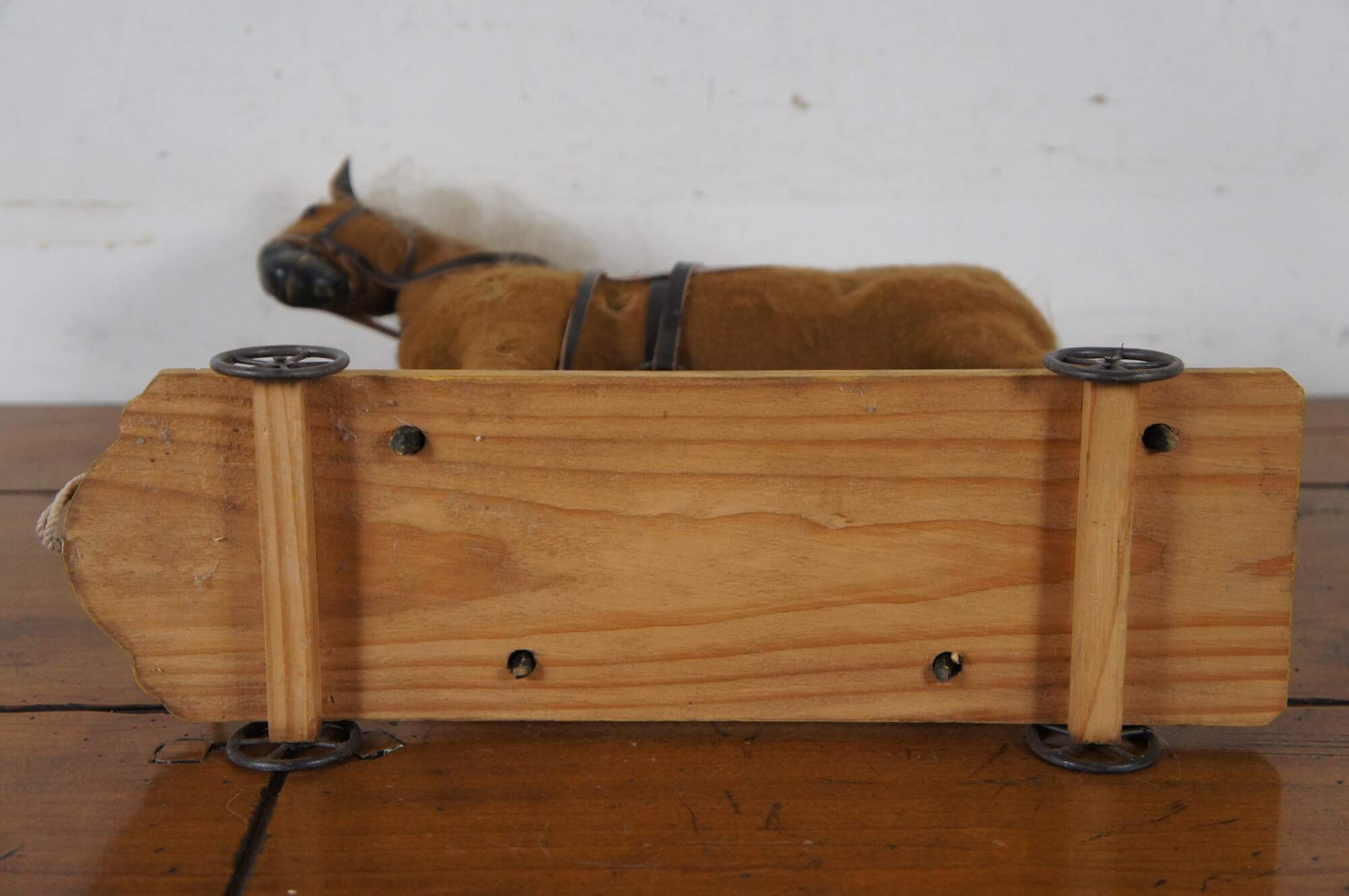 Vintage folk art pull toy featuring a felt horse on wood cart