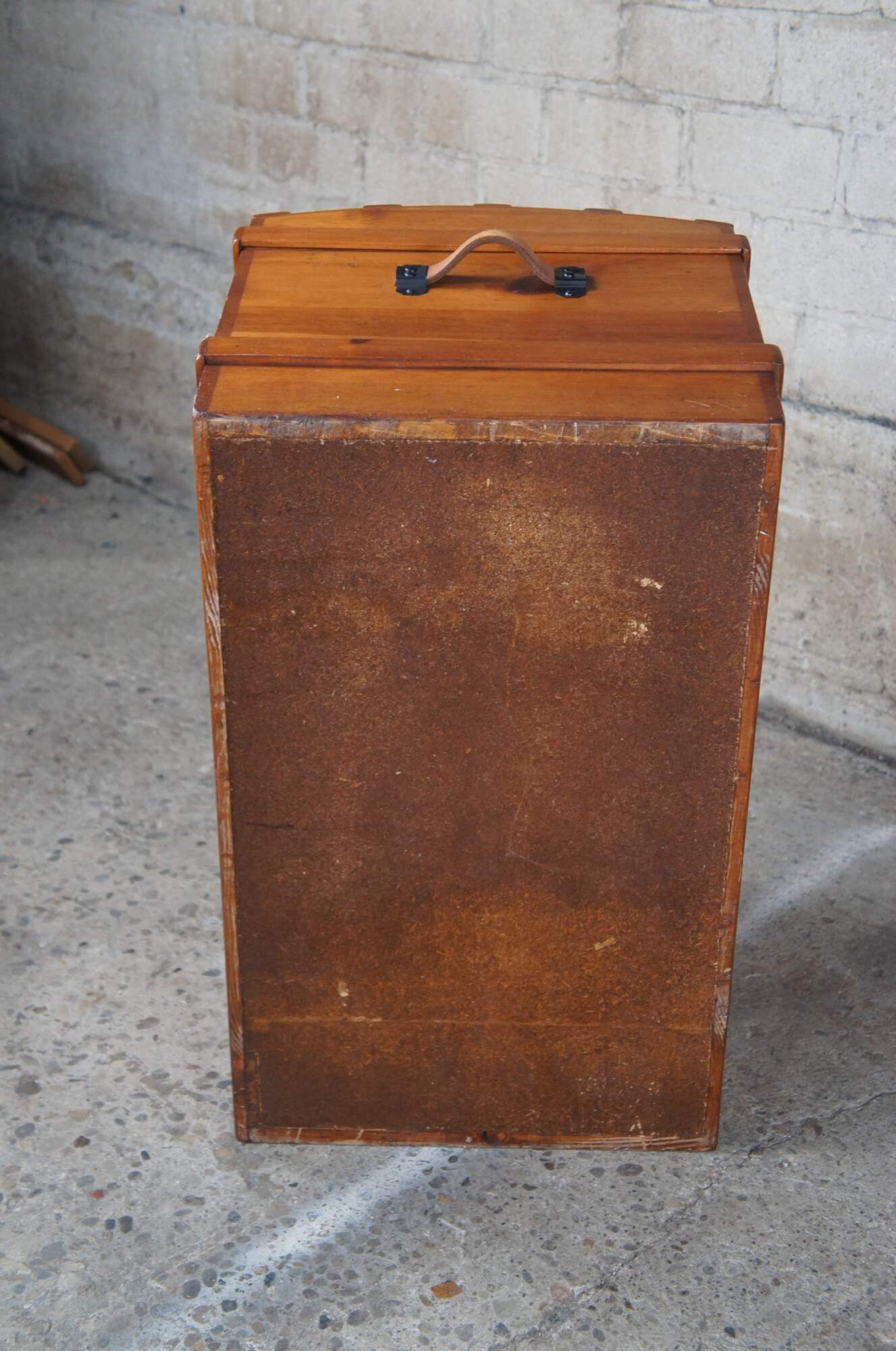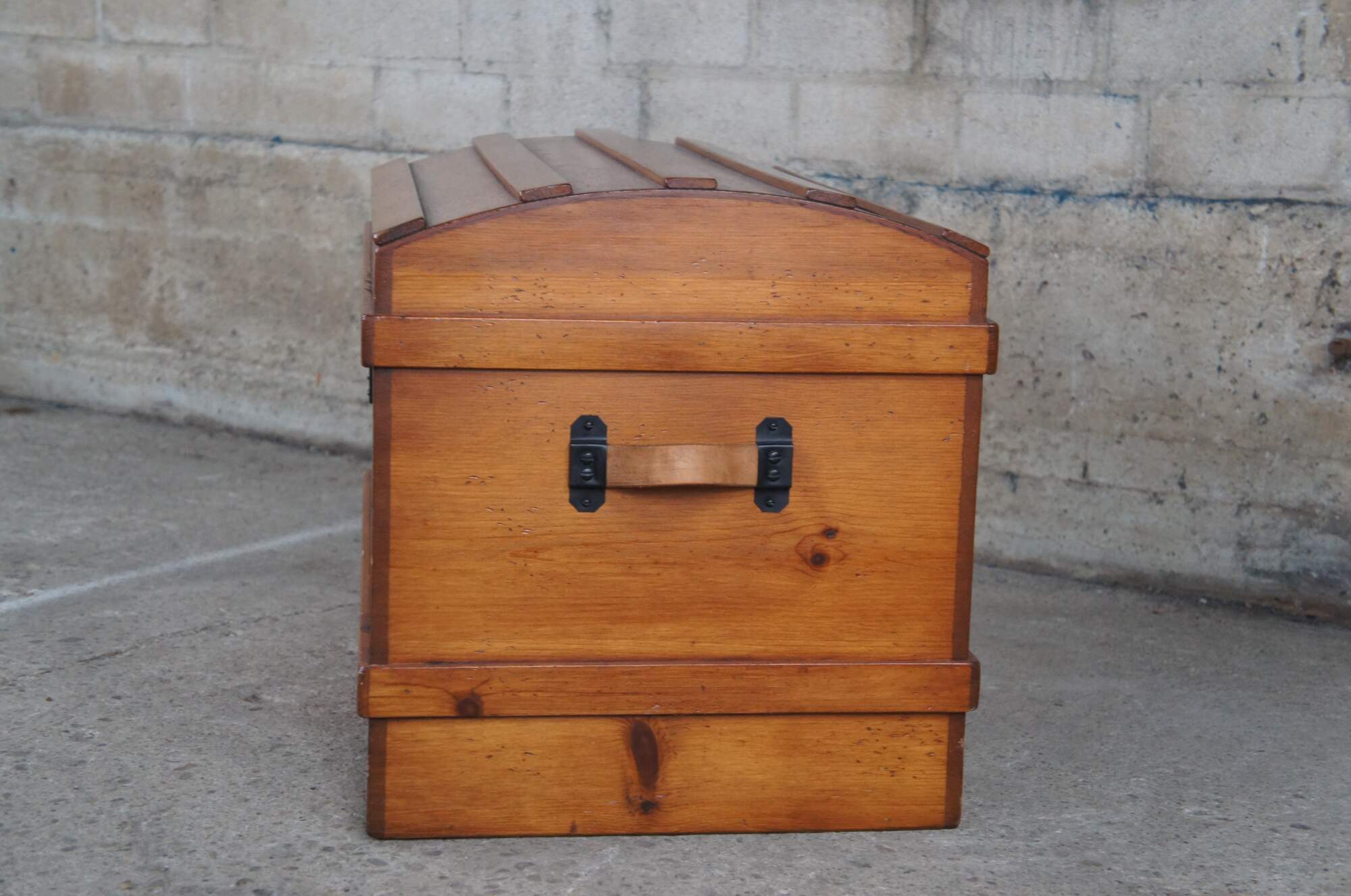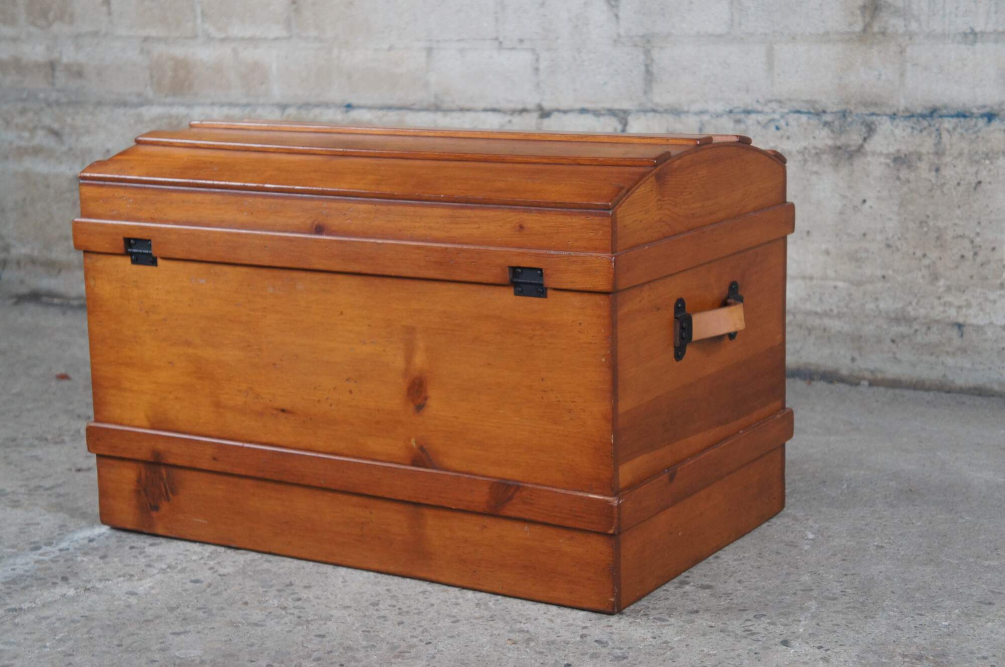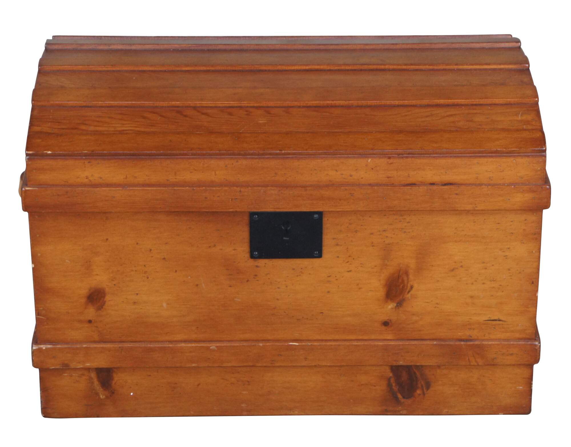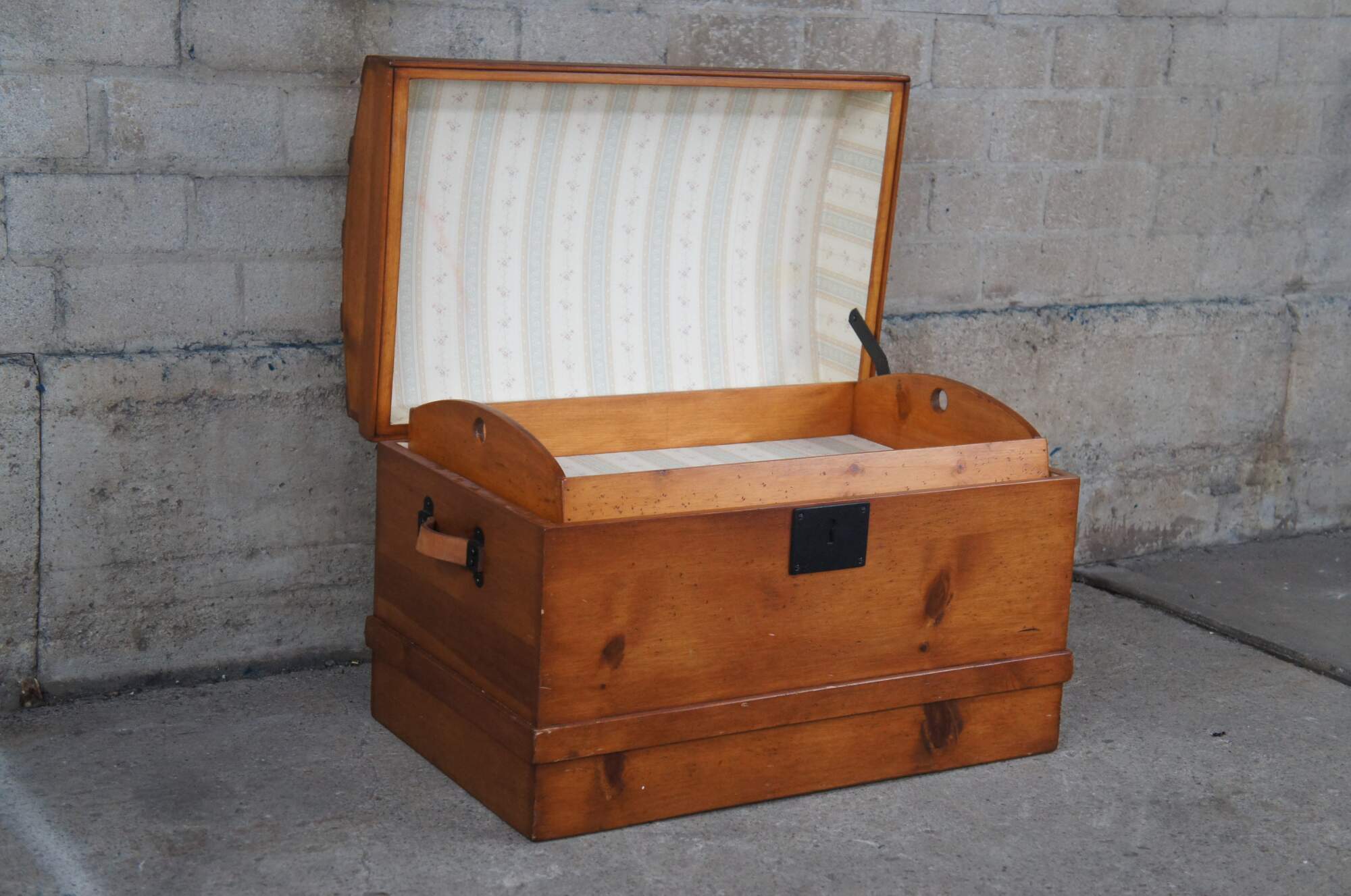 A Victorian style dome top trunk from the latter half of the 20th Century. Made from pine with leather handles and an iron escutcheon plate. Opens to a striped linen interior with removable tray.