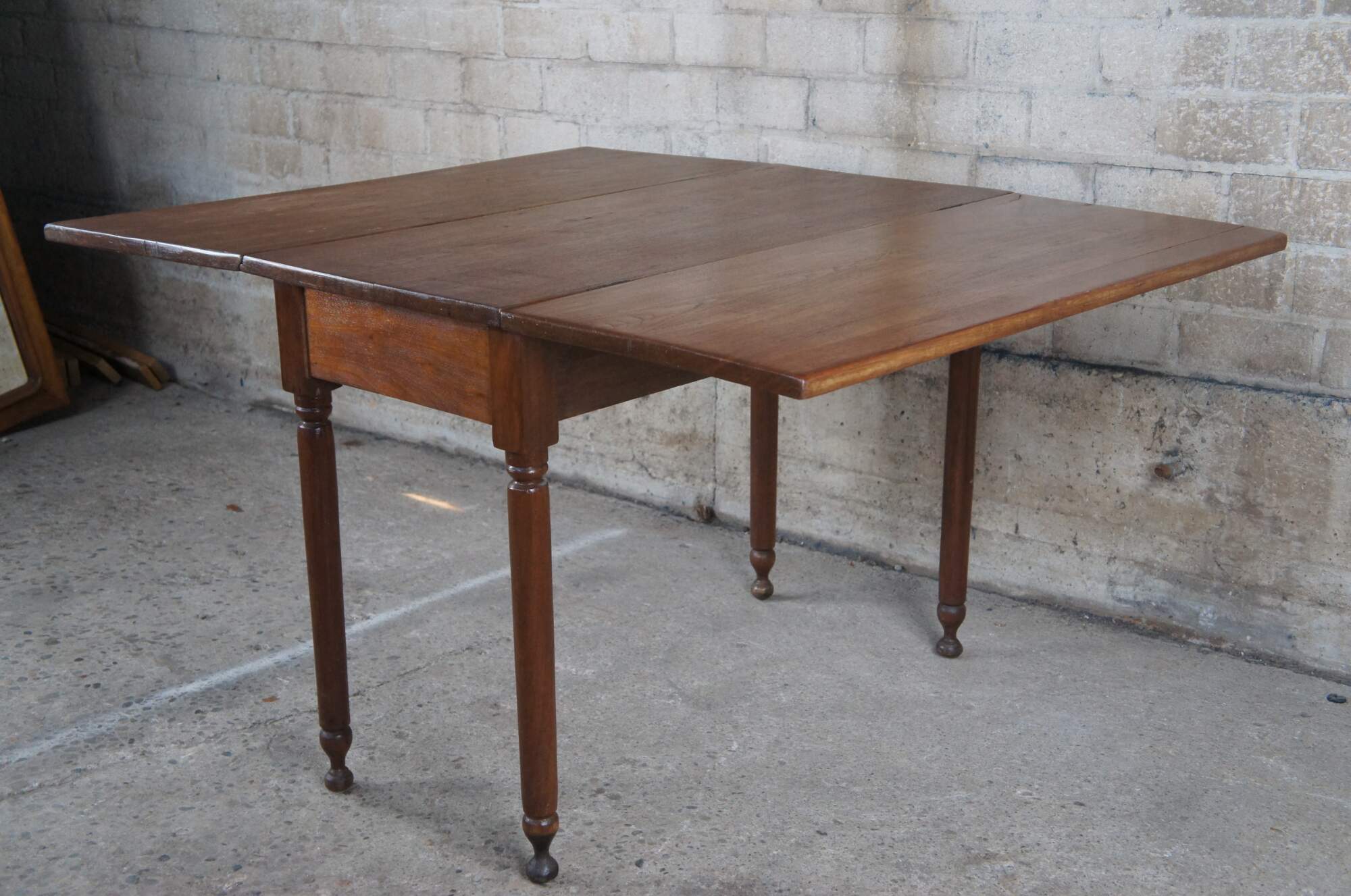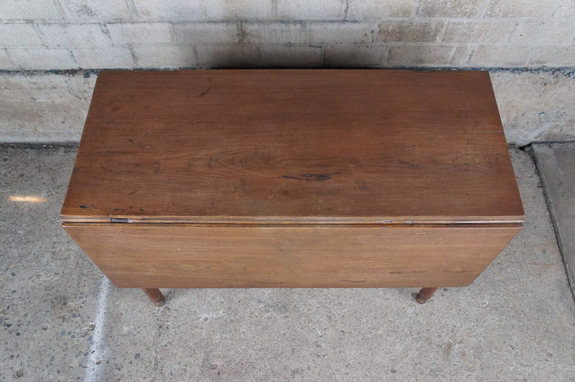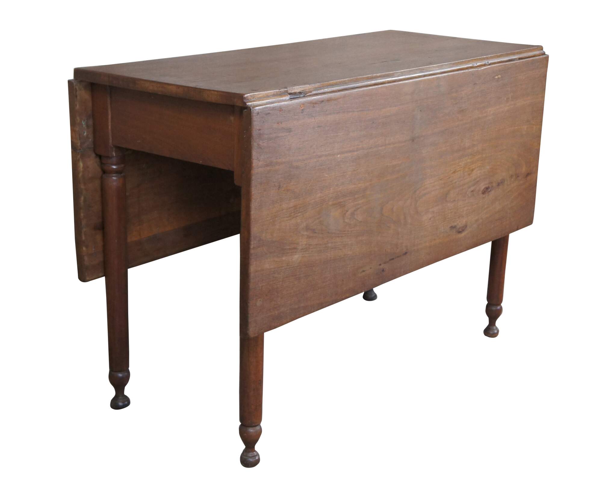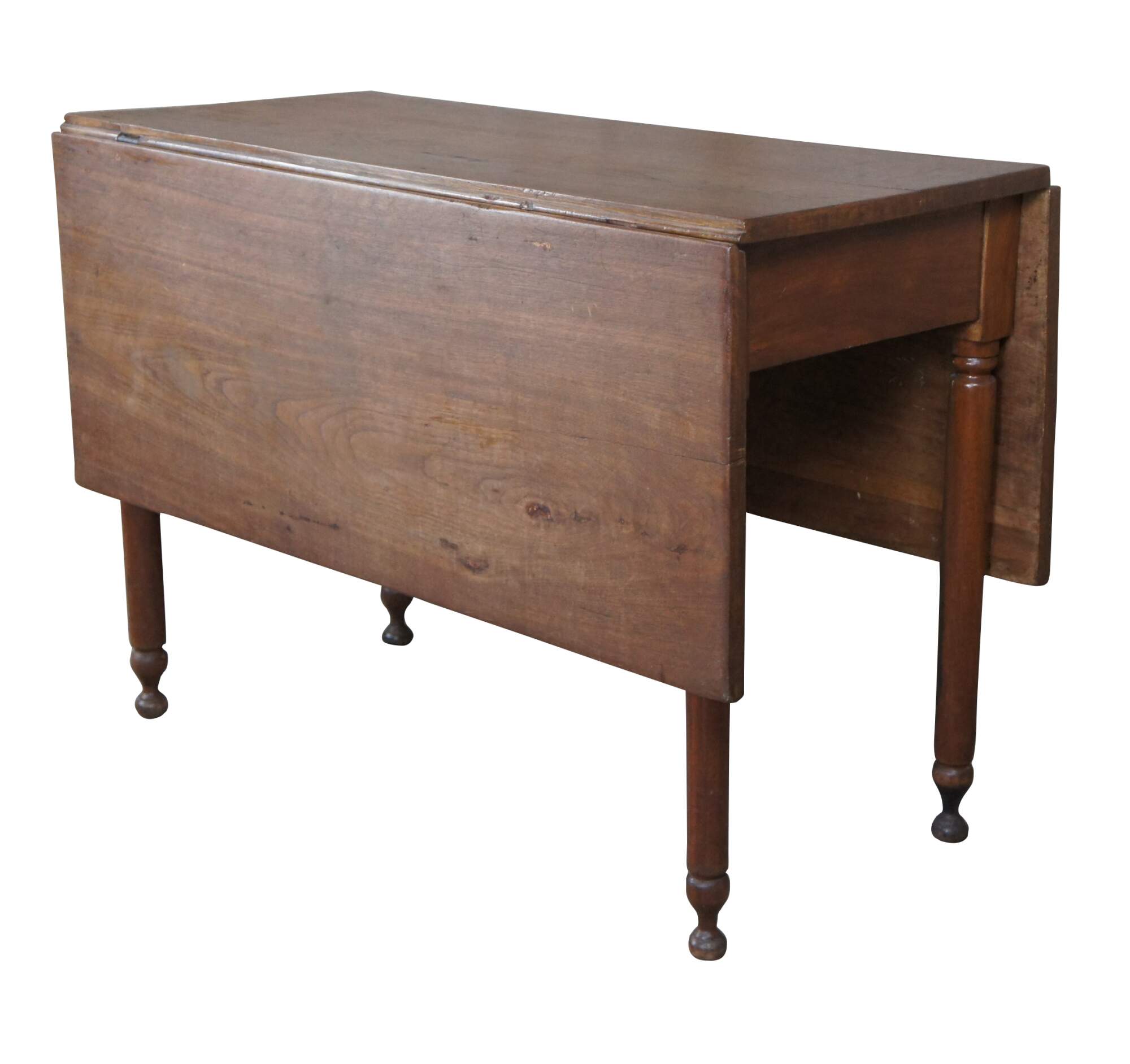 An antique 19th Century natural walnut drop leaf table. Features a rectangular form supported by turned legs leading to toupie feet. The leaves are held open by scissor support. Great for use as a breakfast or console table.