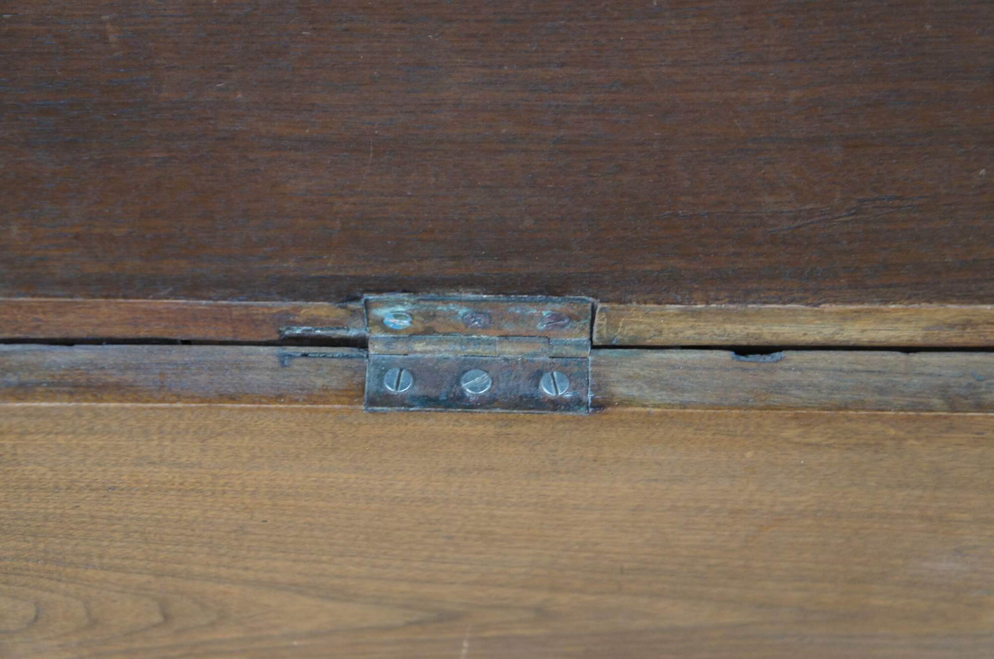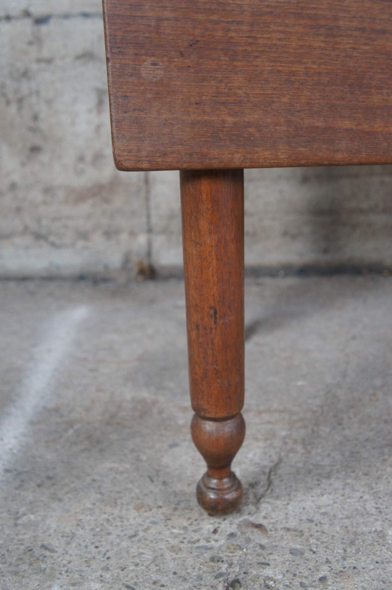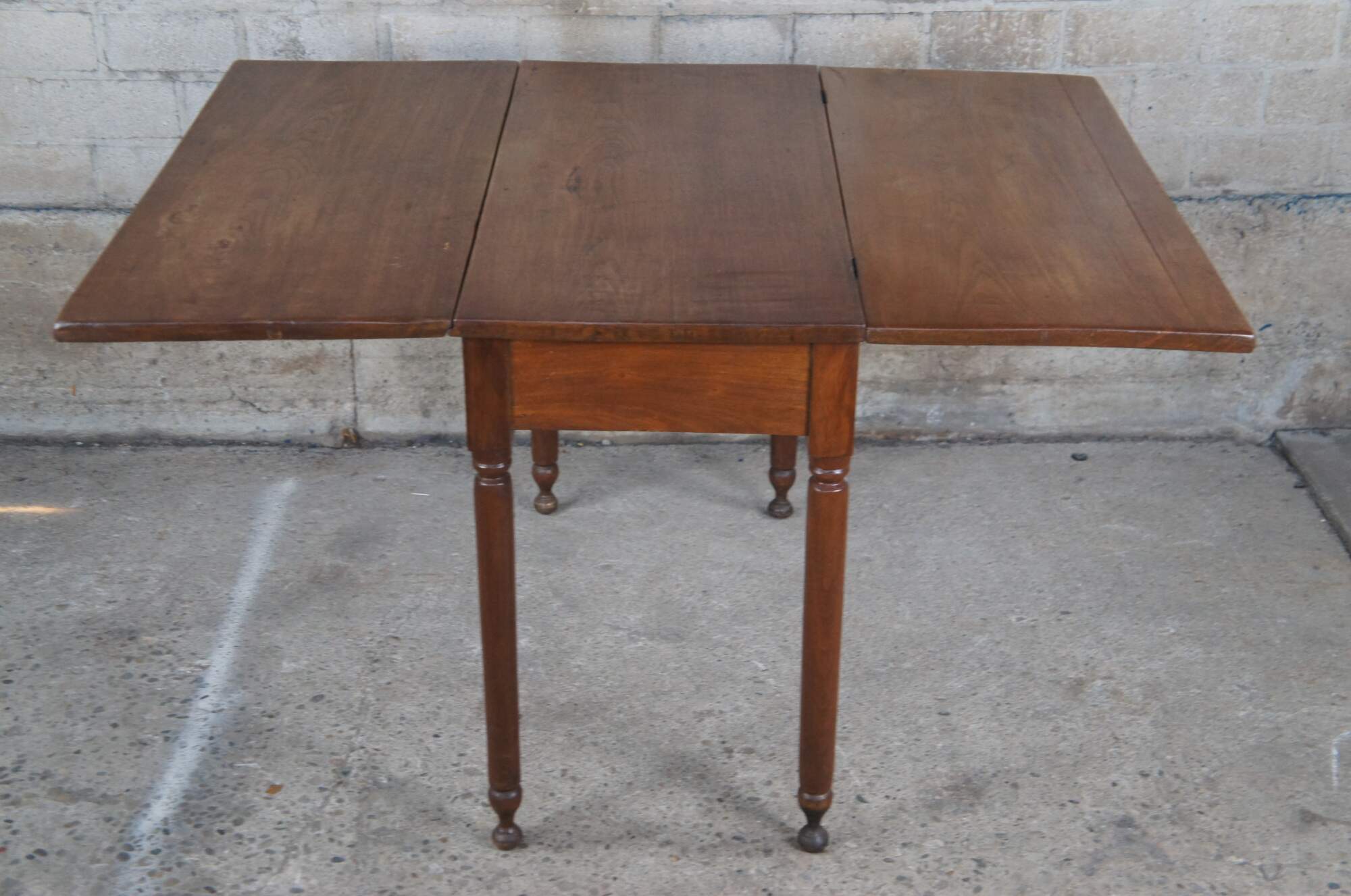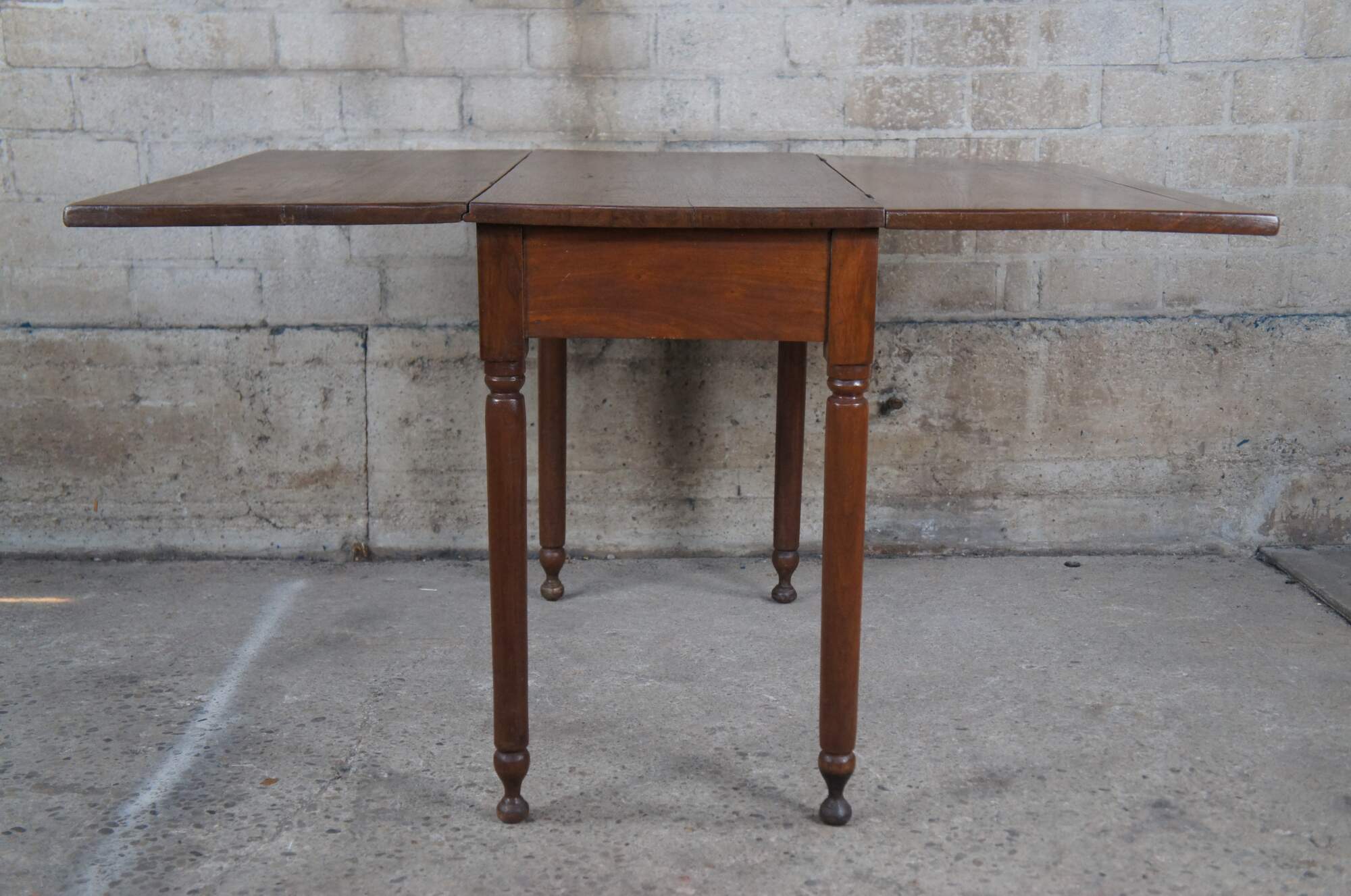An antique 19th Century natural walnut drop leaf table. Features a rectangular form supported by turned legs leading to toupie feet. The leaves are held open by scissor support. Great for use as a breakfast or console table.