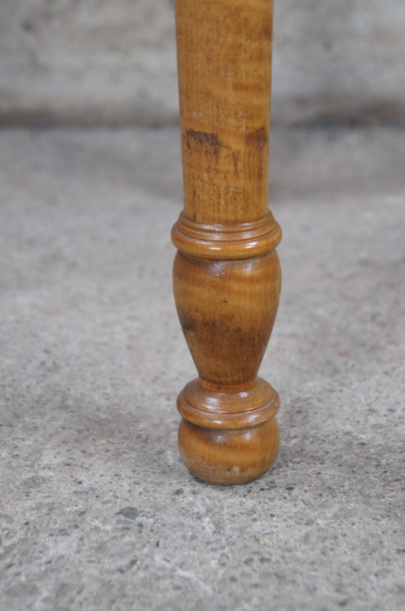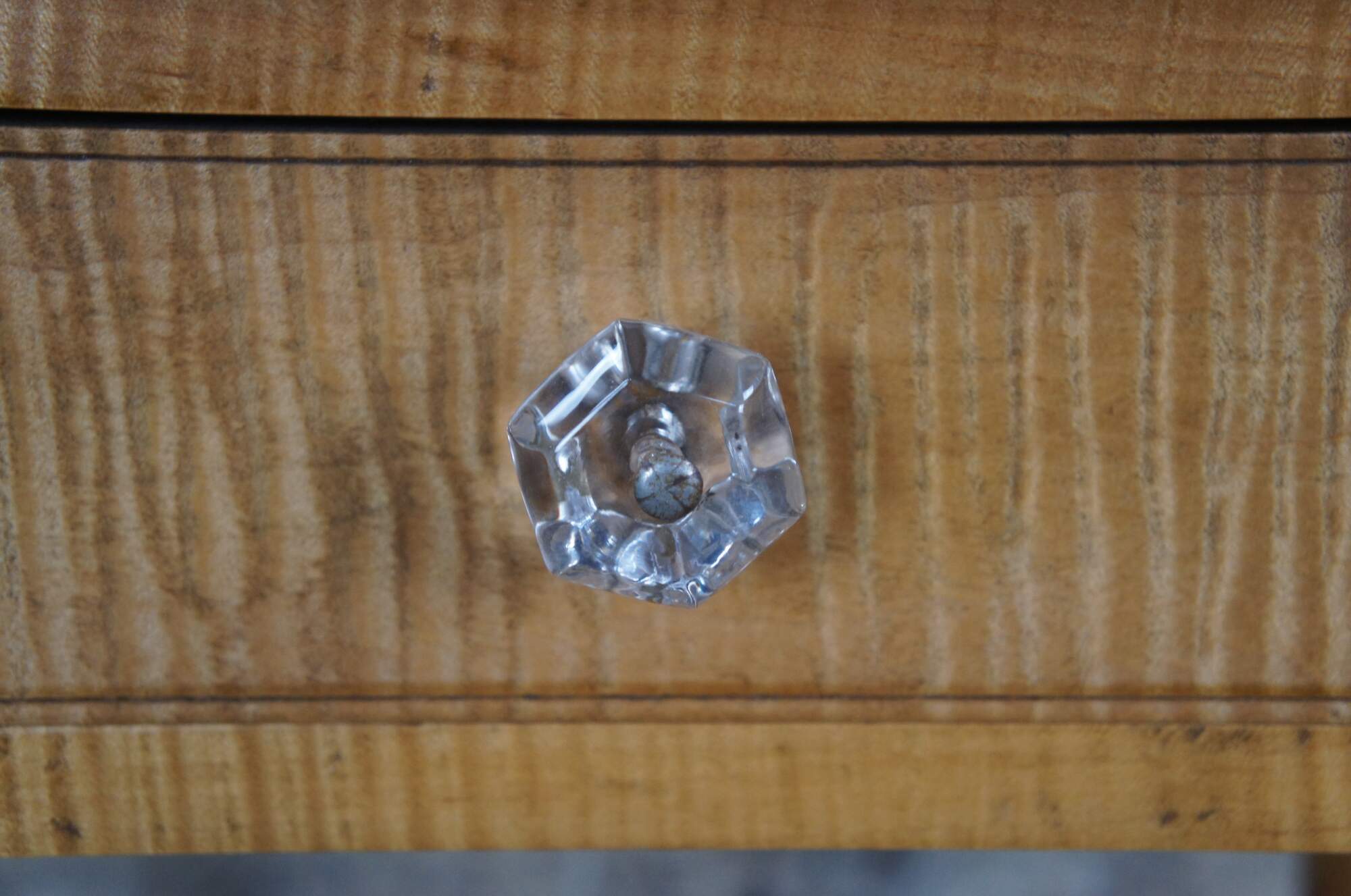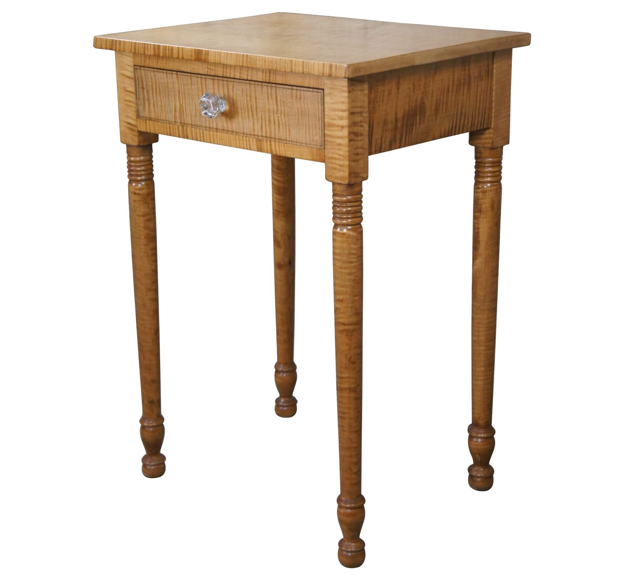 Early American curly maple side table with drawer. Features turned ribbed legs leading to toupie feet and a hand dovetailed drawer with glass faceted knob.