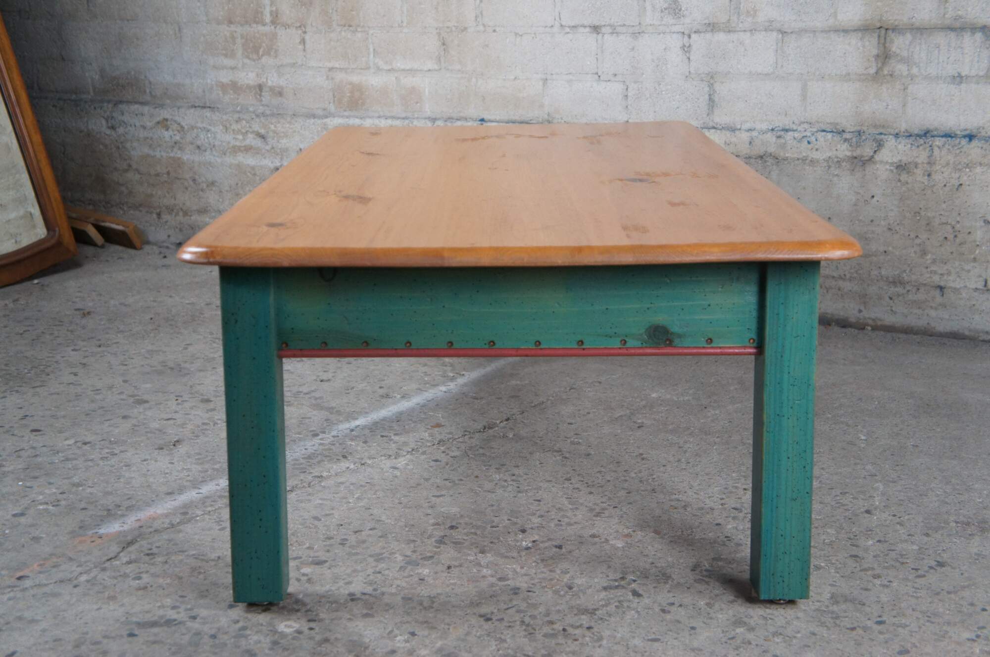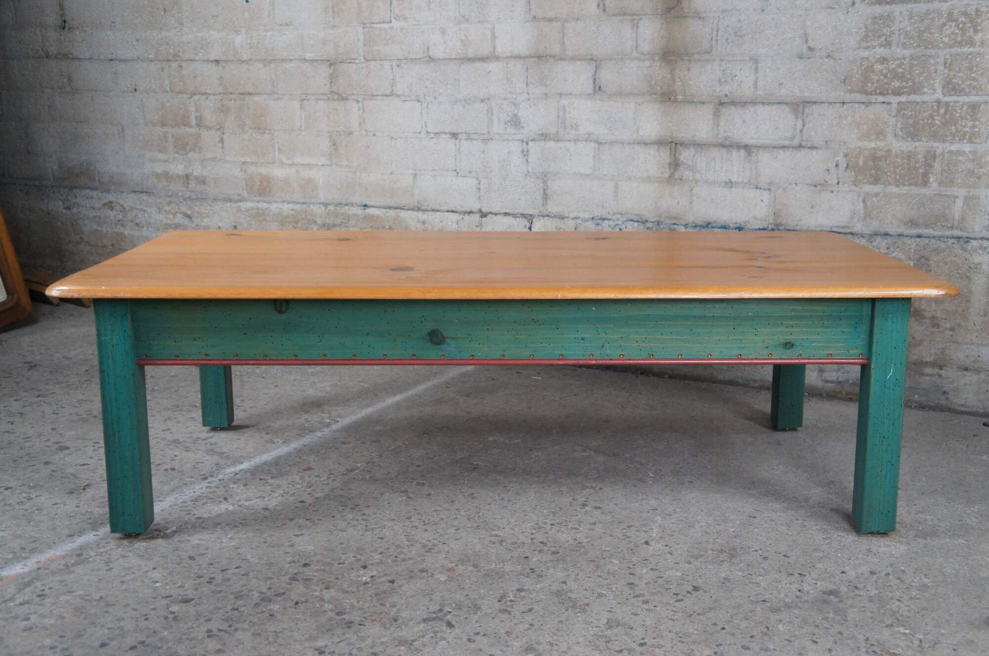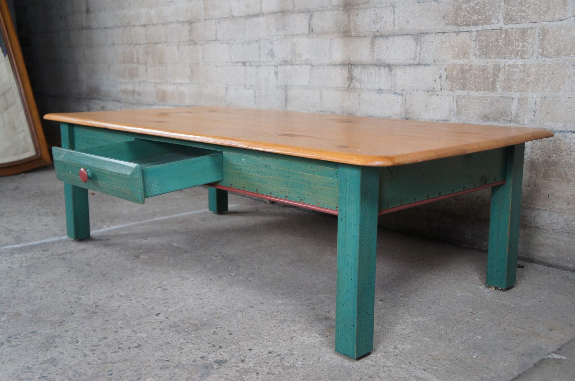 American Country farmhouse one drawer coffee or cocktail table, circa last quarter 20th century. Made from pine with a green and red painted finish. Features mortise and tenon joinery. Signed along the underside, JP & NG, TX HA