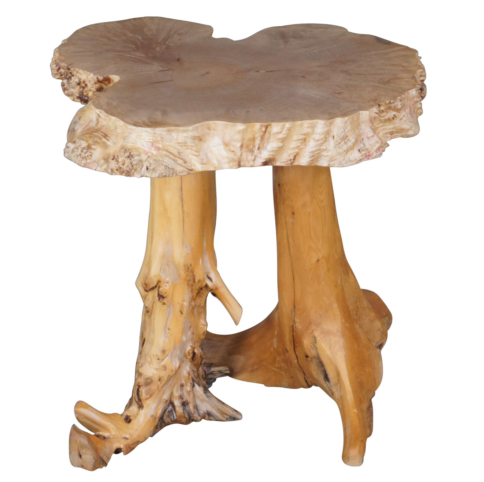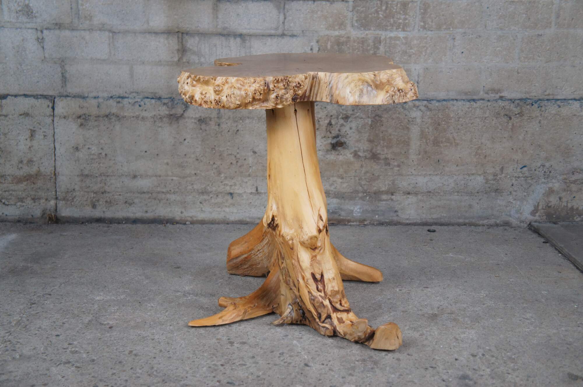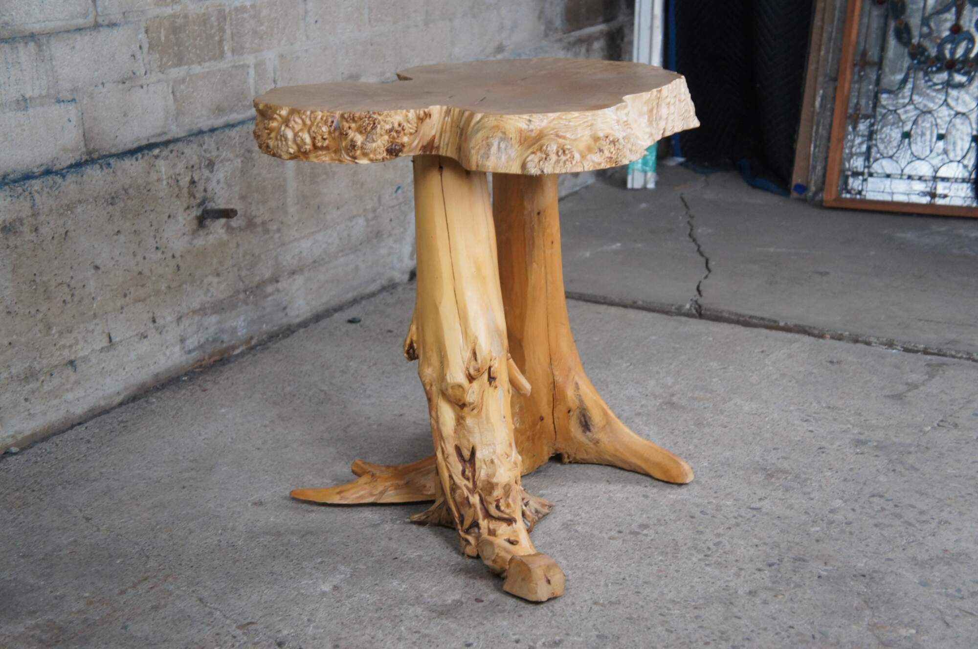 An impressive farmhouse or lodge side table. Features an Maple Burl live edge slab top over branched base. Great for use next to your favorite lounge chair as a cocktail or martini end table.