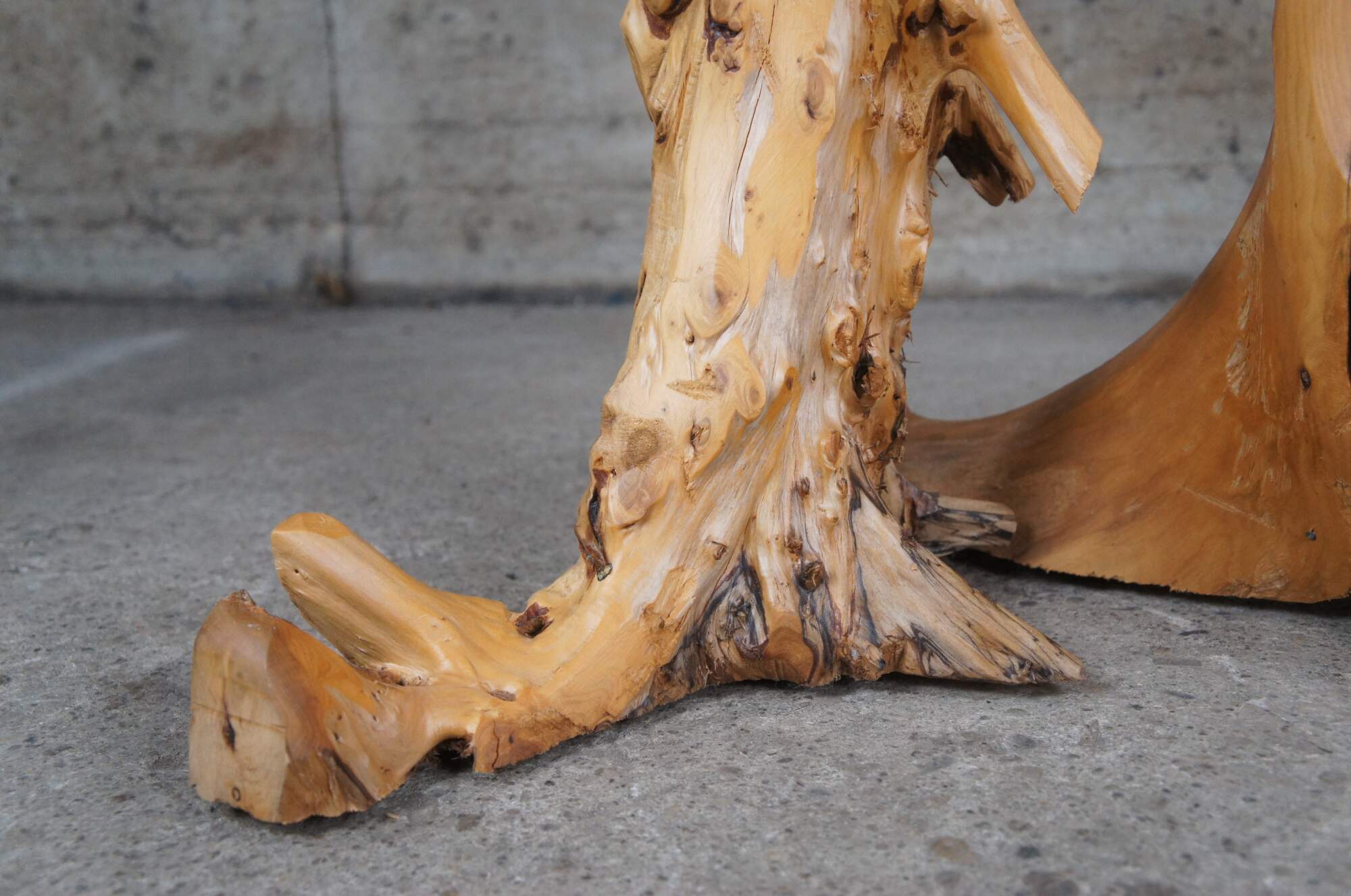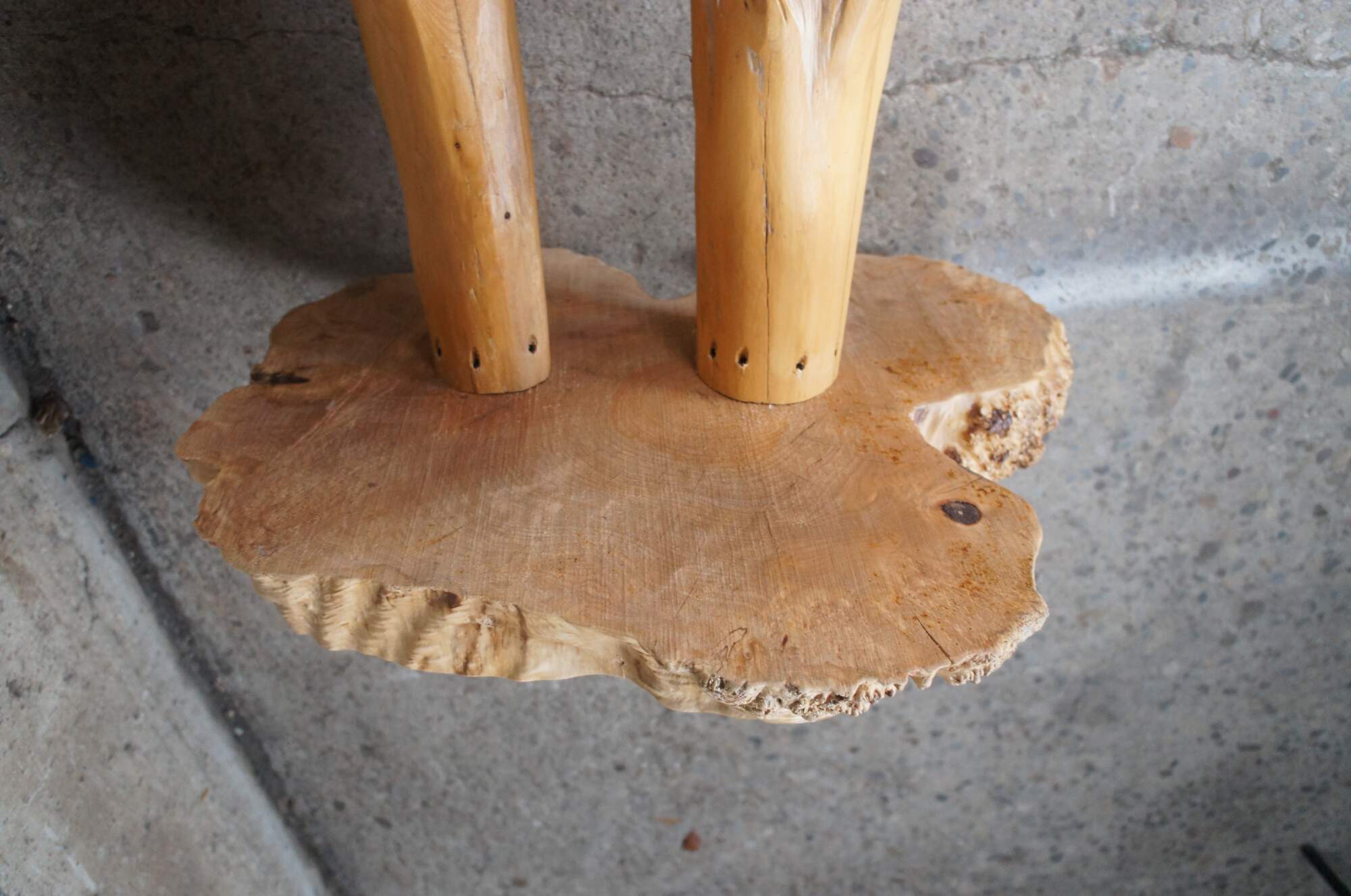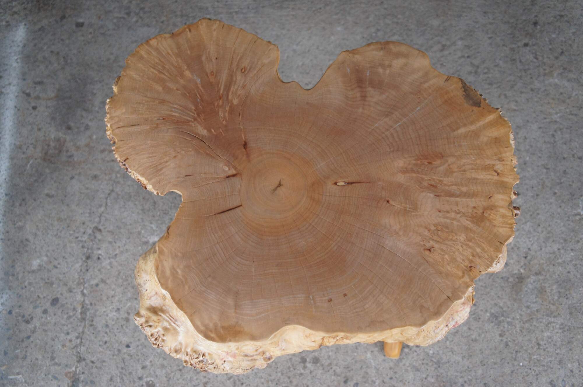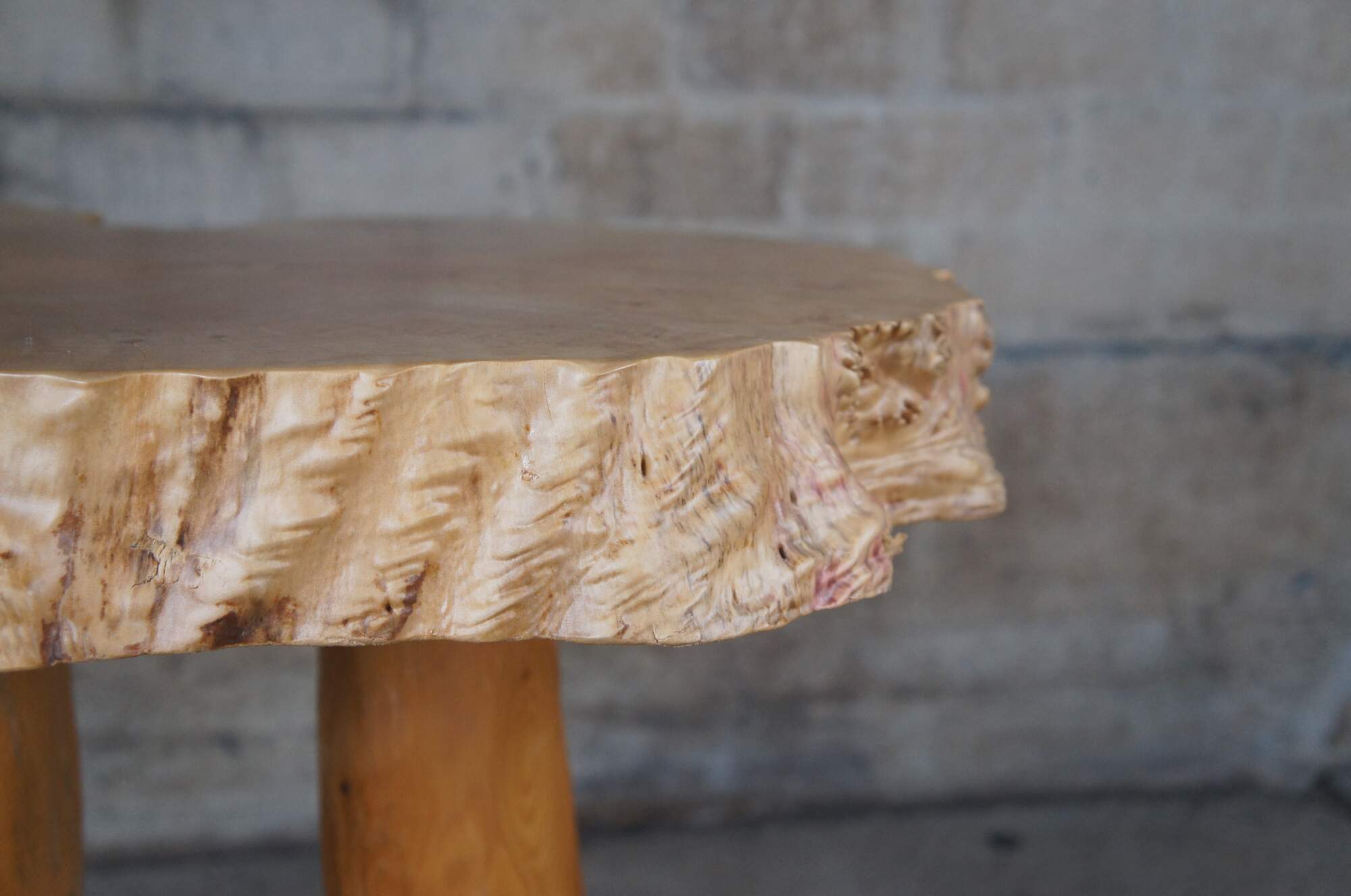 An impressive farmhouse or lodge side table. Features an Maple Burl live edge slab top over branched base. Great for use next to your favorite lounge chair as a cocktail or martini end table.