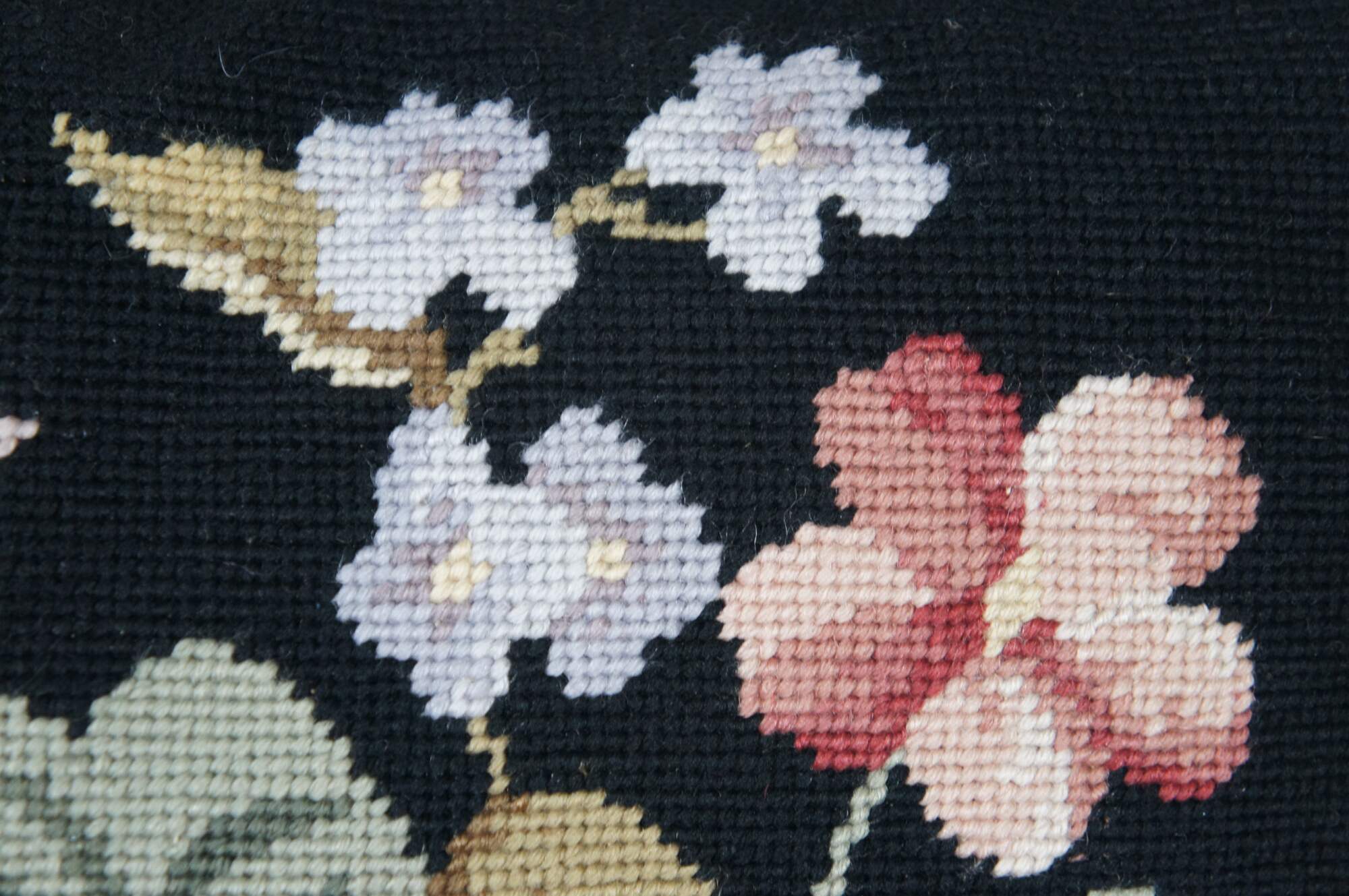 Vintage needlepoint / embroidered throw pillow featuring an array of flowers on a black background, with a black velvet back and fiber filled pillow form / insert. Zipper closure. Hand stitched but at least one other pillow with matching design / pattern found online.