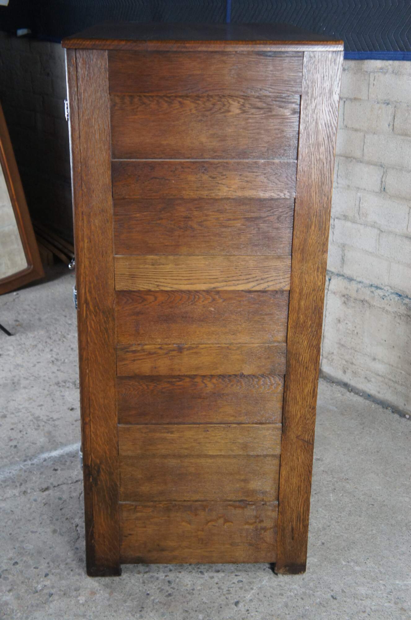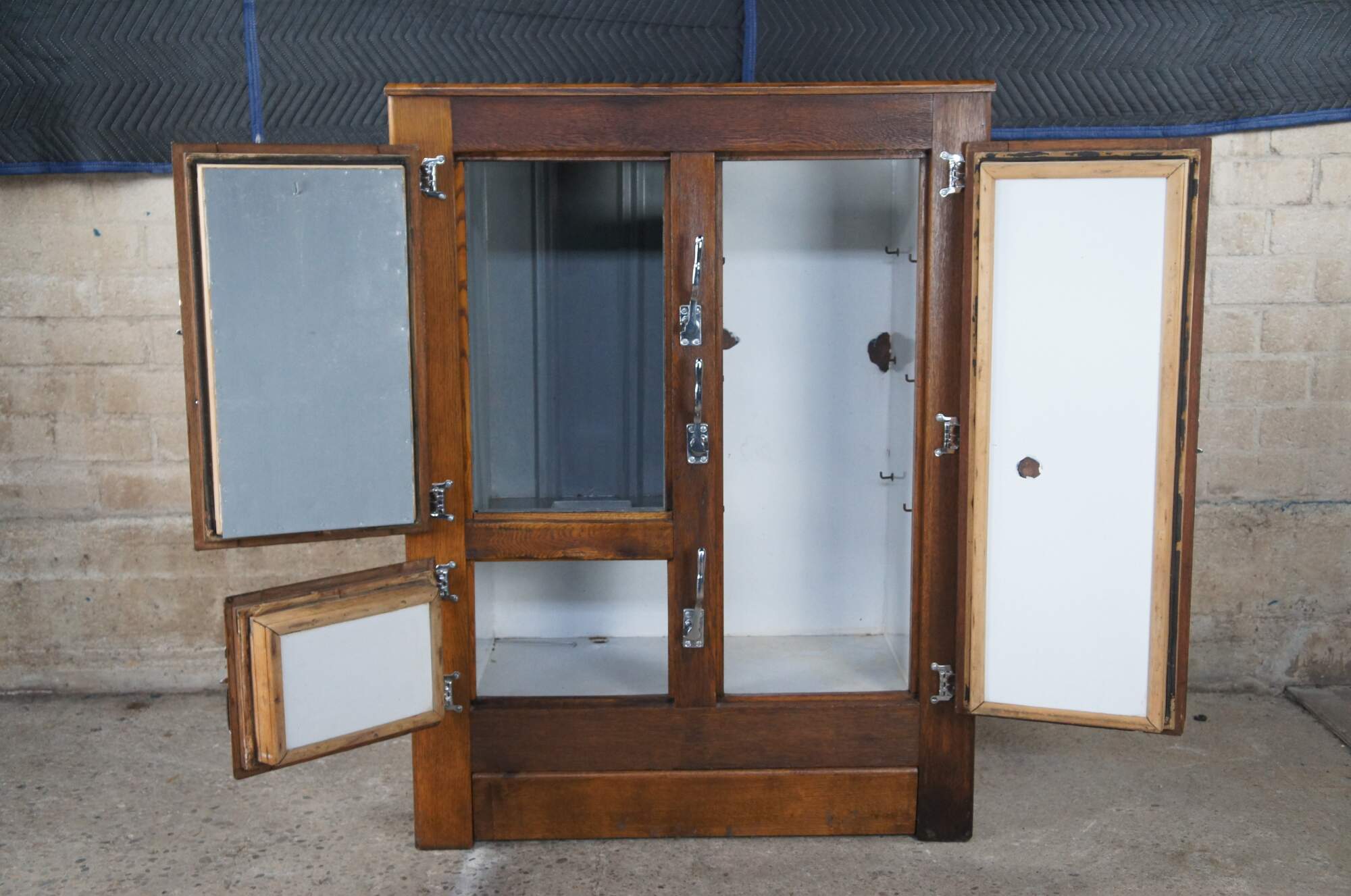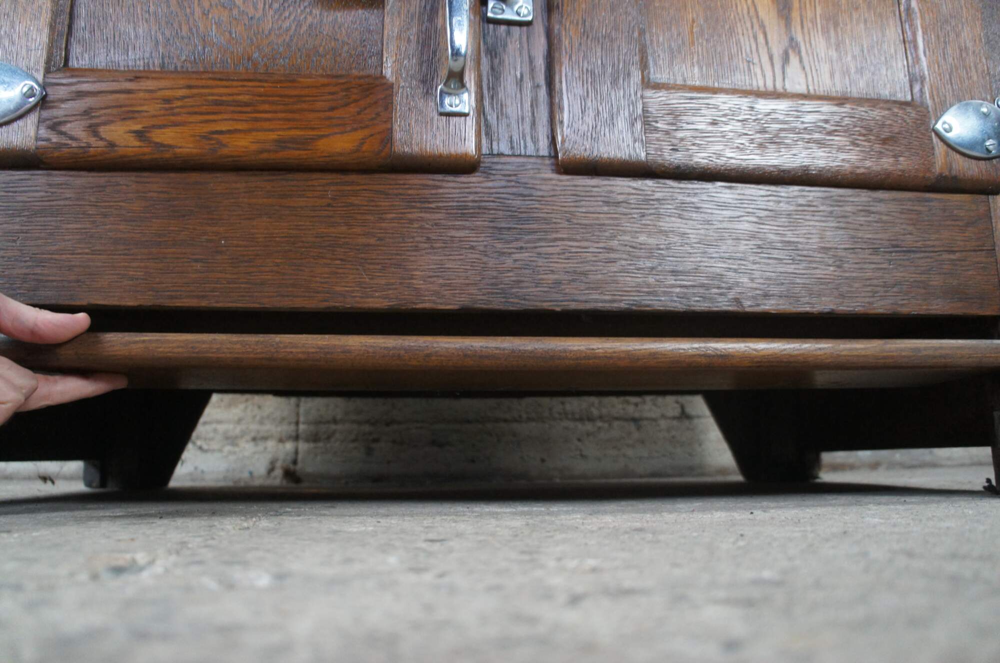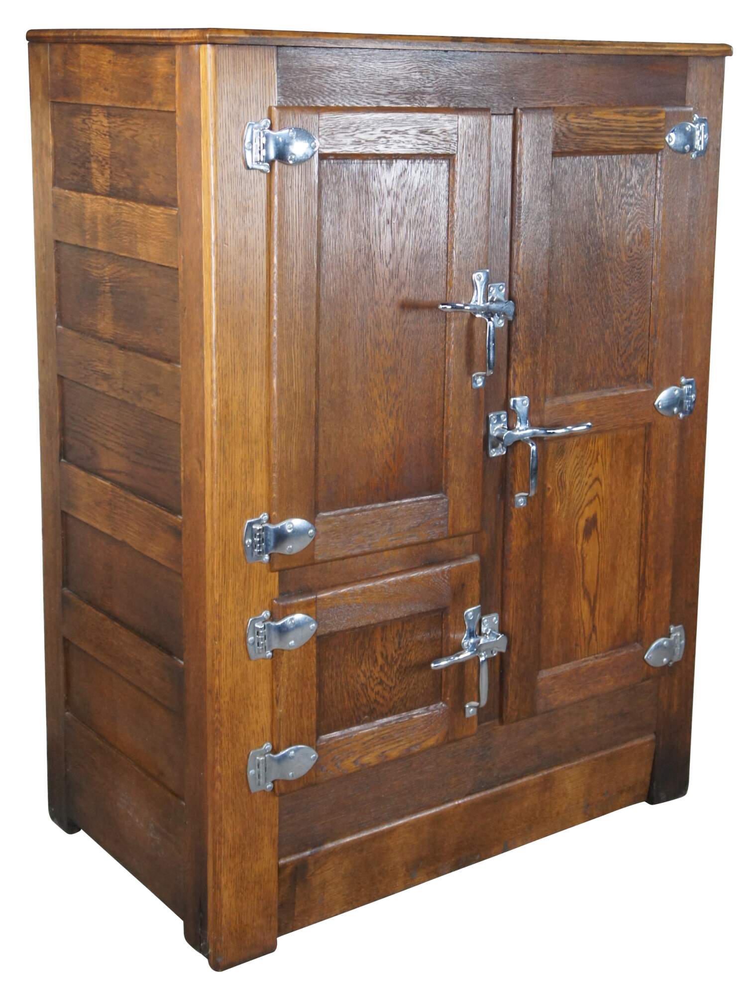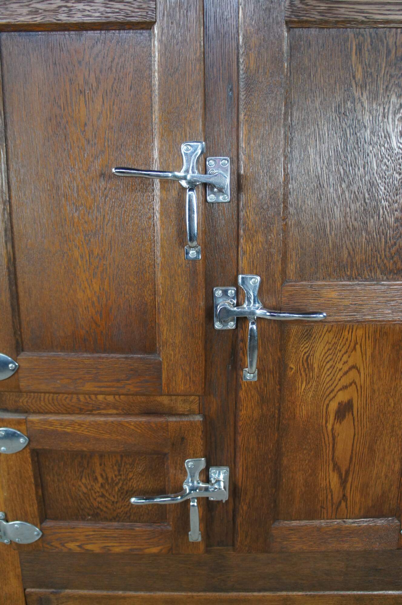 A beautiful early 1900s Ice Chest. Made oak with a stout rectangular frame featuring three doors, original chrome hardware and paneled sides.