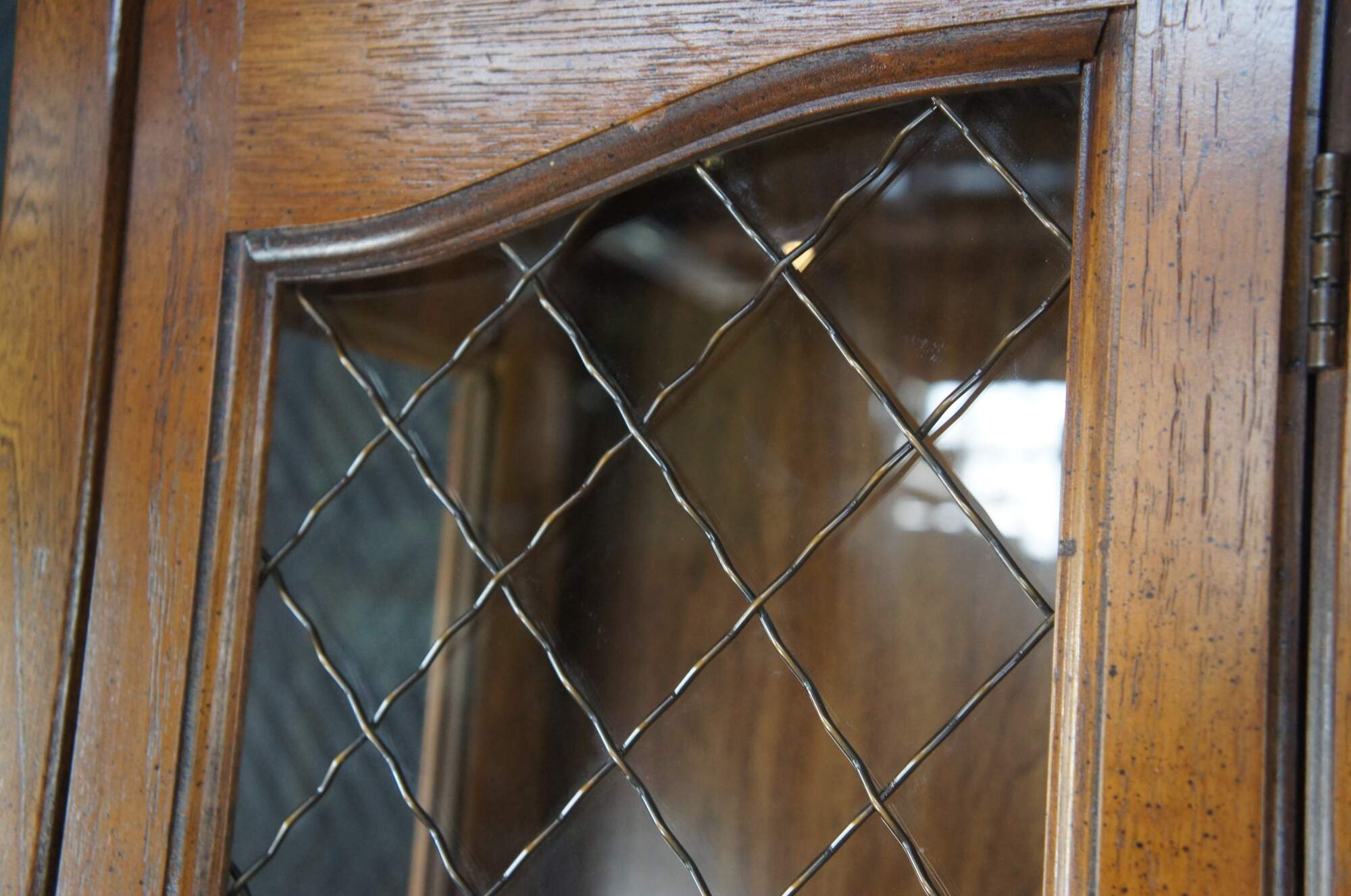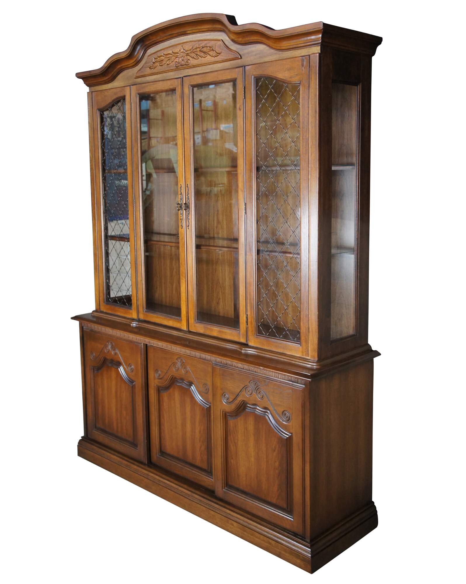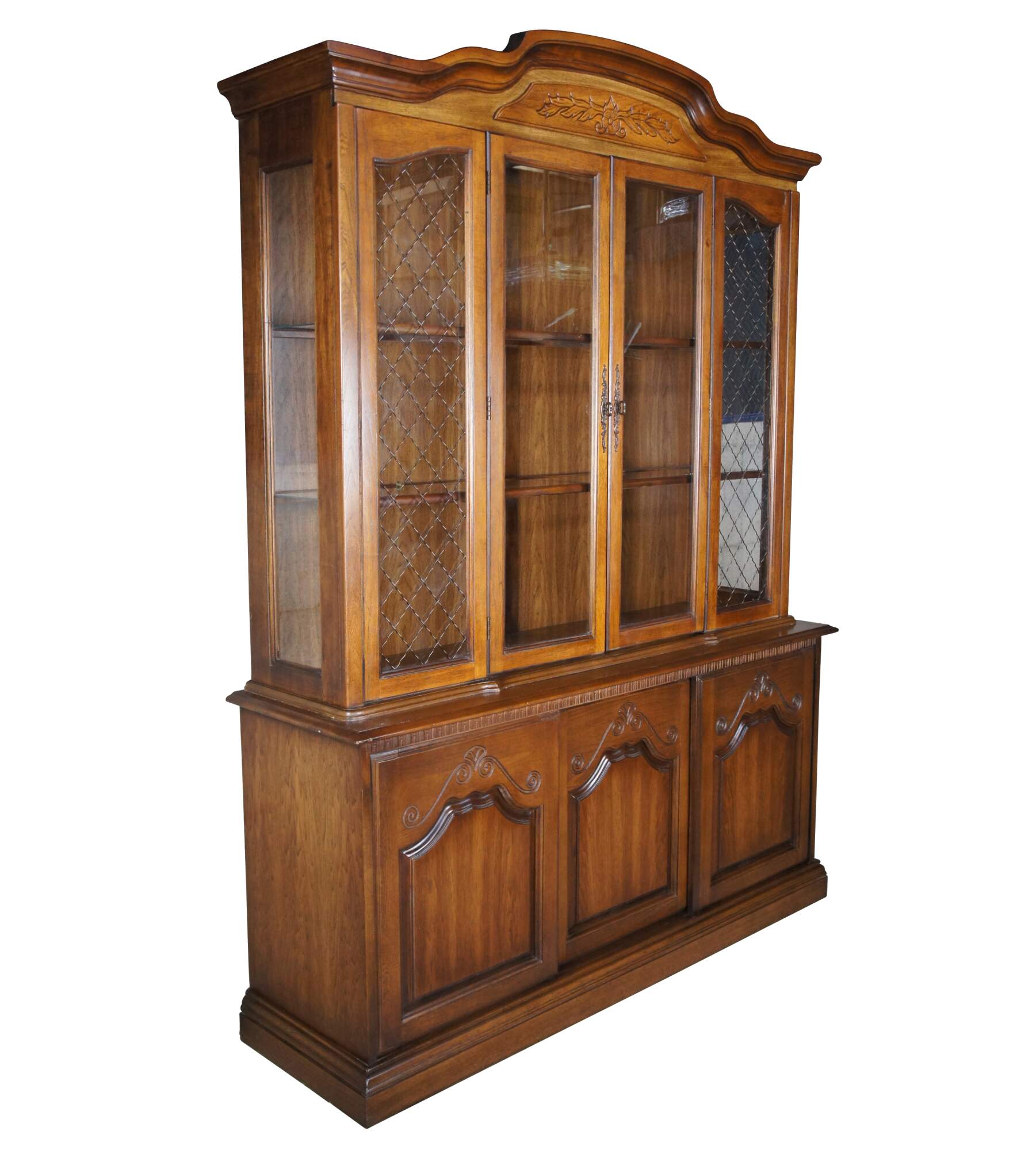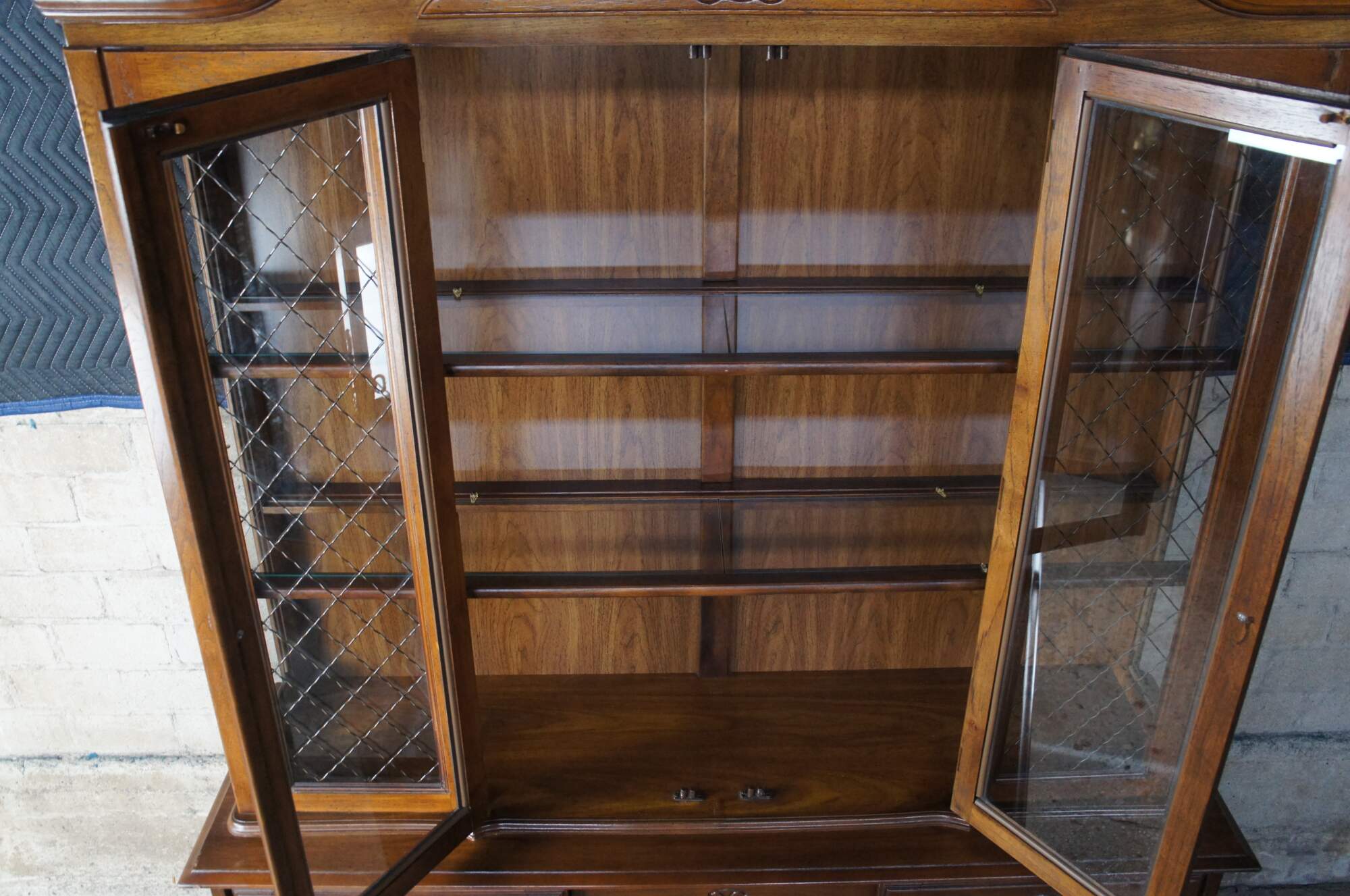 Mid 20th century credenza and hutch. Made from oak with a glass display portion featuring two wooden shelves with glass inserts and outer lattice covering over the doors. Features open sides allowing for more depth and light. The base features sliding doors with paneled molding and scrolled accents. Crown is serpentine with leafy carved accents around a central medallion.