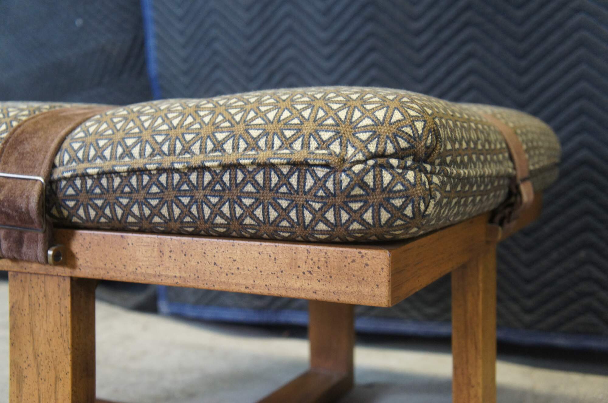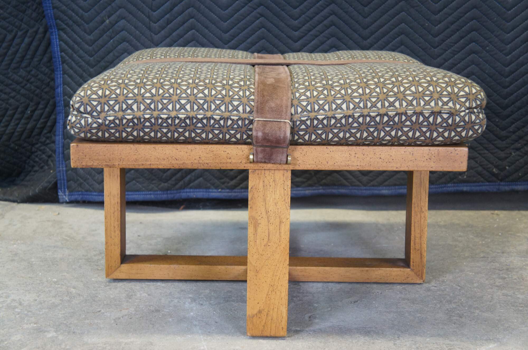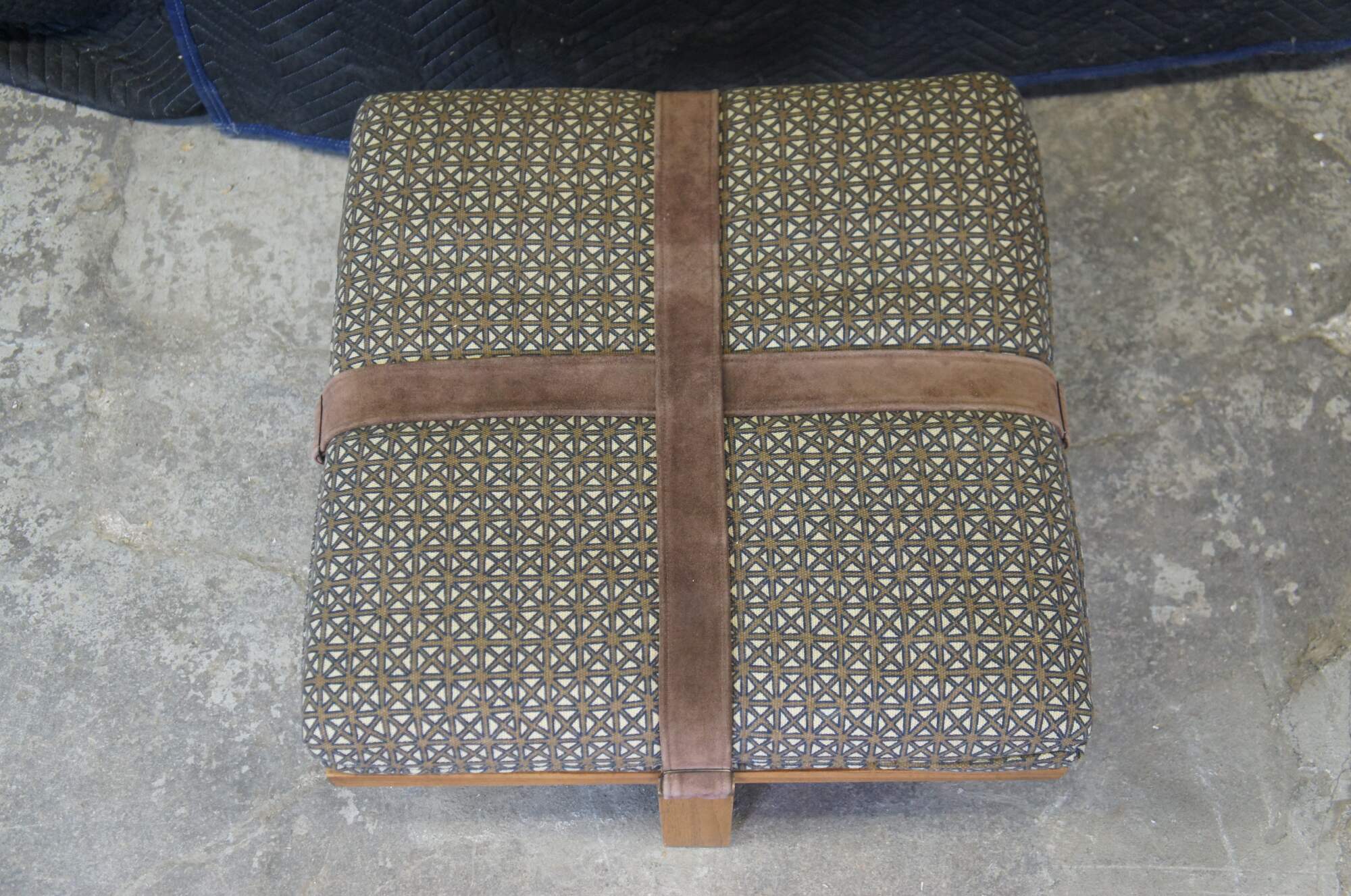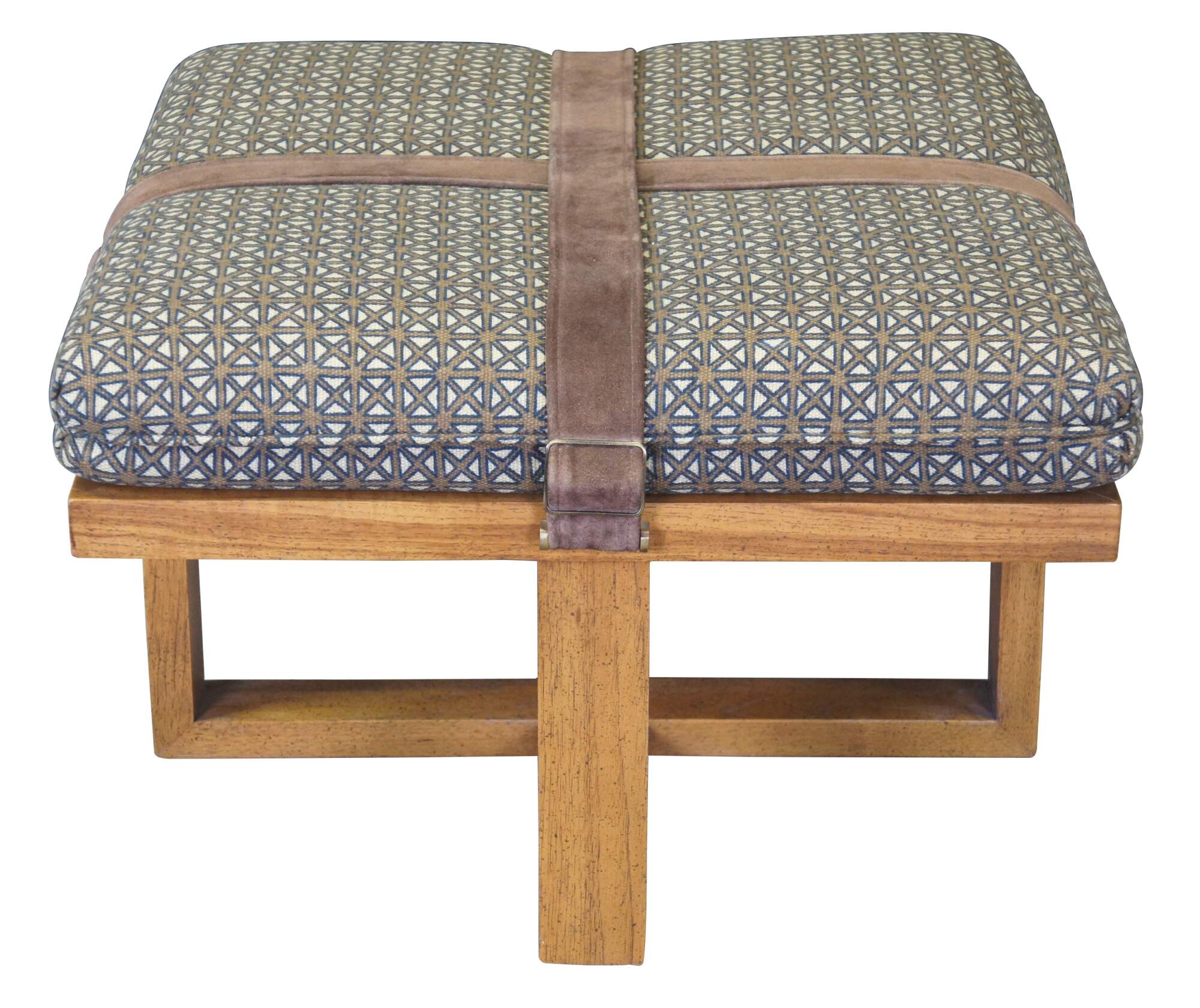 Late 20th century square ottoman with open wood base and a cushioned top finished in blue and brown lattice pattern upholstery and crossed with suede leather straps.