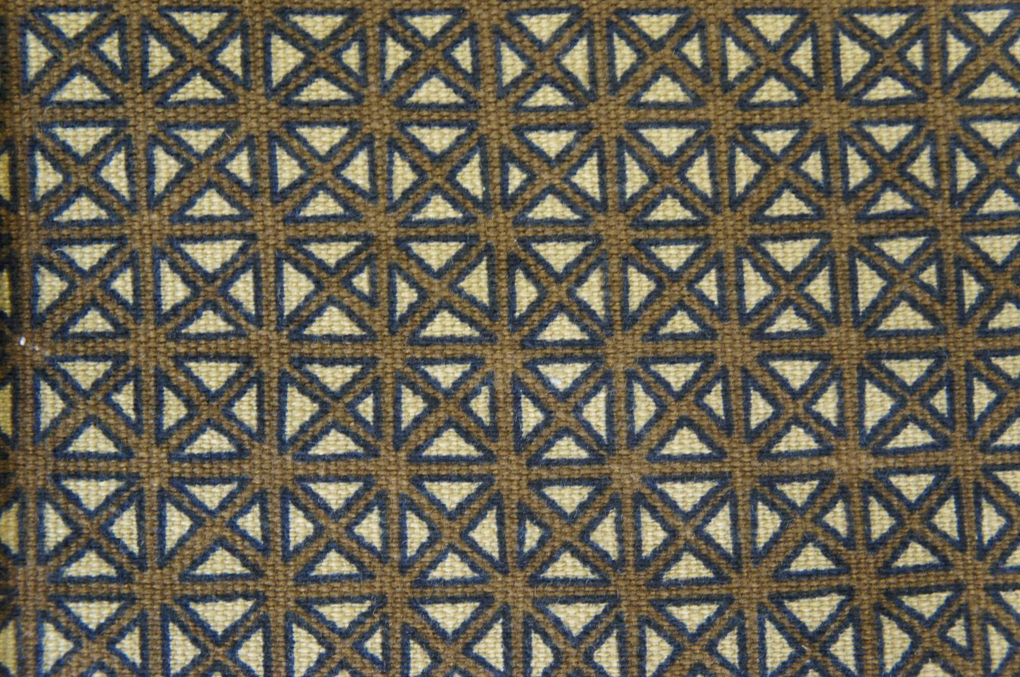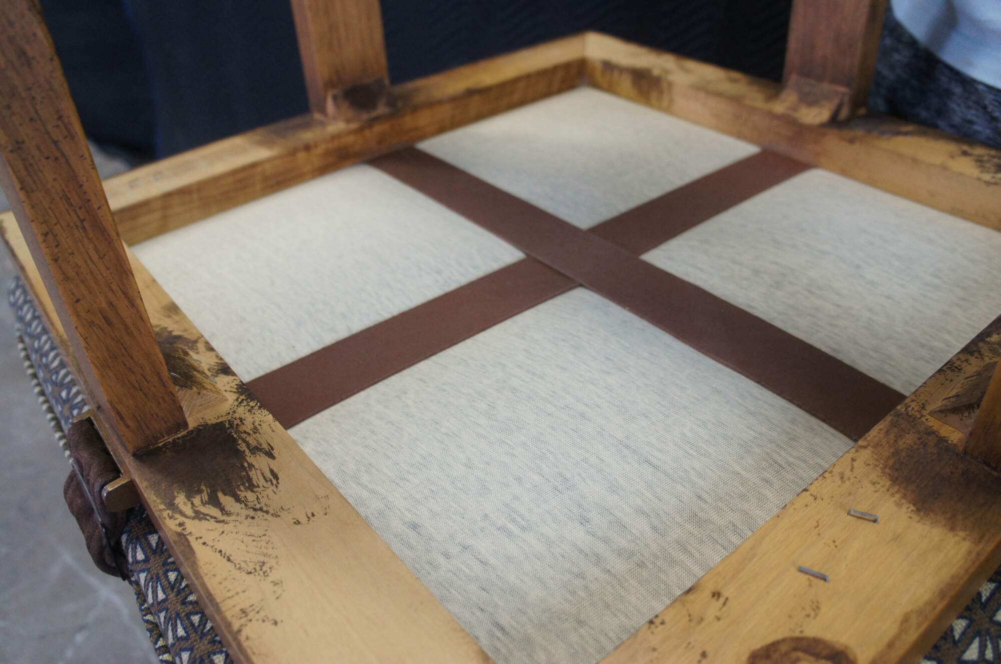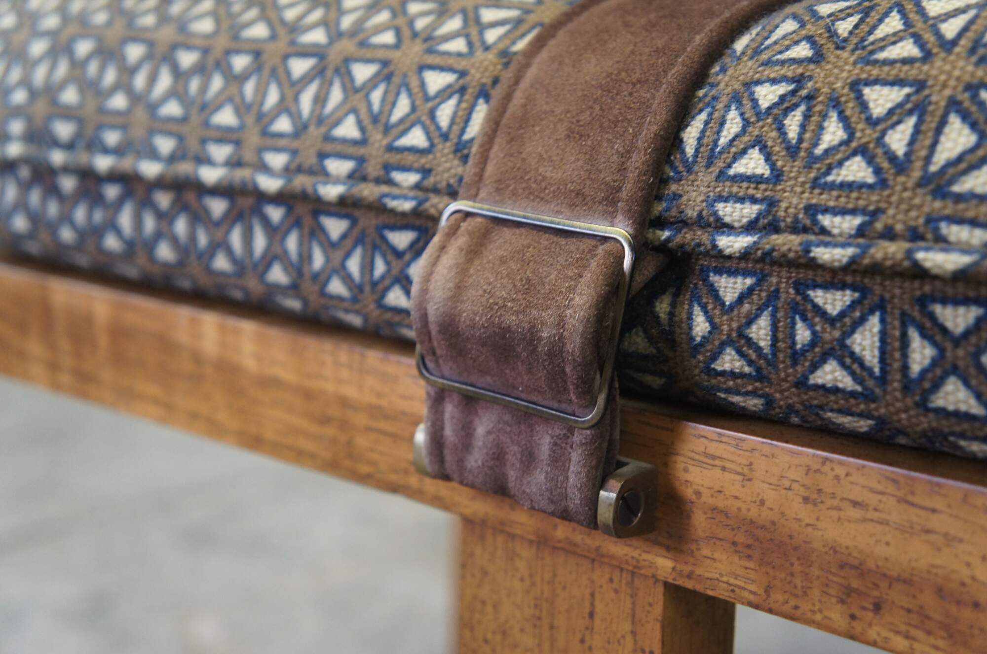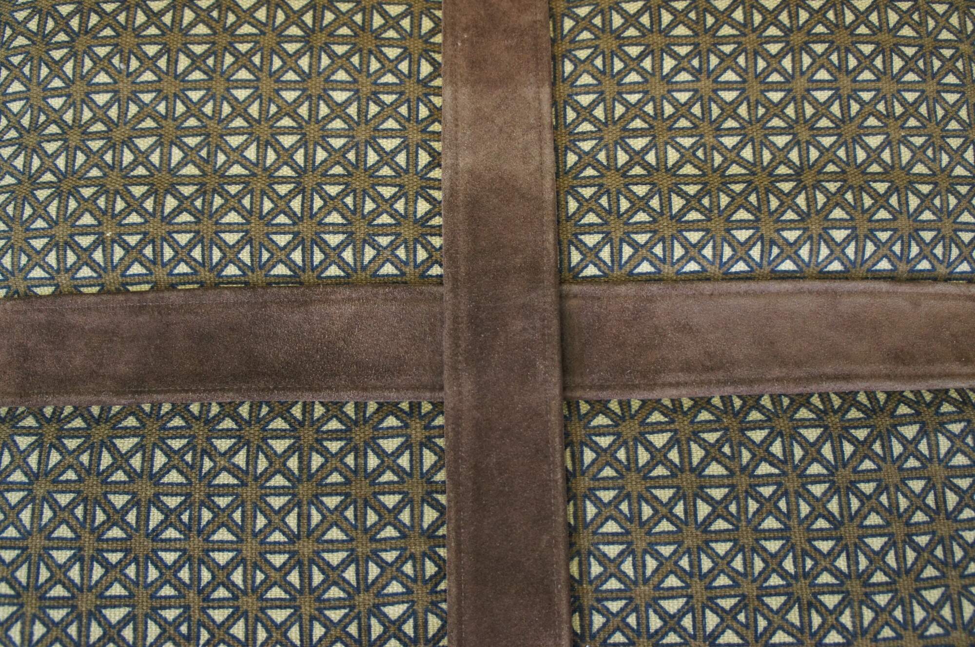 Late 20th century square ottoman with open wood base and a cushioned top finished in blue and brown lattice pattern upholstery and crossed with suede leather straps.