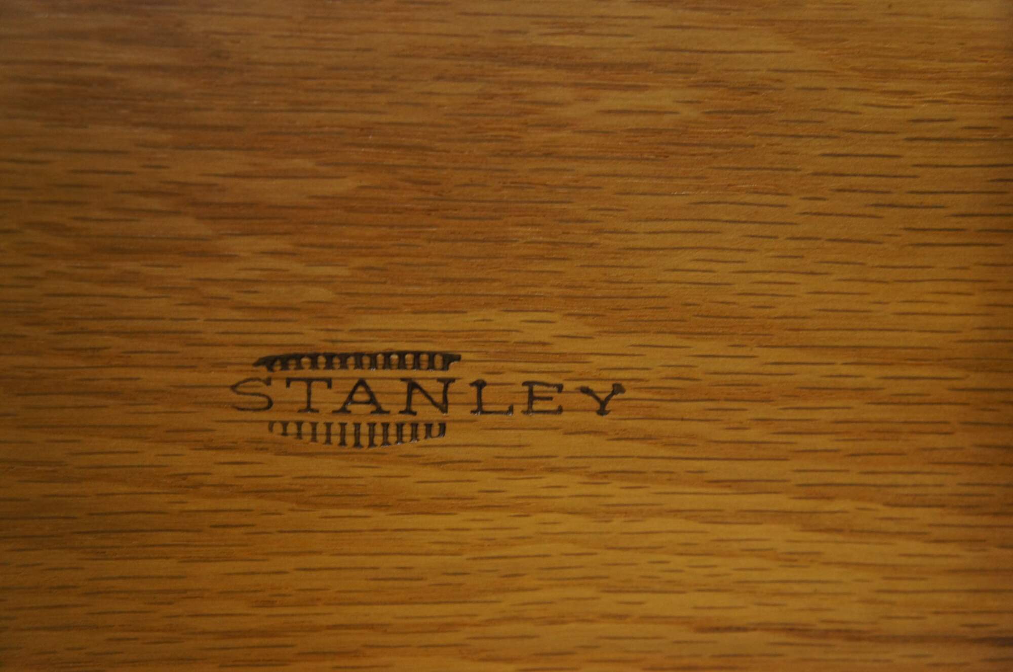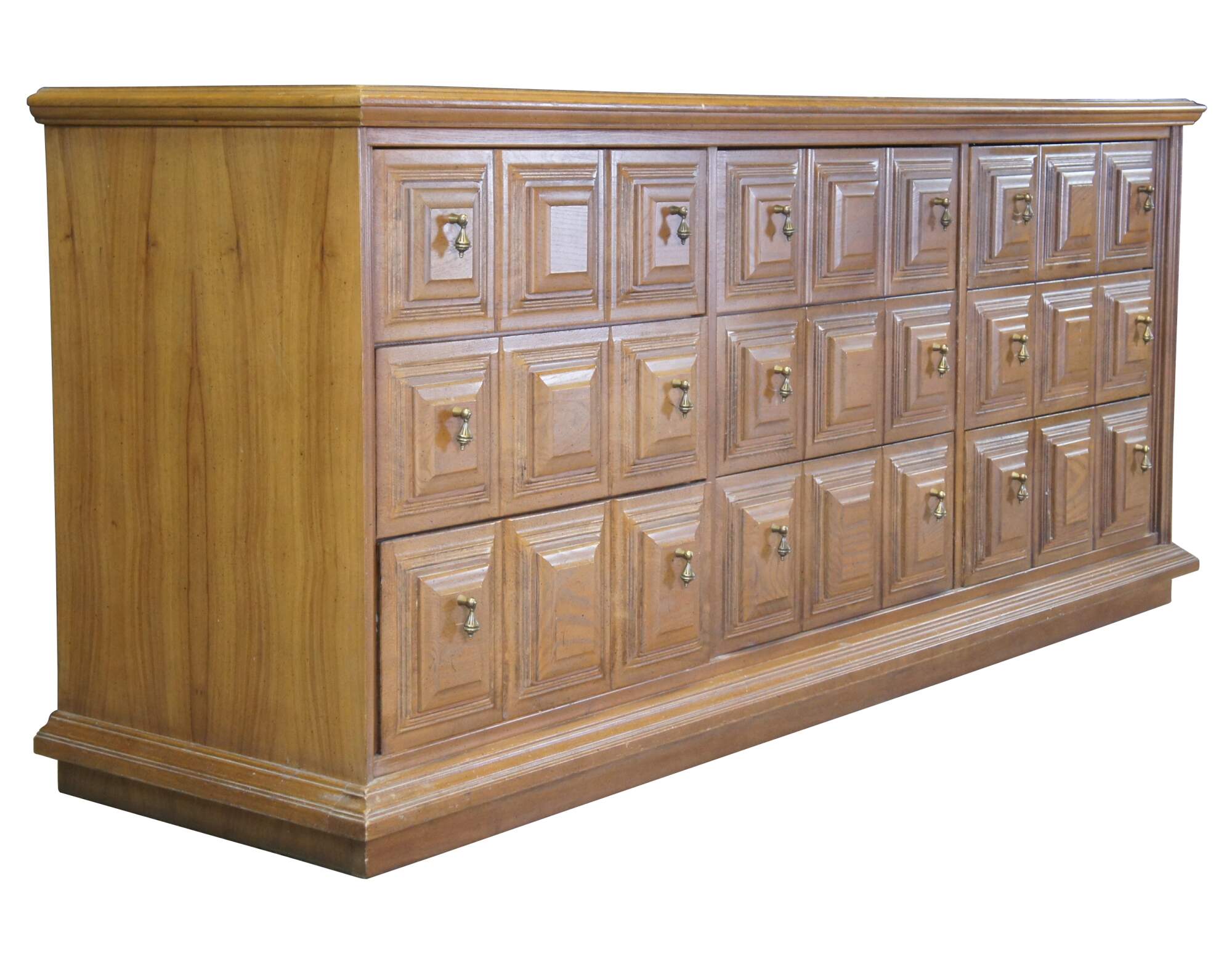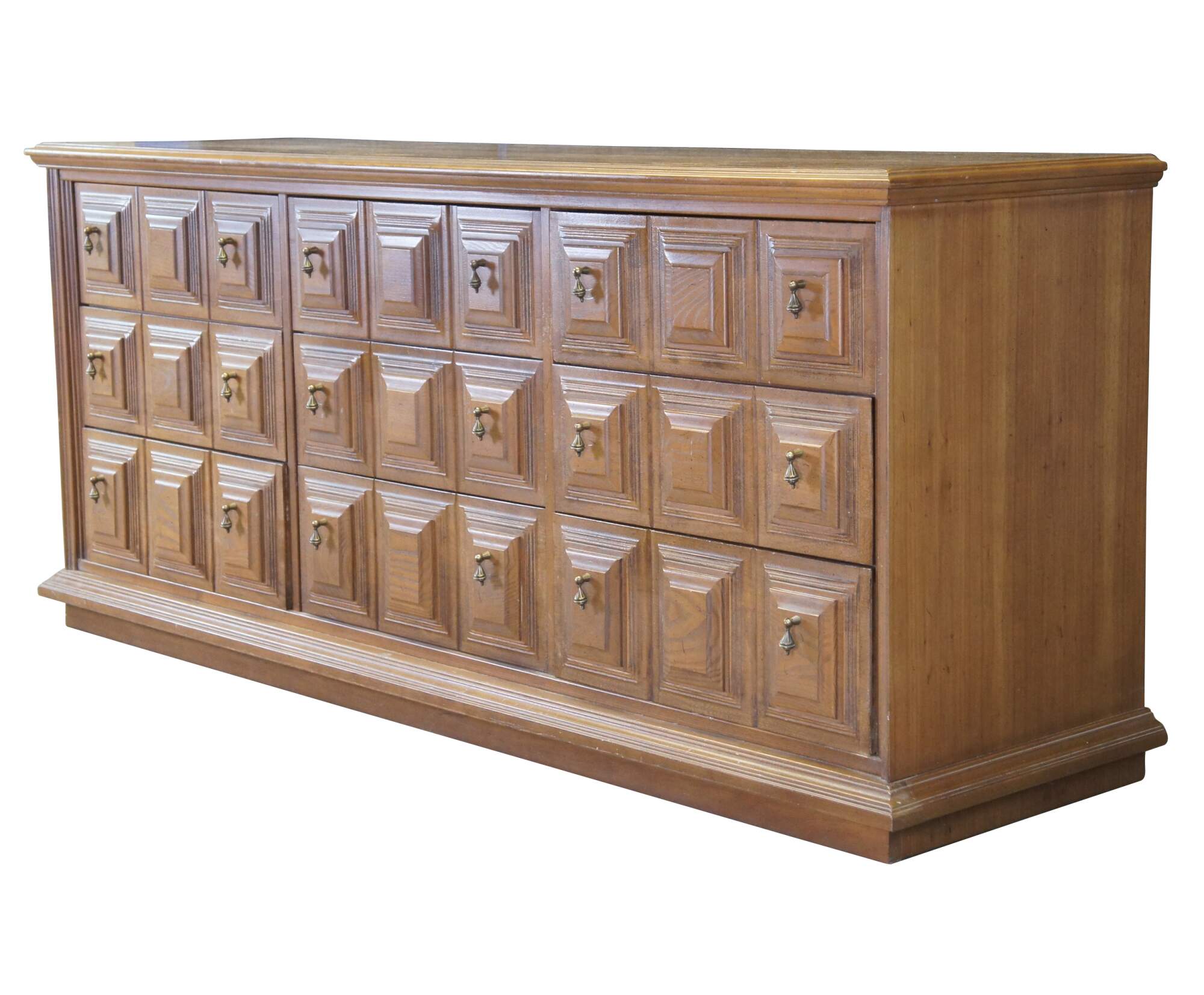 Stanley Furniture mid century paneled oak nine drawer dresser. Features a blend of Italian Provincial and Brutalist styling. The long rectangular case has nine dovetailed drawers with raised square paneling and brass knocker drawer pulls. Great for use as a credenza or console. Marked 48005, 66-812