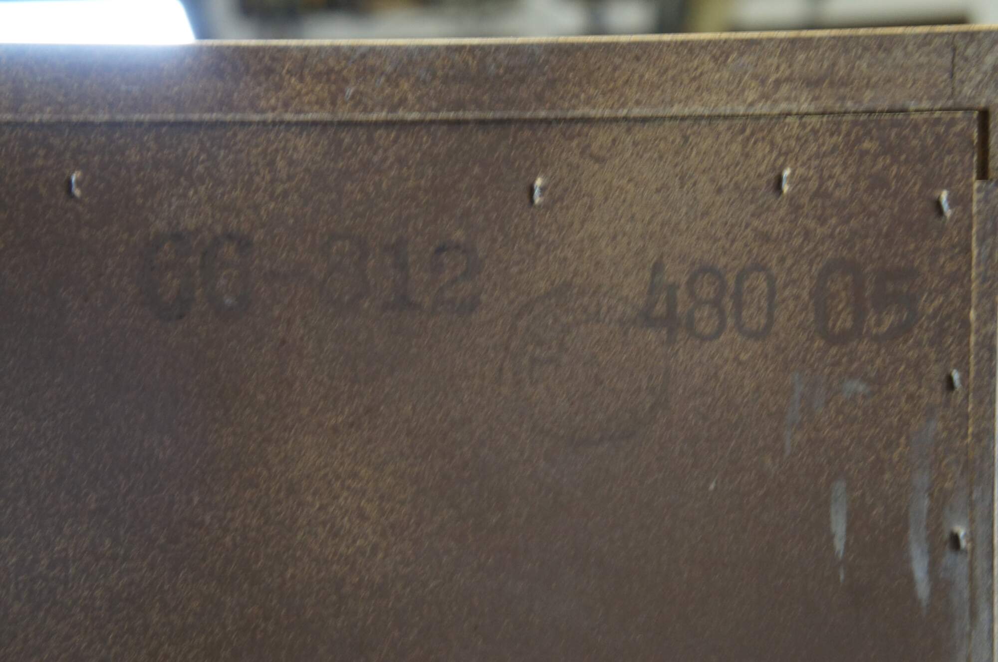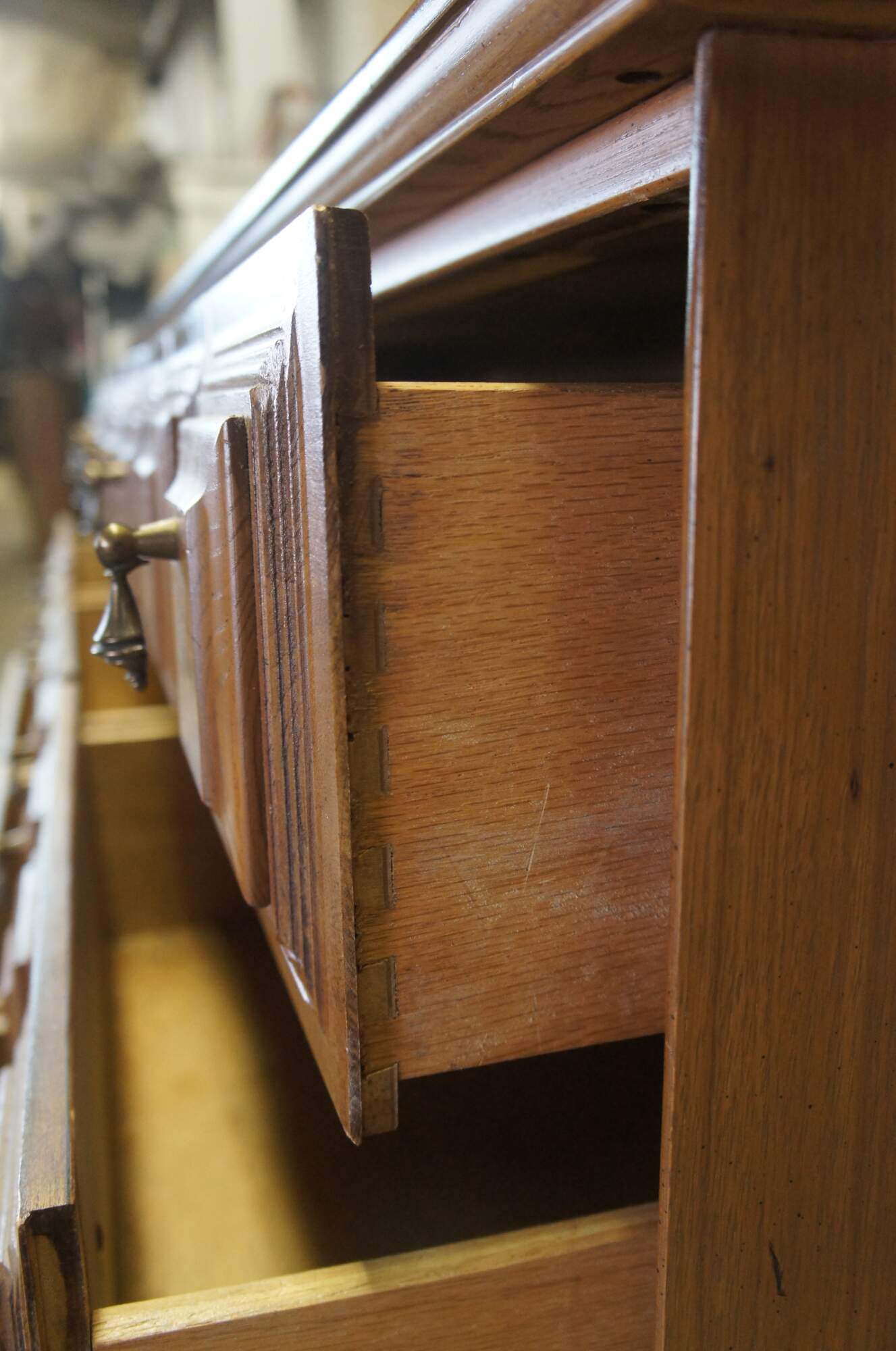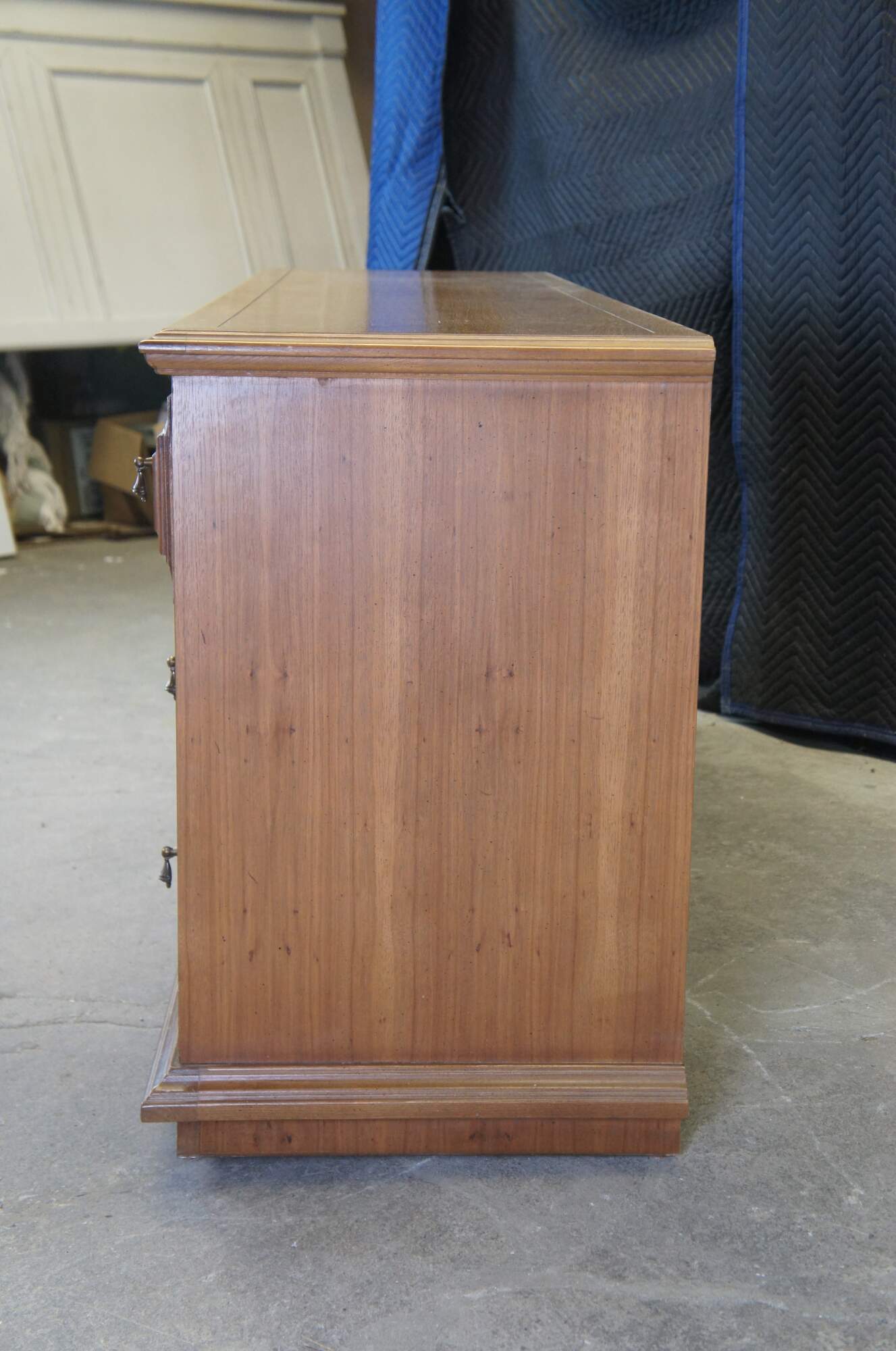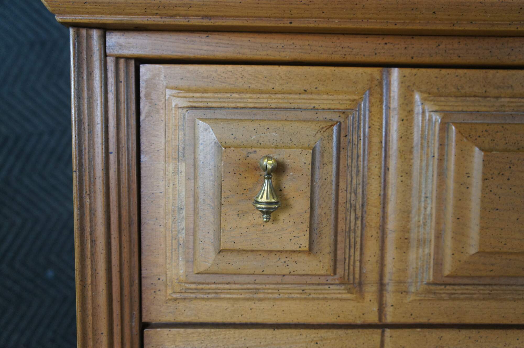 Stanley Furniture mid century paneled oak nine drawer dresser. Features a blend of Italian Provincial and Brutalist styling. The long rectangular case has nine dovetailed drawers with raised square paneling and brass knocker drawer pulls. Great for use as a credenza or console. Marked 48005, 66-812