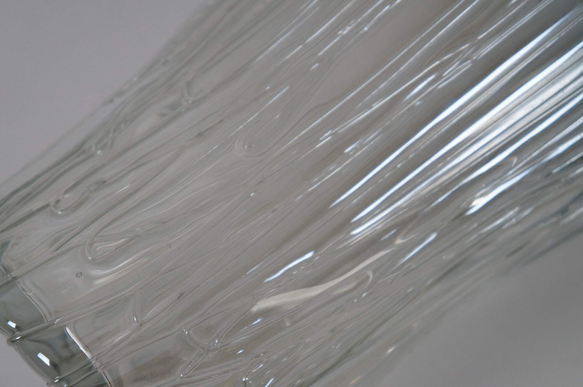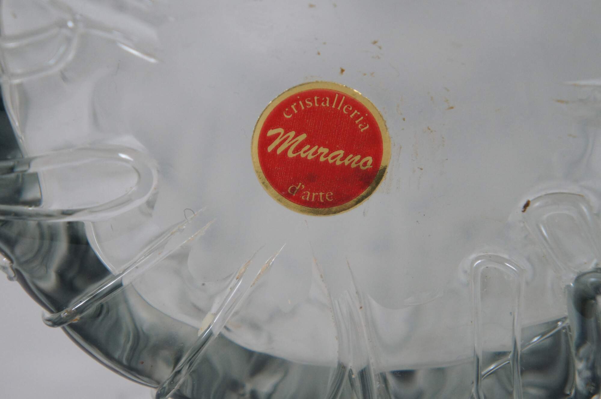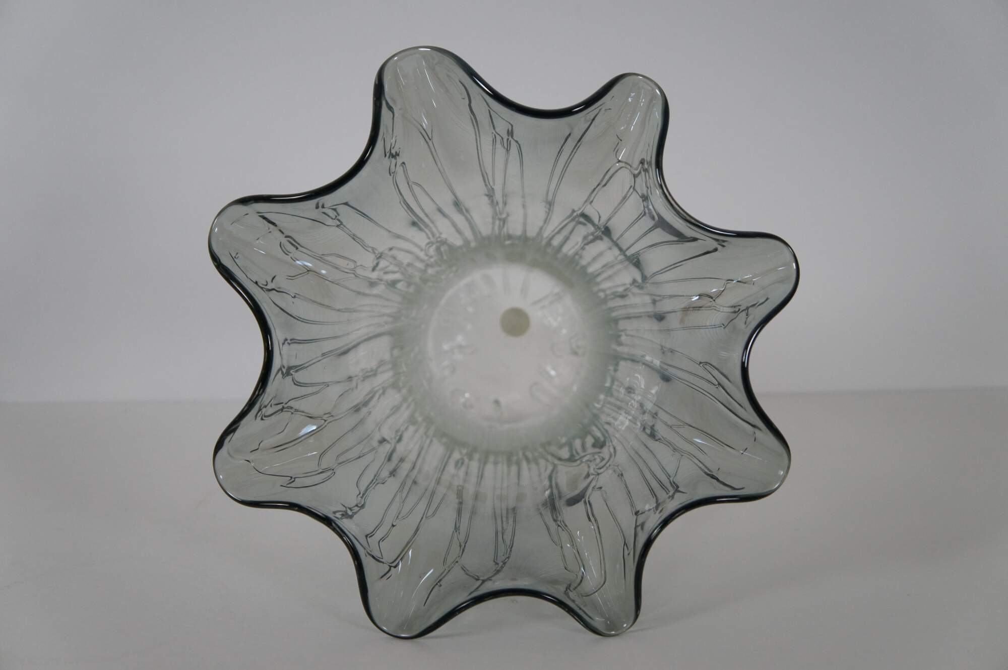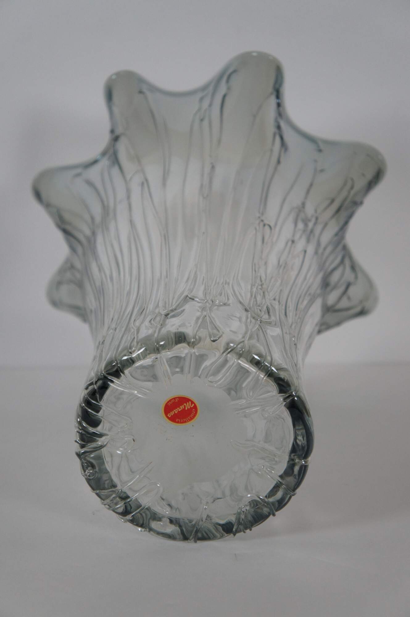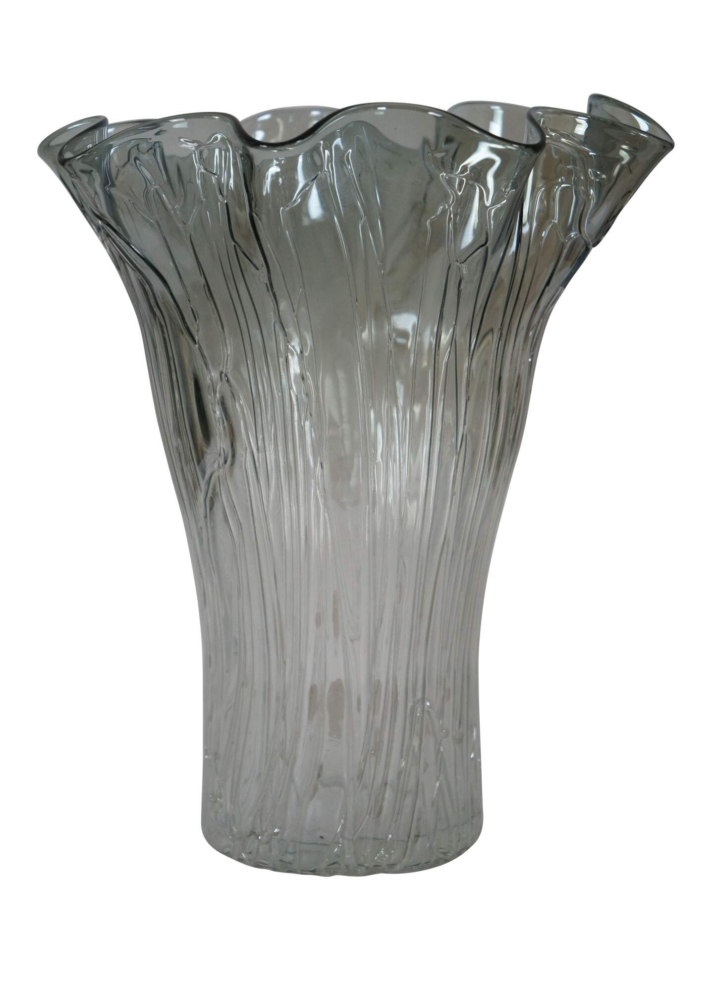 Vintage free form glass vase with rippling / ruffled edge / splash shaped top and drip / rivulet / vein texture, smoked with a gray tinge, fading to clear at the base. From Cristalleria d’Arte of Murano, Venice, Italy.