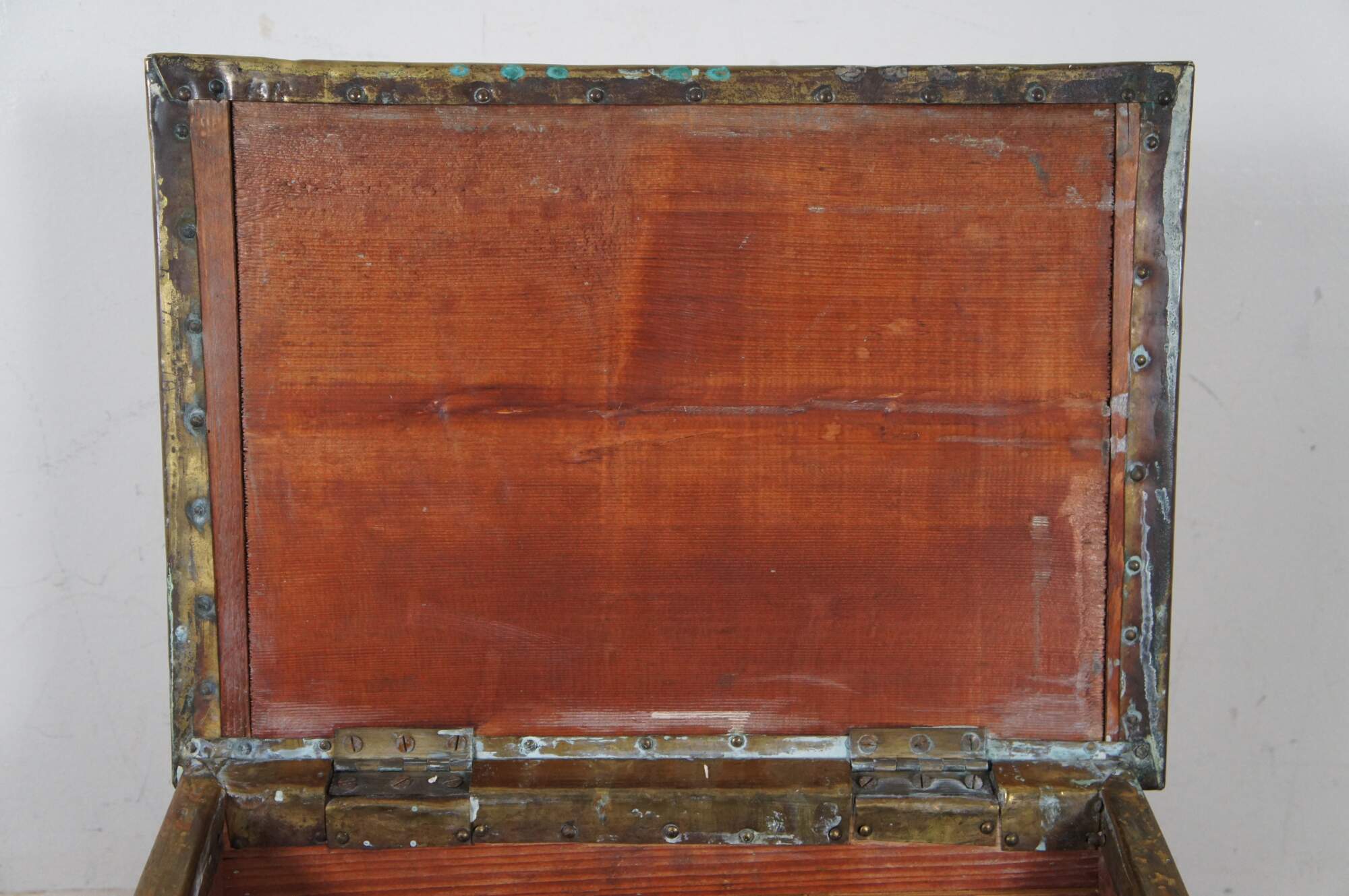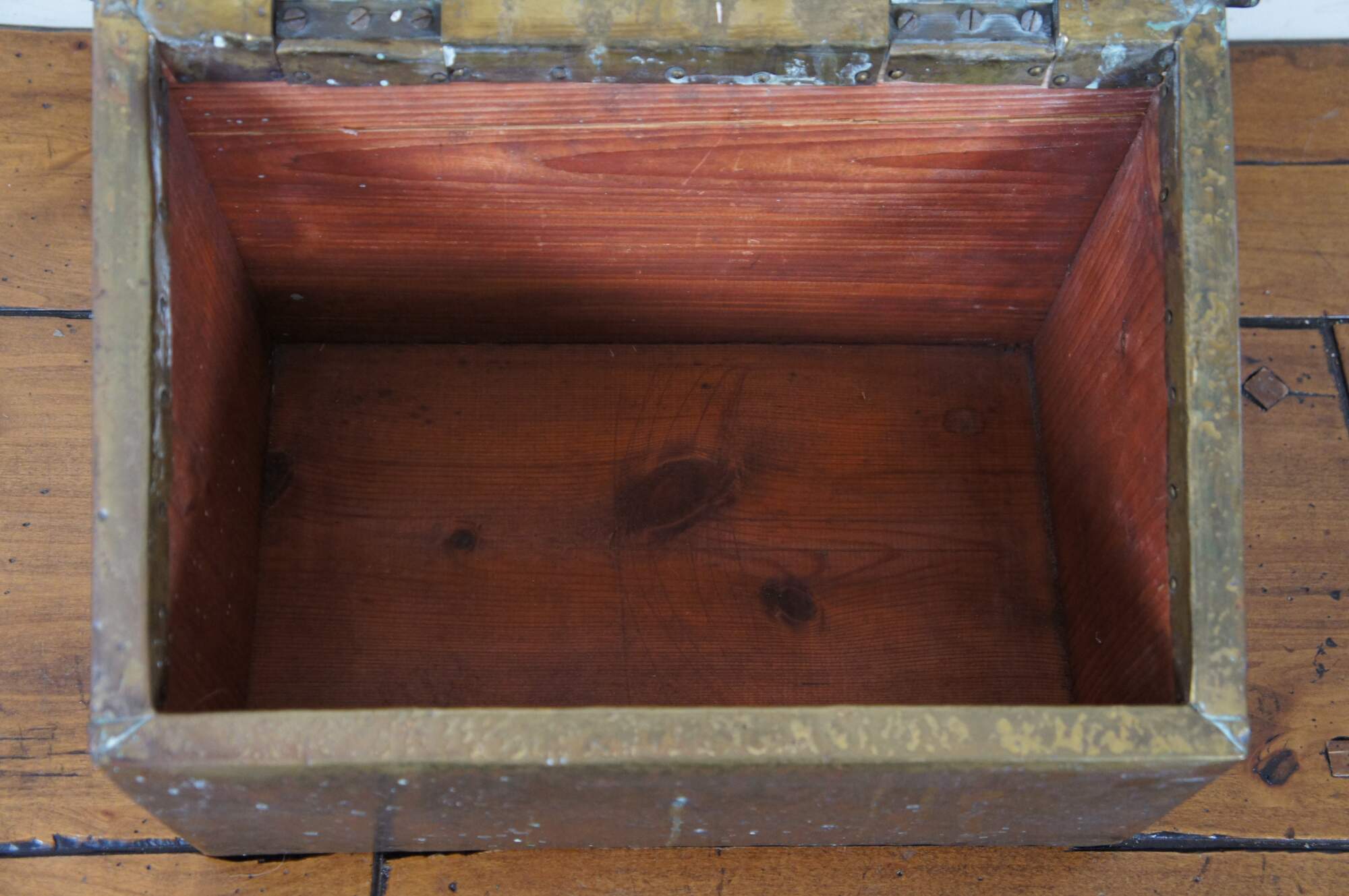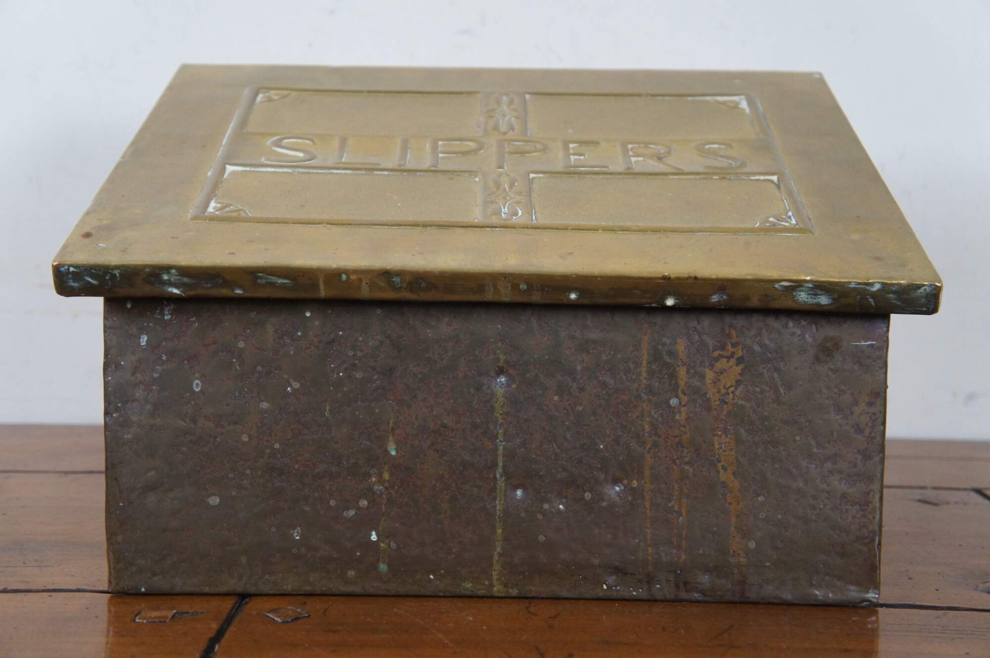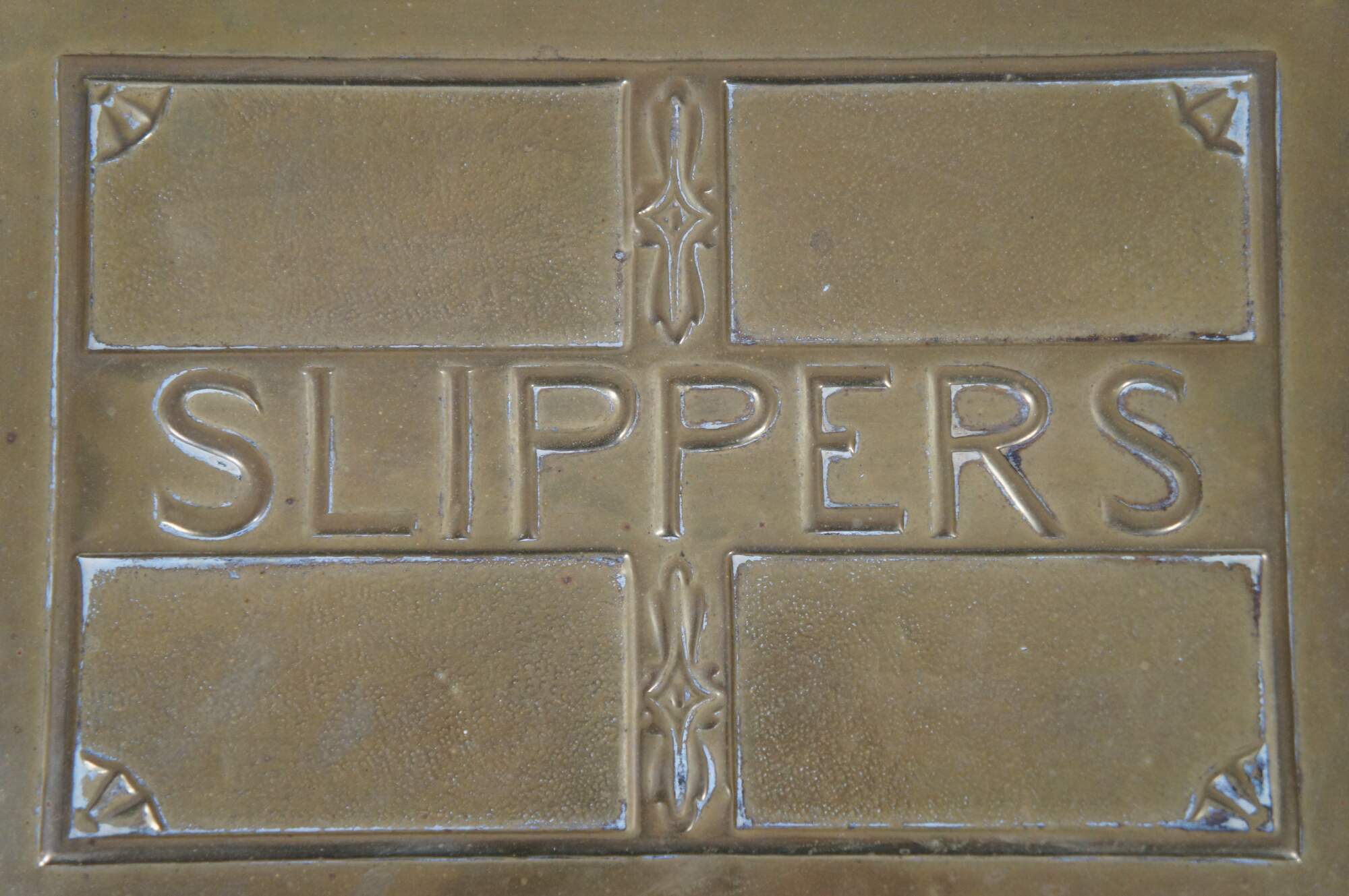 Late 19th century brass and wood lined slipper box. Rectangular form with sloped flip top lid, embossed with the label “Slippers” in a simple but elegant frame. Traditionally placed by the fireside to warm one’s house slippers in before wearing.